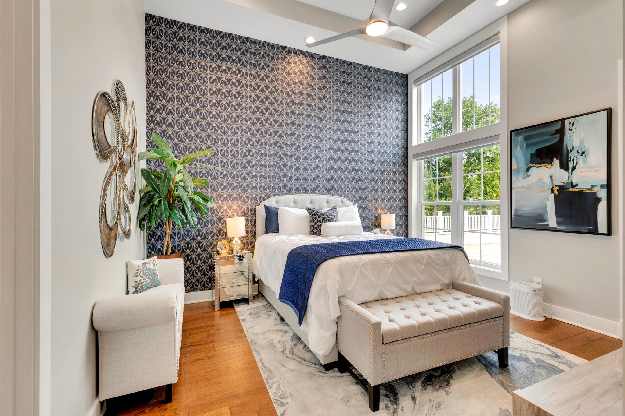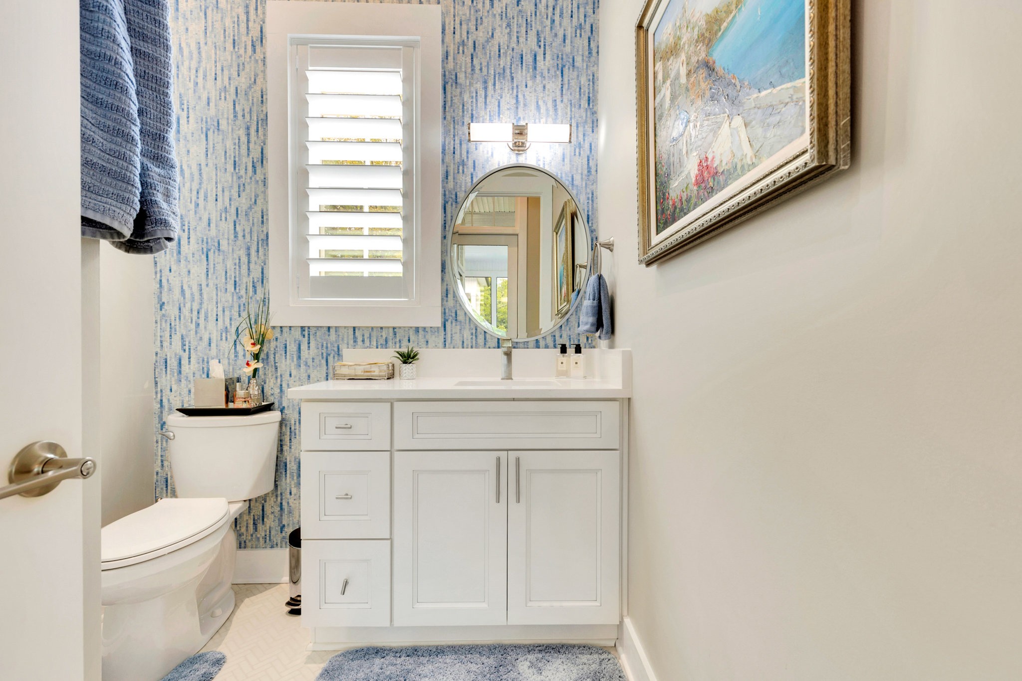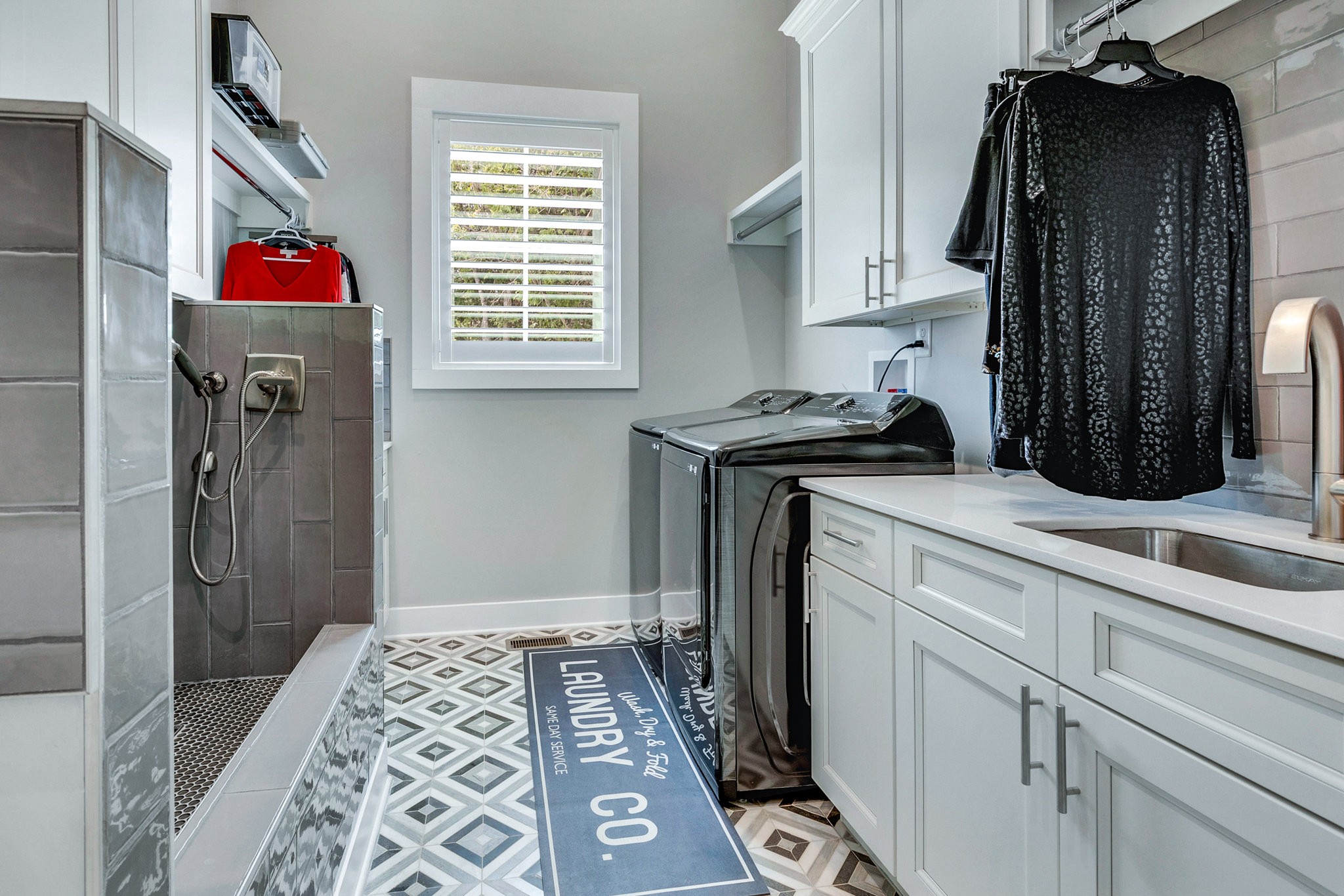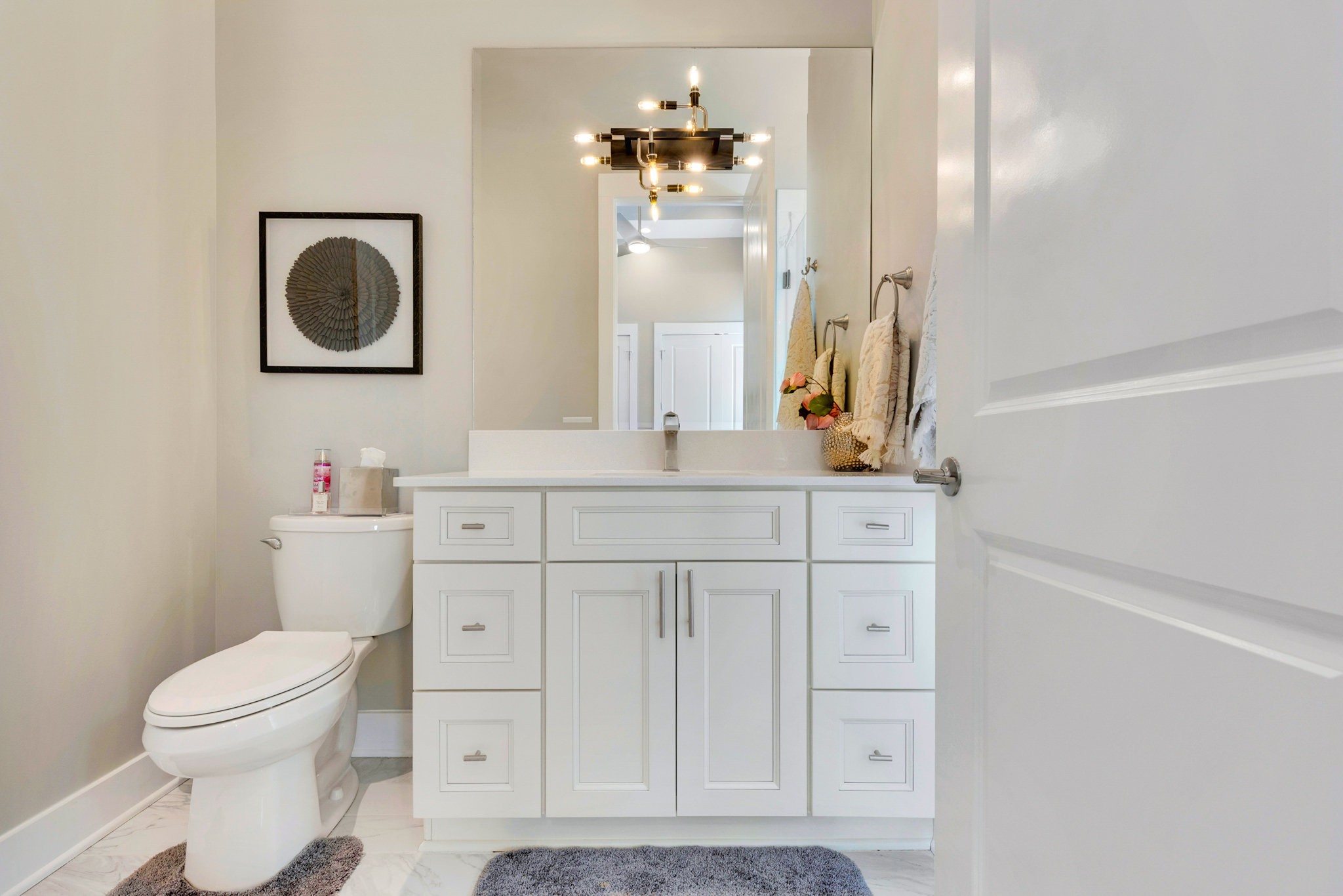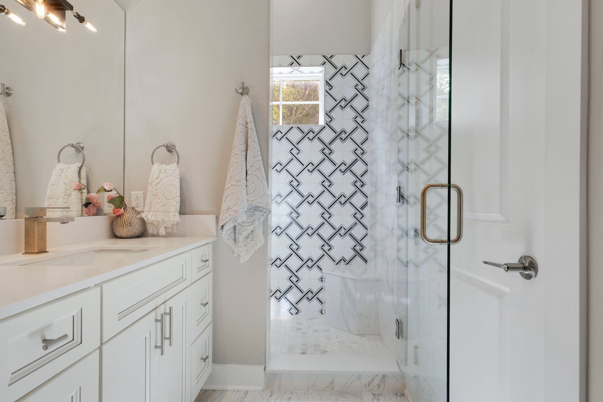 The spa-like primary suite is a retreat of its own with a freestanding soaking tub, dual water closets (his & hers), oversized framed LED mirrors, and a shower boasting 10 heads including a waterfall fixture.