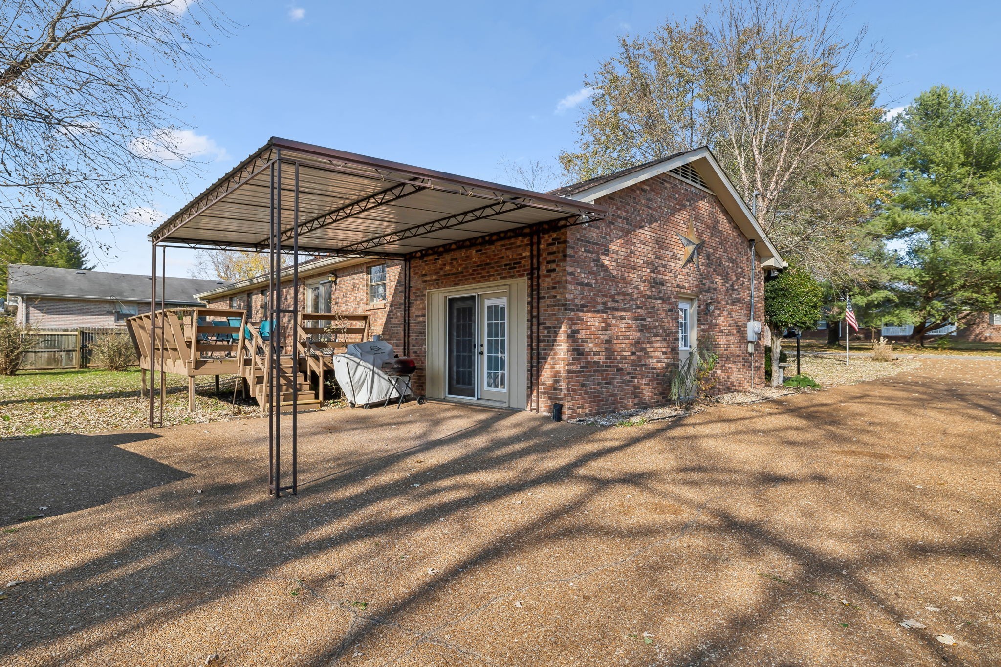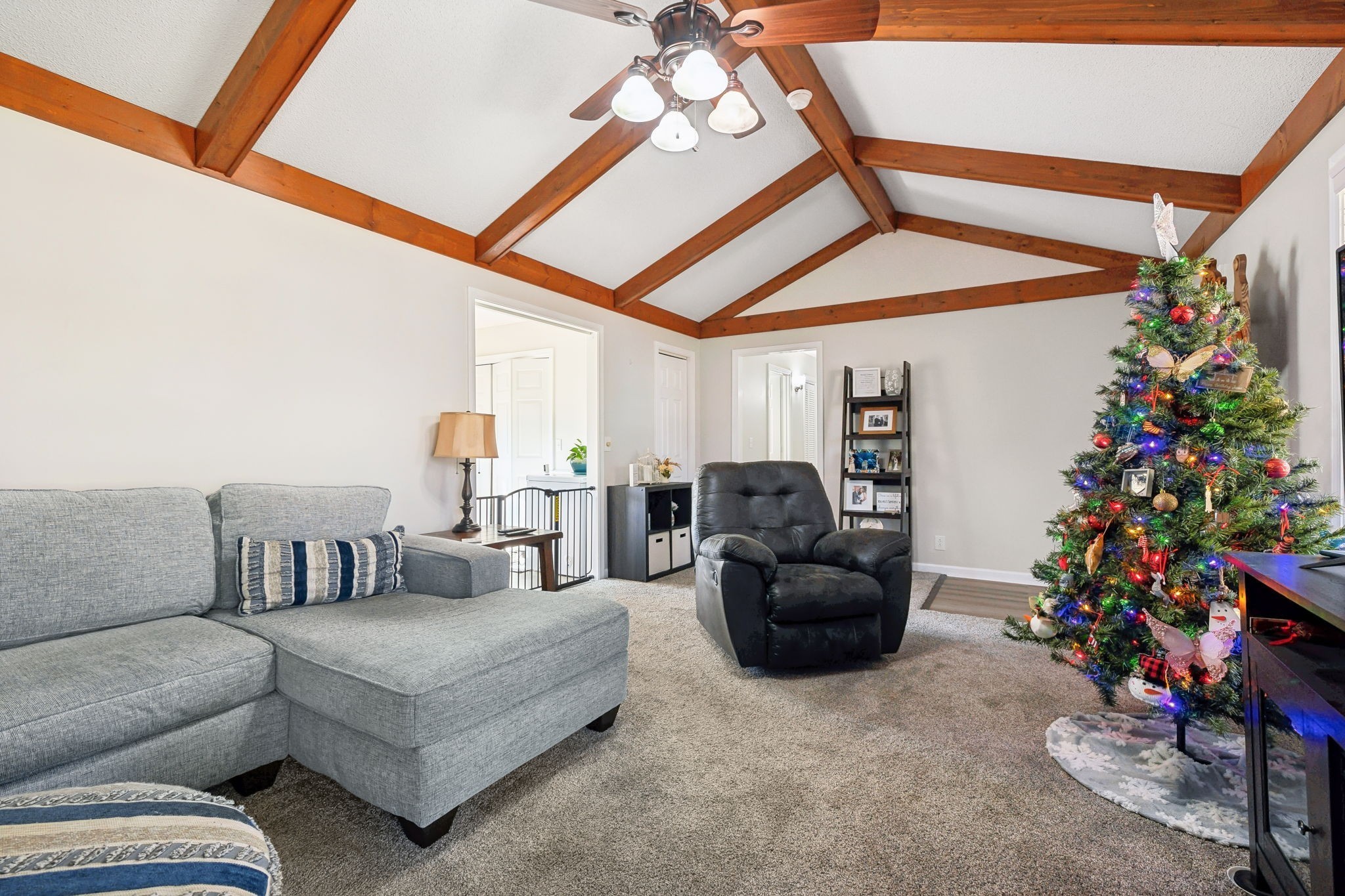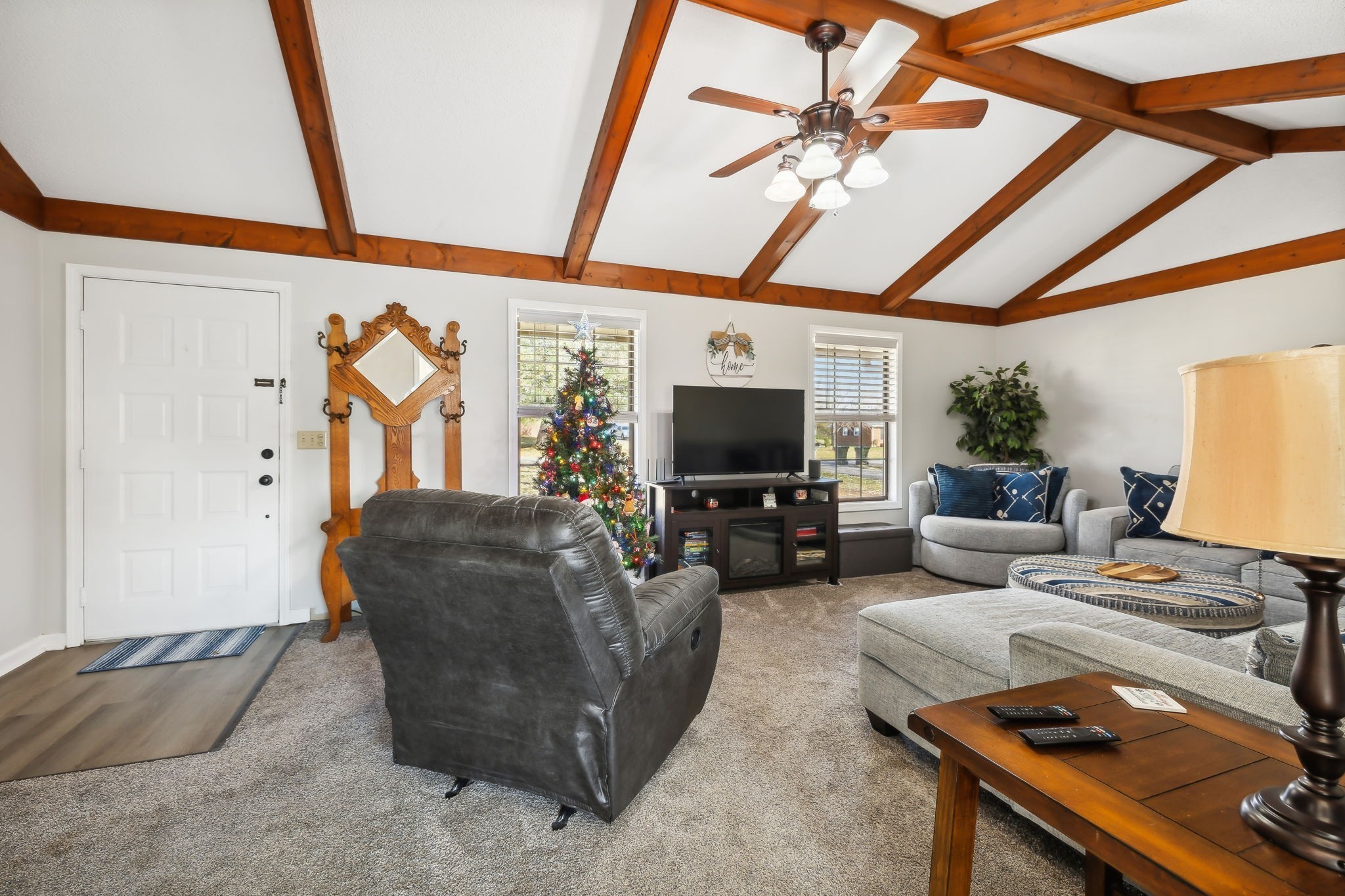 Inside, the living room shines with open wood beams, giving you that cozy Great Room vibe everyone loves. Step out front and sip sweet tea on your rocking chair porch, or head to the back deck overlooking a spacious yard that’s perfect for cookouts, pets, or a pickup soccer game. An attached carport and backyard storage building add plenty of everyday convenience.