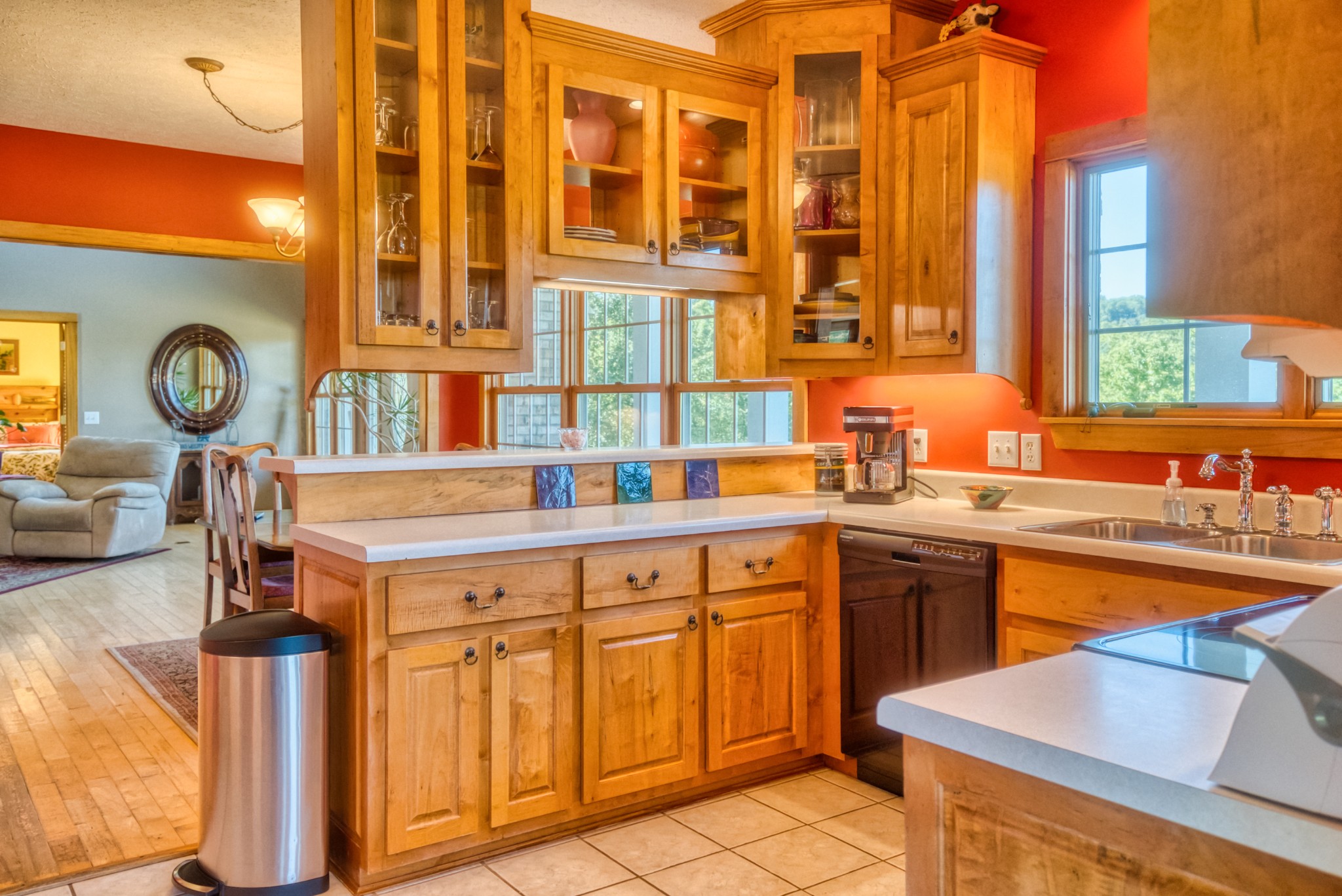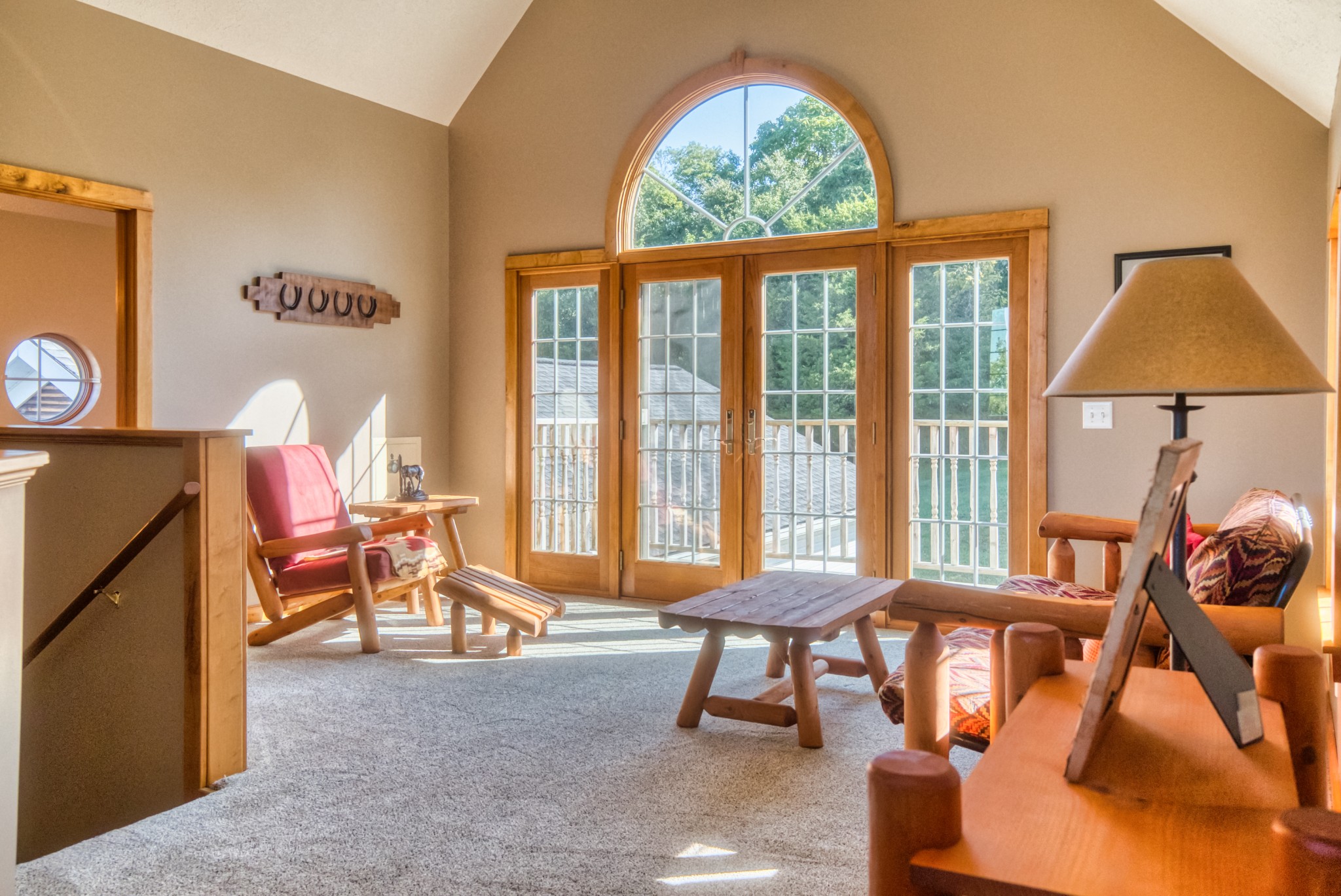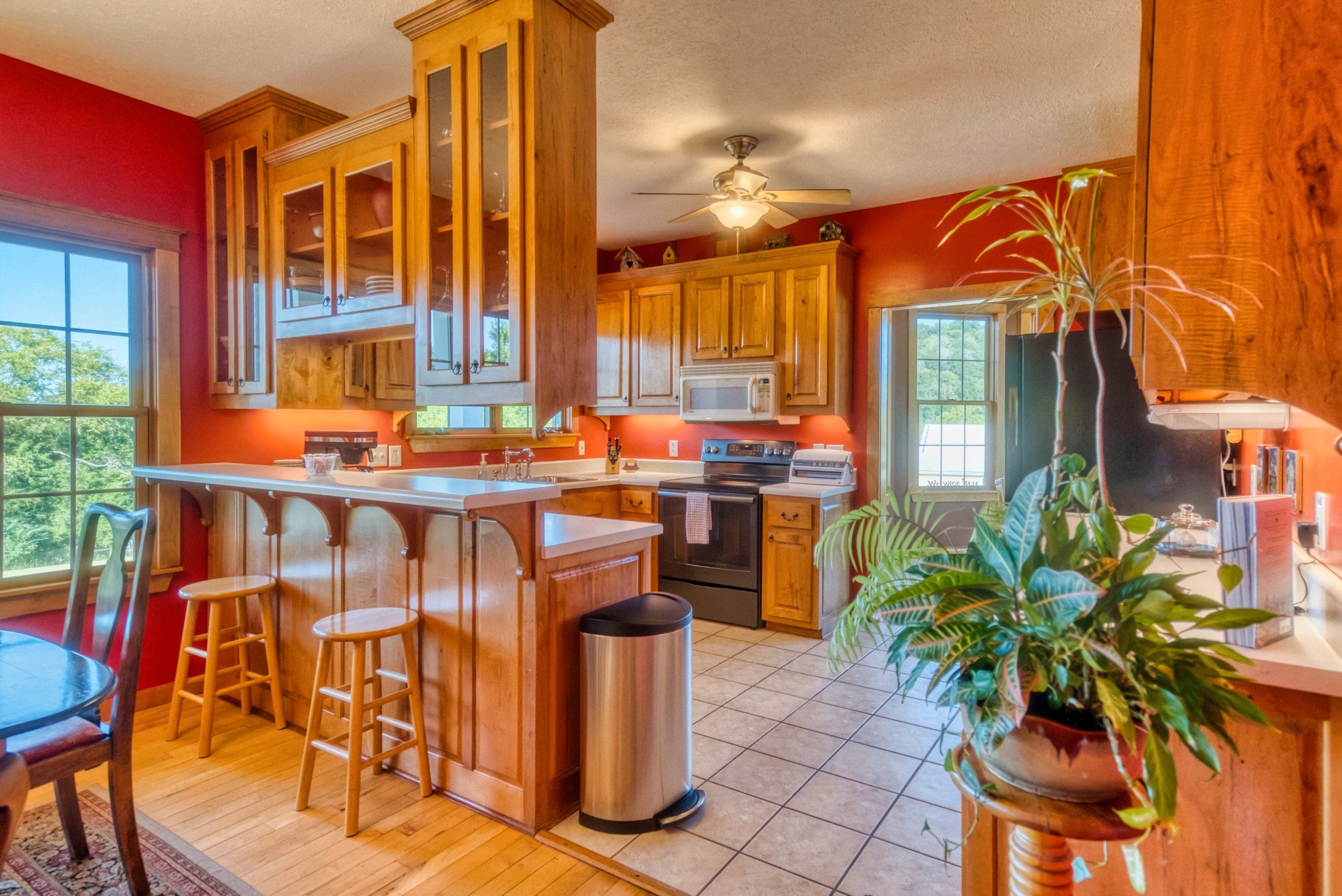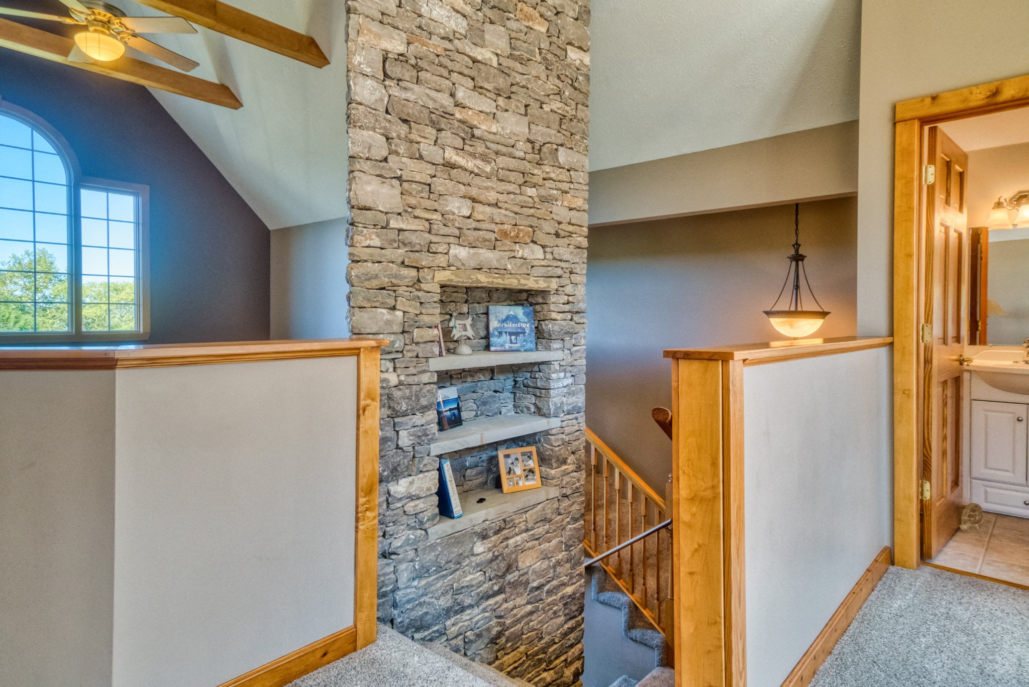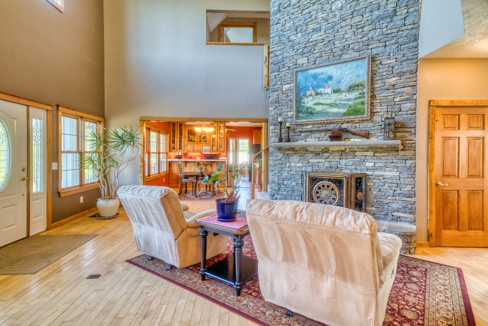 The home is a true showpiece, with a vaulted ceiling and a full-height stone fireplace that anchors both the upper and lower levels. Maple flooring runs throughout, creating a warm, inviting atmosphere. The kitchen is a standout with custom cabinets made from genuine Fender guitar wood, bringing a touch of rock-and-roll flair to your country lifestyle. Thoughtfully designed with pull-out slides and a walk-in pantry, it’s both stylish and functional.