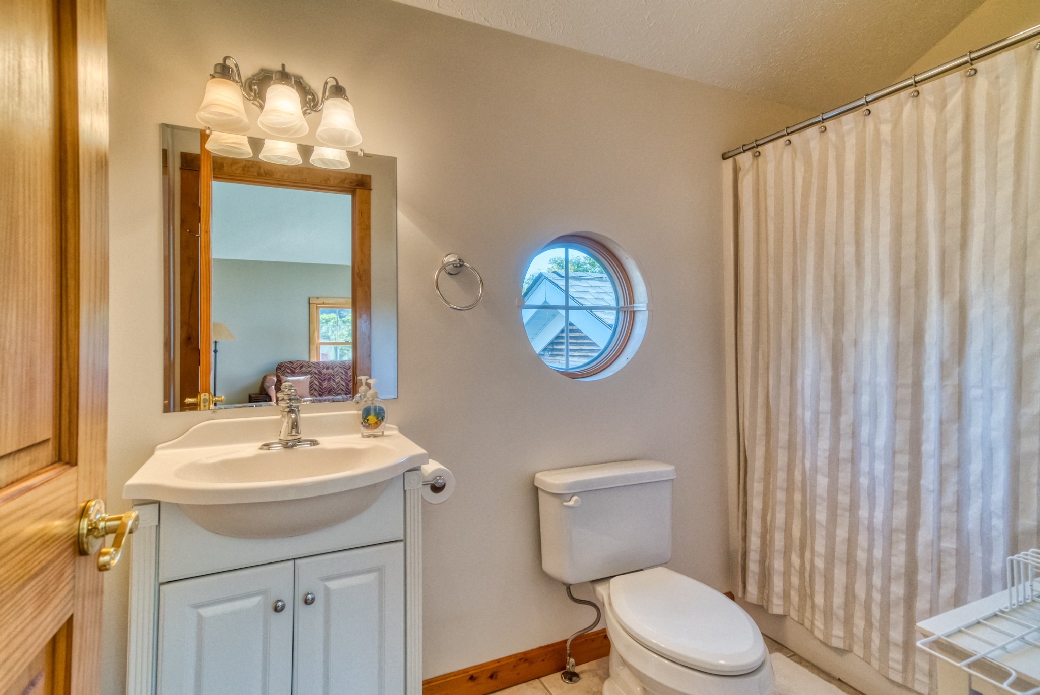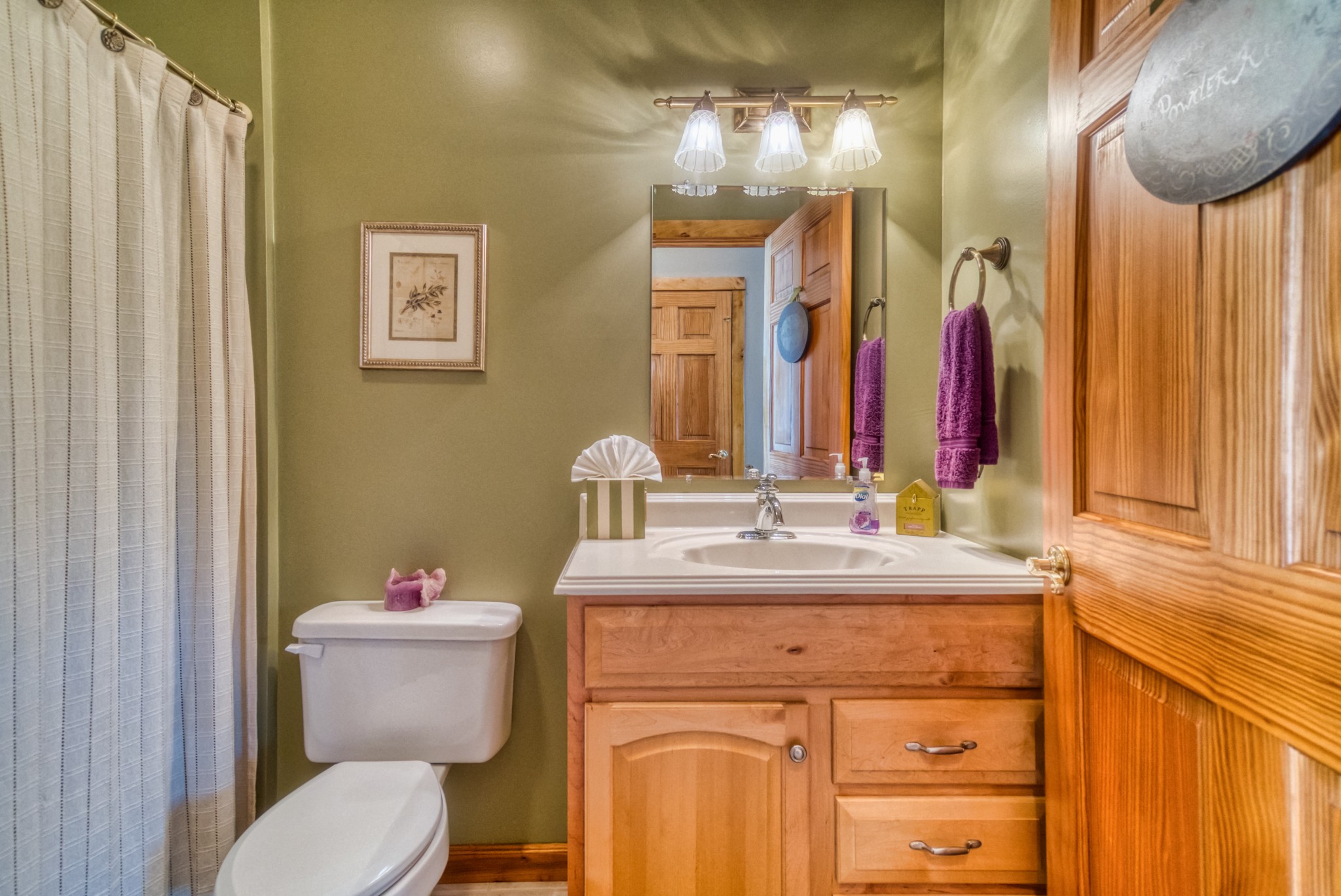The main-level primary suite features a walk-in closet, a spa-like bathroom with a garden tub, walk-in shower, and skylight, plus French doors that open to a private sitting room on the front porch. Upstairs, you’ll find two additional bedrooms, a full bathroom, and a cozy loft-style sitting area that leads to a covered overlook deck with picturesque views of the property.