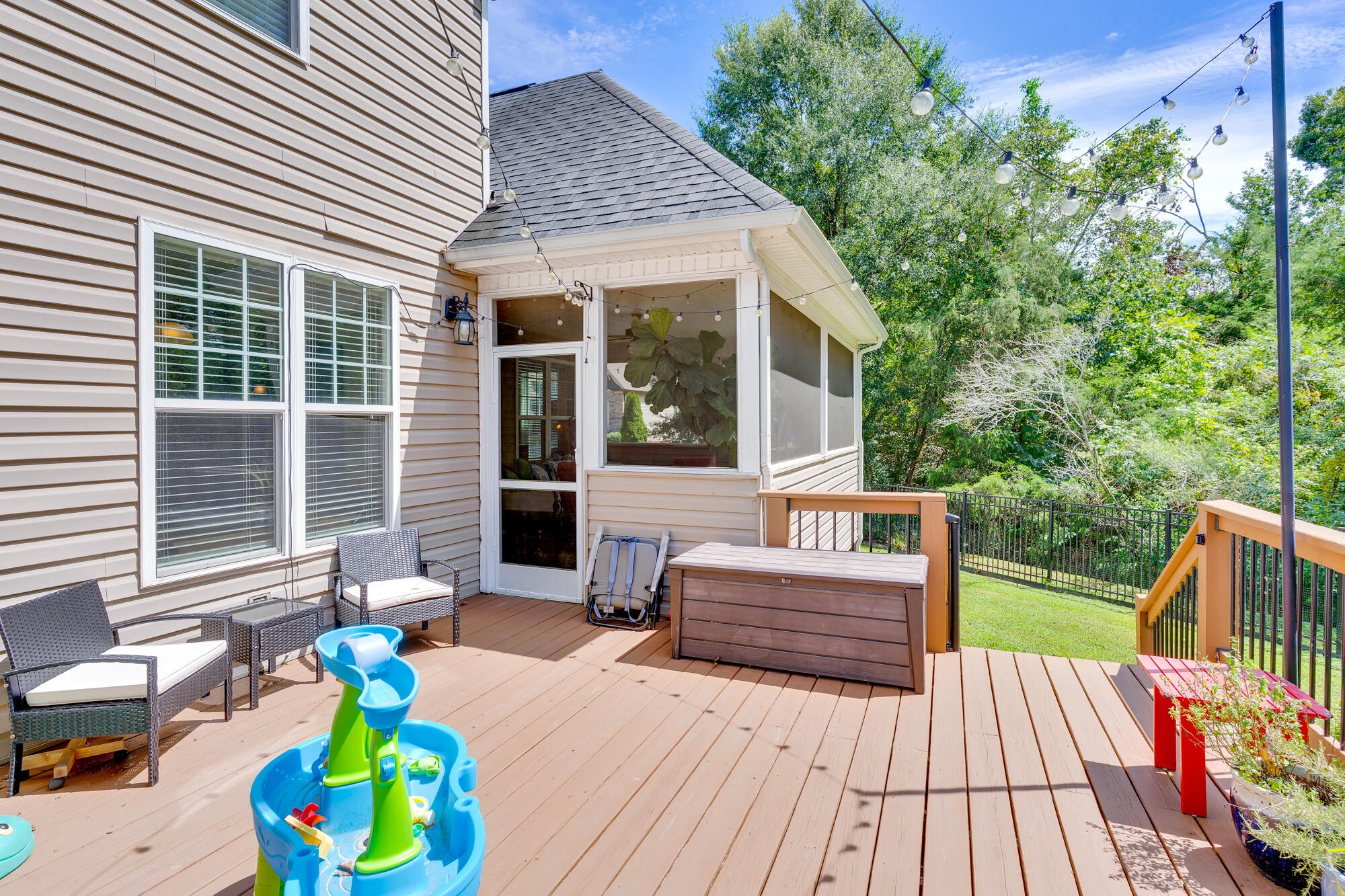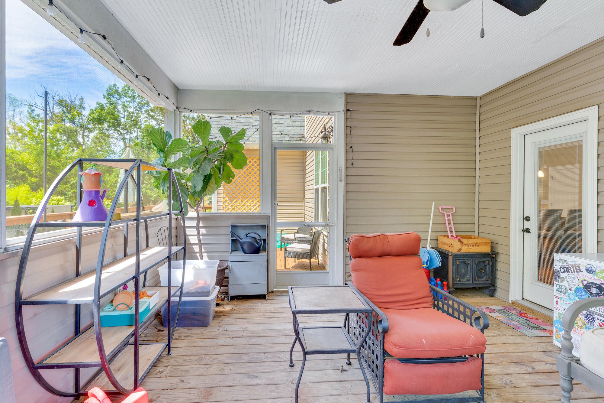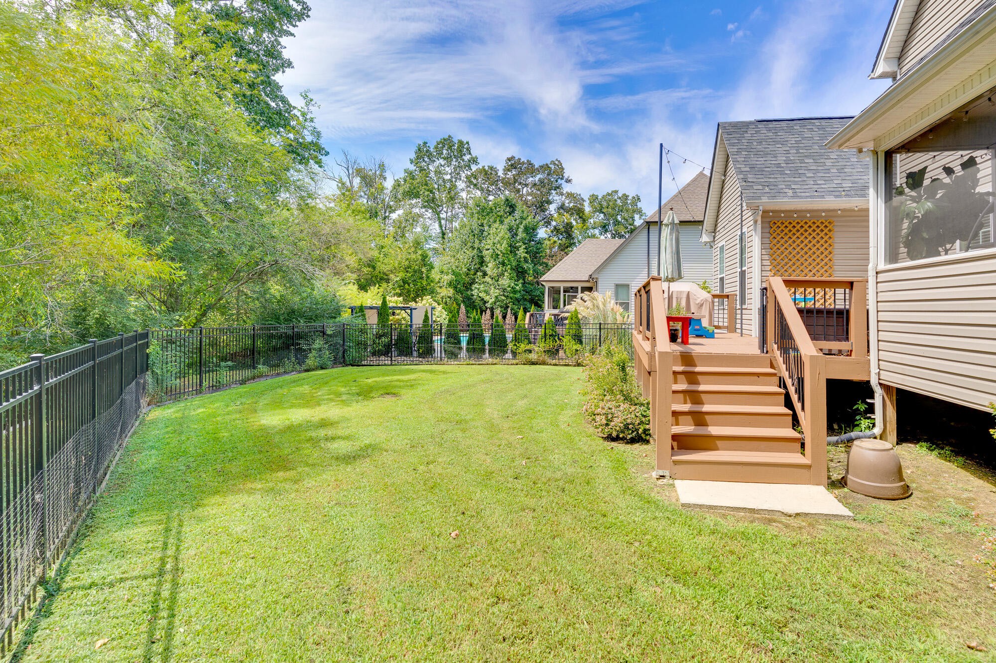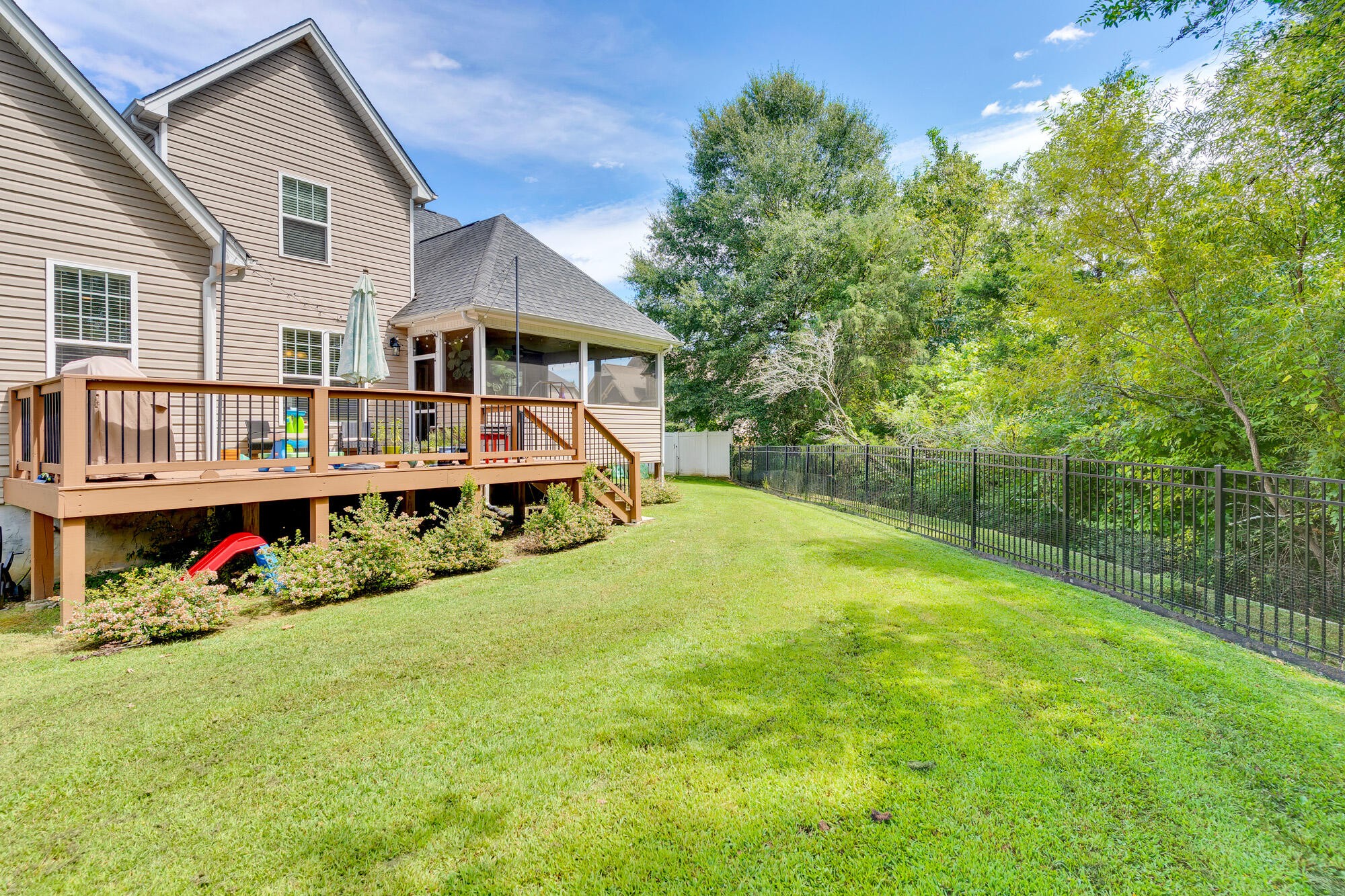 Step inside to an inviting open-concept floor plan that blends everyday living and entertaining with ease. The main level offers a dedicated office with elegant French doors, a spacious living area, and a primary suite conveniently located on the main floor. The kitchen and living space flow seamlessly to the screened-in porch and uncovered deck, perfect for relaxing or entertaining outdoors. The fenced backyard offers privacy with mature trees and a small stream at the back of the property.