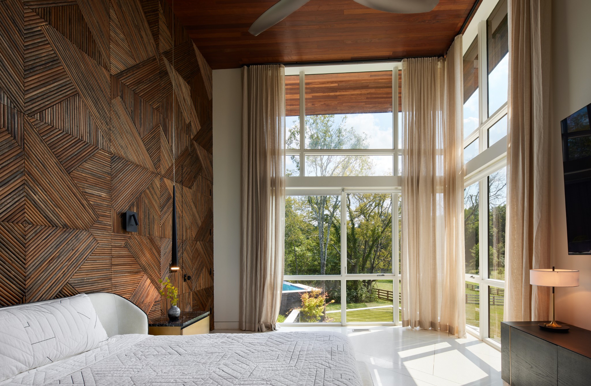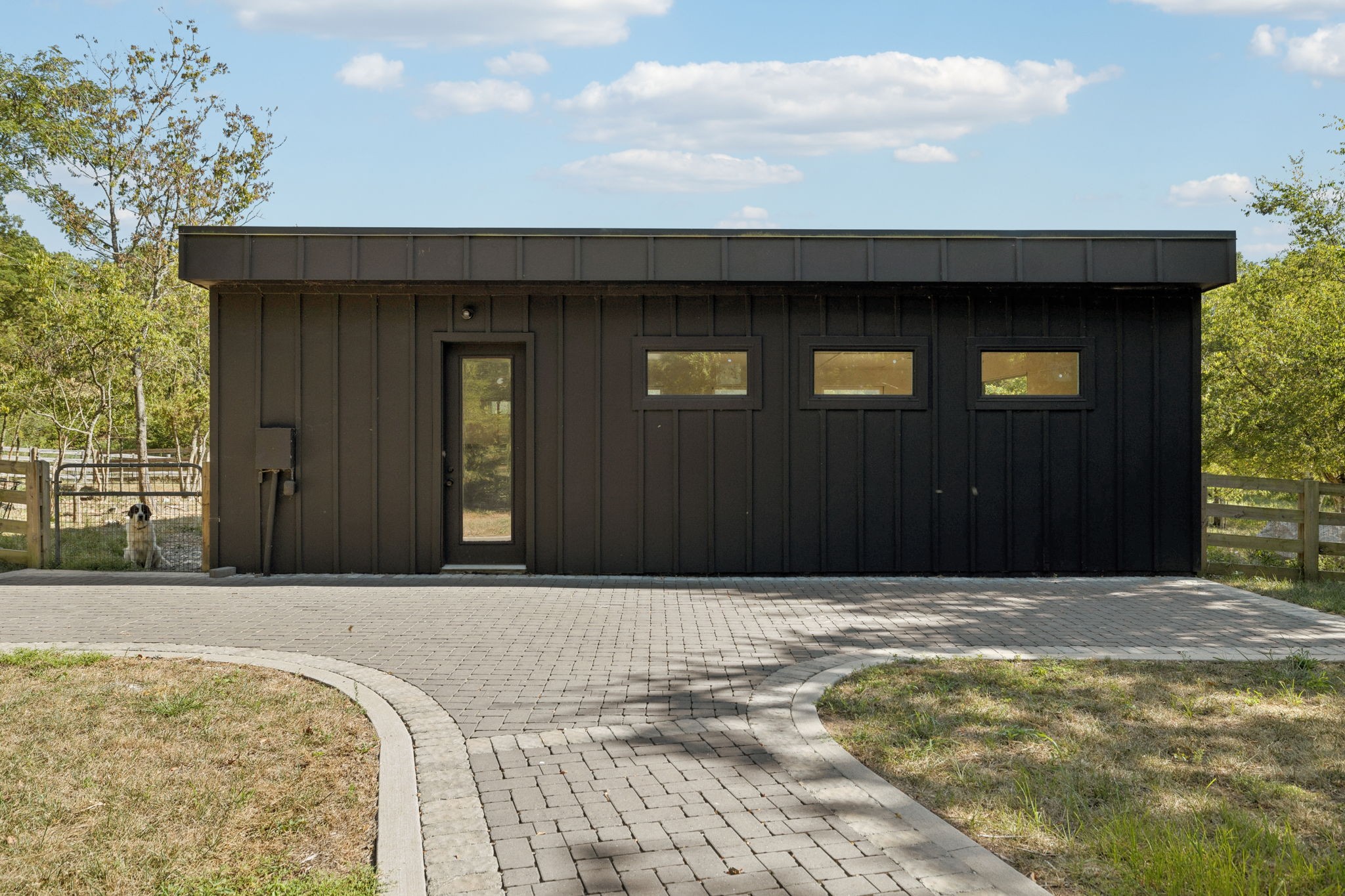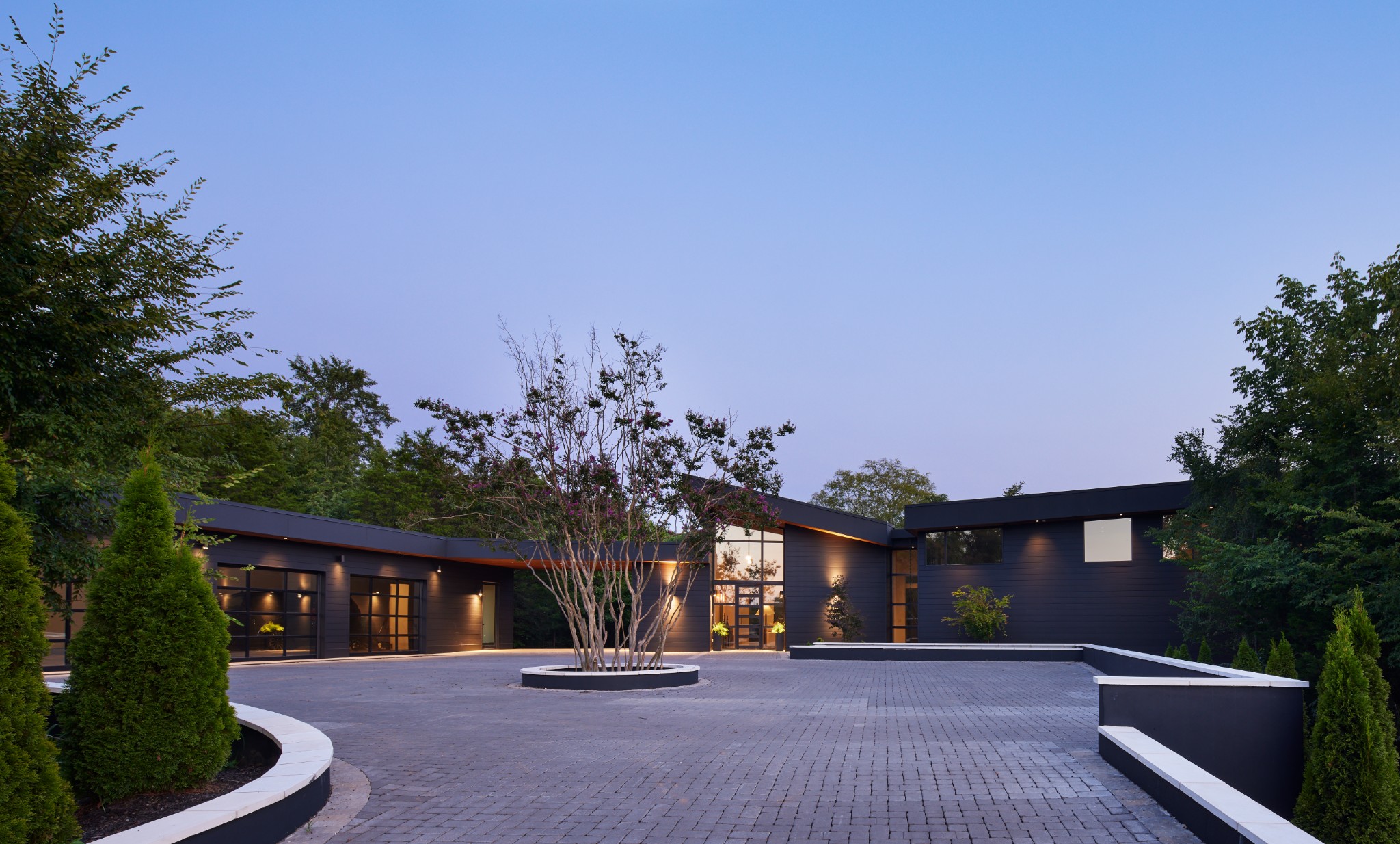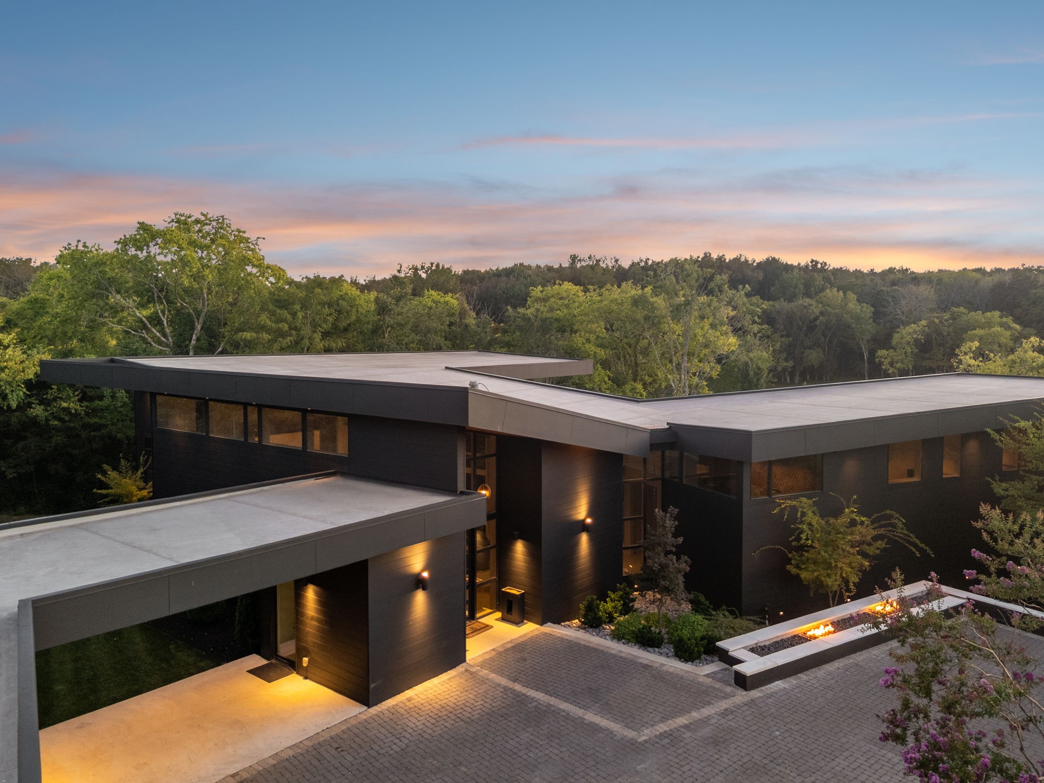 A rare fusion of world-class design and natural beauty, this gated modern estate with 4 bedrooms (1 in basement) by esteemed firm EOA, featured in Architectural Digest, is a true masterwork on 26 acres, just 5 minutes from the interstate and 15 minutes from the airport. Designed as the builder’s personal residence, every detail reflects permanence, performance, and elegance. Behind a private gate and long paver-lined drive, the home opens to a luminous living space with soaring ceilings, terrazzo marble floors, and walls of glass framing serene views. Accents of Brazilian Ipe wood provide warmth and texture, balancing bold architecture with inviting comfort.