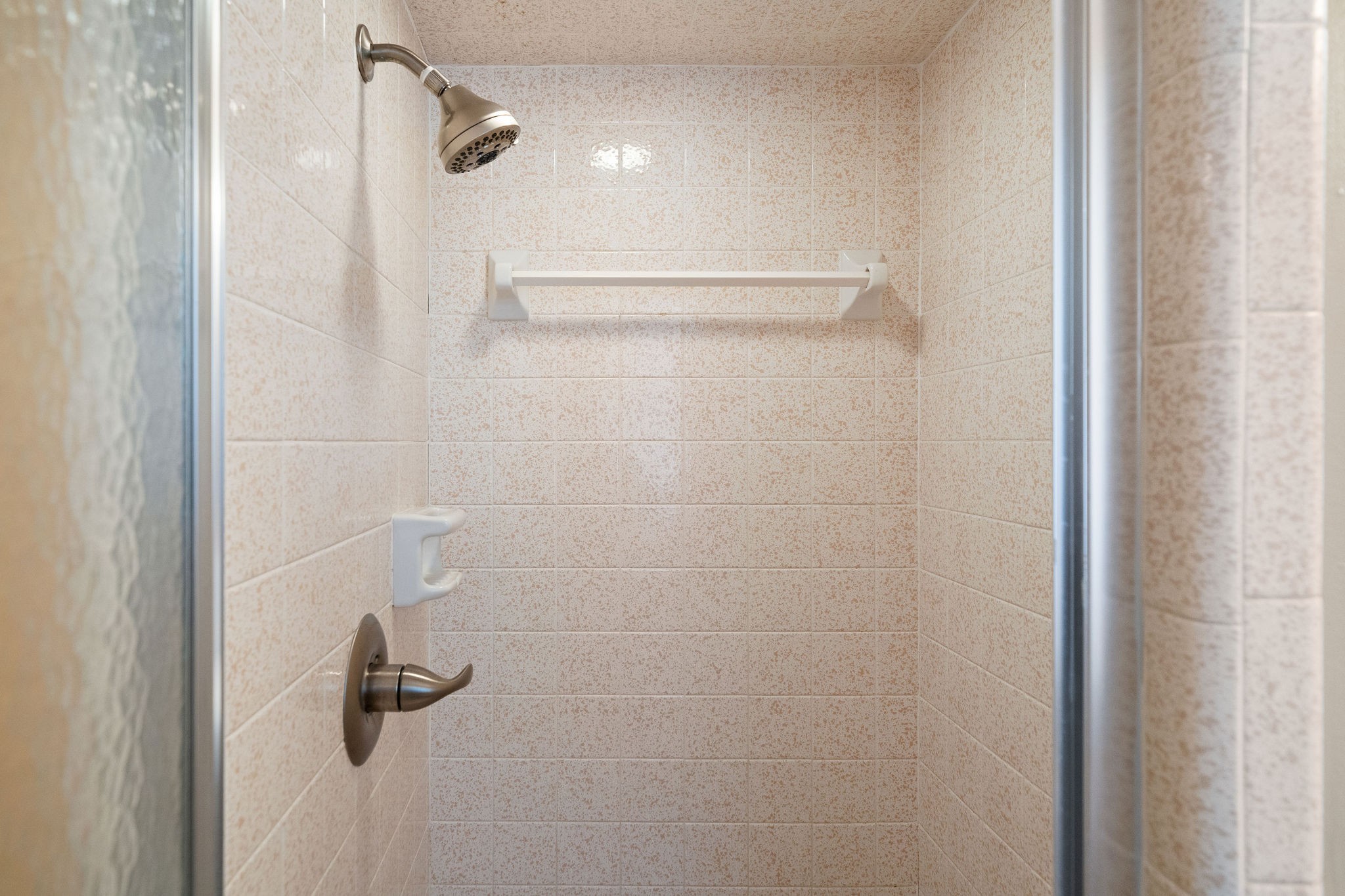 The two additional bedrooms are generously sized and located along the hallway, with a full bathroom featuring an extended vanity and a tub/shower combo nearby. At the end of the hall, the primary suite offers a large closet and a private en-suite bathroom with a standing shower.