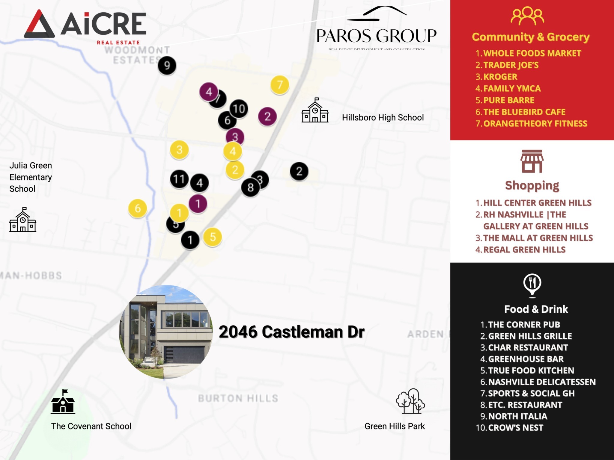 Ask about our 5.75% Interest Rate Loan with use of preferred lender, the Locklear Lending Team! Welcome to 2046 Castleman Drive, an architectural statement of contemporary elegance built by renowned local builder Paros Group and nestled in the heart of Green Hills, one of Nashville’s most sought-after neighborhoods for luxury family living. This expansive new construction home offers five spacious bedrooms, five full baths, and two half baths across a light-filled, open floorplan designed with both sophistication and everyday functionality in mind. Grand 12ft ceilings crown the formal living space, anchored by a sleek fireplace and surrounded by soaring windows that flood the home with natural light. The chef’s kitchen is a showpiece in its own right, featuring custom cabinetry, a generous center island, walk-in pantry, and luxury appliances. It is perfectly suited for elevated entertaining or effortless everyday living.