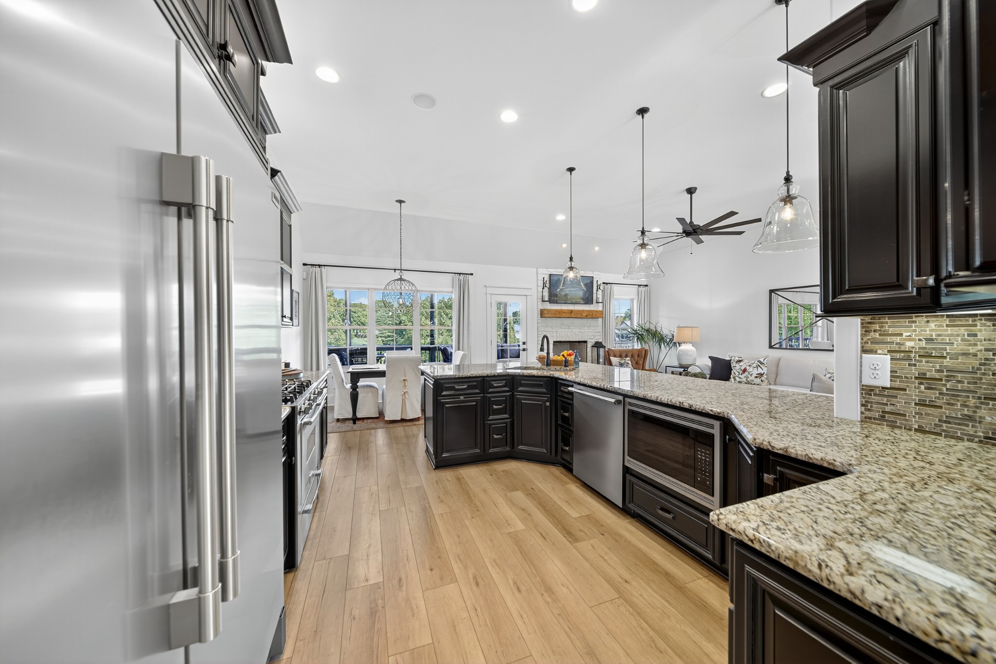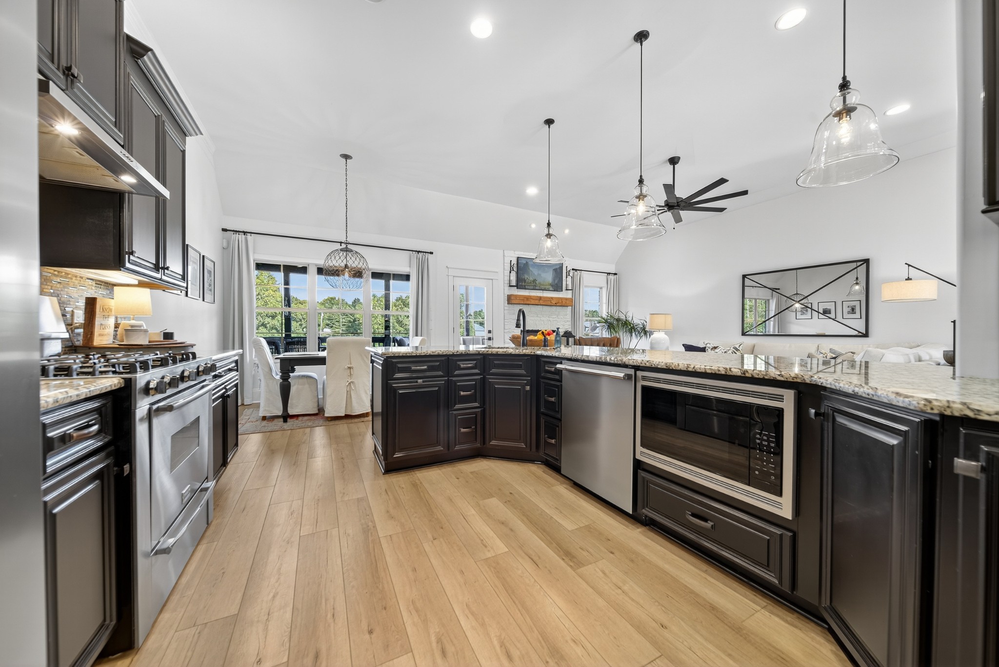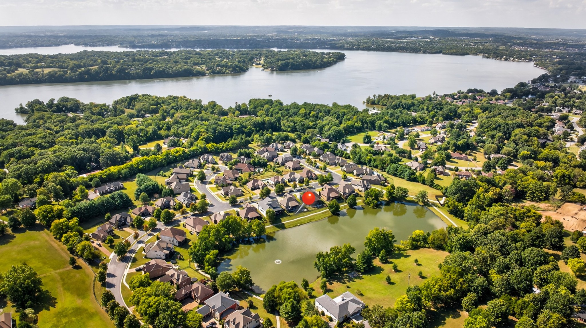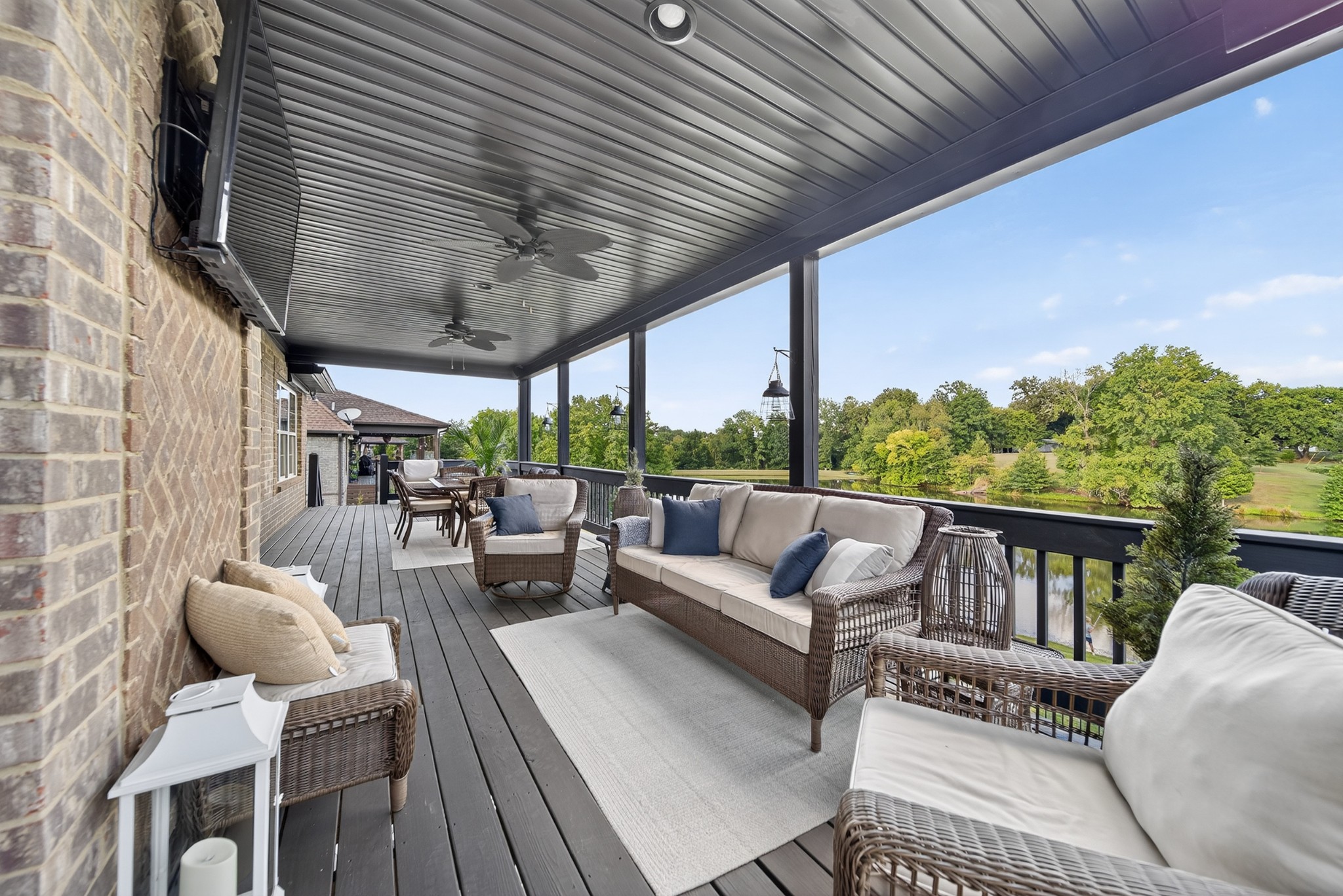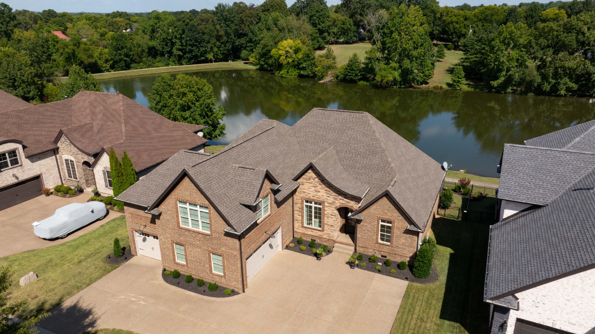 Incredible breathtaking views! Located on a private lake in a gated community, this all brick luxury showplace has an open floor plan, huge gourmet eat-in kitchen, all stainless appliances, large walk-in pantry, formal dining, great rm with fireplace, coffered ceilings, three BR's on the main level, primary suite with massive walk-in closet, separate shower/tub/double vanities and tankless water heater. A 54 ft oversized deck (one half covered) with tv's, expands the length of the home with an equally spacious patio underneath. The rec room upstairs features a full kitchenette/two tv's, wine fridge and bar. Entertainer's dream with Sonos whole house speaker system, pool table (which stays) and a 24x11 media room with surround sound/three tv's. In 2020 sellers installed new roof, new luxury plank flooring throughout, & built the new outdoor patio with natural gas fire-pit. Tons of storage space..possible expansion walk in floored attic with 16 ft. ceilings, walk in crawlspace storage under the deck. Beautiful new landscaping in 2024, fenced back yard backing up to the walking trail that circles the lake. Three car immaculate garage features an EV charger! Just minutes from schools, shopping/dining, marinas and Old Hickory Lake! This house is even more stunning in person!
