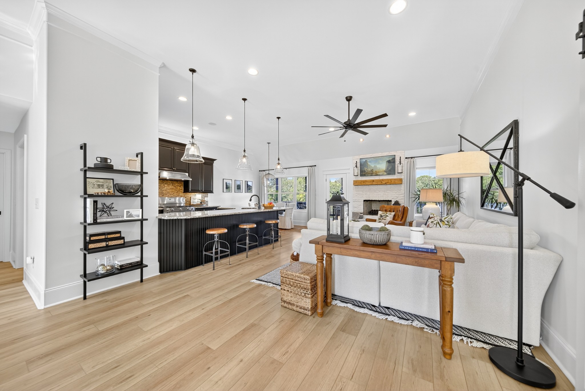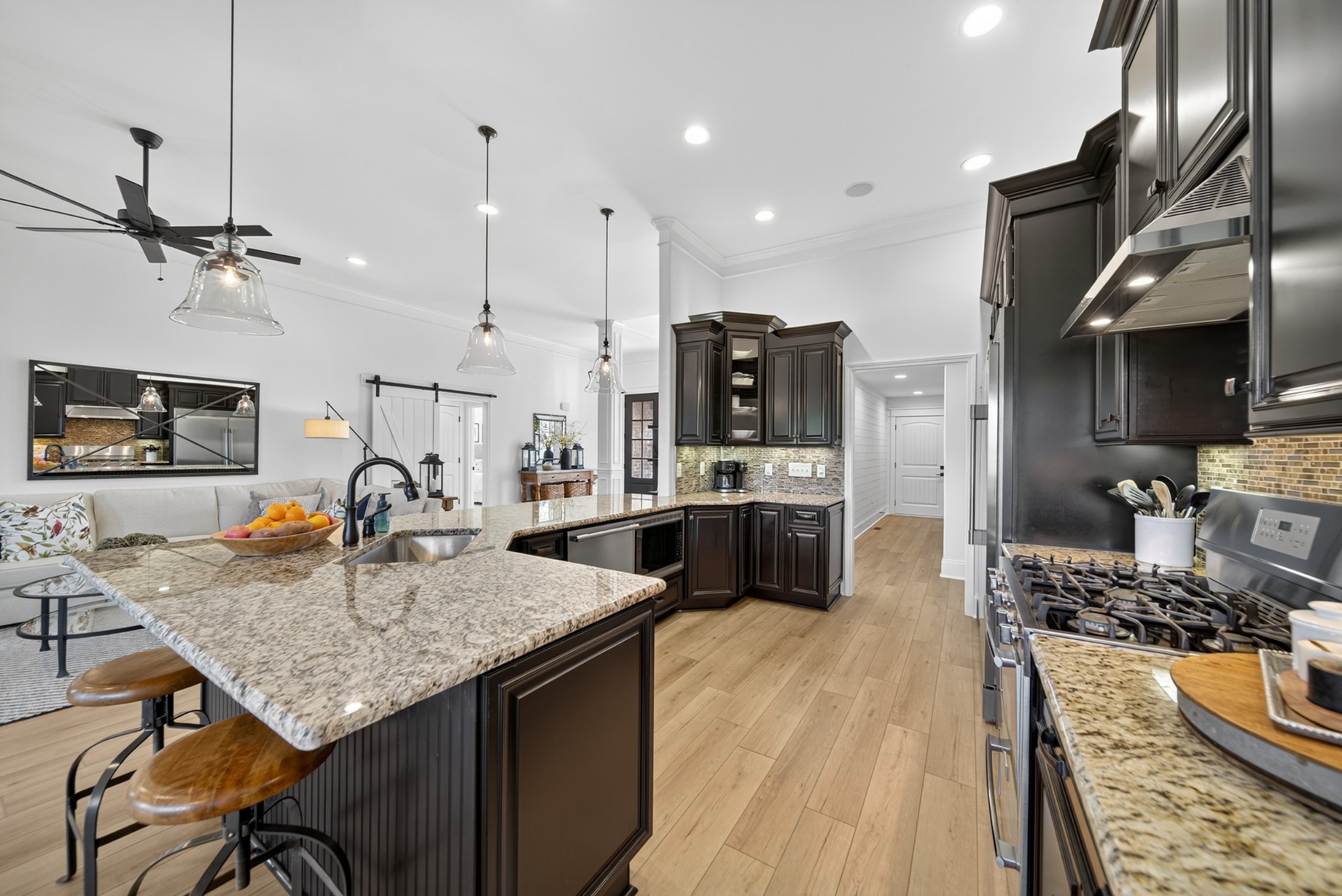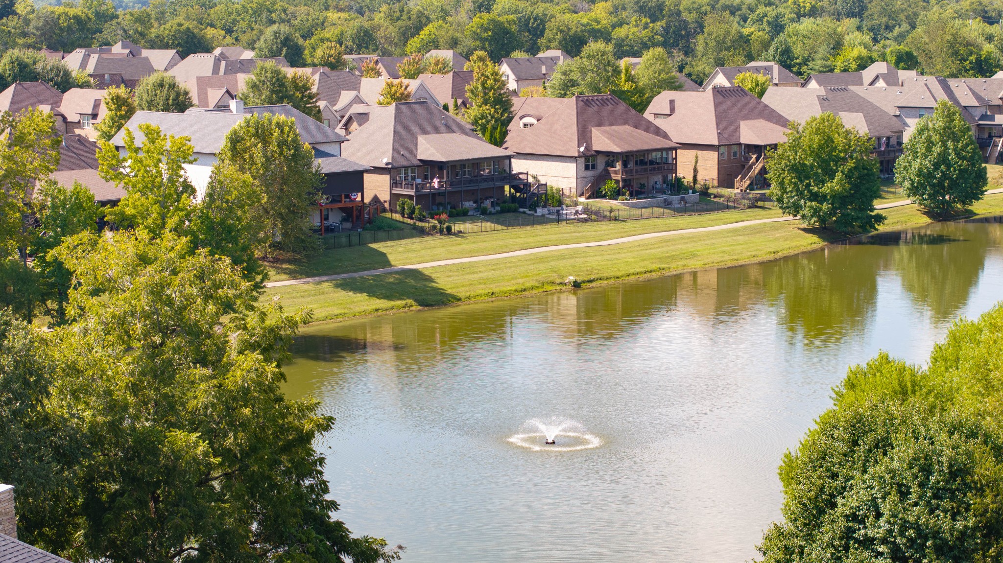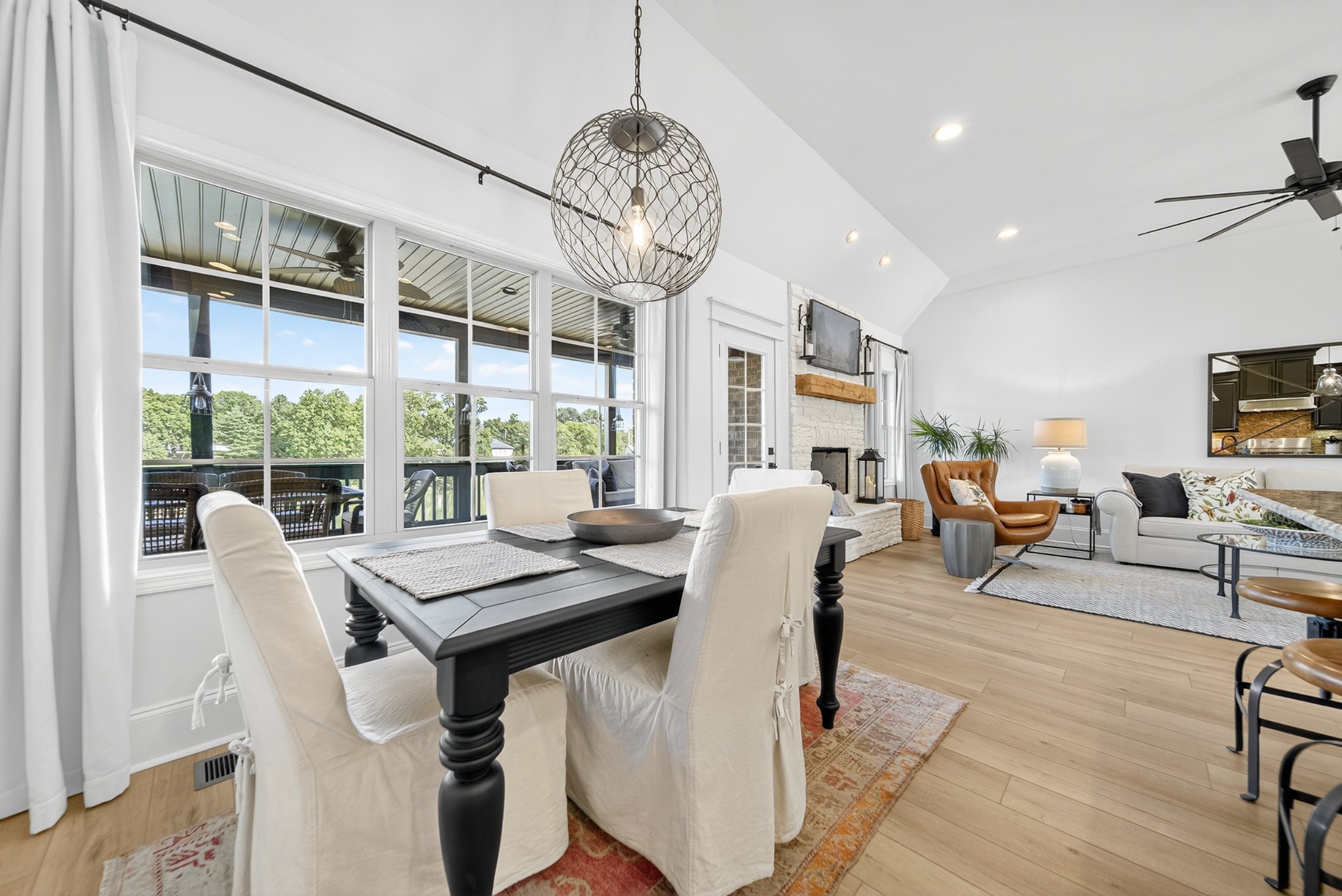 Incredible breathtaking views! Located on a private lake in a gated community, this all brick luxury showplace has an open floor plan, huge gourmet eat-in kitchen, all stainless appliances, large walk-in pantry, formal dining, great rm with fireplace, coffered ceilings, three BR's on the main level, primary suite with massive walk-in closet, separate shower/tub/double vanities and tankless water heater. A 54 ft oversized deck (one half covered) with tv's, expands the length of the home with an equally spacious patio underneath. The rec room upstairs features a full kitchenette/two tv's, wine fridge and bar. Entertainer's dream with Sonos whole house speaker system, pool table (which stays) and a 24x11 media room with surround sound/three tv's. In 2020 sellers installed new roof, new luxury plank flooring throughout, & built the new outdoor patio with natural gas fire-pit. Tons of storage space..possible expansion walk in floored attic with 16 ft. ceilings, walk in crawlspace storage under the deck. Beautiful new landscaping in 2024, fenced back yard backing up to the walking trail that circles the lake. Three car immaculate garage features an EV charger! Just minutes from schools, shopping/dining, marinas and Old Hickory Lake! This house is even more stunning in person!