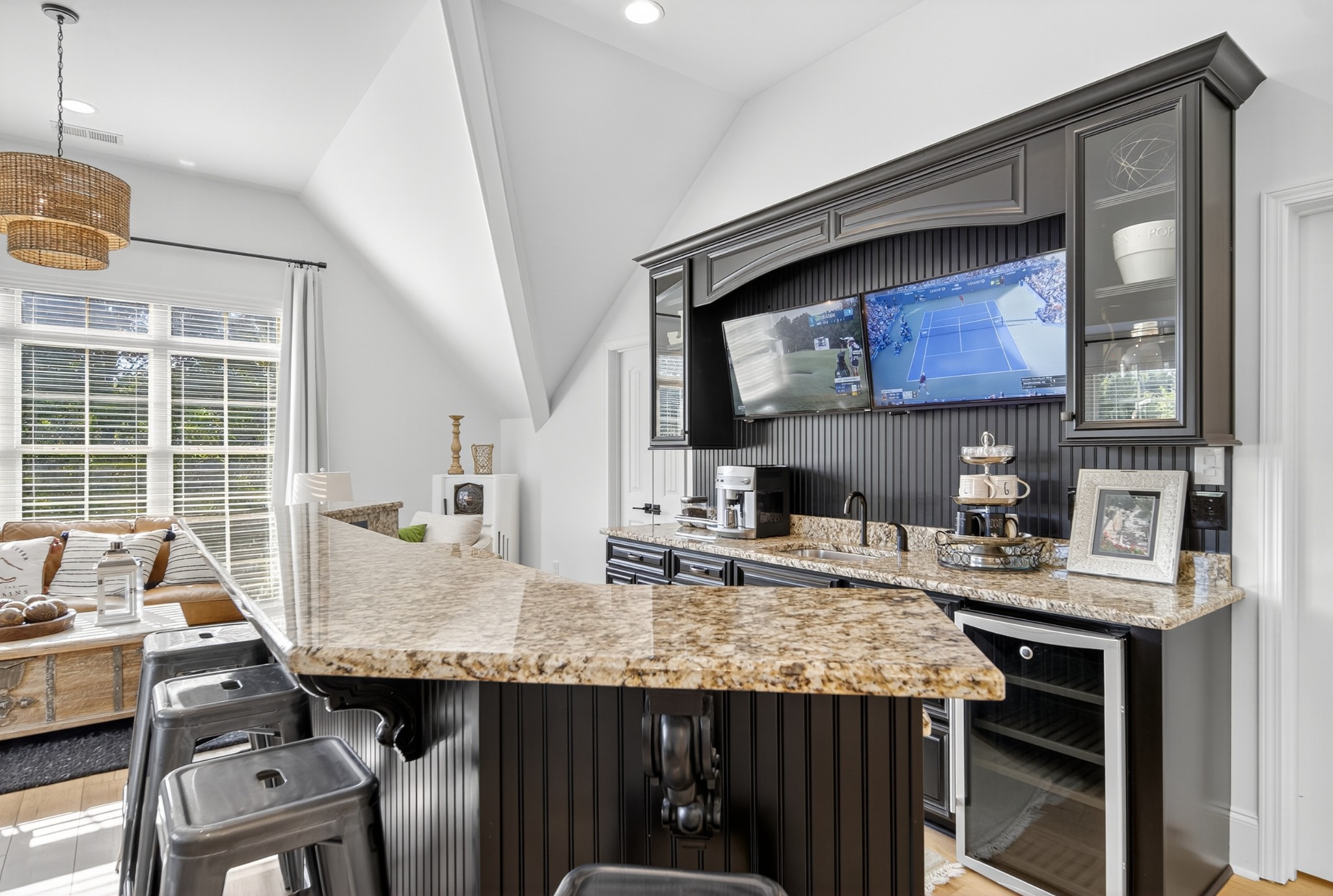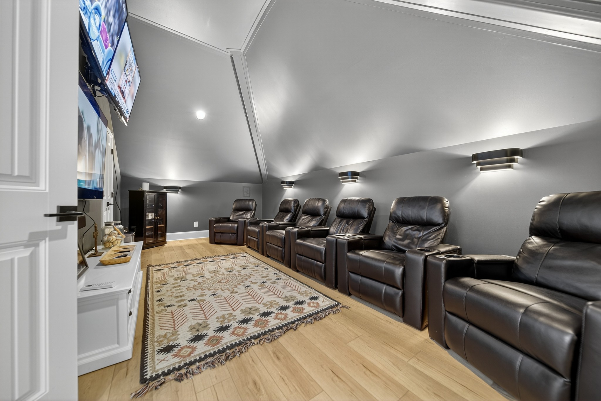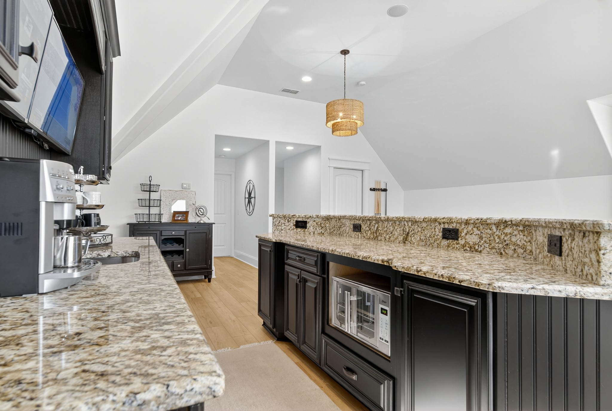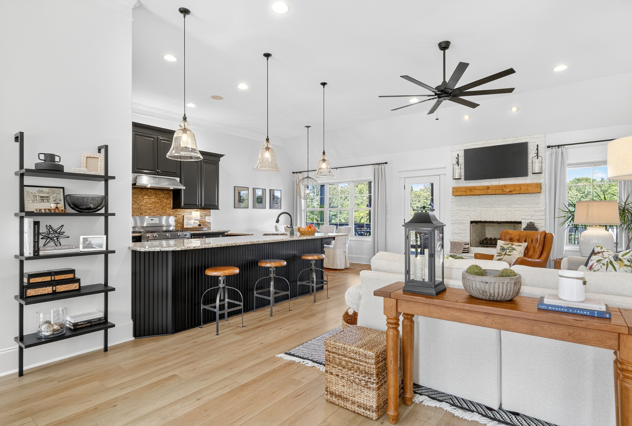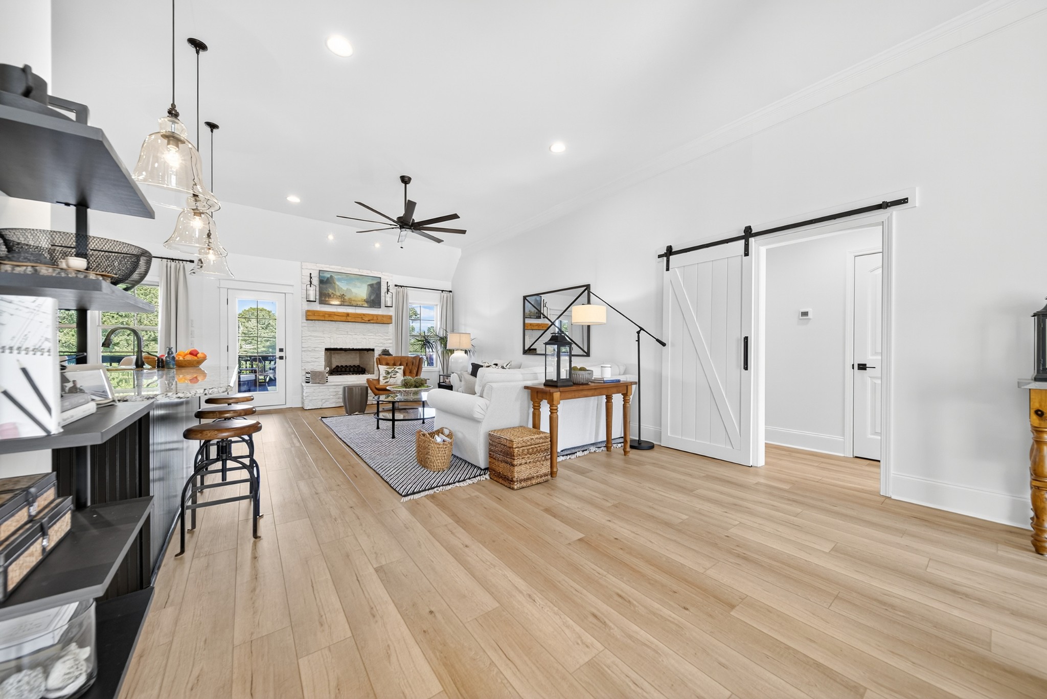 Incredible breathtaking views! Located on a private lake in a gated community, this all brick luxury showplace has an open floor plan, huge gourmet eat-in kitchen, all stainless appliances, large walk-in pantry, formal dining, great rm with fireplace, coffered ceilings, three BR's on the main level, primary suite with massive walk-in closet, separate shower/tub/double vanities and tankless water heater. A 54 ft oversized deck (one half covered) with tv's, expands the length of the home with an equally spacious patio underneath. The rec room upstairs features a full kitchenette/two tv's, wine fridge and bar. Entertainer's dream with Sonos whole house speaker system, pool table (which stays) and a 24x11 media room with surround sound/three tv's. In 2020 sellers installed new roof, new luxury plank flooring throughout, & built the new outdoor patio with natural gas fire-pit. Tons of storage space..possible expansion walk in floored attic with 16 ft. ceilings, walk in crawlspace storage under the deck. Beautiful new landscaping in 2024, fenced back yard backing up to the walking trail that circles the lake. Three car immaculate garage features an EV charger! Just minutes from schools, shopping/dining, marinas and Old Hickory Lake! This house is even more stunning in person!