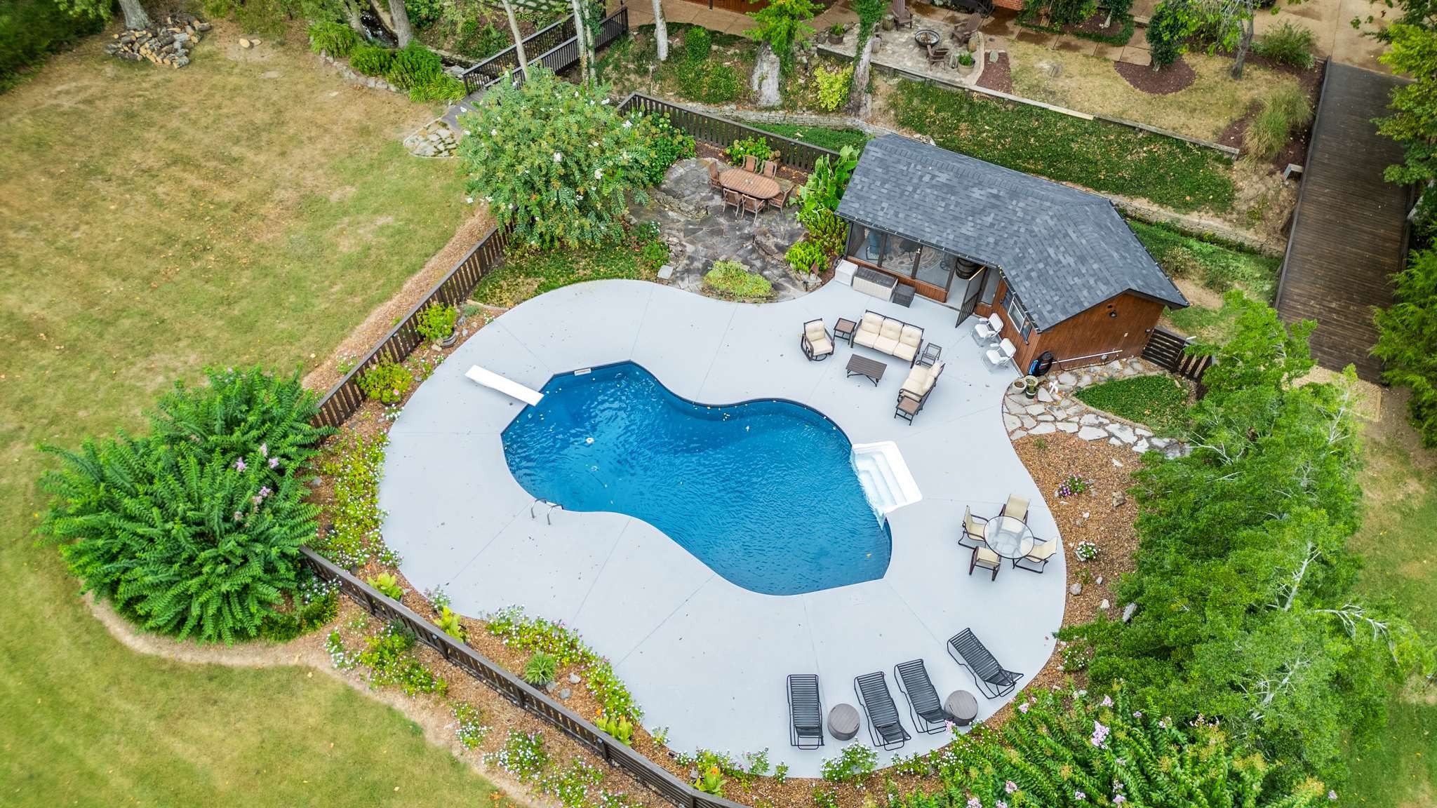 This private retreat on over 1 acre in Franklin offers the perfect blend of character, luxury and nature for indoor/outdoor living, lively entertaining and peaceful relaxation year-round. Natural setting boasts mature trees, a small creek with waterfall, and multiple outdoor gathering spaces including an expansive covered porch with bar/kitchen area, private hot-tub, and a lovely in-ground pool plus pool-house with half bath and kitchenette.