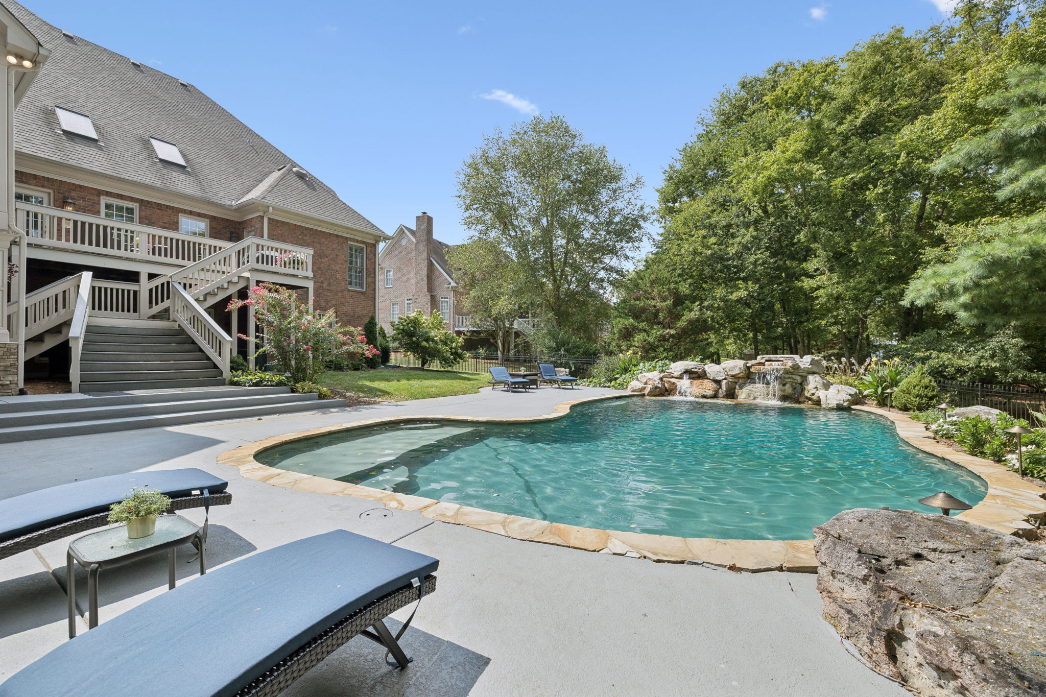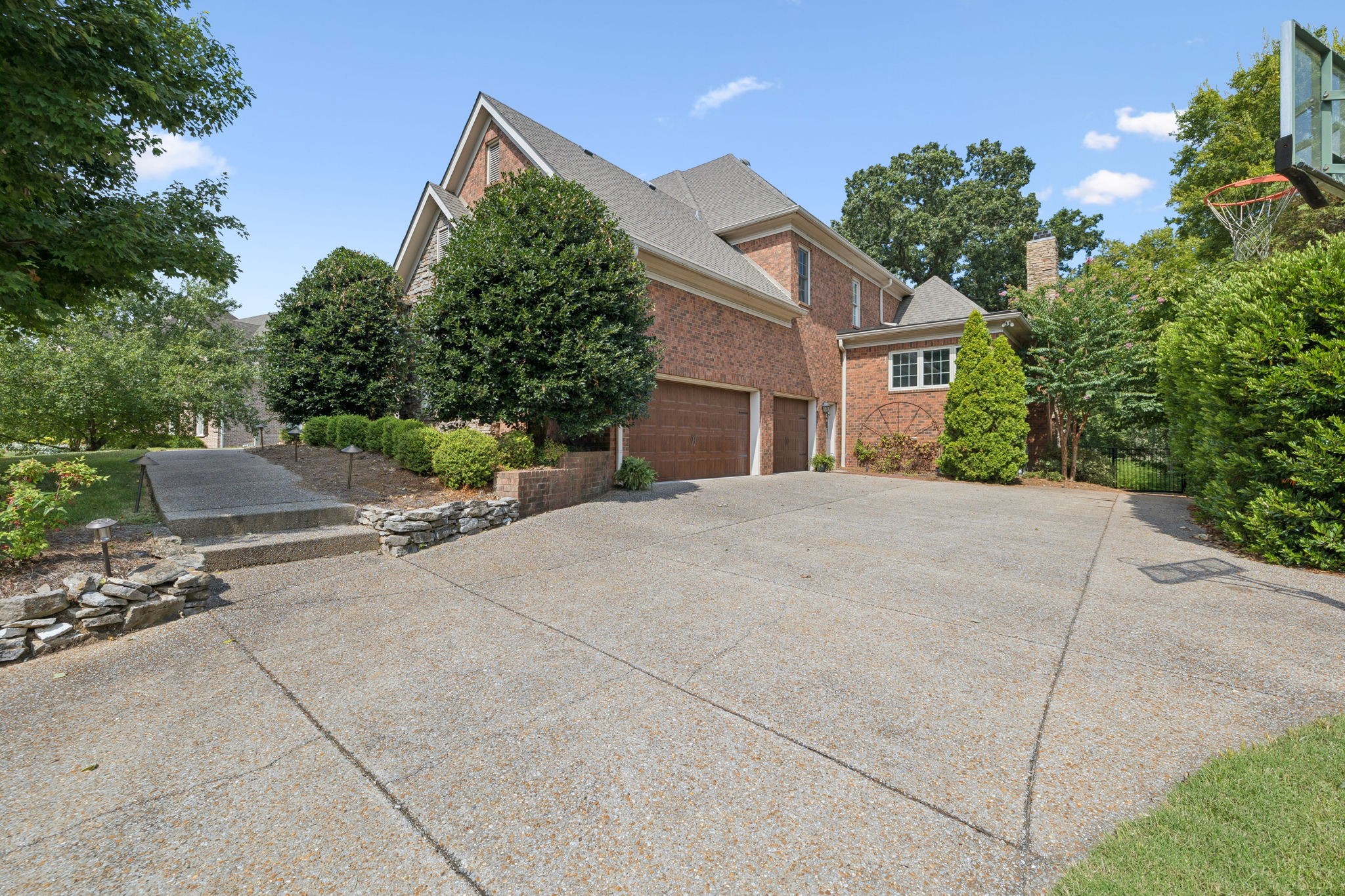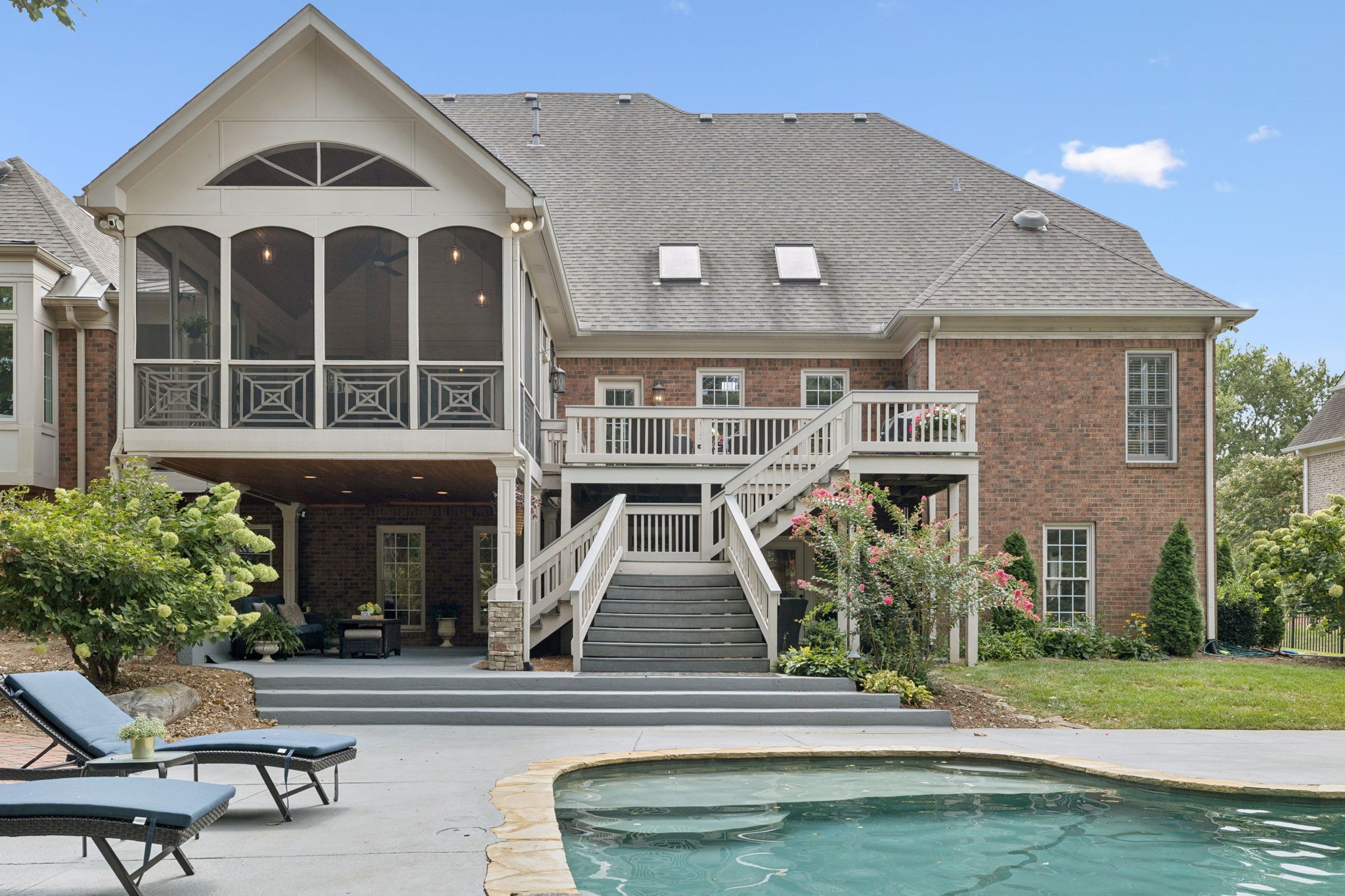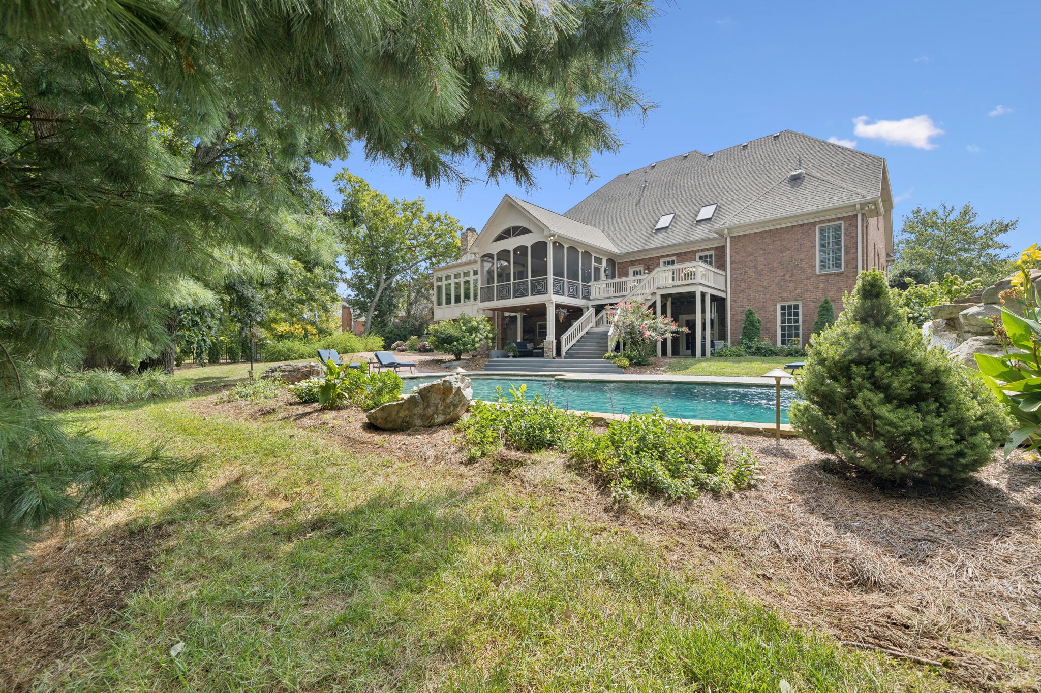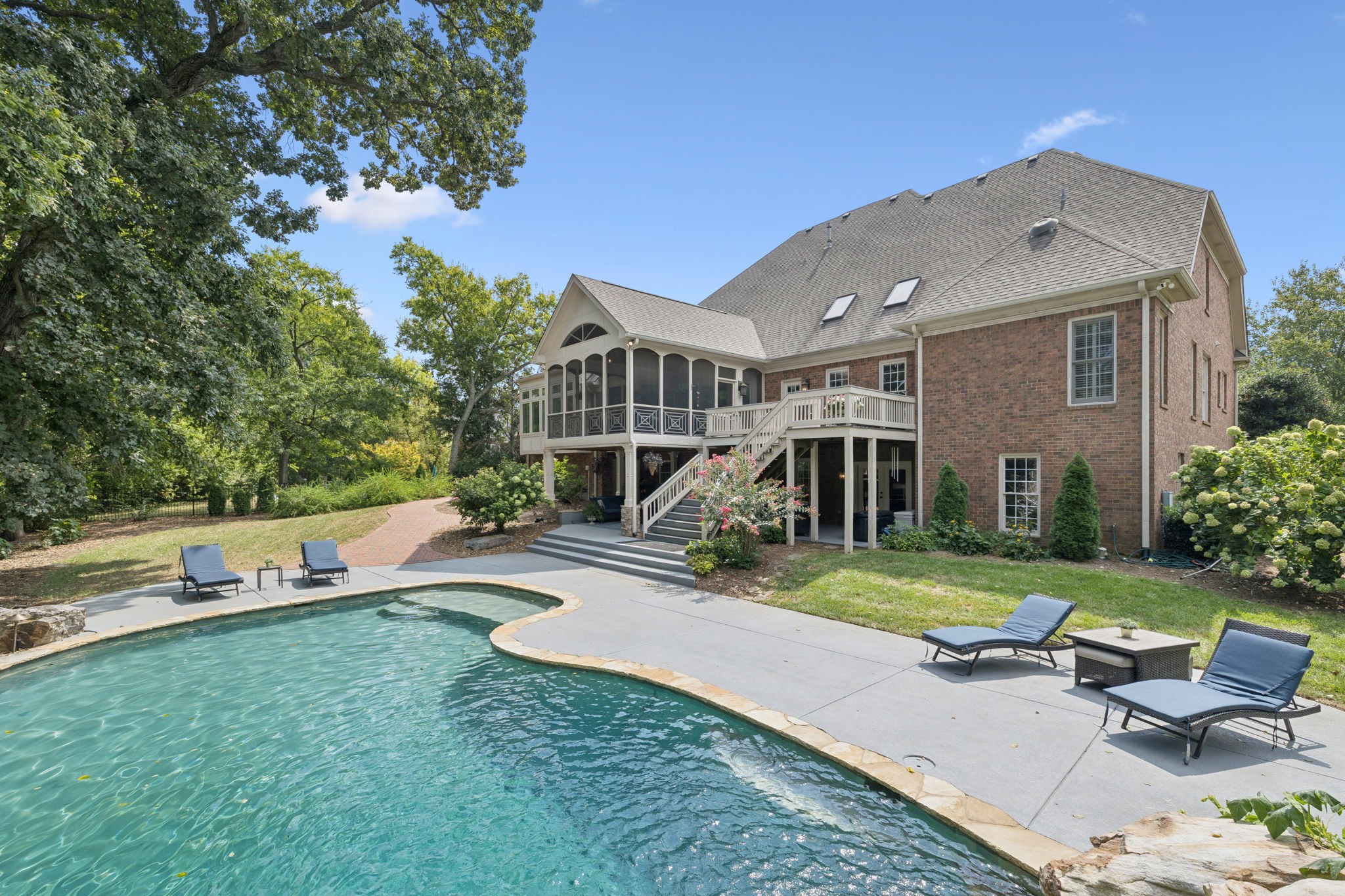 Parkside at Brenthaven stunner with a resort-style backyard—stone-waterfall pool, vaulted screened porch, and private fenced backyard. Inside, 5 beds/4.5 baths and 8,081 SF on 0.79 acres. Main-level primary suite; kitchen opens to a coffered-ceiling family room with stone fireplace; separate vaulted living room with second fireplace. Fully finished walk-out basement with rec/game rooms, exercise room, kitchenette, and an ideal in-law/teen suite. 3-car garage, whole-house audio, and tankless water heater. Minutes to Crockett Park, Brentwood Library, YMCA & I-65; quick hop to Cool Springs and Nashville. Zoned for top-rated Williamson County schools—Lipscomb ES, Brentwood MS & Brentwood HS. No HOA.