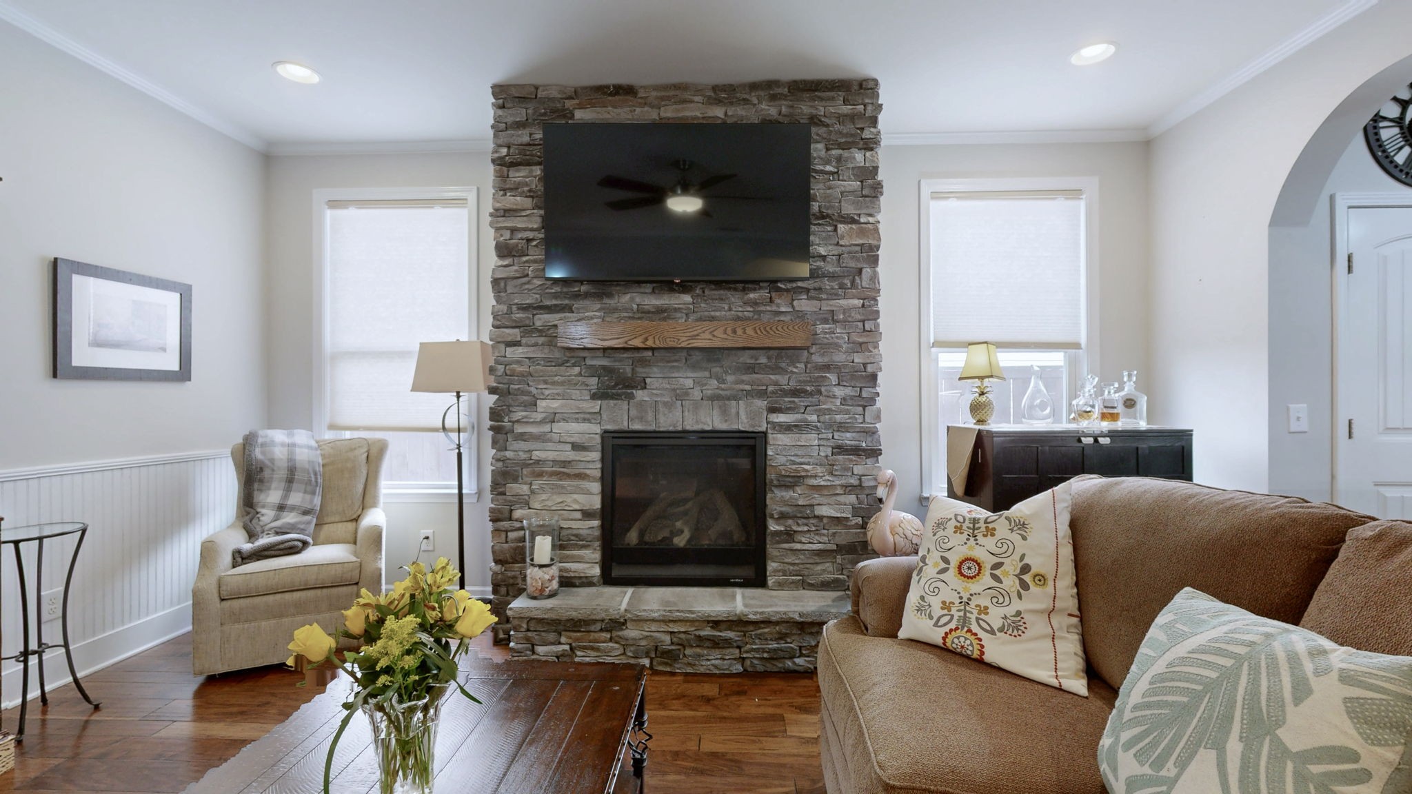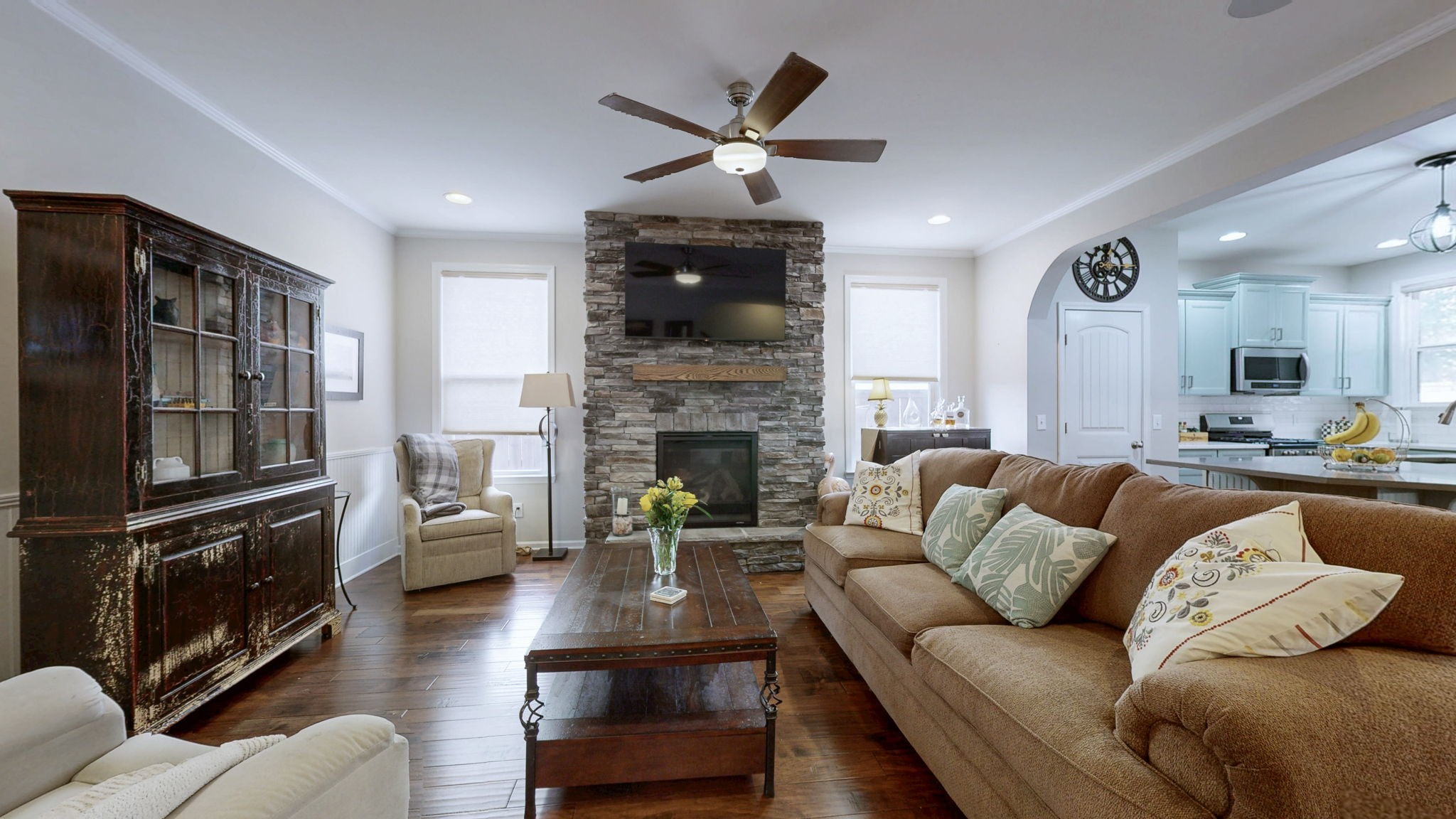 Live, Love, Work & Play in this exceptional Stonewater Dr. home that truly has it all! The sellers have spared no expense on upgrades, giving you peace of mind and move-in ready luxury. This gorgeous home features open concept living with all bedrooms on the main floor, a spacious dining area, and a large upstairs bonus room with custom built-in shelves, beverage fridge, and a large walk-in attic for storage. The home boasts a brand-new roof (just 3 years old), new HVAC, new water heater, new appliances that remain, new quartz countertops with an expanded island and new painted cabinets and cabinetry, new carpet in the master and front bedroom, hardwood floors throughout, fresh landscaping, and a beautiful solid wood front door. Custom details are everywhere—lifetime warranty blinds, custom closets, detailed wainscoting in the foyer and front bedroom, and a completely remodeled tile walk-in shower in the primary suite. The oversized screened-in patio with extended concrete pad overlooks a private wooded backyard with full irrigation in the front and back, perfect for year-round outdoor living. Additional features include a gas stove and community amenities such as an Olympic-sized pool, clubhouse, fitness center, and walking trails. Every detail has been thoughtfully updated—this is a home you won’t want to miss!