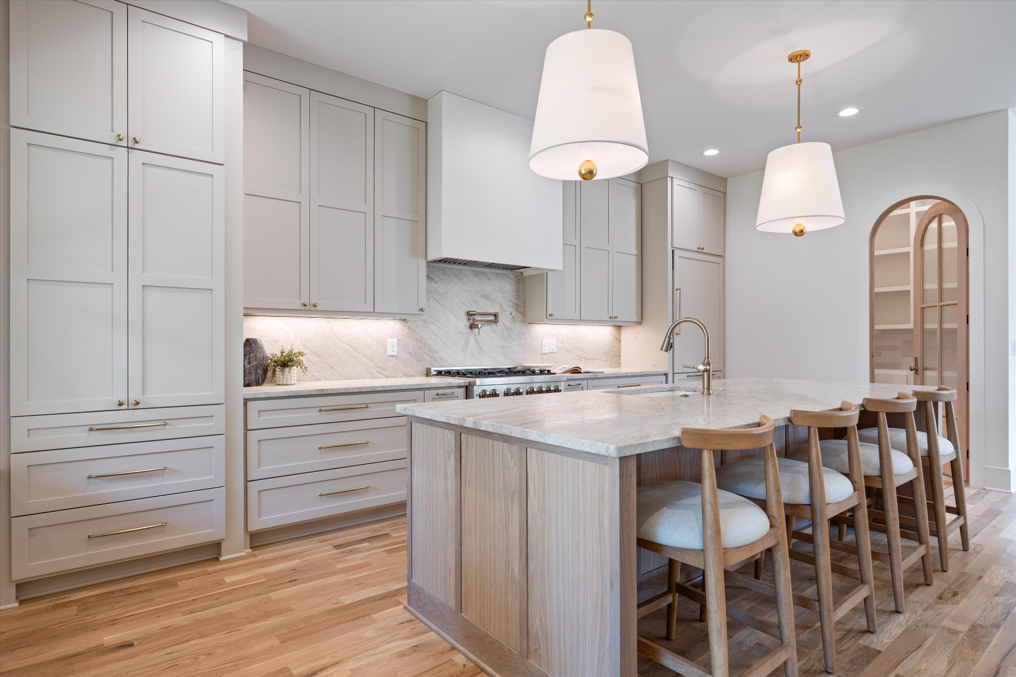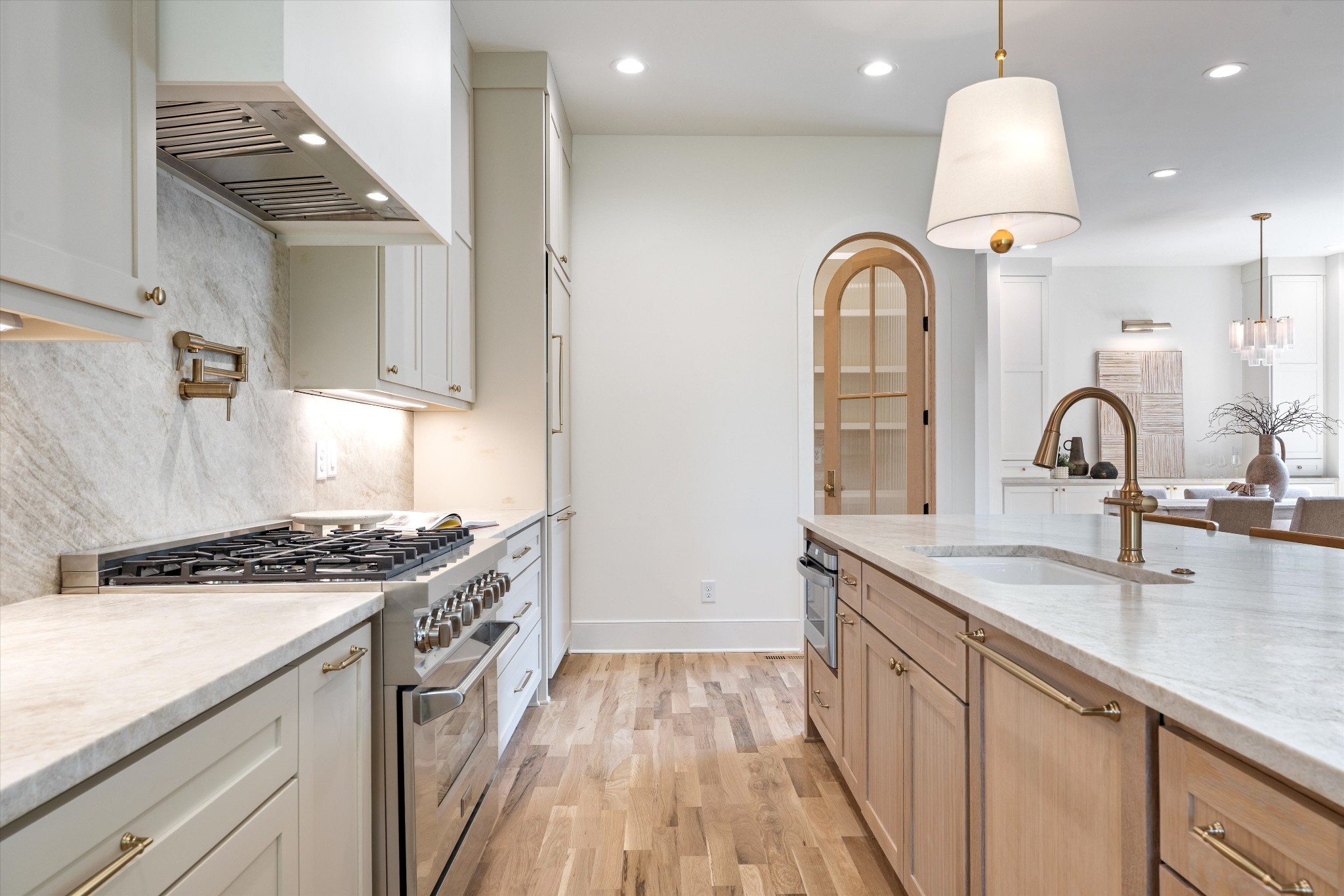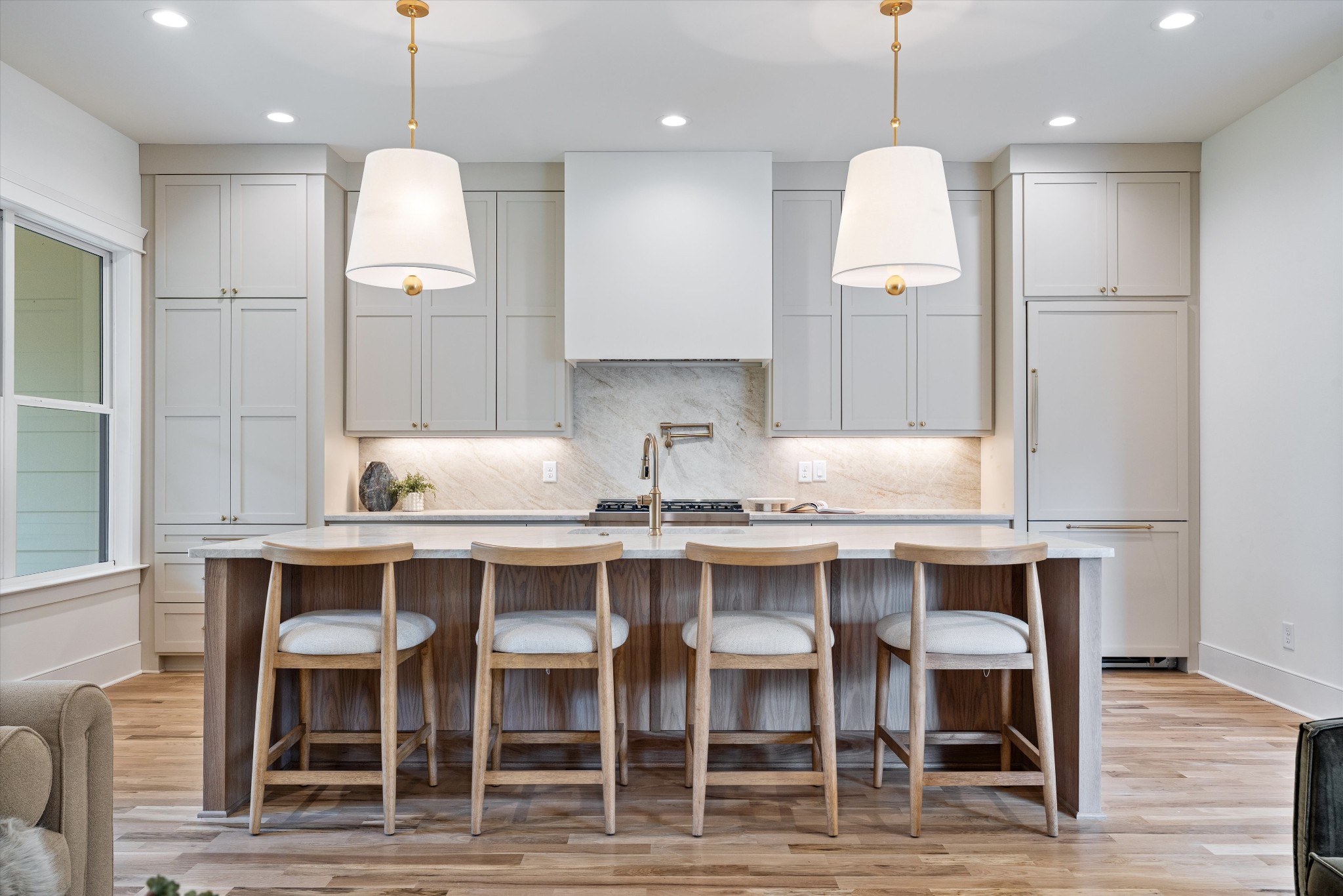The kitchen offers a spacious layout with an oversized island, Taj Mahal countertops, cabinet panel appliances, and plenty of cabinet storage. A walk-in pantry provides additional space and functionality, while the dining area is perfectly positioned for entertaining.