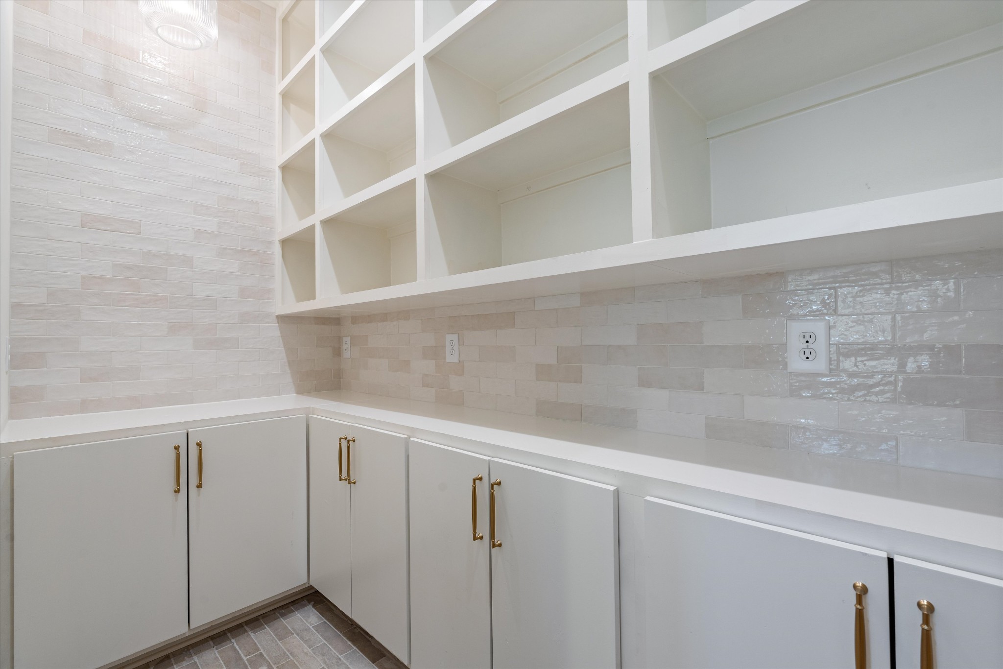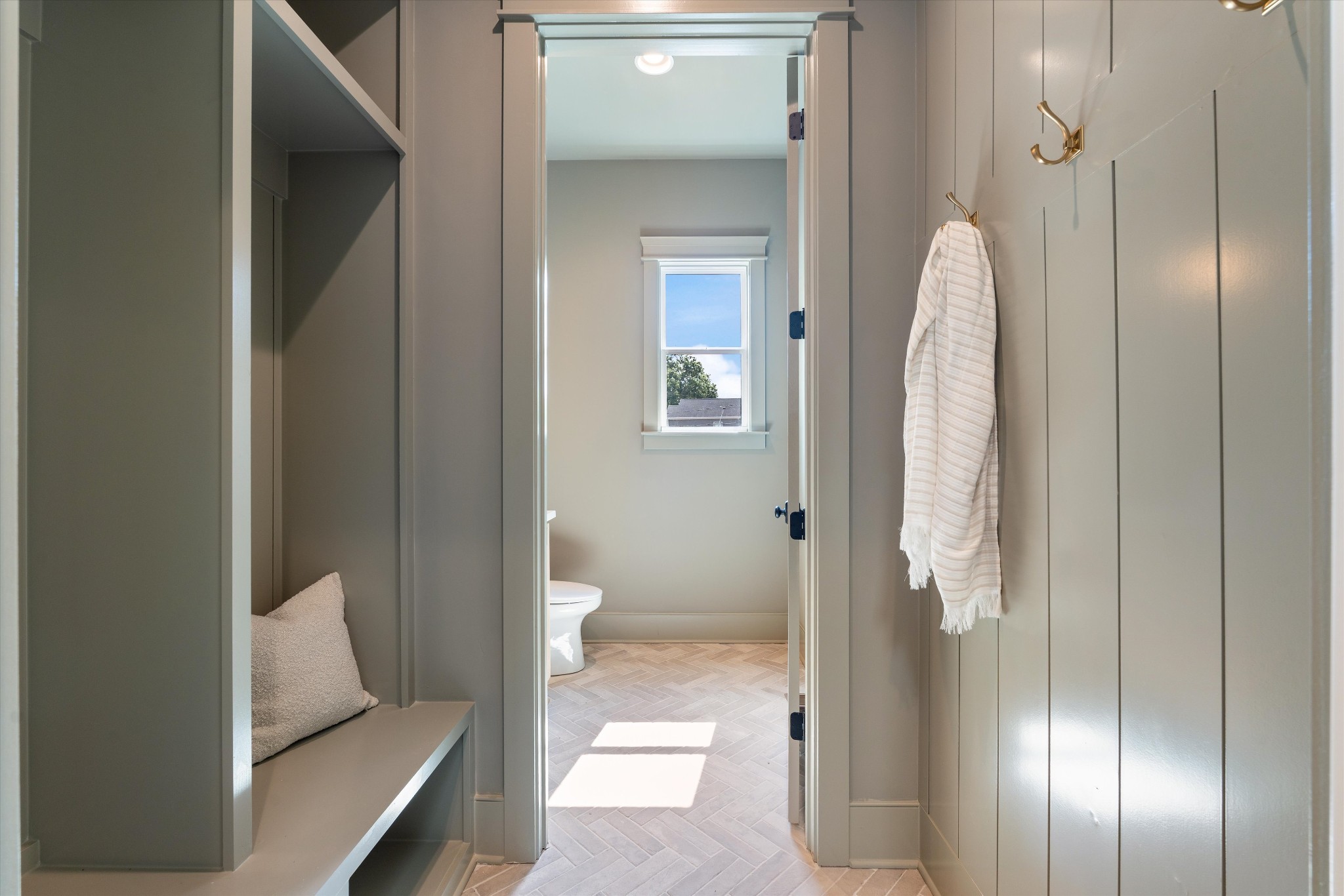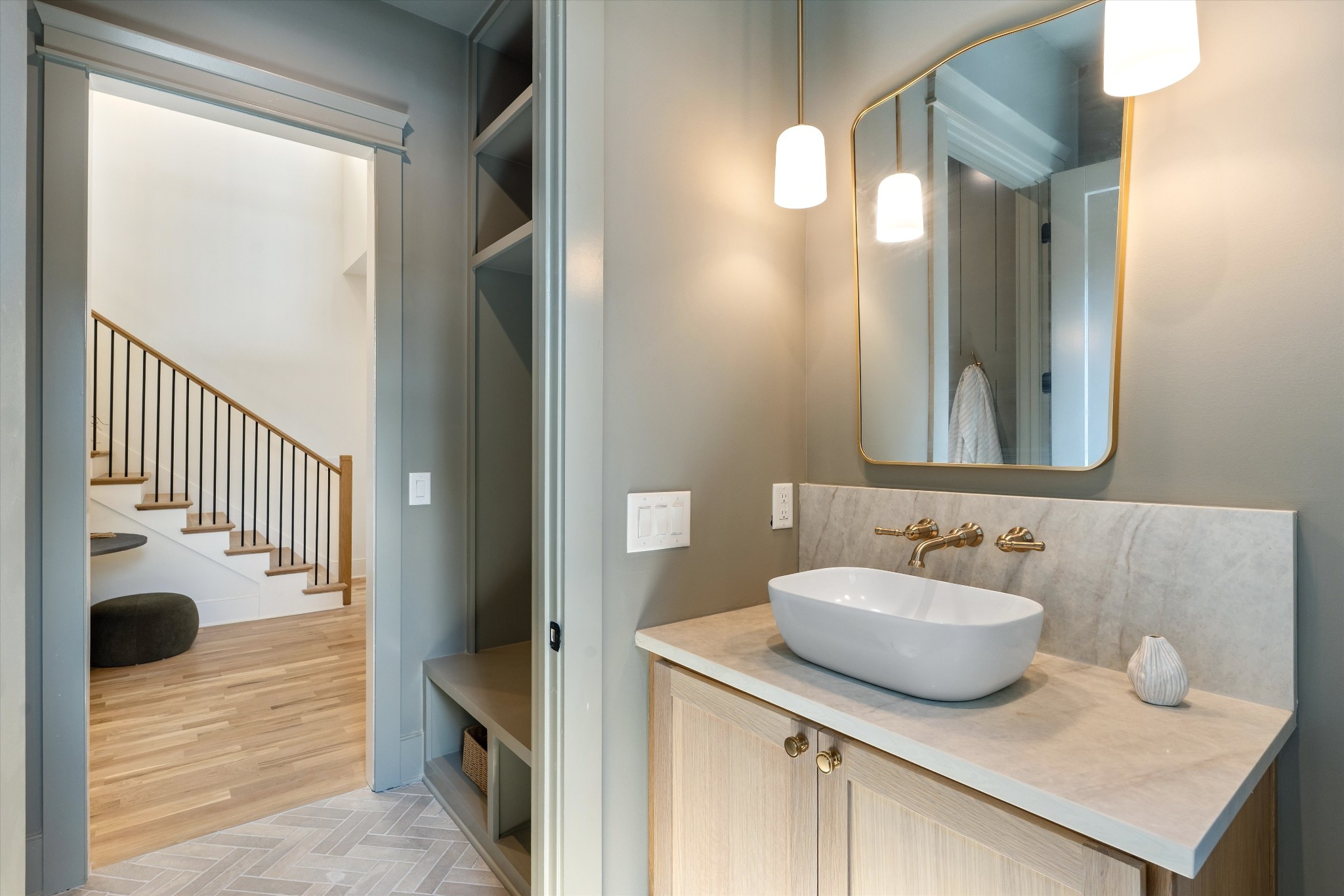 Other highlights include a spacious laundry room with cabinetry, a powder room with oak cabinets, a mudroom with built-ins and brick tile flooring, and a tankless hot water heater. The exterior is complete with a covered front entry and gas lantern giving this home added curb appeal.