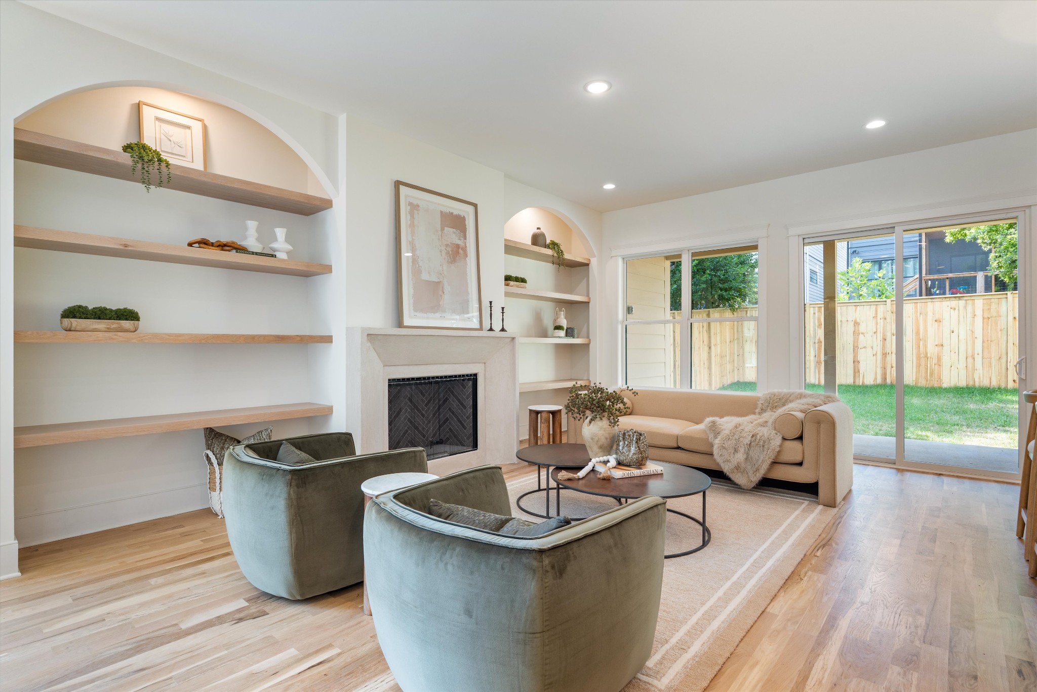 Elegant new construction home featuring 3 bedrooms, 2.5 baths, and 2,670 sq. ft. of well-designed living space including a vaulted ceiling bonus room. The unique floor plan greets you with a 2-story foyer, 10’ ceilings on the main level, 9’ ceilings upstairs, real hardwood floors, and 8’ interior doors. The living room centers around a beautiful Arcustone fireplace with elegant curved bookshelves and opens to a large covered patio with a fully fenced backyard.