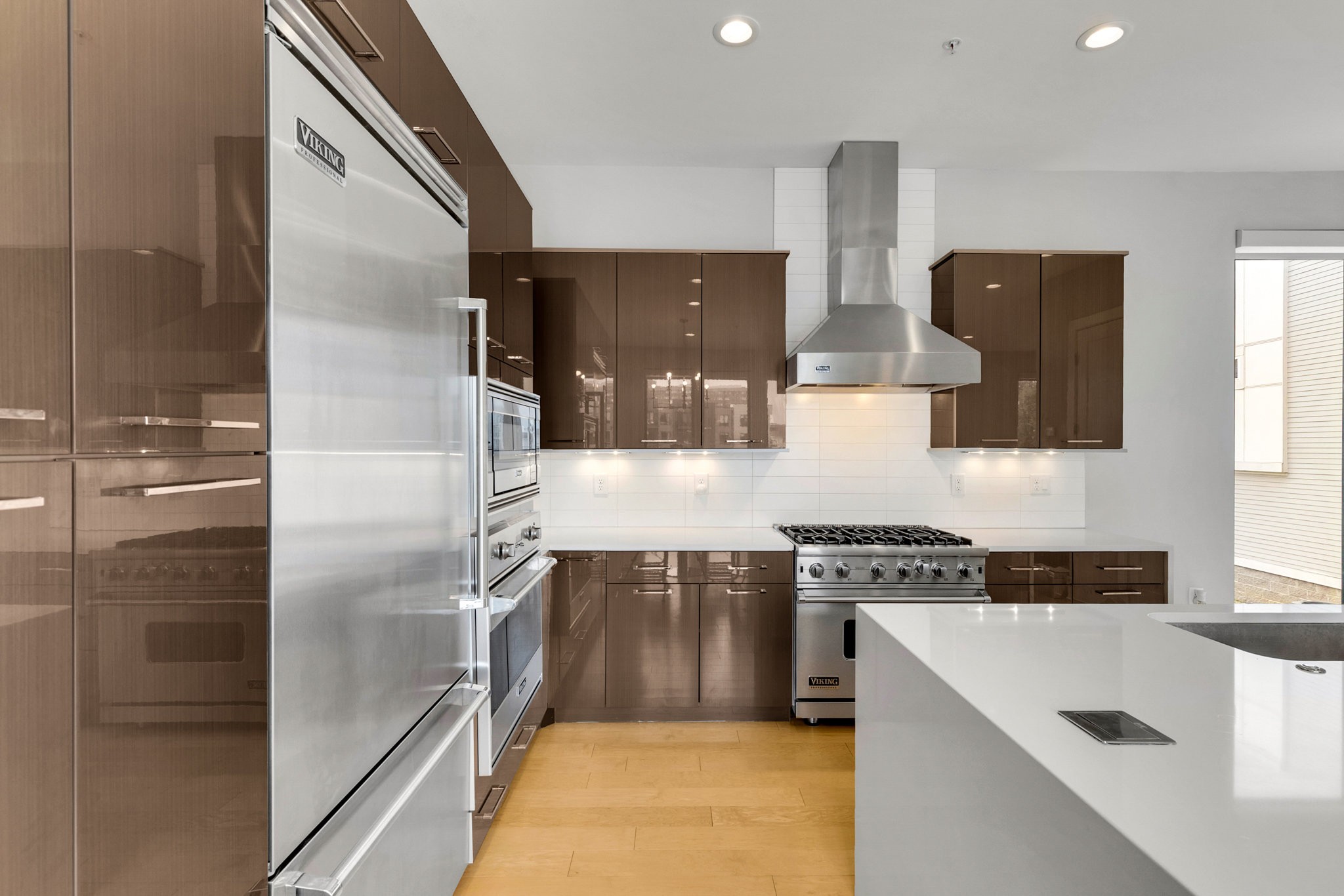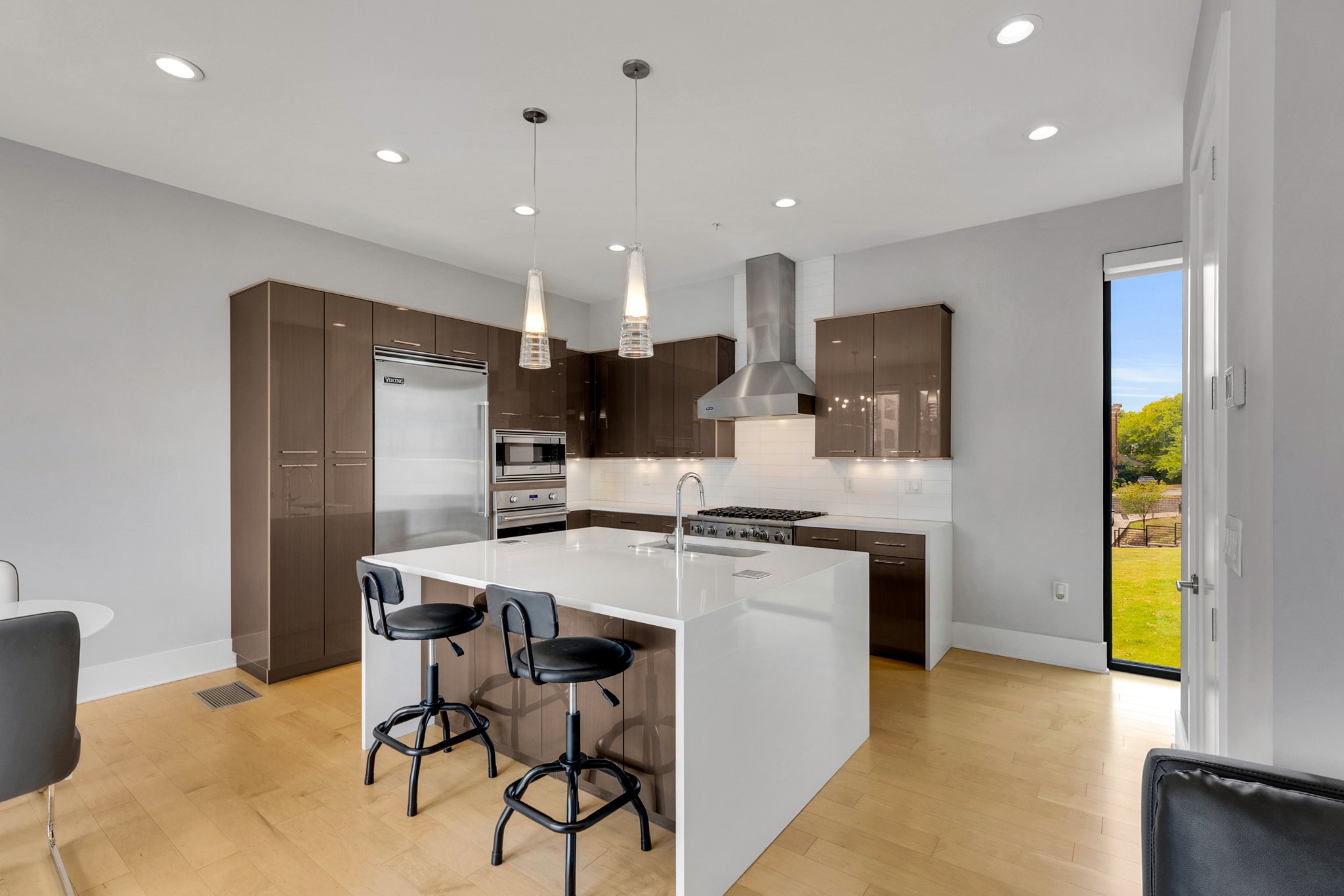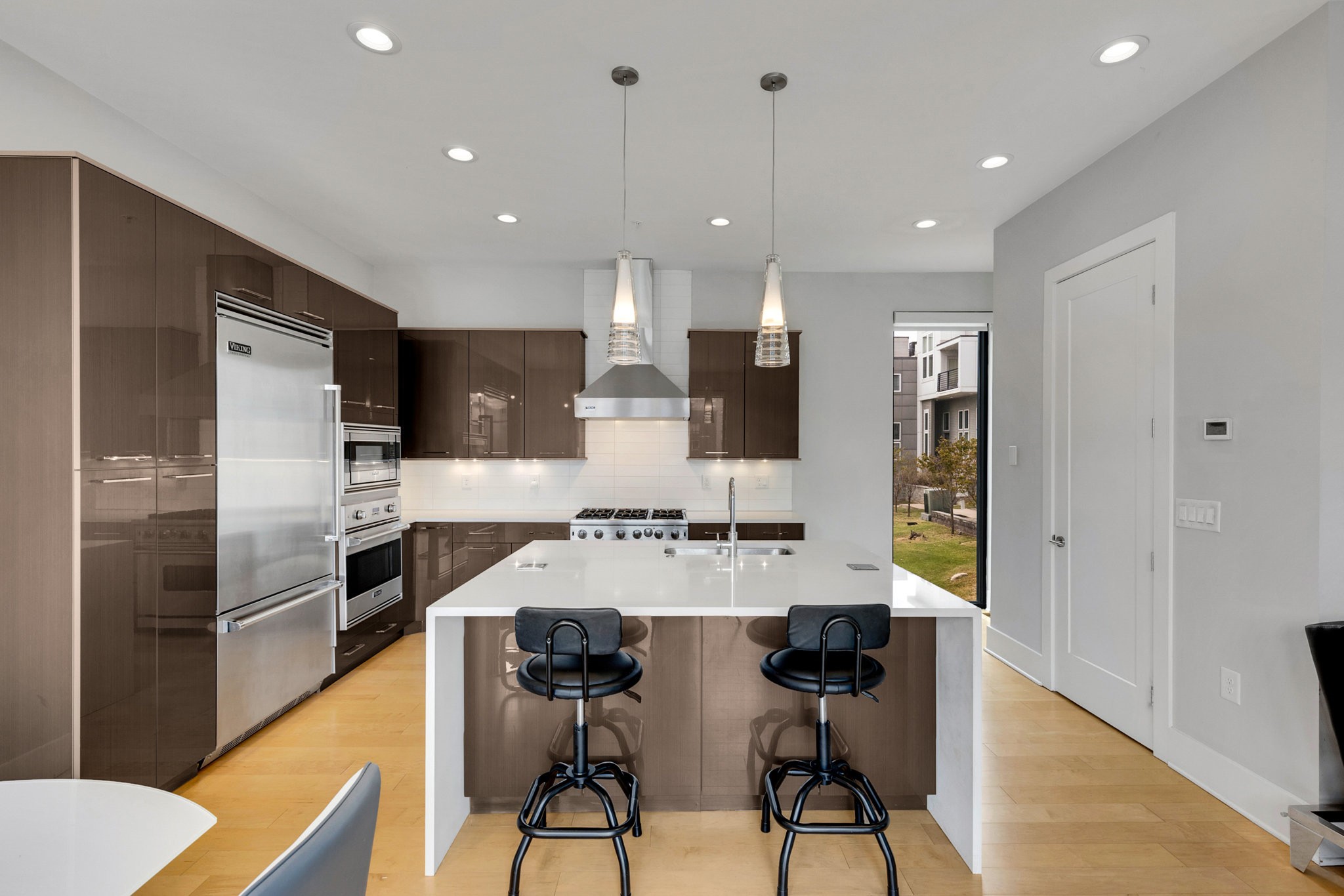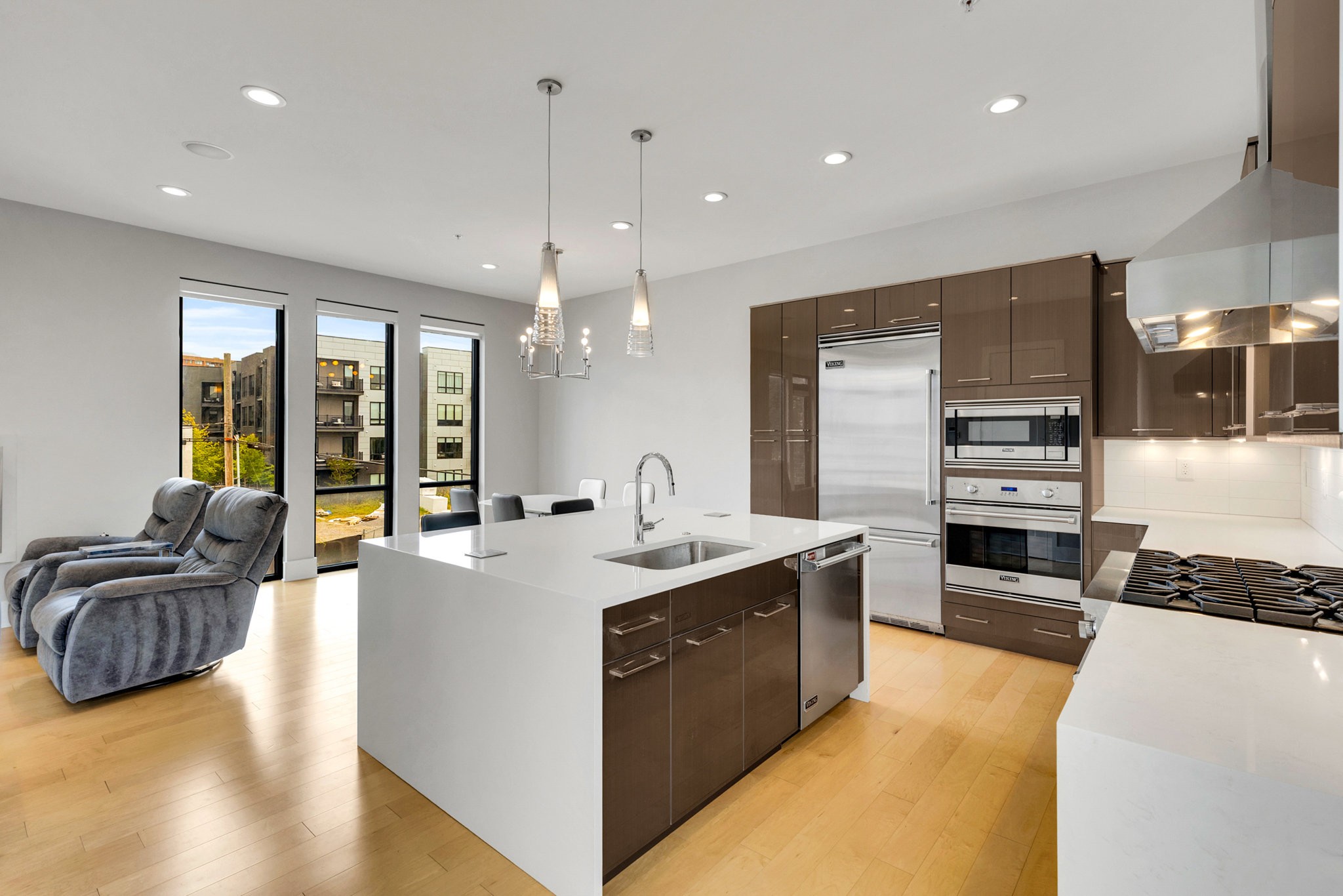 The main living area boasts soaring ceilings, a sleek gas fireplace, and motorized blinds, while the chef’s kitchen is outfitted with Viking appliances — including a 6-burner gas range — a large island with bar seating, and abundant storage. Each bedroom has its own spa-like en suite, with two featuring walk-in closets and oversized tile showers.