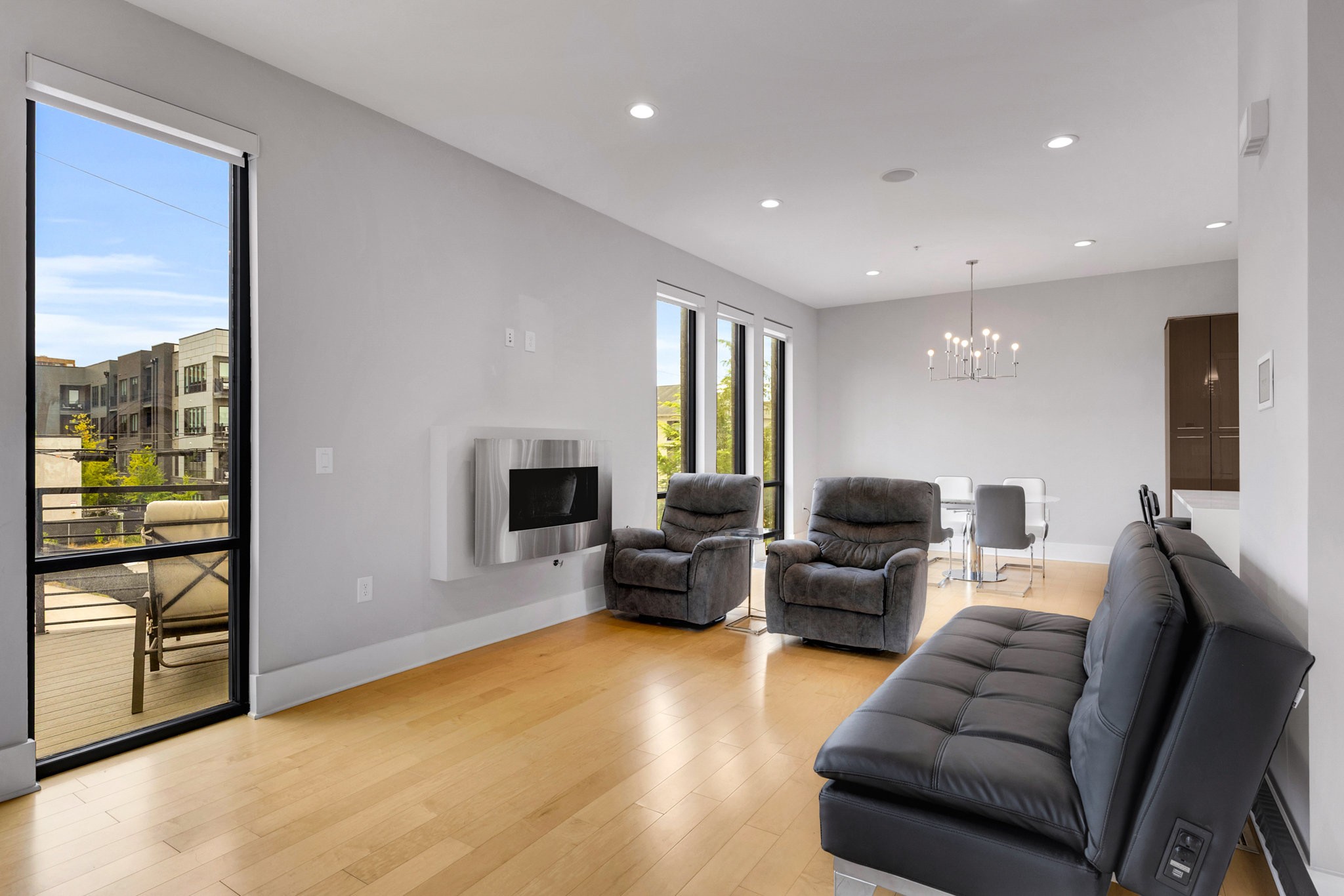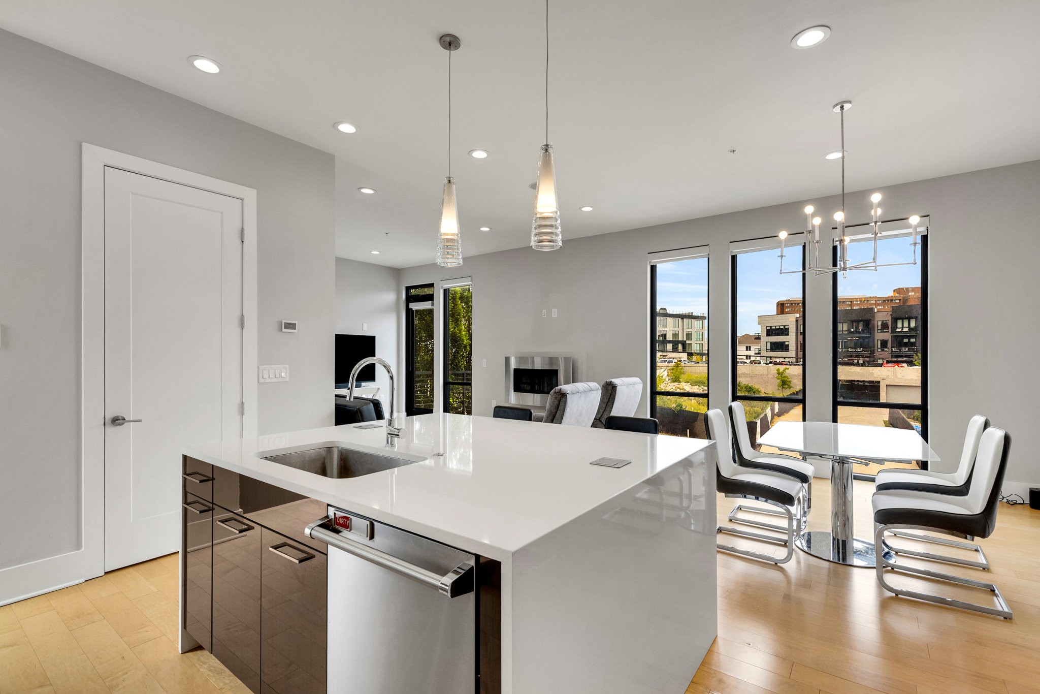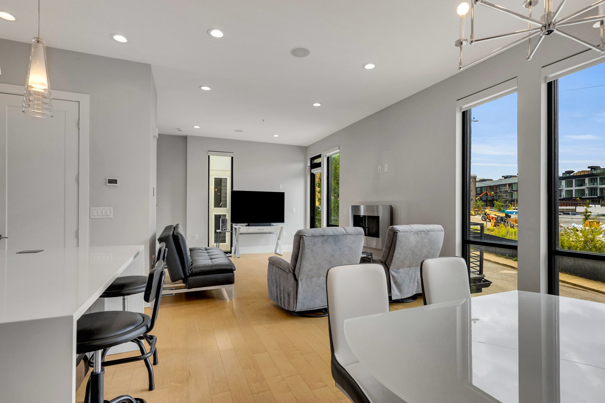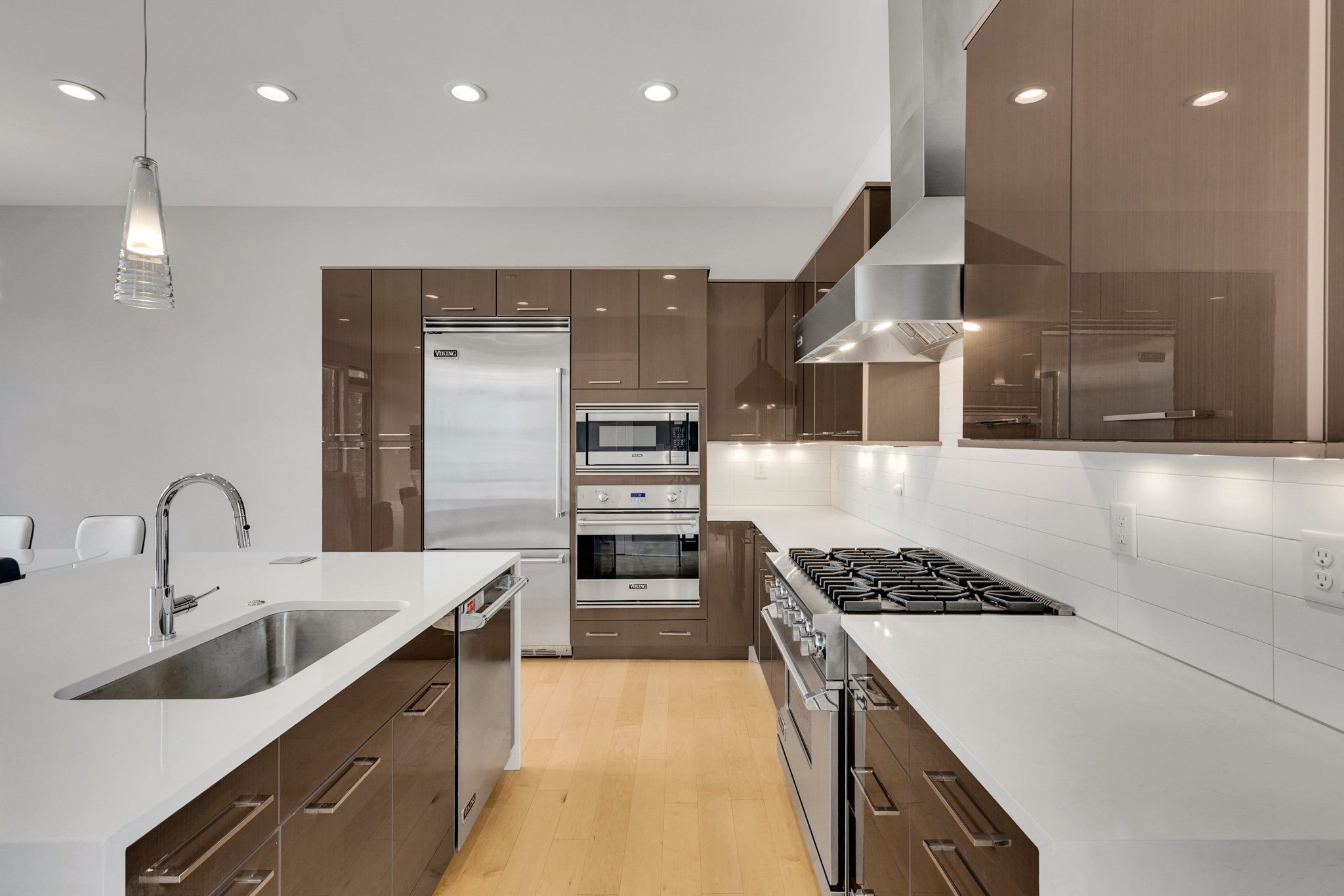The main living area boasts soaring ceilings, a sleek gas fireplace, and motorized blinds, while the chef’s kitchen is outfitted with Viking appliances — including a 6-burner gas range — a large island with bar seating, and abundant storage. Each bedroom has its own spa-like en suite, with two featuring walk-in closets and oversized tile showers.