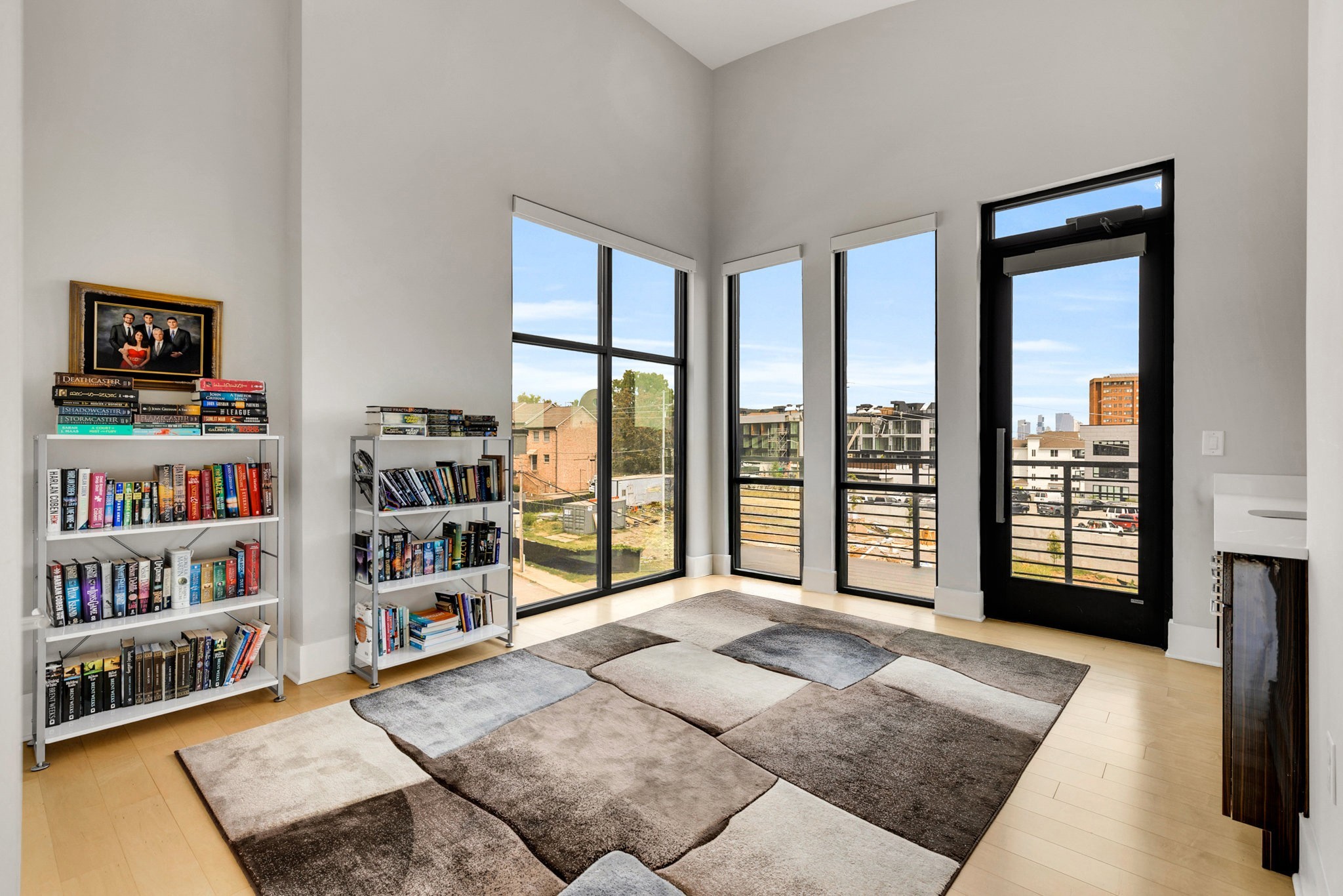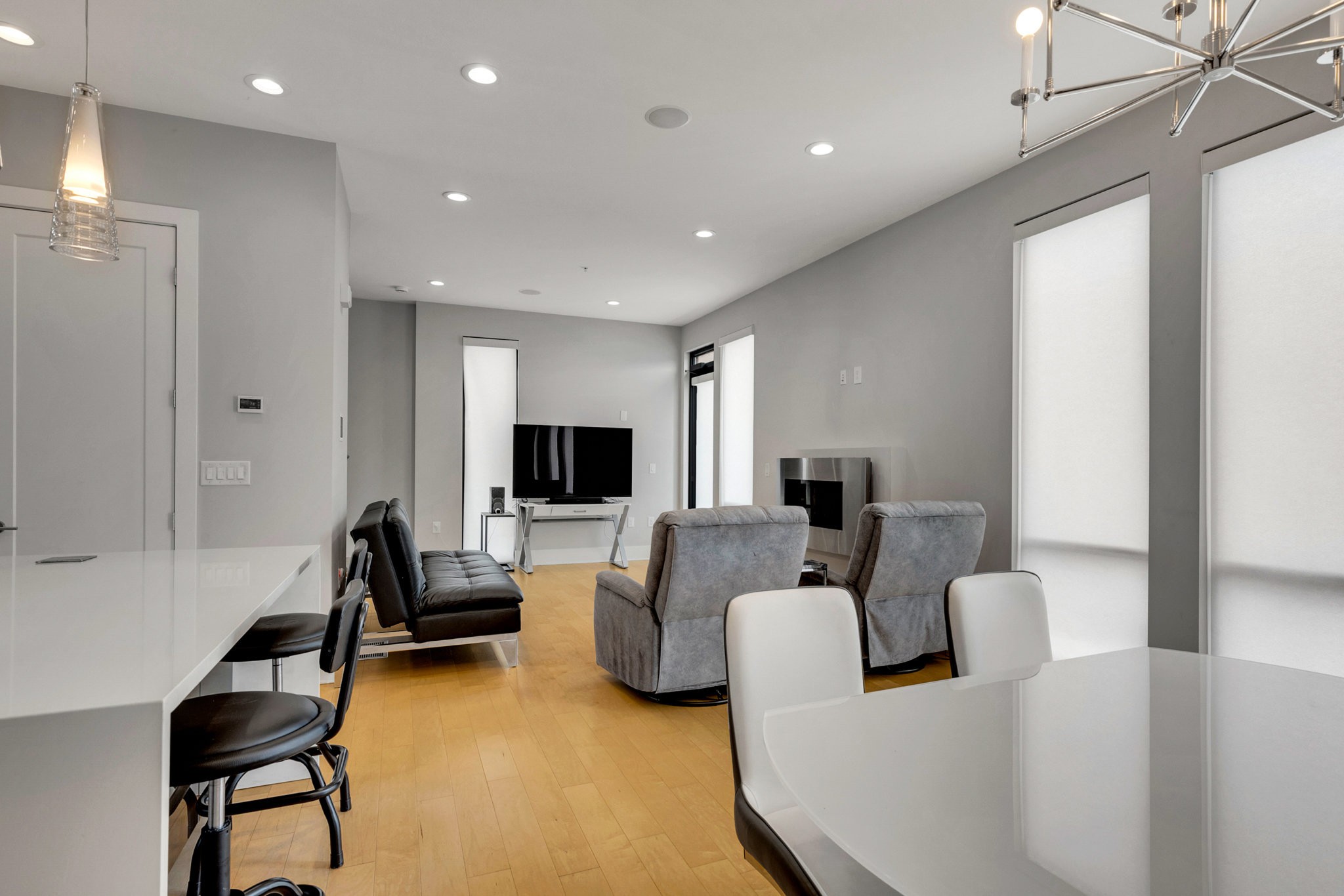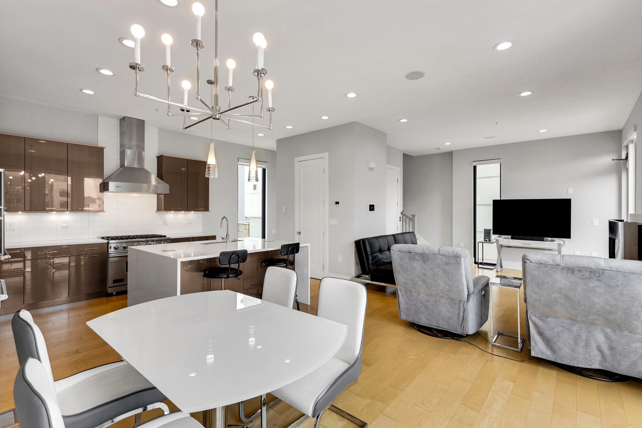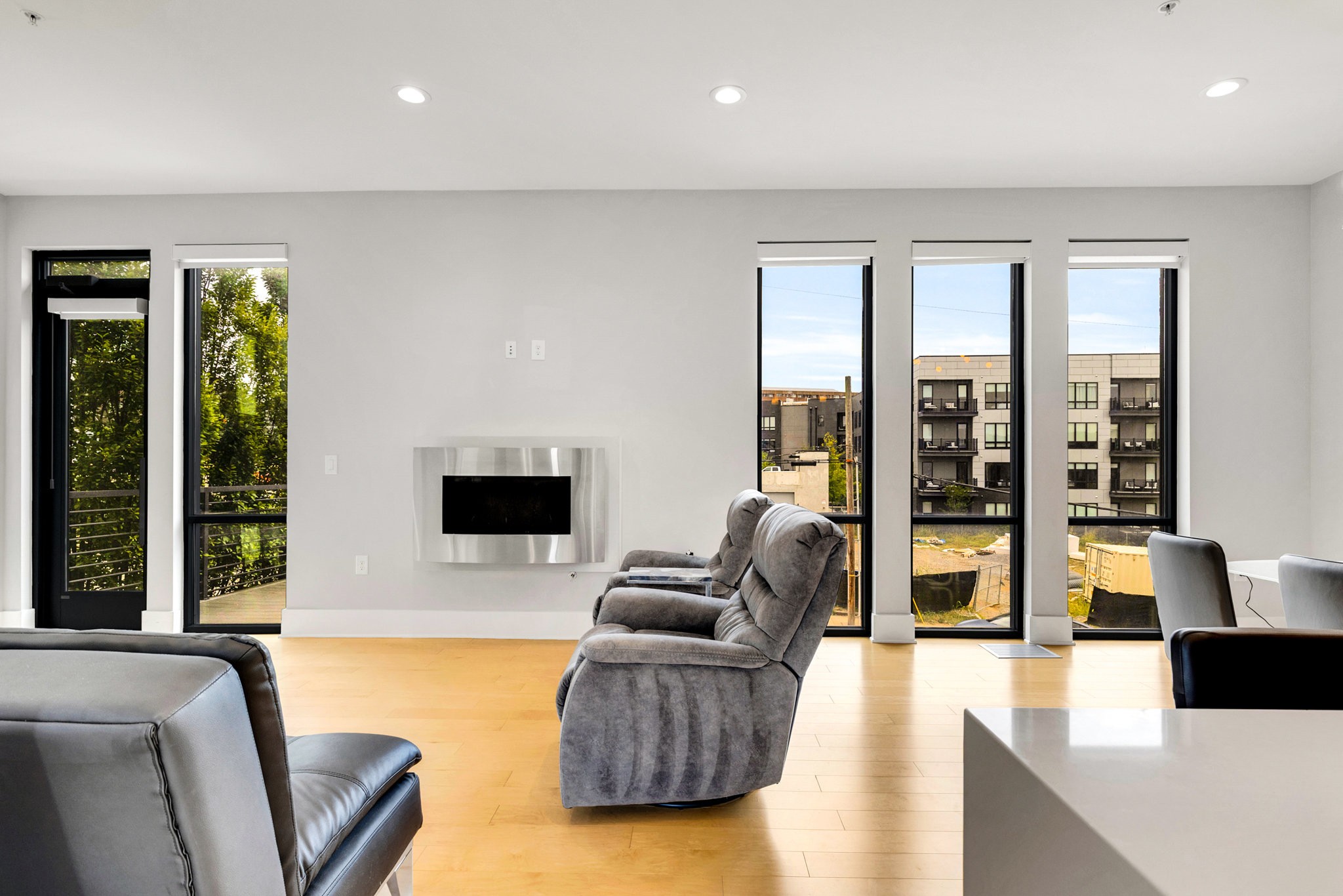 The main living area boasts soaring ceilings, a sleek gas fireplace, and motorized blinds, while the chef’s kitchen is outfitted with Viking appliances — including a 6-burner gas range — a large island with bar seating, and abundant storage. Each bedroom has its own spa-like en suite, with two featuring walk-in closets and oversized tile showers.