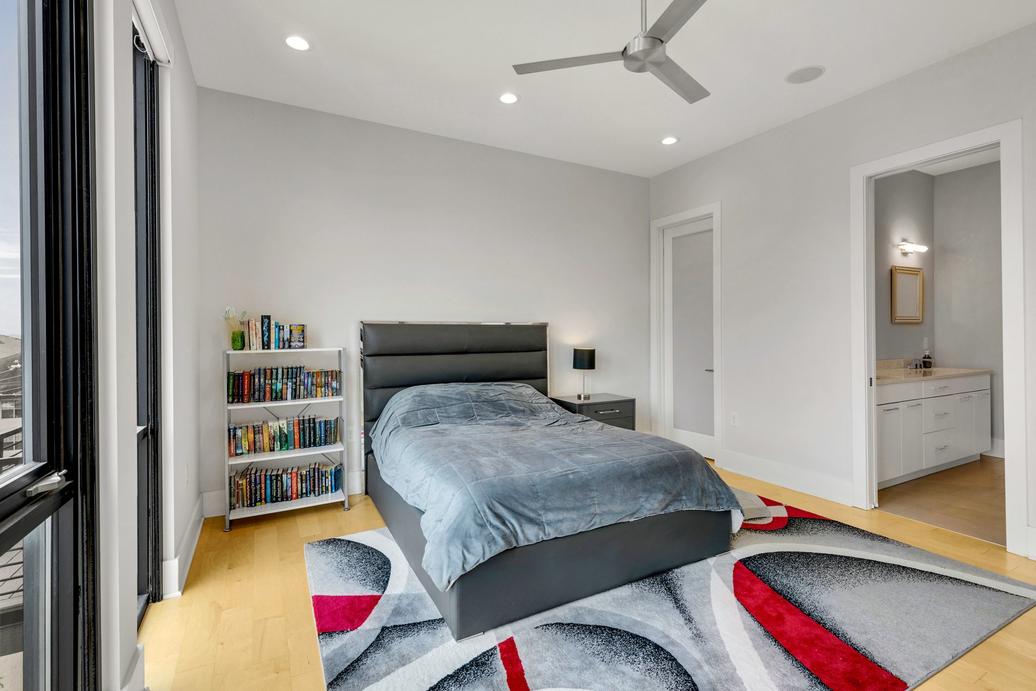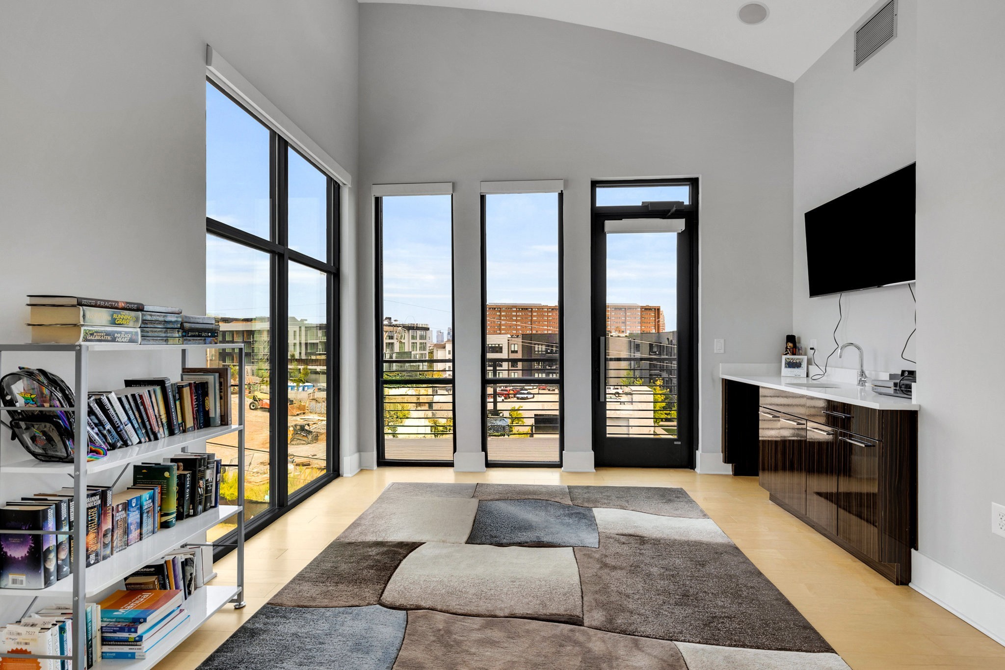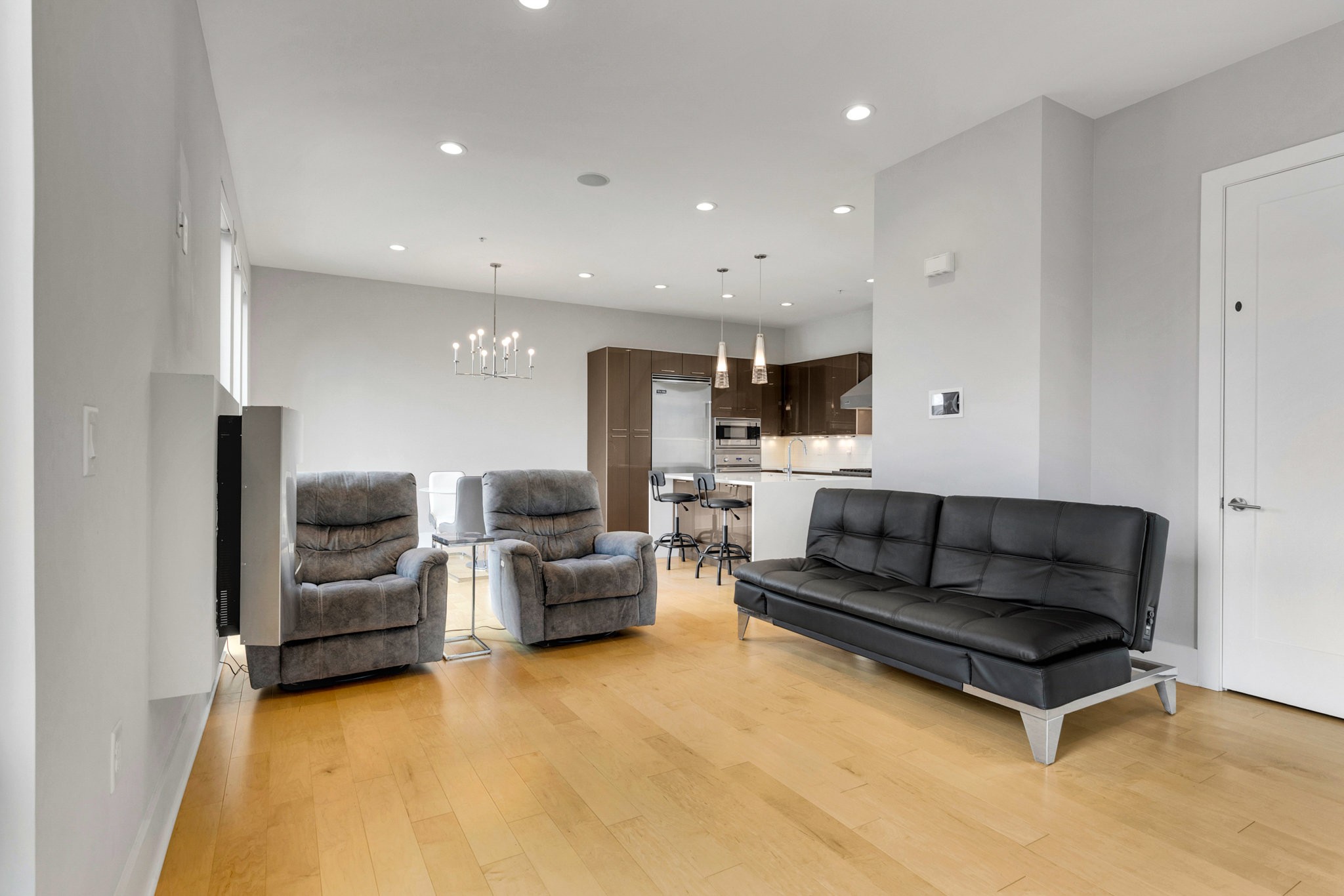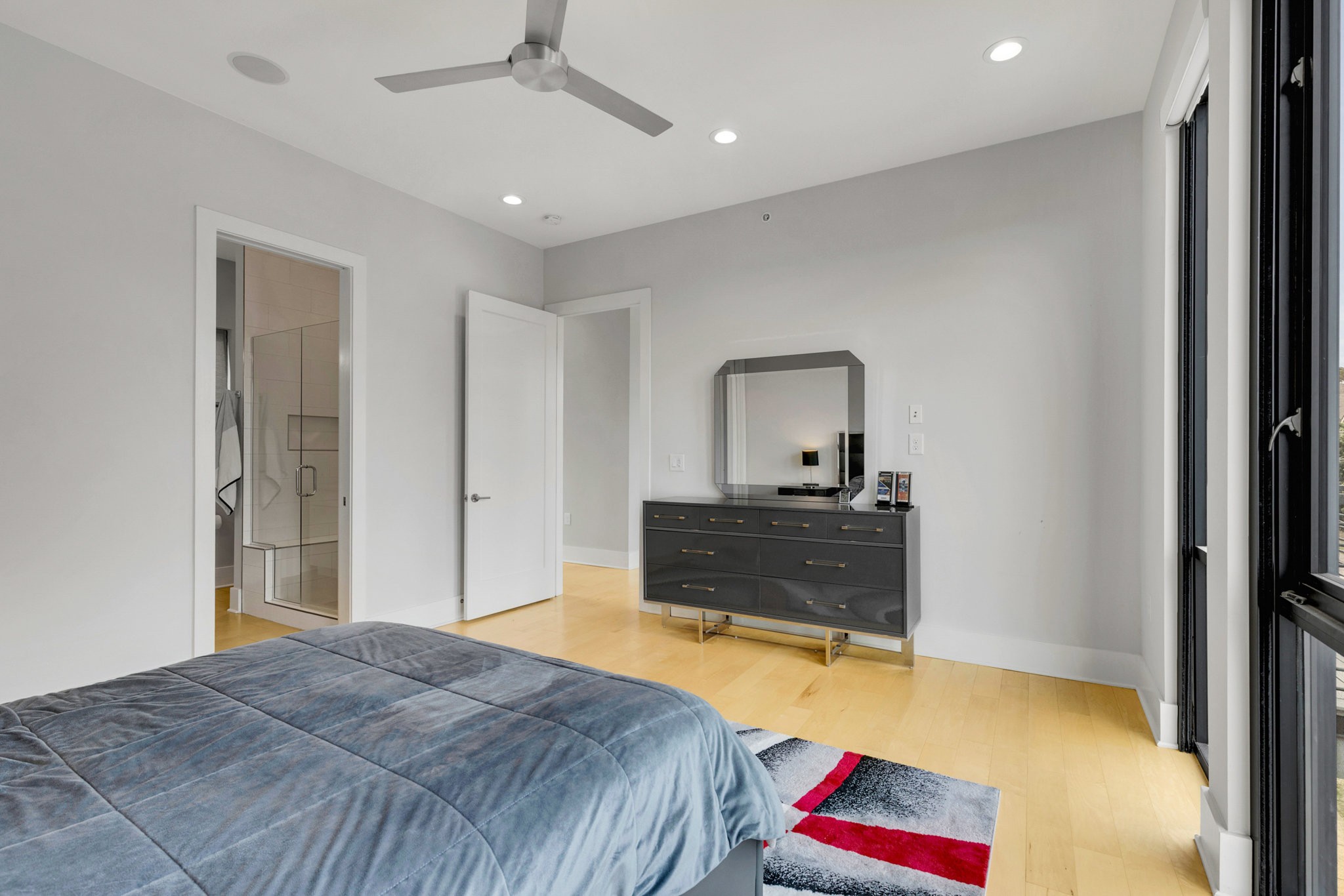 The main living area boasts soaring ceilings, a sleek gas fireplace, and motorized blinds, while the chef’s kitchen is outfitted with Viking appliances — including a 6-burner gas range — a large island with bar seating, and abundant storage. Each bedroom has its own spa-like en suite, with two featuring walk-in closets and oversized tile showers.