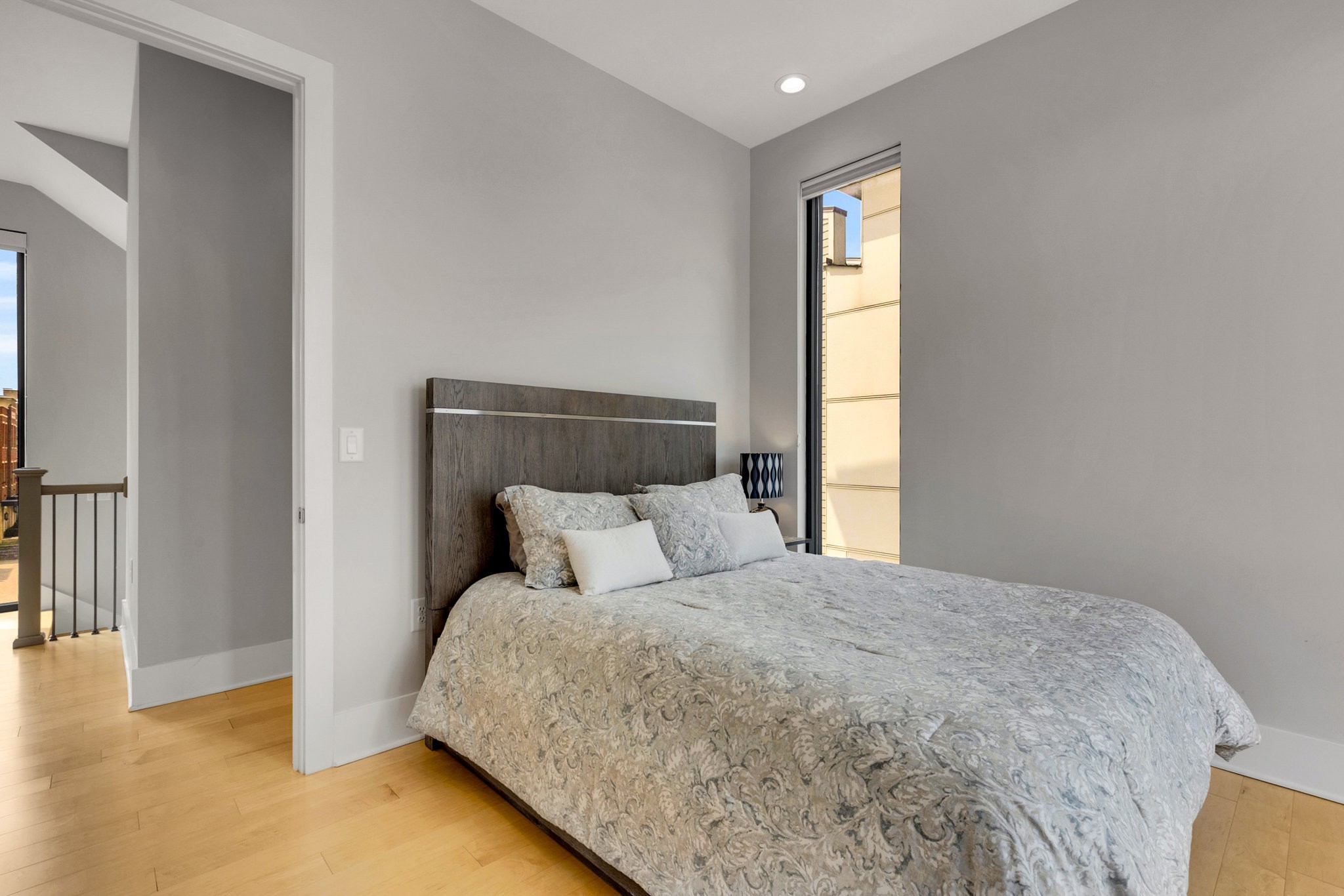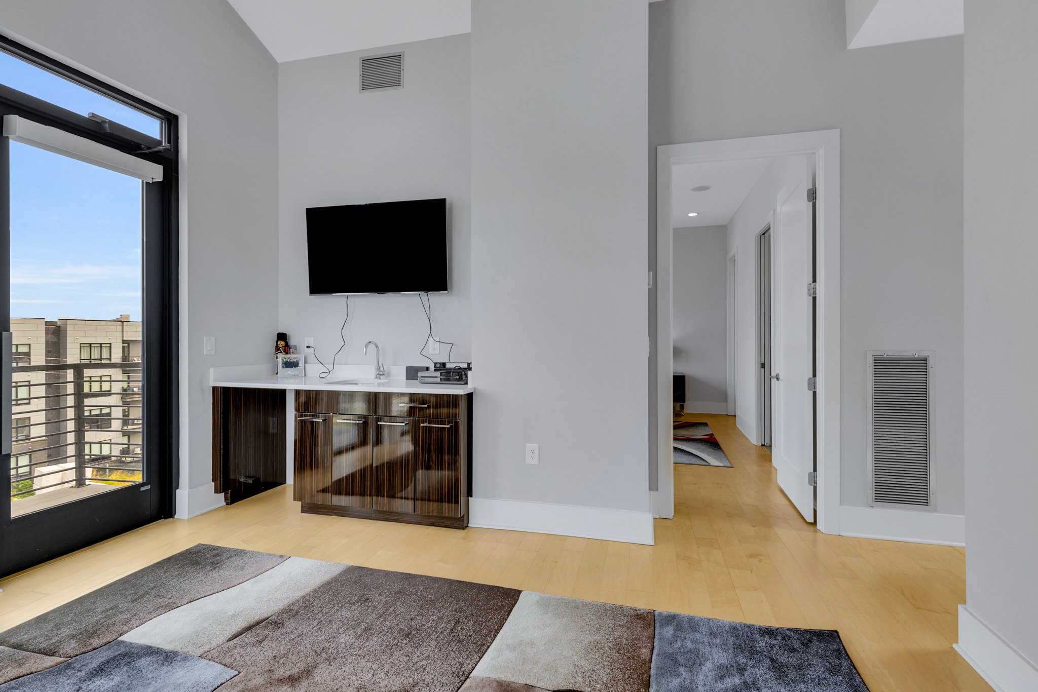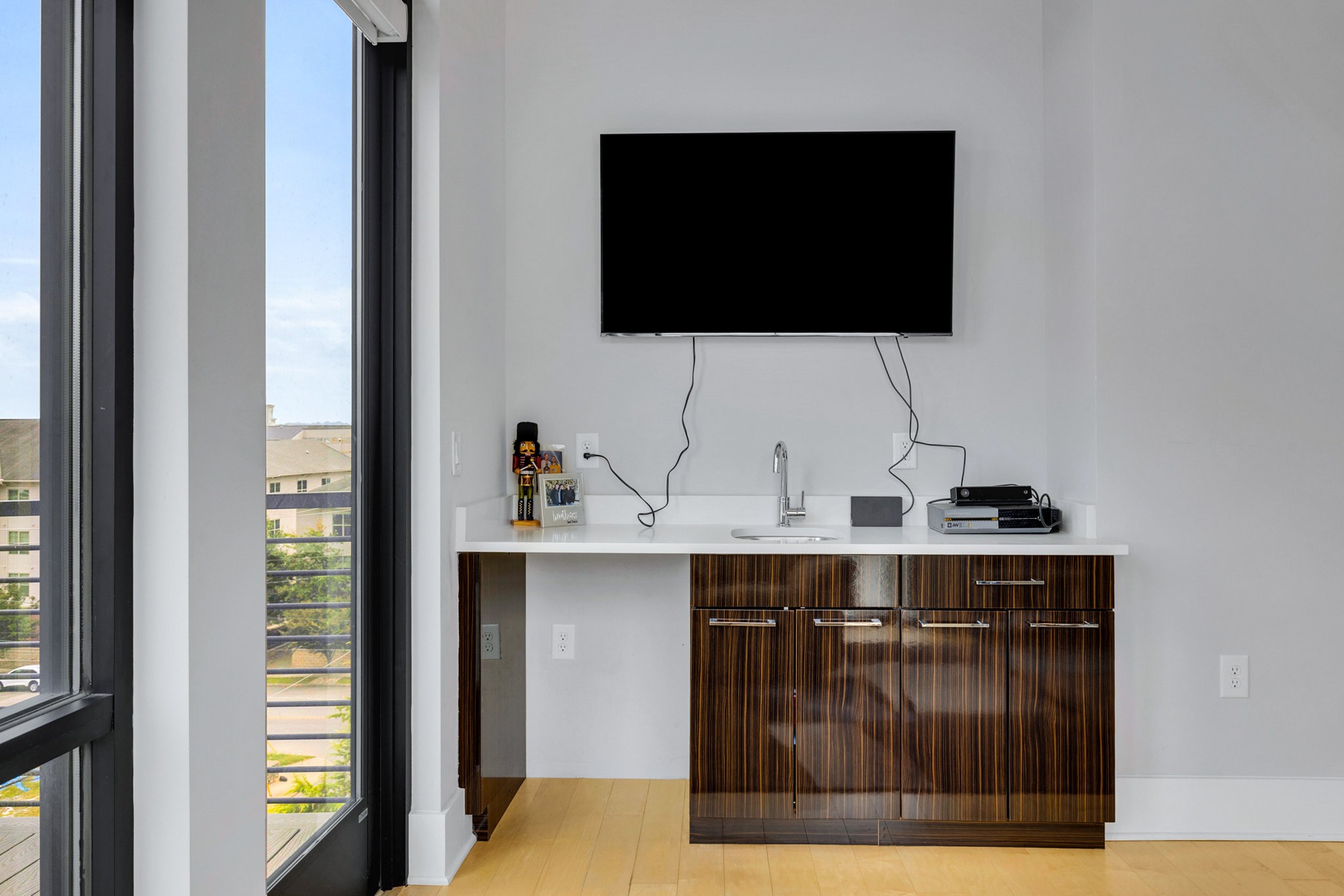 Upstairs, the fourth-floor bonus room with wet bar opens to a private balcony — perfect for entertaining or unwinding at sunset. A second balcony extends from the main living space, and both feature Trex decking for durability. Additional highlights include gorgeous hardwood floors throughout, a spacious two-car garage, tankless water heater, and a low-maintenance lifestyle with HOA-managed landscaping.