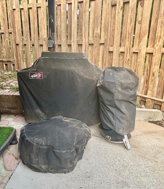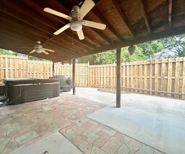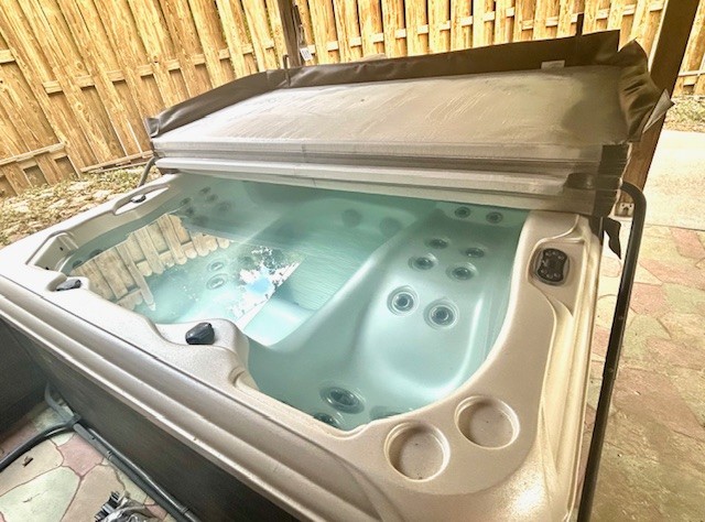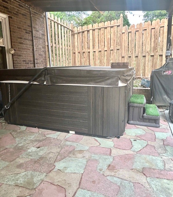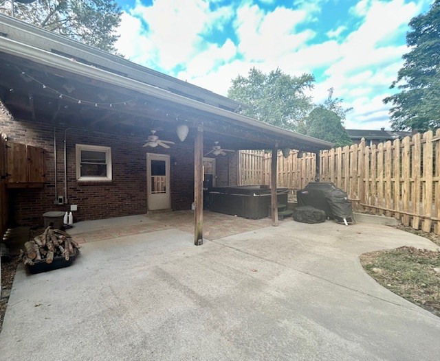 Covered rear porch has been transformed into a private oasis with shadow box privacy fence, hot tub, grill with dedicated gas line, smoker, fire pit and ceiling fan. Shed, Washer, Dryer, Hot Tub, gas grill and Weber smokey mountain smoker convey.