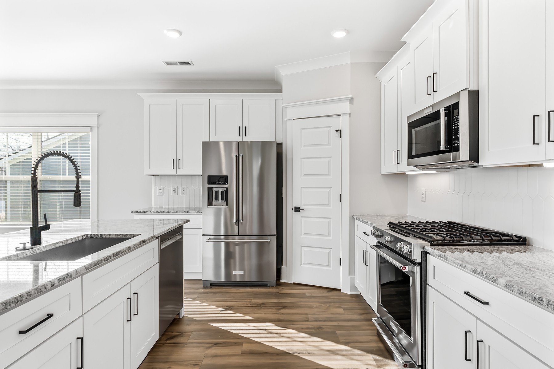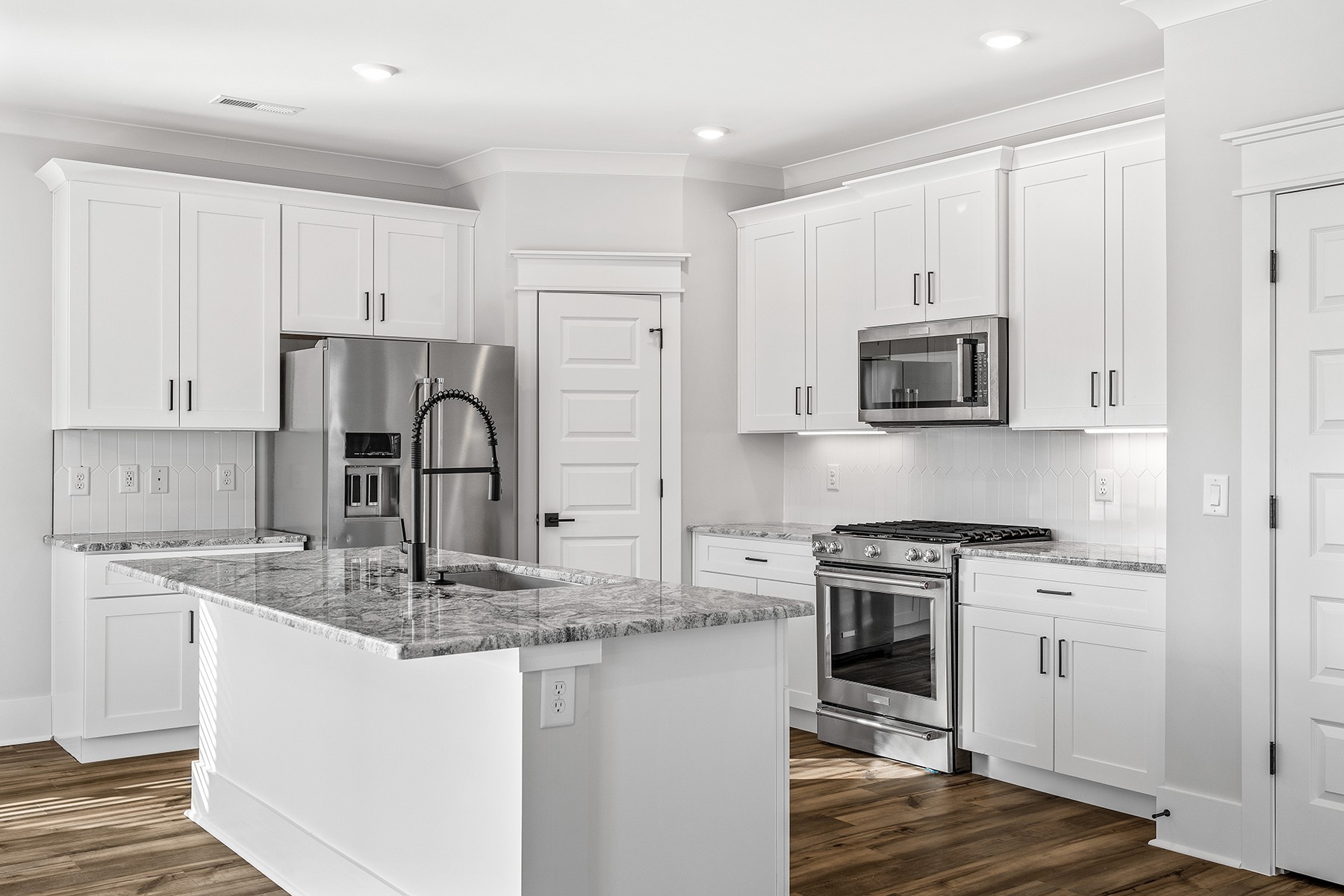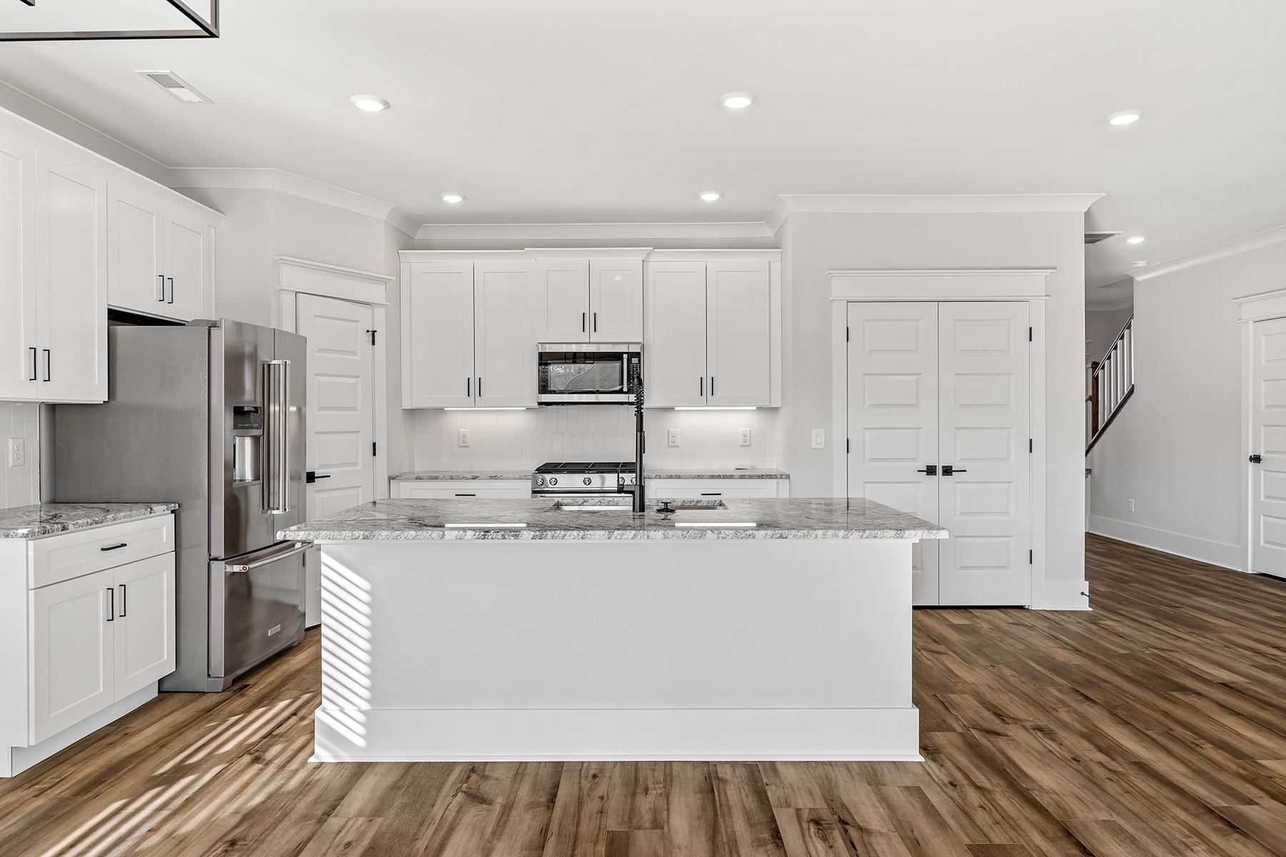 This thoughtfully designed home features an open-concept layout with vaulted ceilings, crown molding, and LVP flooring throughout the first floor—including the spacious primary suite. The chef’s kitchen shines with KitchenAid appliances, matte black finishes, soft-close cabinets, and a large island. Enjoy spa-like bathrooms with double vanities and a tile-lined shower in the primary. Relax or entertain on the oversized patio with fan and tray ceiling, plus extra green space. Community perks include walking trails and a peaceful pond with fountain. Oversized 8' garage door and frosted glass front door add standout curb appeal!