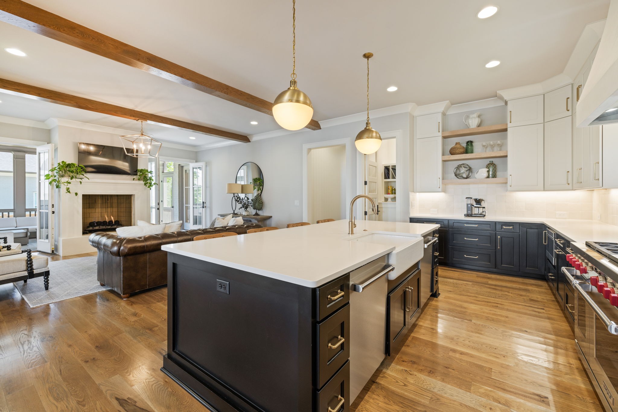 Inside, an open-concept floor plan invites effortless living and entertaining. The gourmet kitchen is a chef’s dream with a Wolf gas range, plaster hood, custom built-in refrigerator/freezer, two dishwashers, and an abundance of natural light. Wood-beamed ceilings crown the spacious living room, where a stunning Arcustone fireplace becomes the heart of the home.