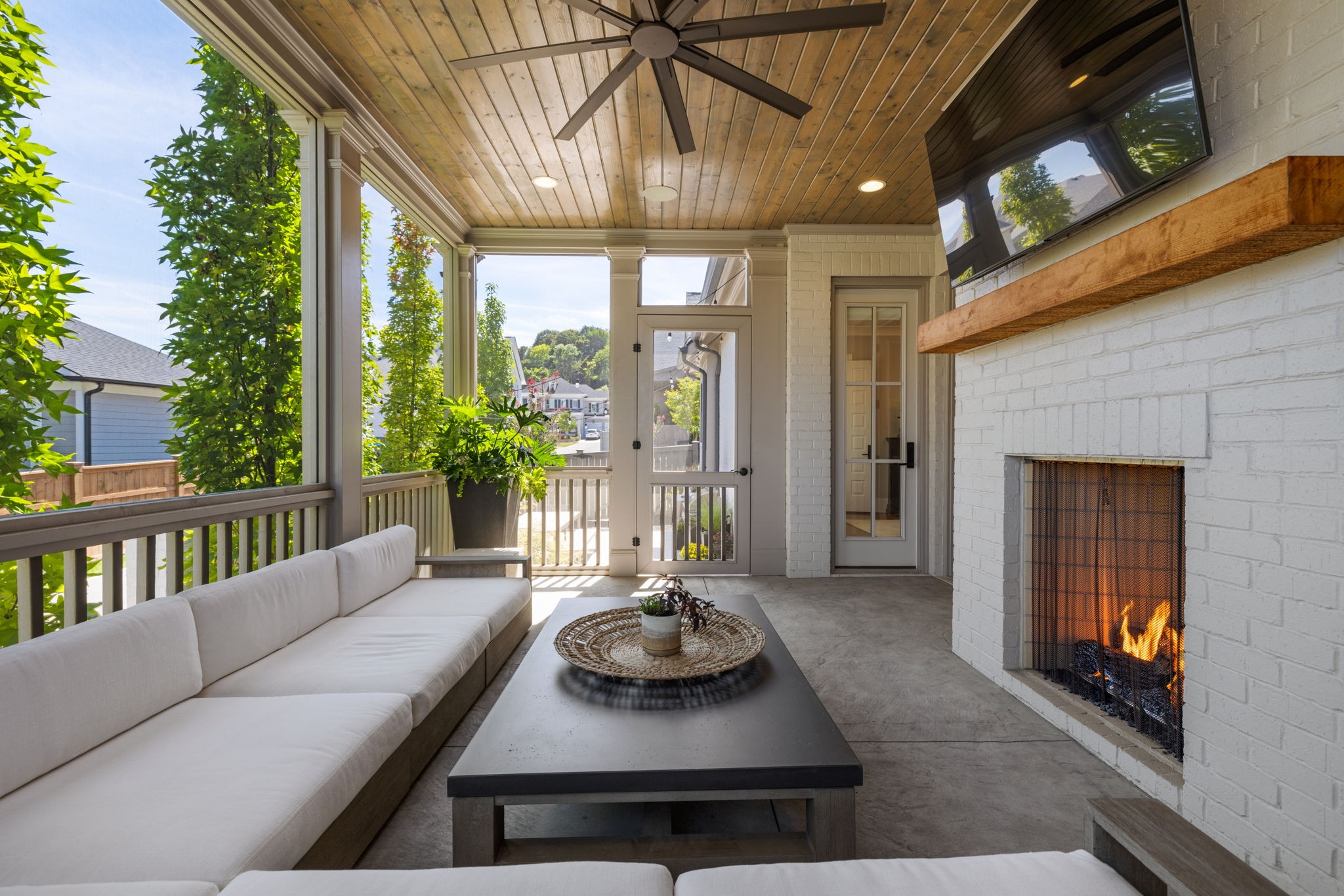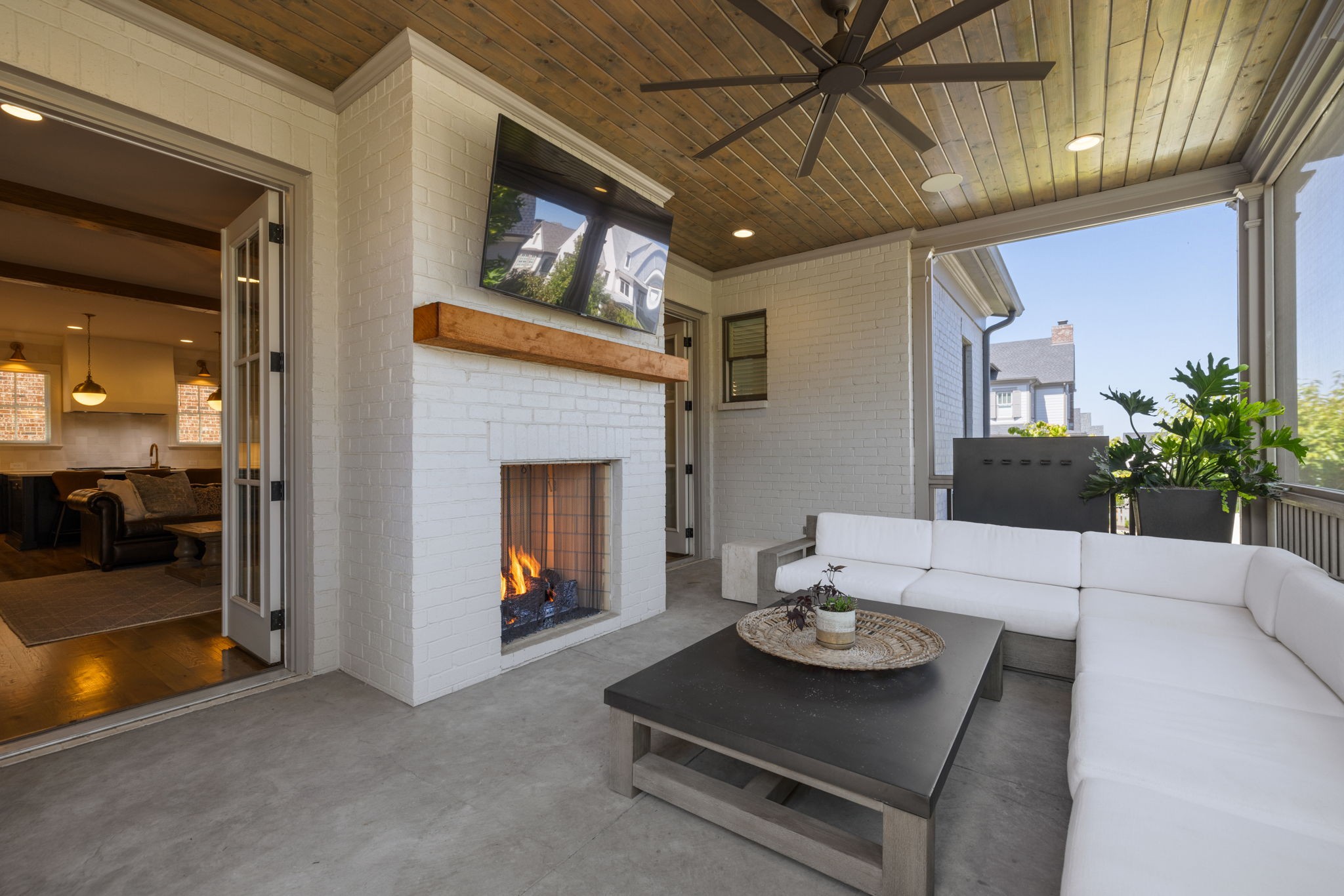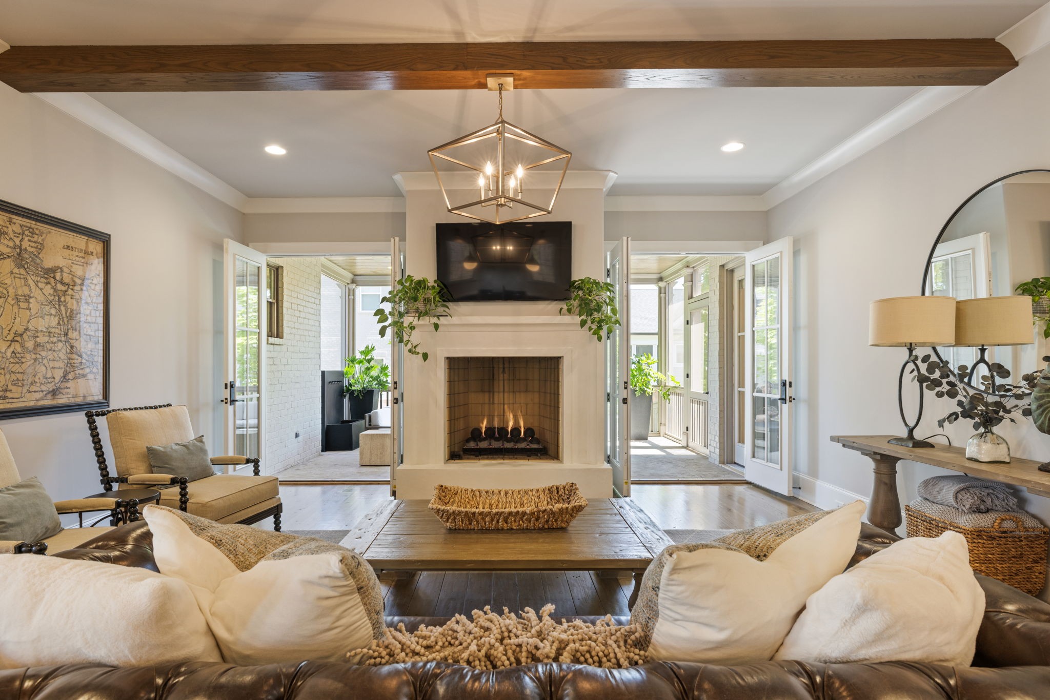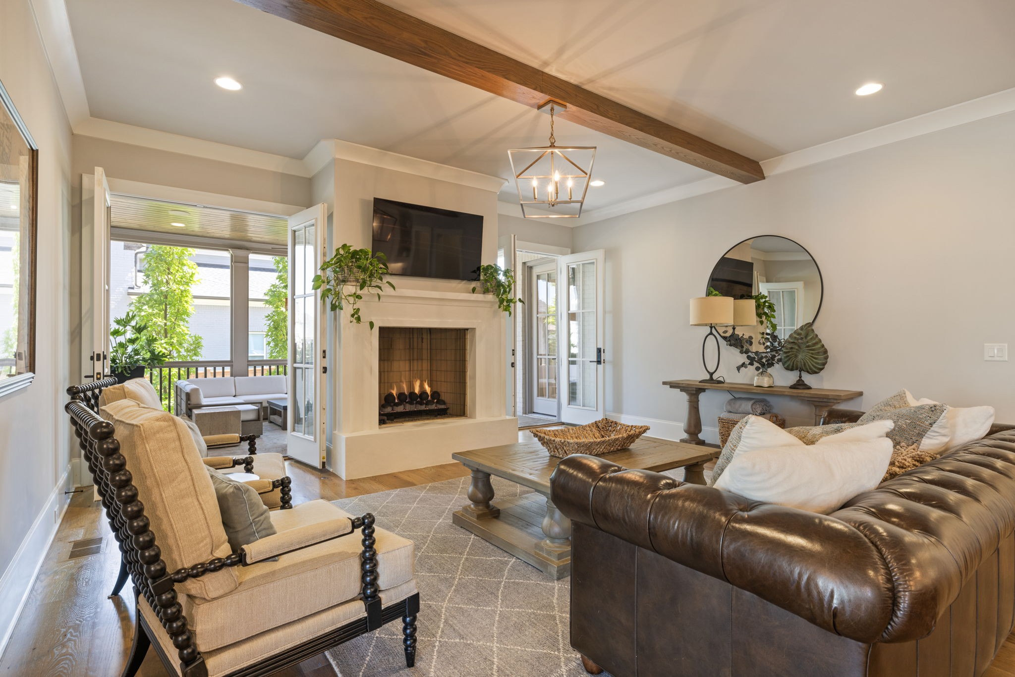 Indoor living flows seamlessly to the outdoors through double French doors, opening to a covered and screened porch with its own gas fireplace perfect for year-round gatherings.