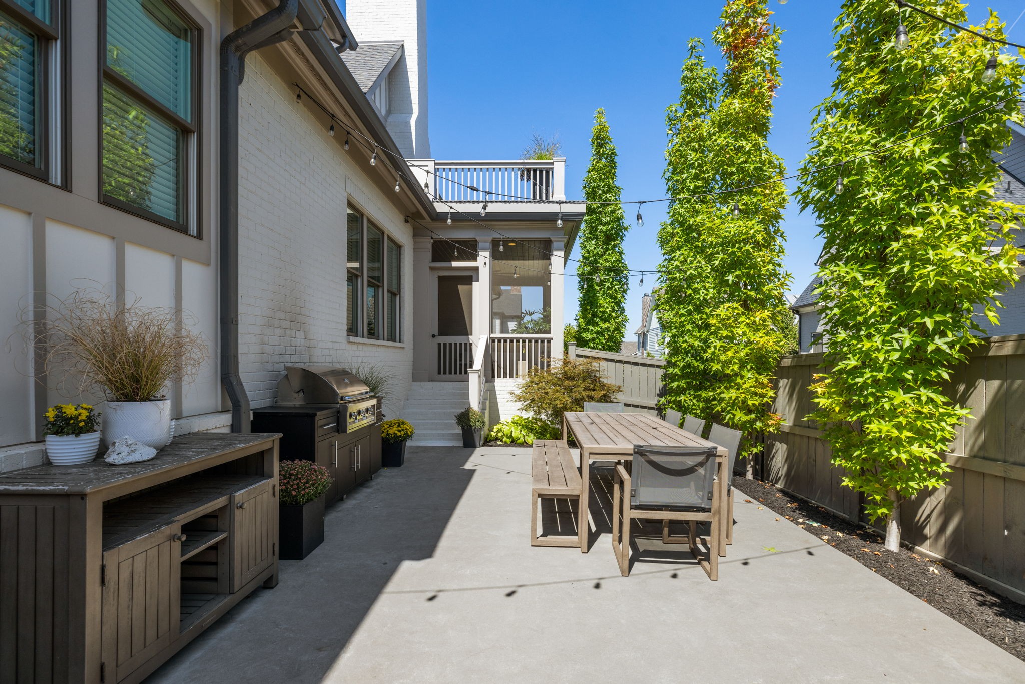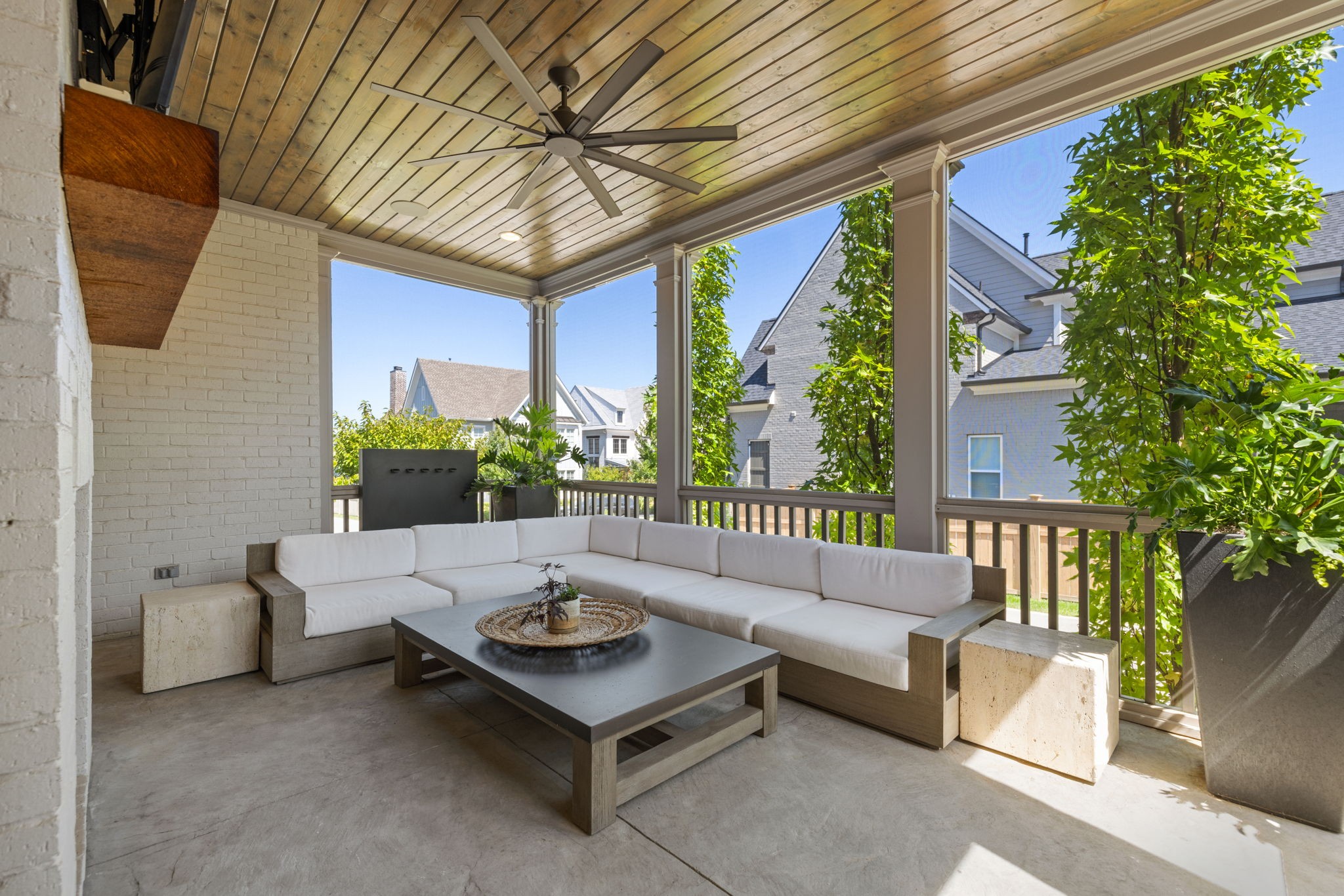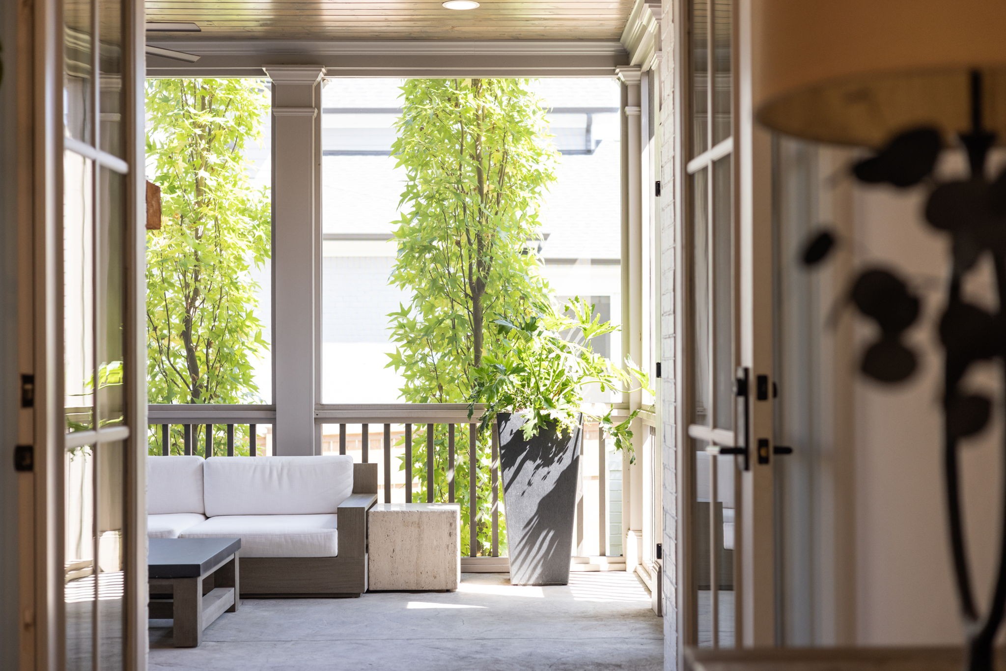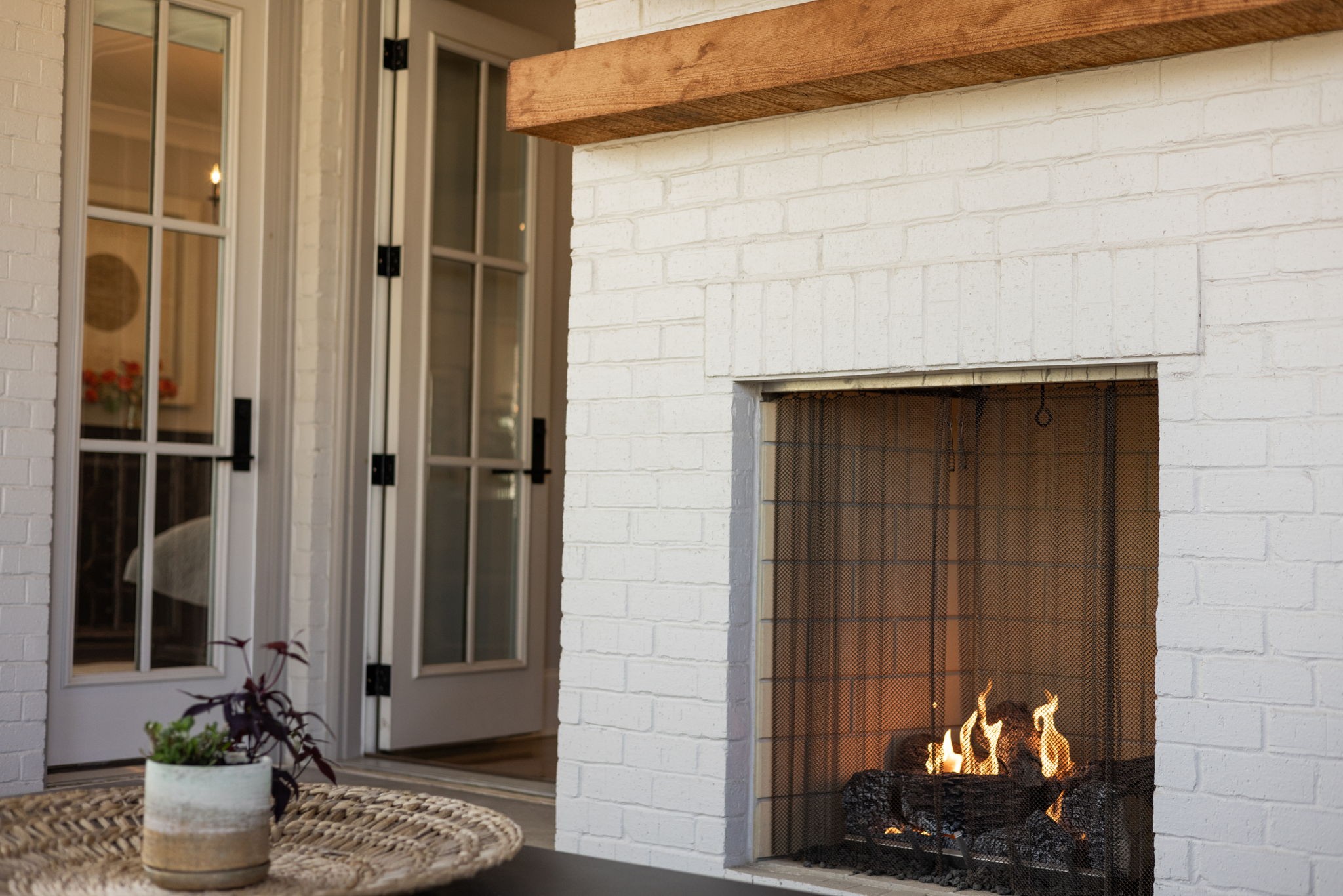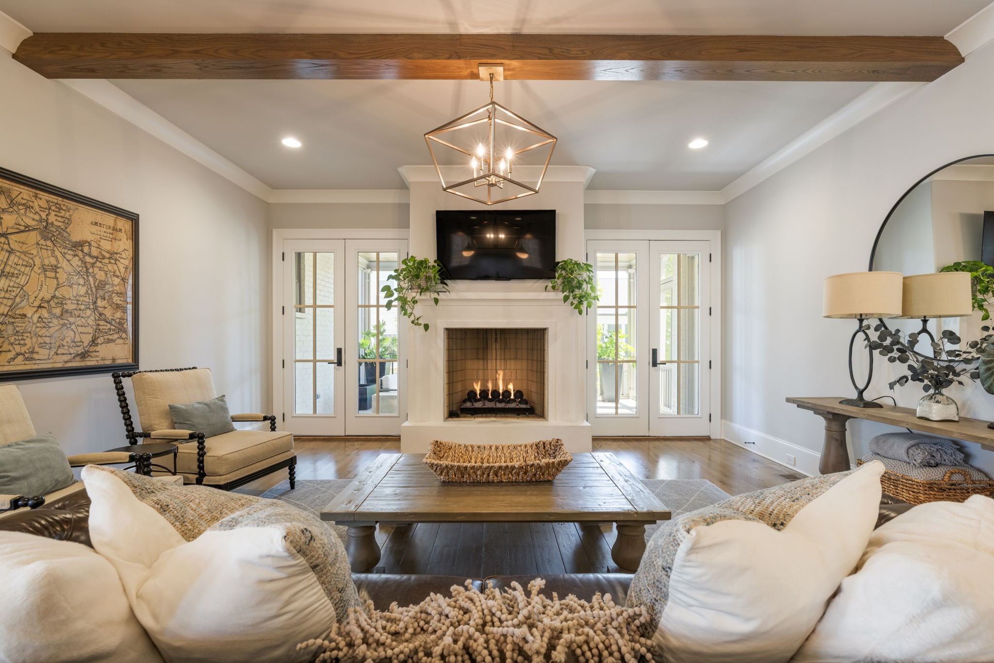 Indoor living flows seamlessly to the outdoors through double French doors, opening to a covered and screened porch with its own gas fireplace perfect for year-round gatherings.