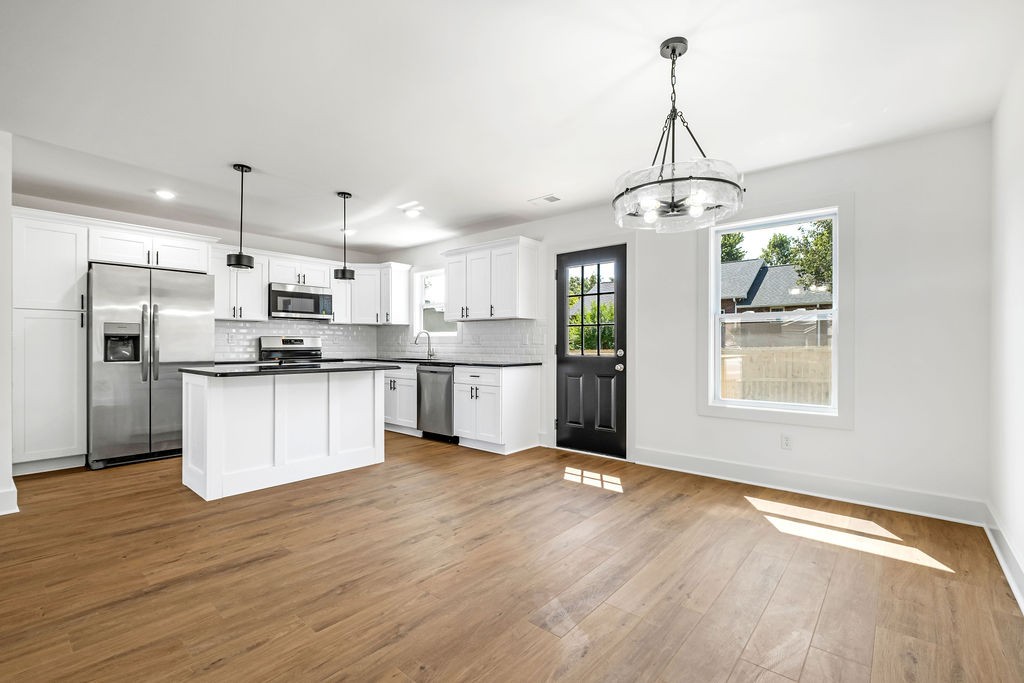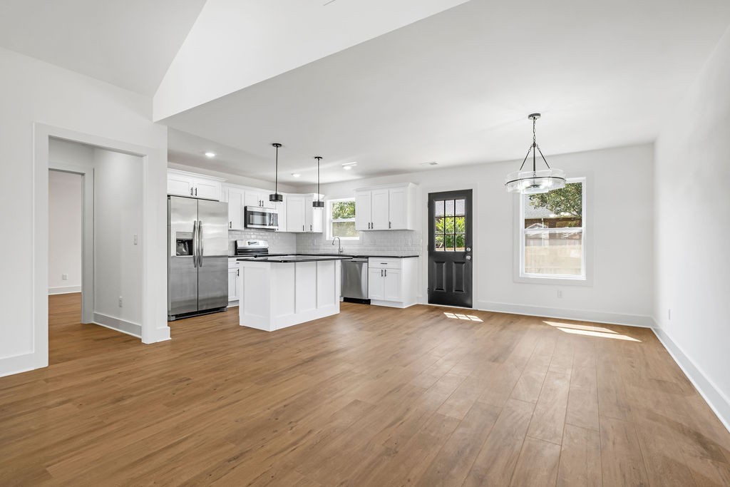 Inside, you’ll fall in love with the open-concept layout featuring soaring ceilings that flood the space with natural light. The kitchen is a showstopper with granite countertops, custom soft-close cabinetry, and a full suite of Samsung energy-efficient stainless steel appliances – all perfectly designed for style and function. Luxury vinyl plank flooring flows throughout the home, bringing both elegance and durability.