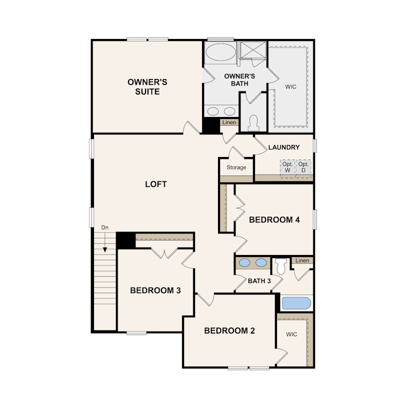 A standout feature of this plan is the main-floor guest suite with a private bath and walk-in closet—ideal for visitors or multigenerational living. Upstairs, a large loft provides space to play, work, or unwind. The owner’s suite is a relaxing escape with its built-in bathtub and walk-in closet, while two additional bedrooms are thoughtfully arranged near a shared bath with dual sinks. A centrally located laundry room adds everyday convenience.