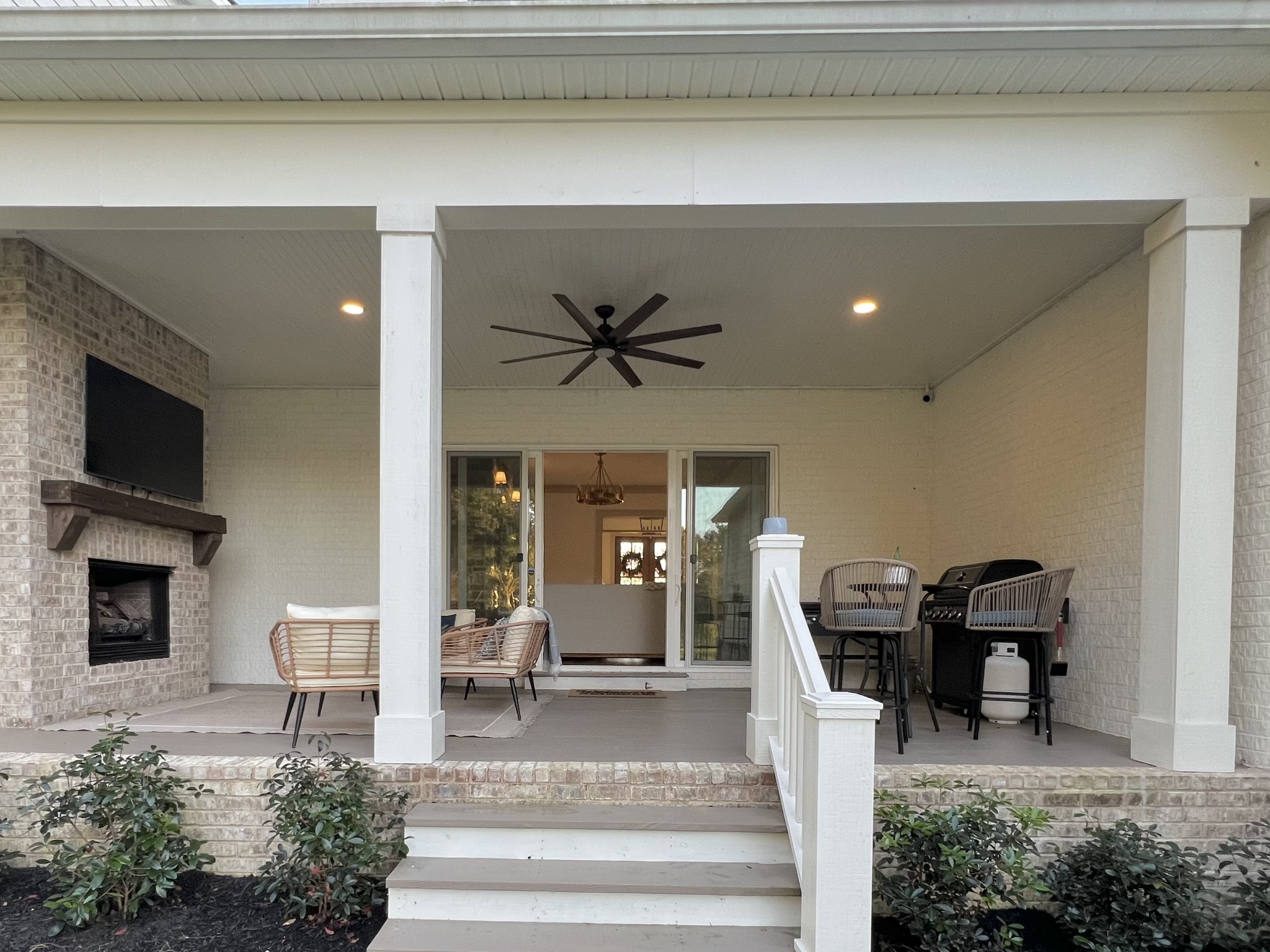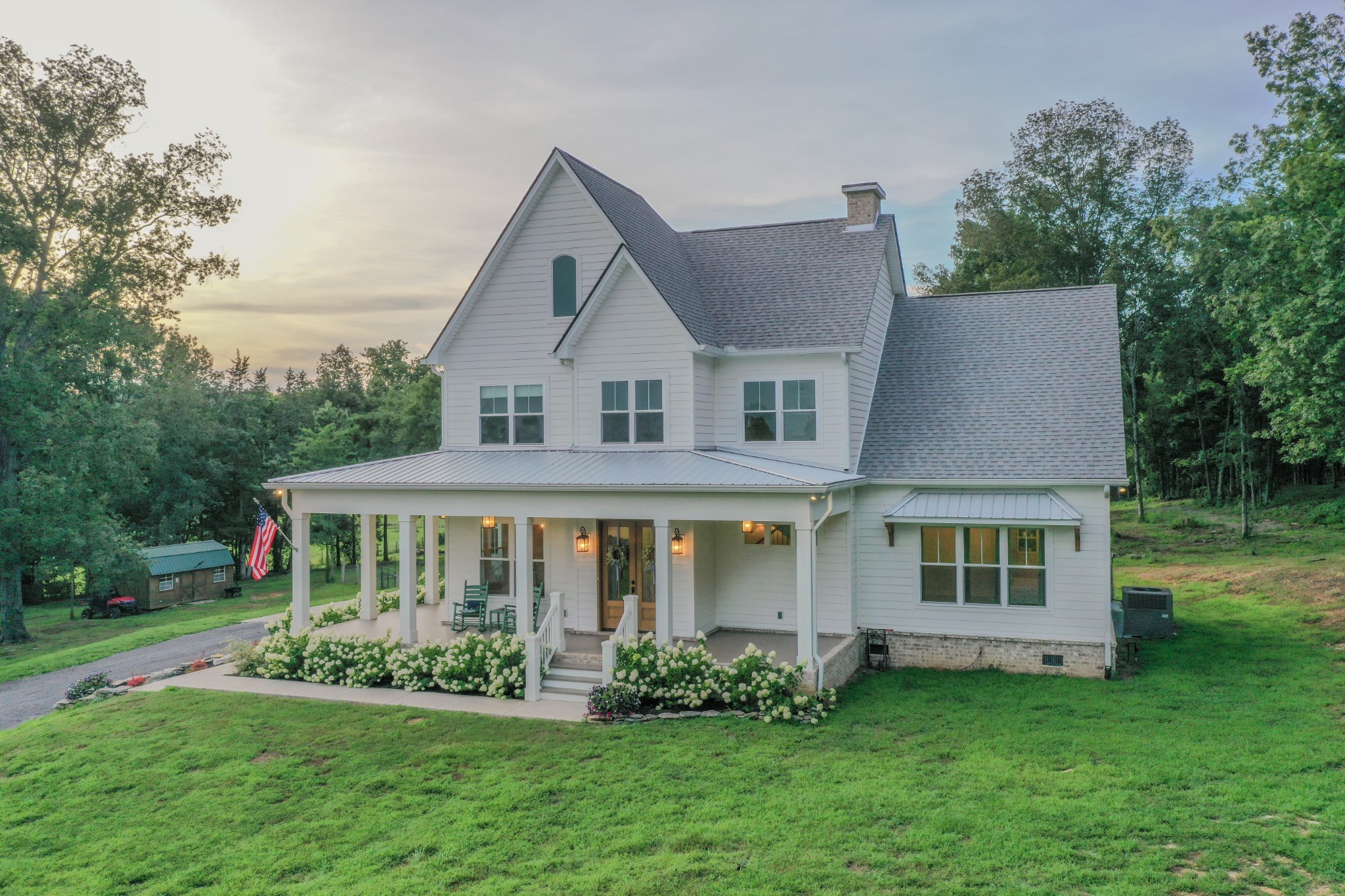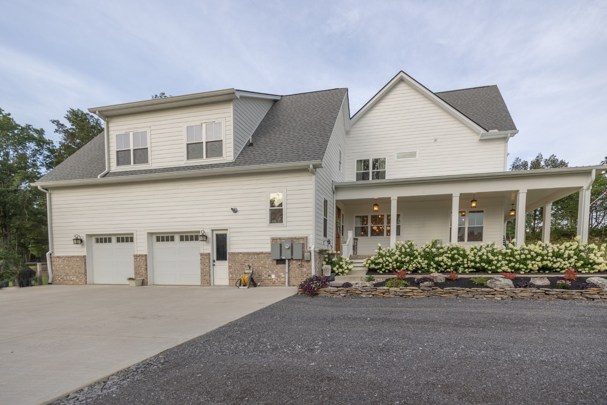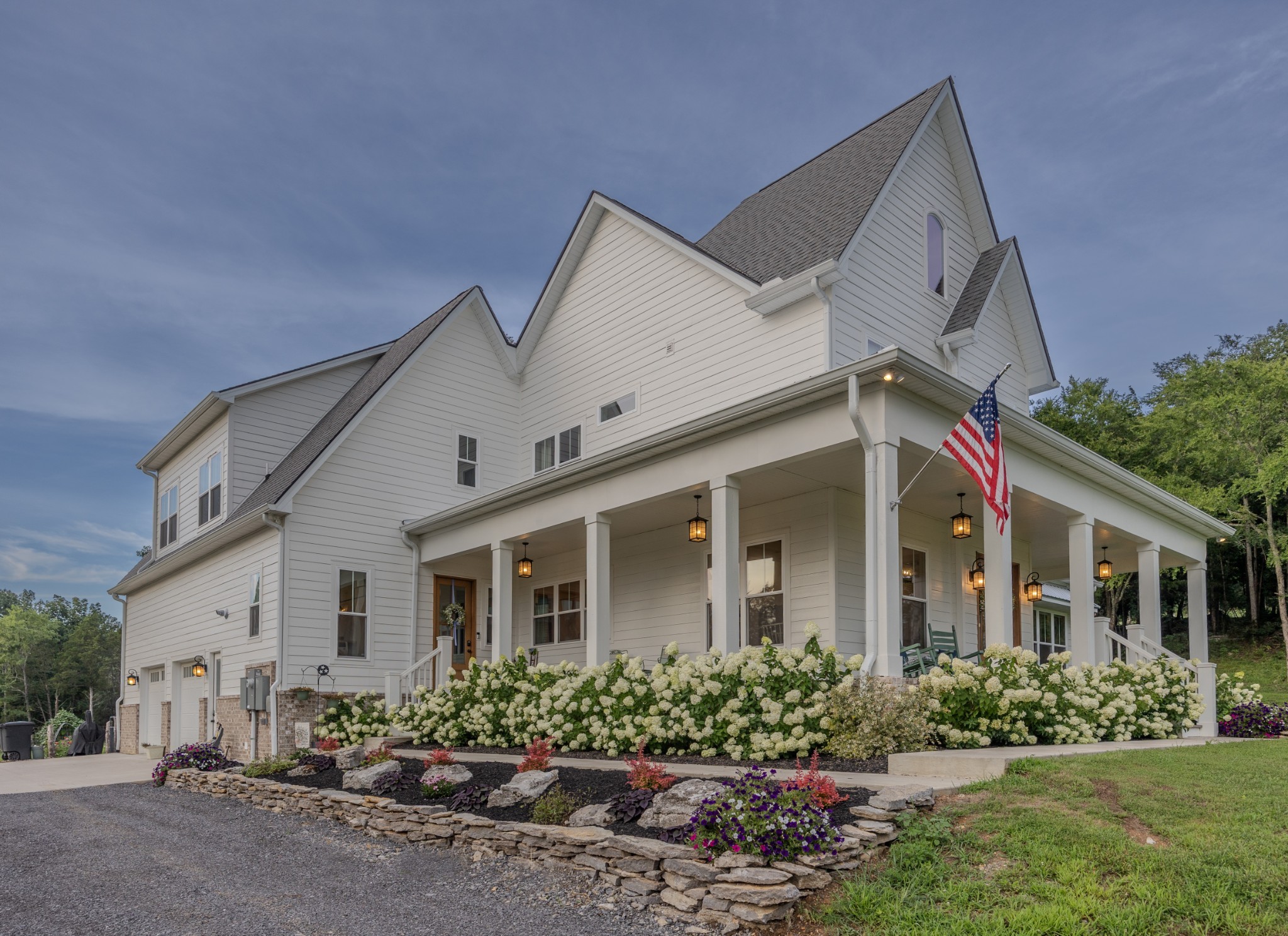 A wide, wrap-around porch welcomes you with Southern charm—perfect for rocking chairs, morning coffee, and evening conversations. Meticulously landscaped with flowering shrubs and warm exterior lighting, the home's curb appeal is second to none.