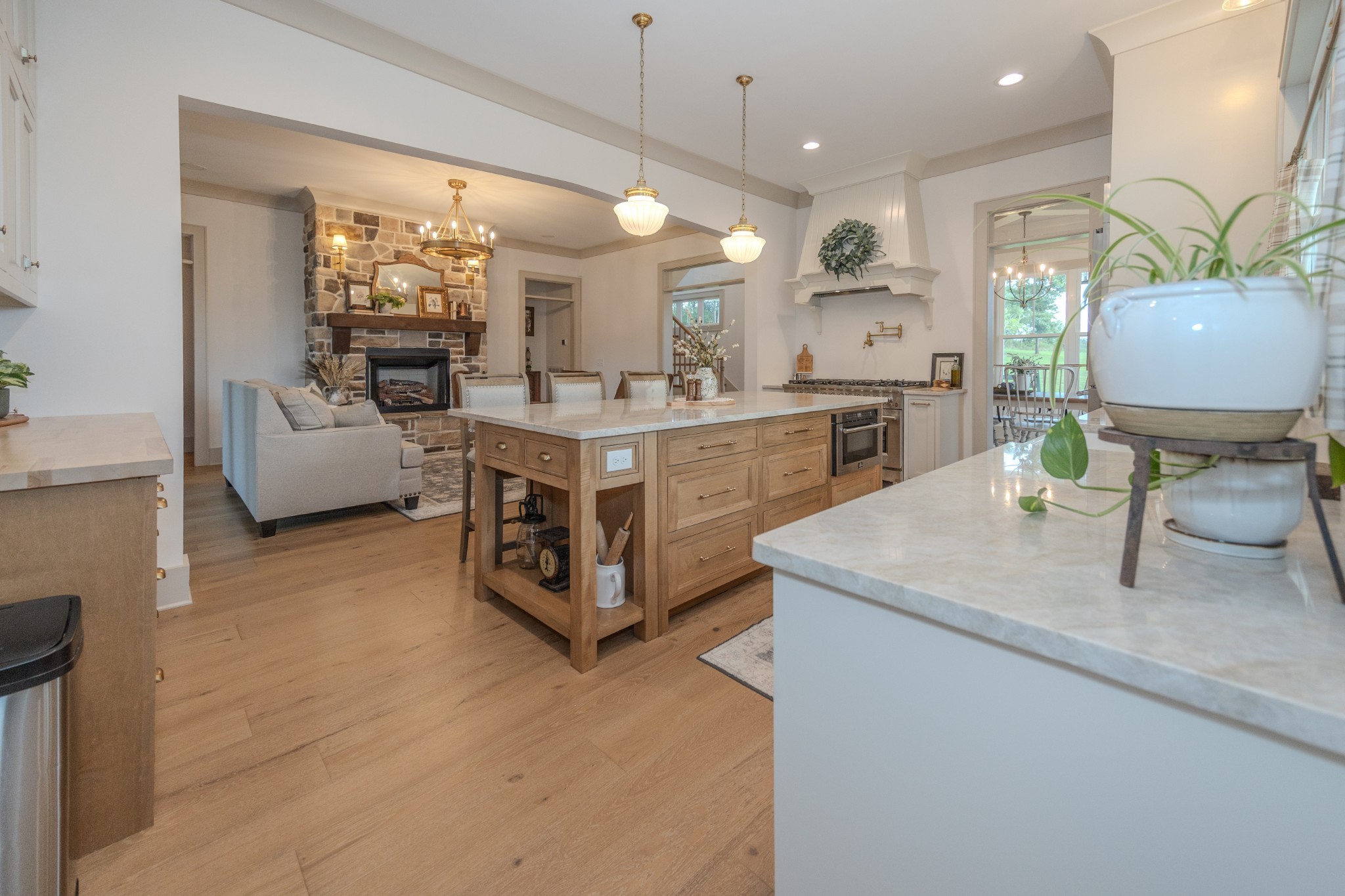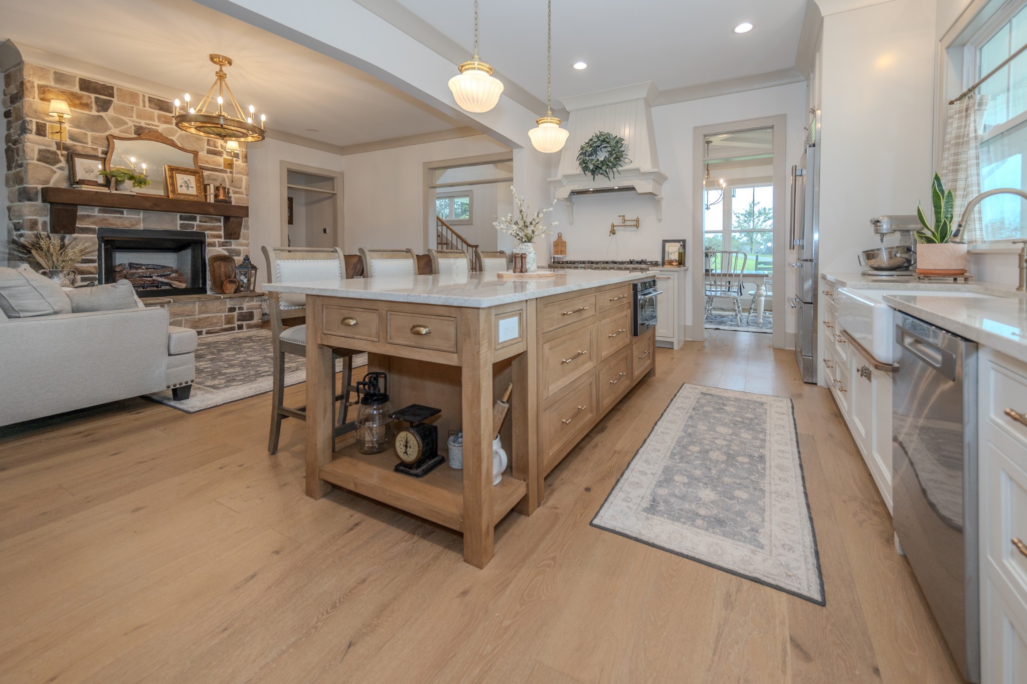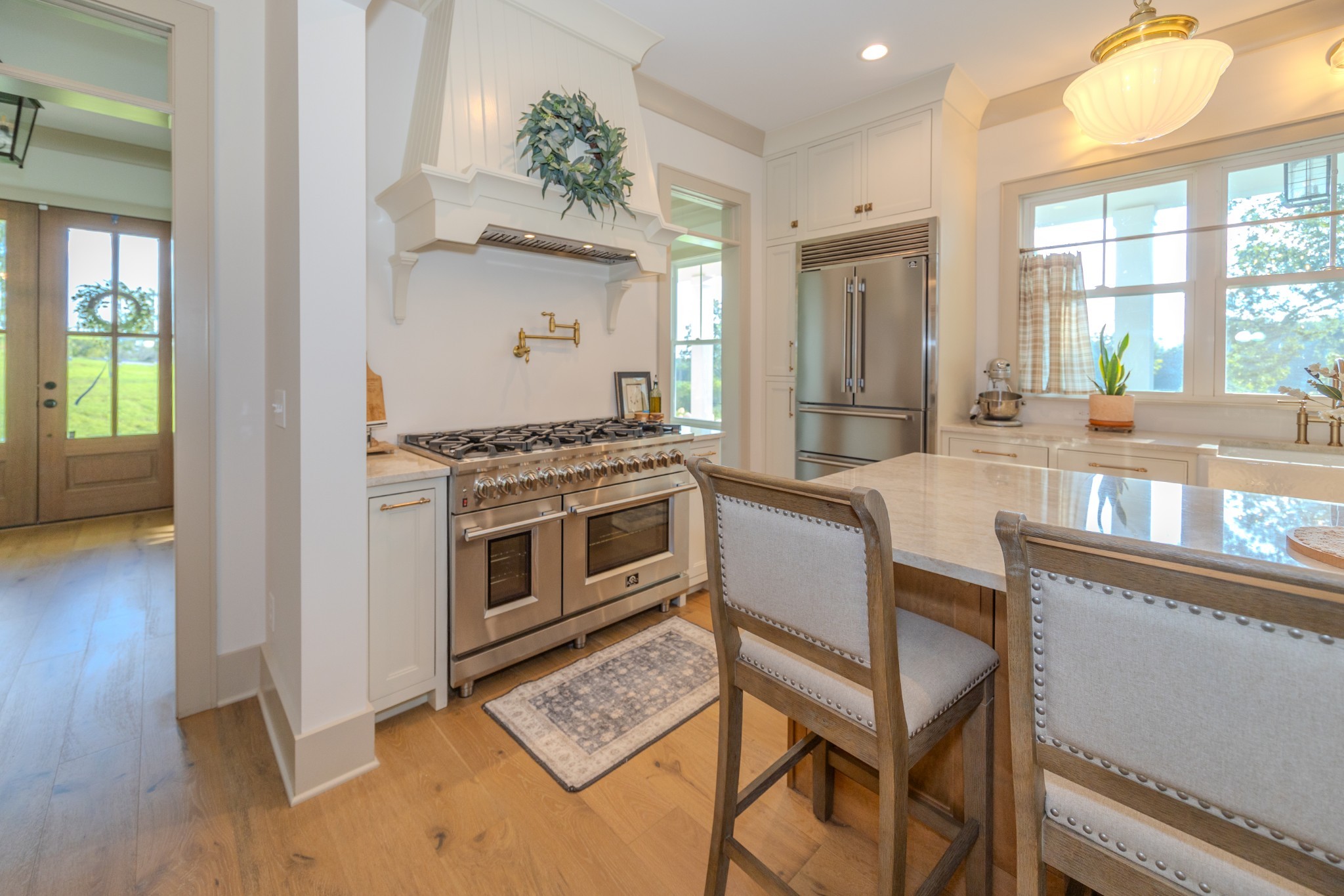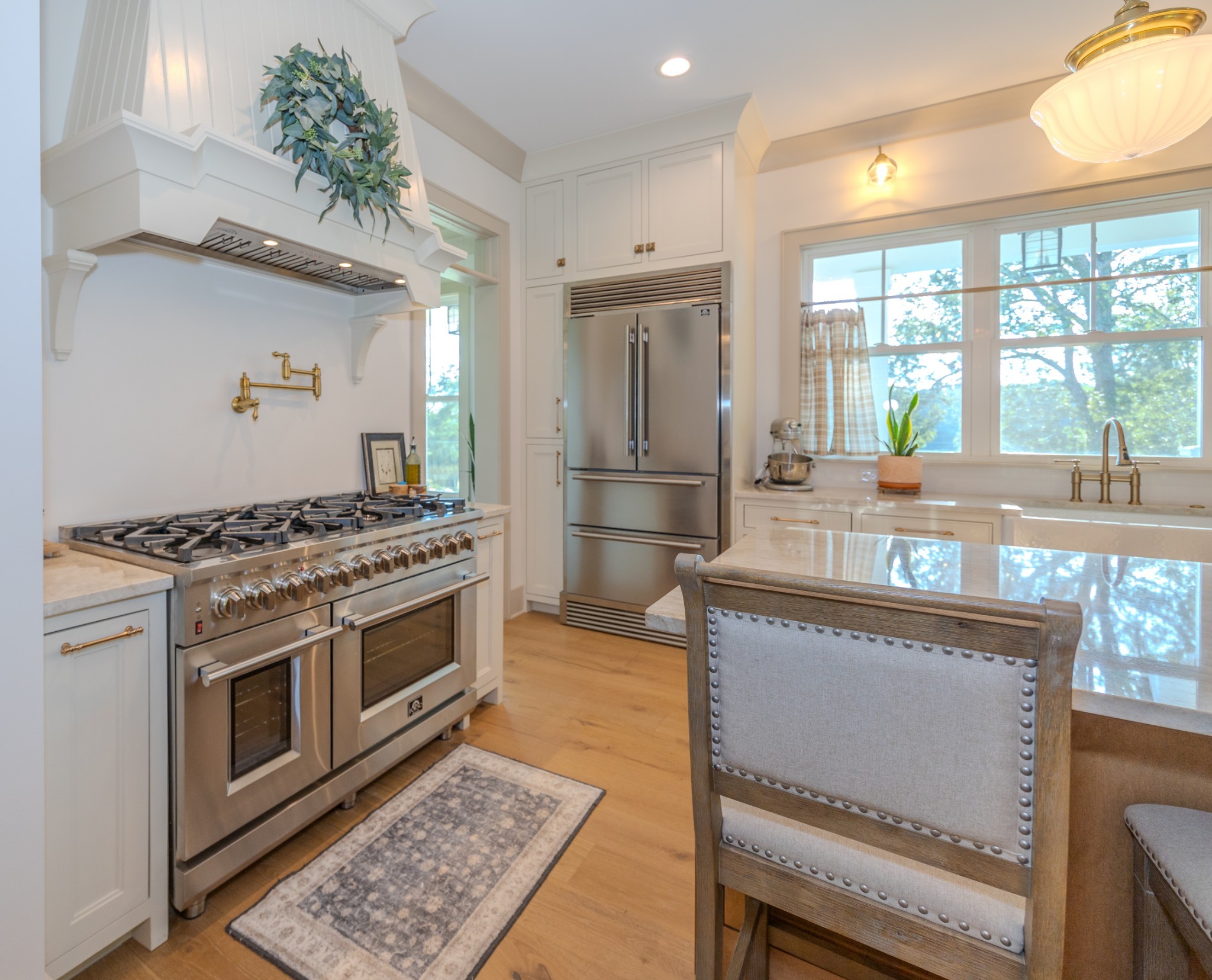 Step inside to a bright, open interior filled with natural light, 10-foot ceilings, and 8-foot doors on the main level. Wide 7-inch finished white oak floors add warmth and sophistication throughout the home. The gourmet kitchen features inset custom cabinetry, Taj Mahal quartzite countertops, and a professional-grade 48-inch gas range—designed to impress even the most discerning home chef.