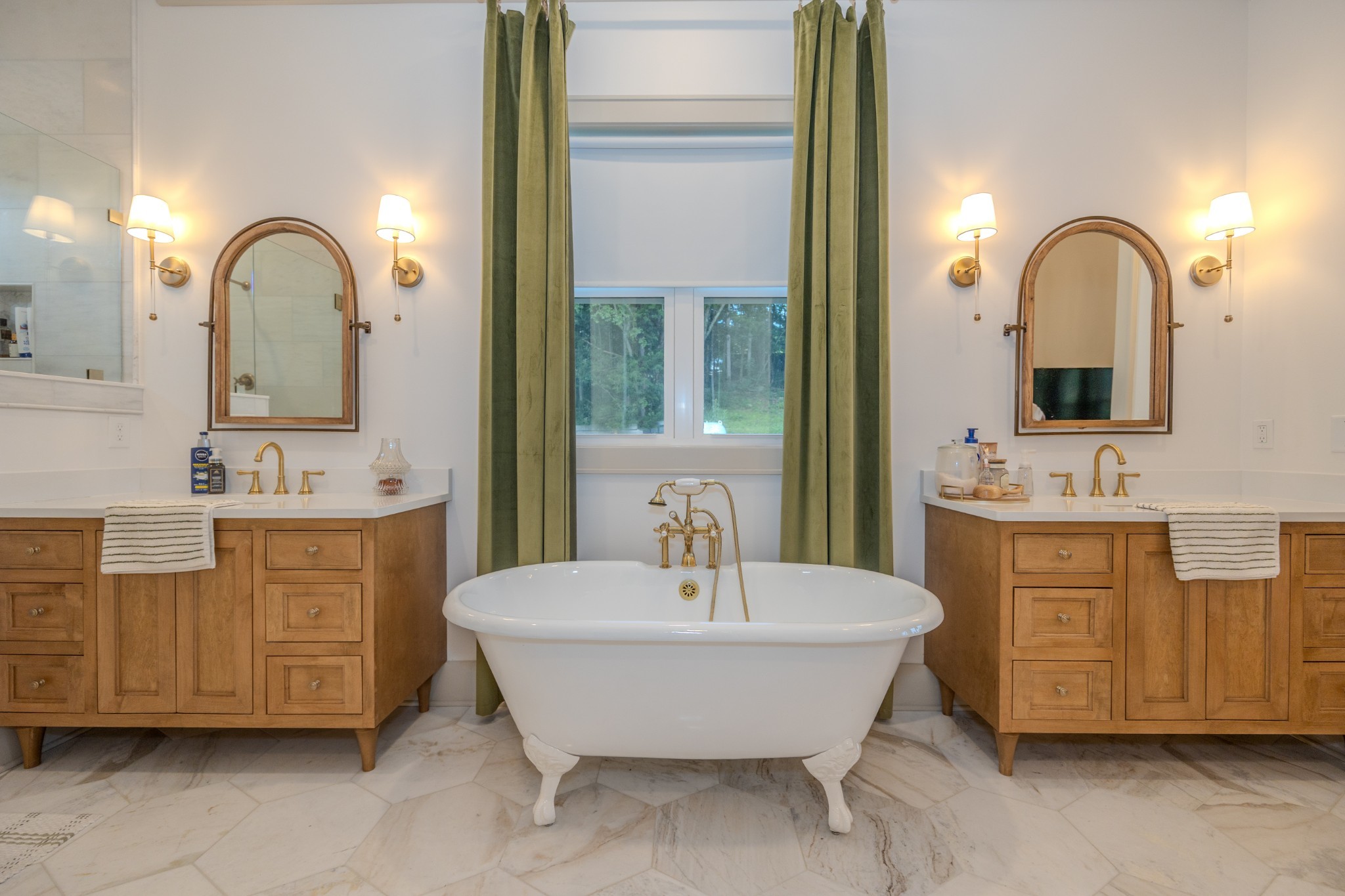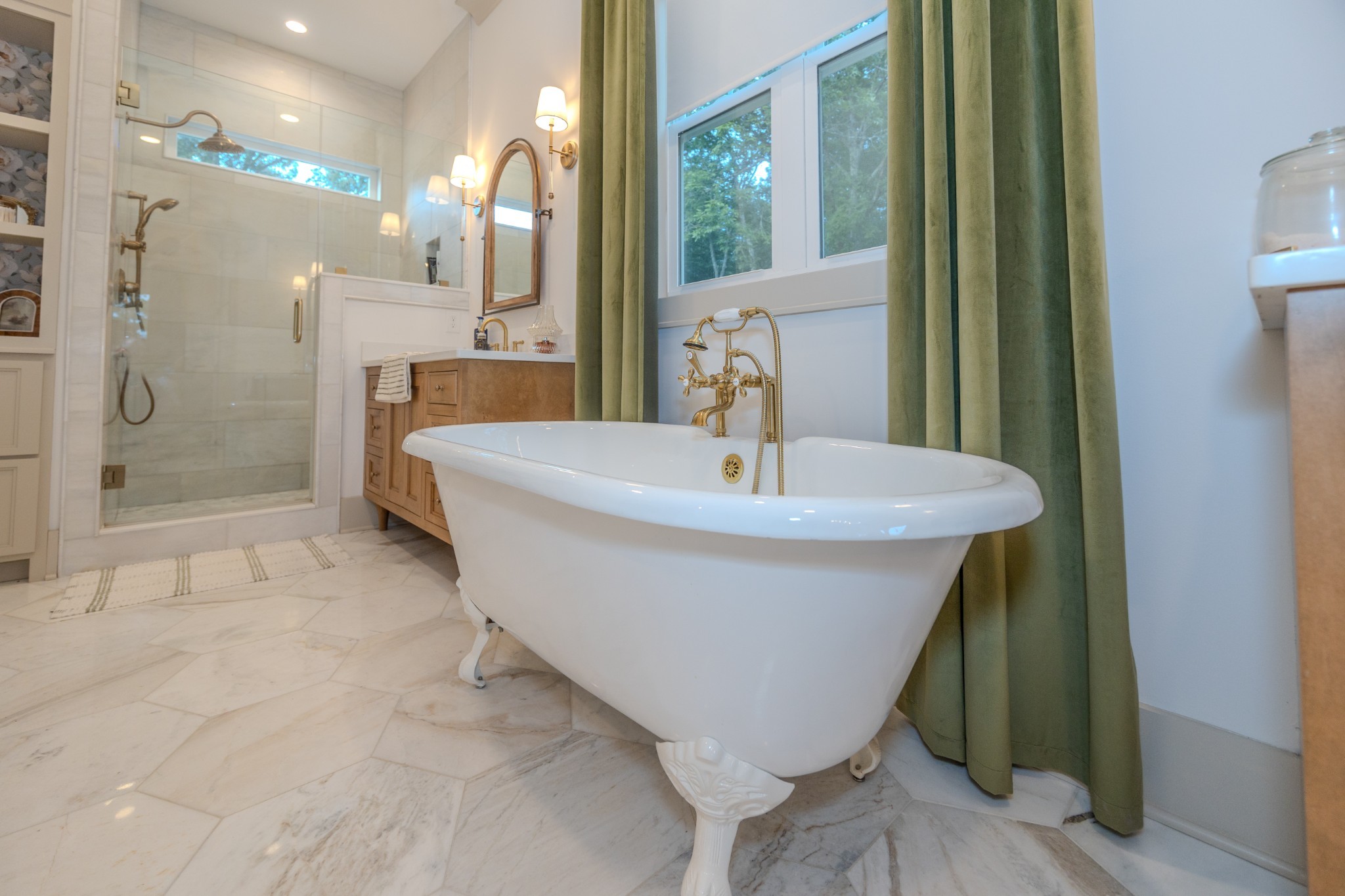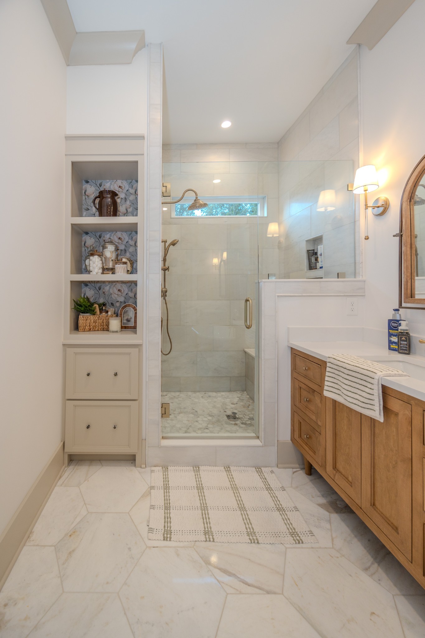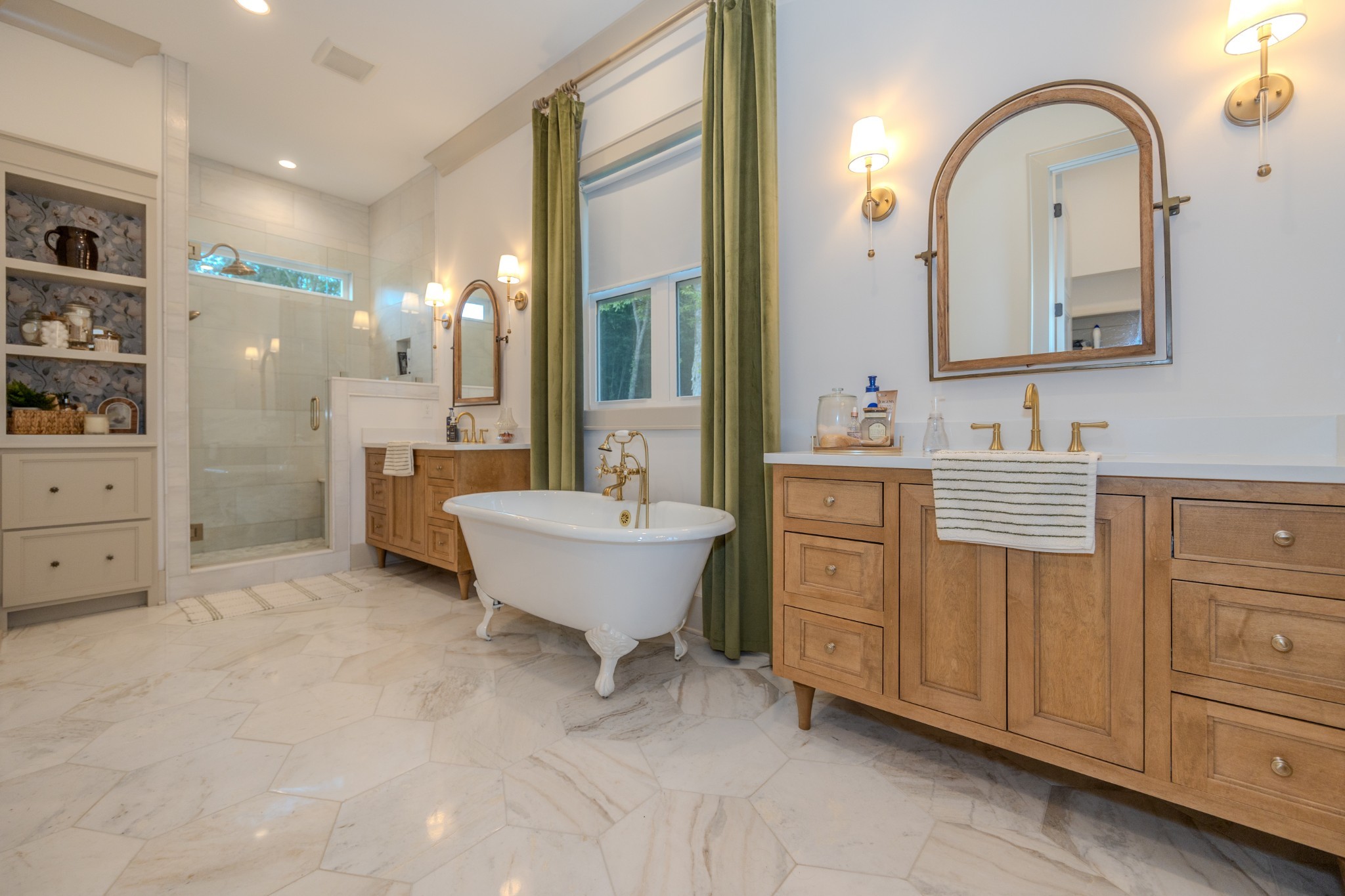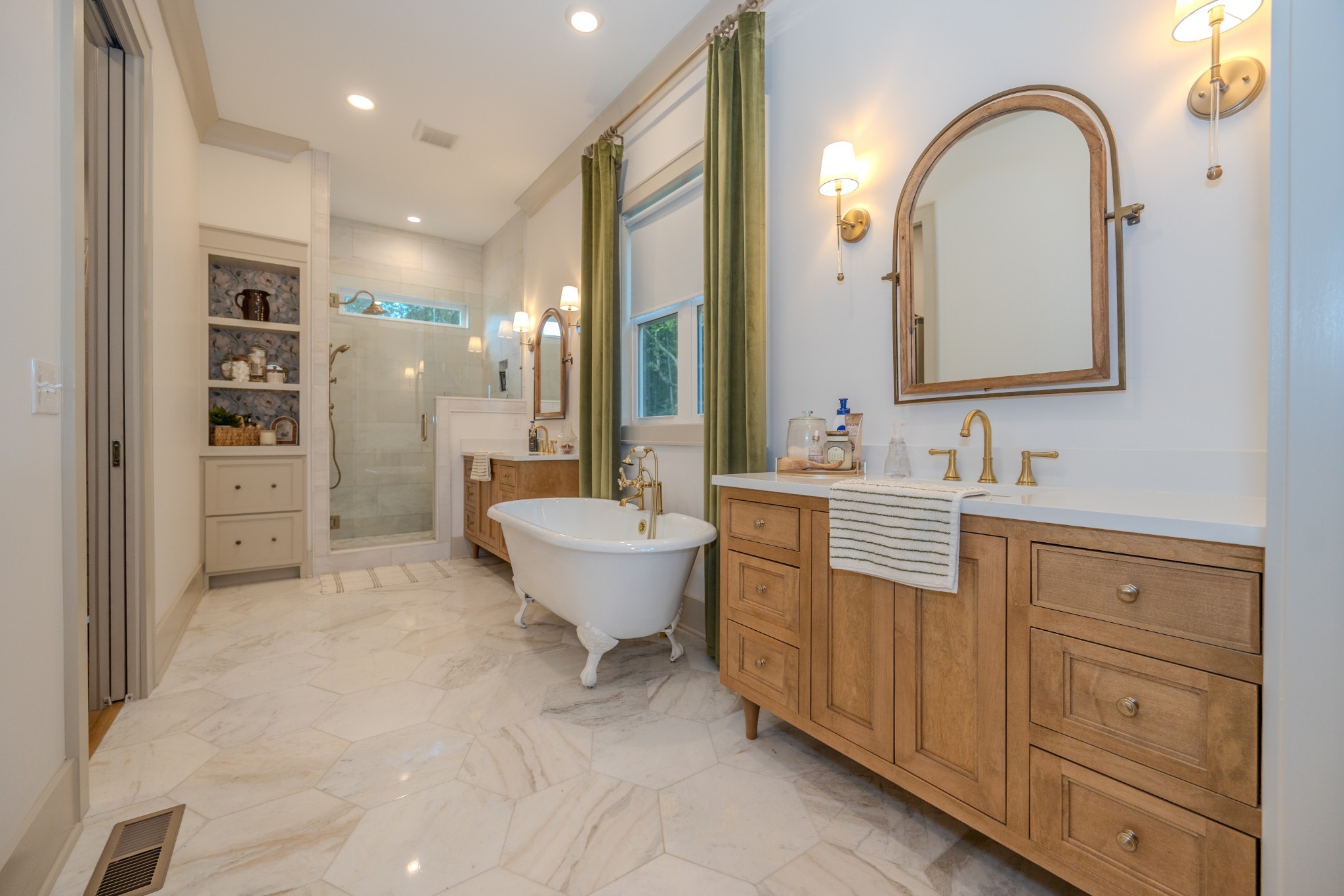 The spacious primary suite offers a private escape with a marble walk-in shower, dual vanities, marble floors, a custom linen cabinet, and convenient access to the walk-in closet from the bathroom.