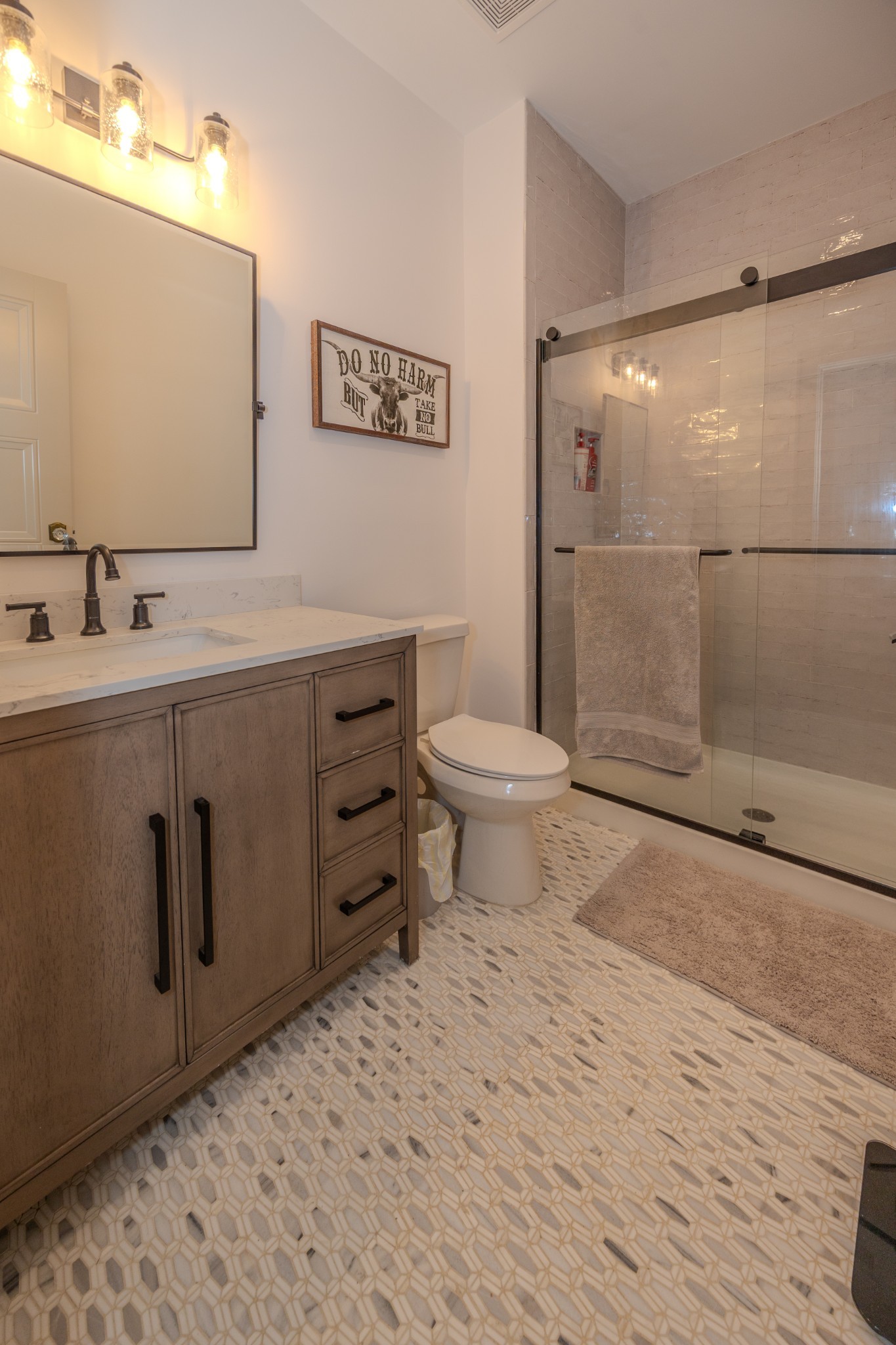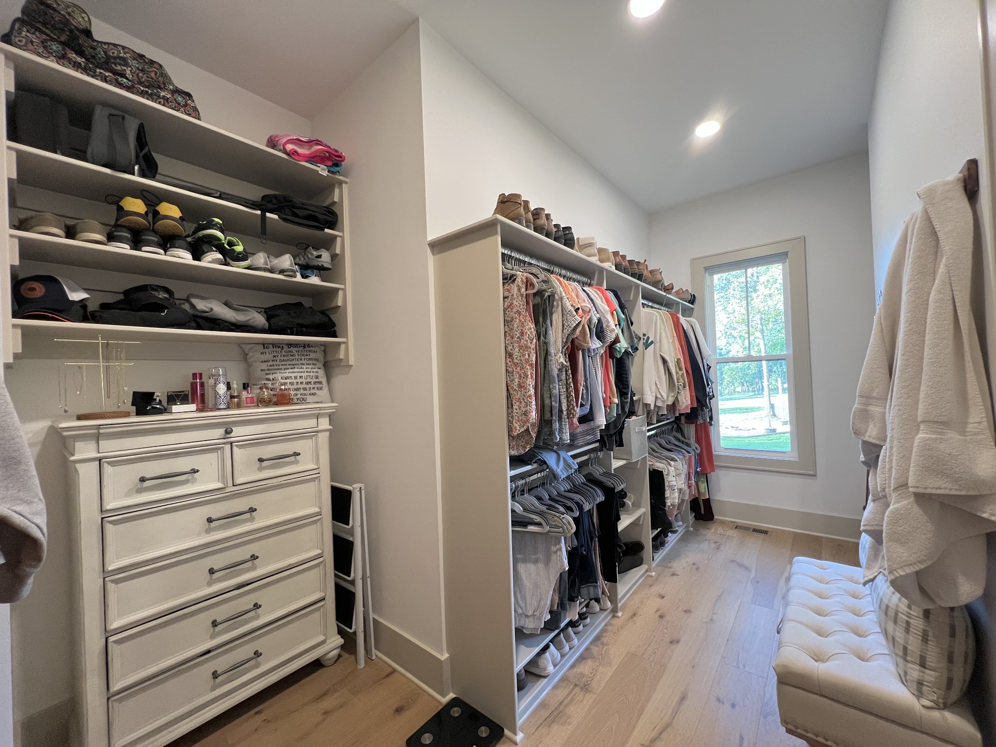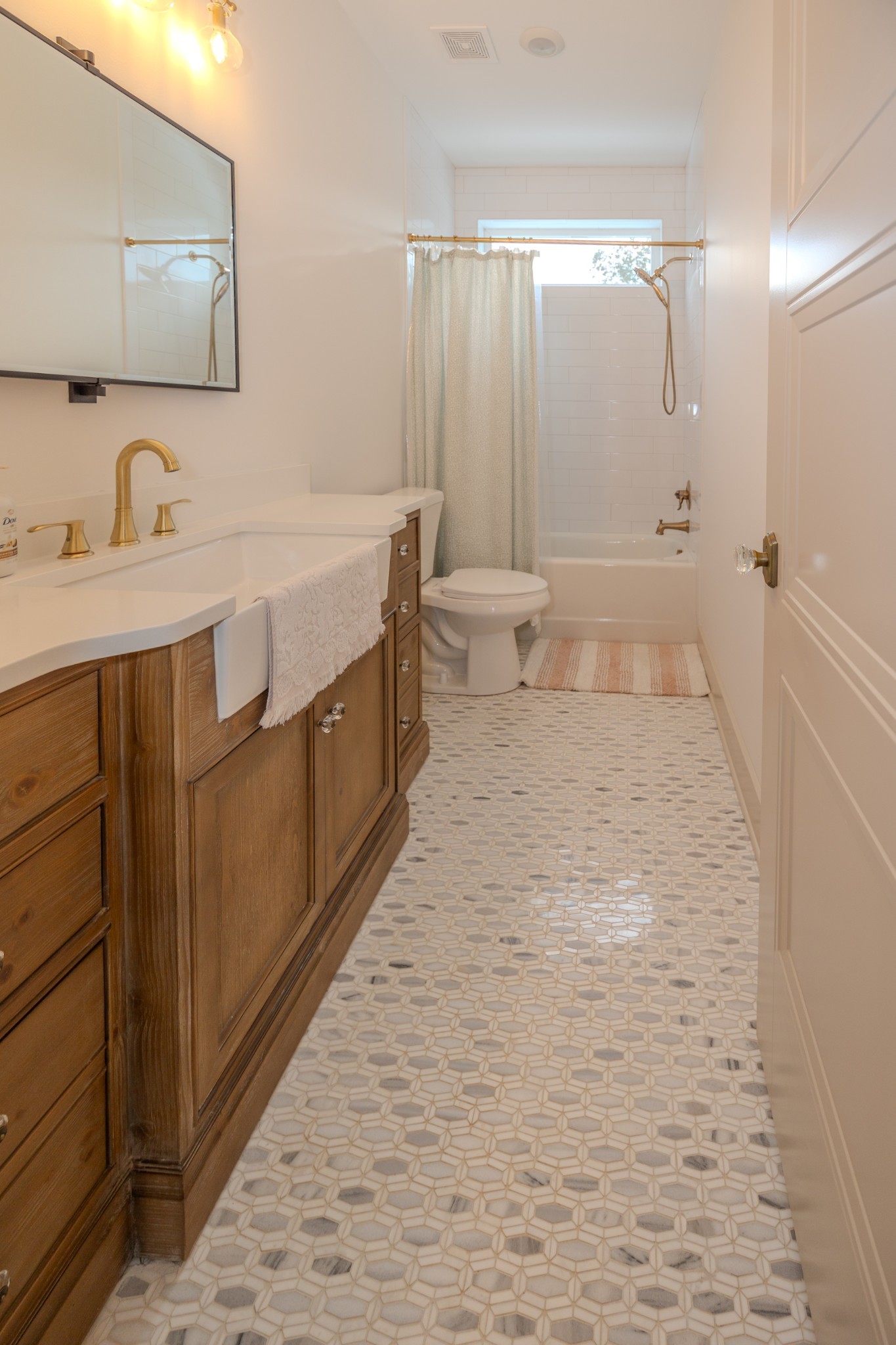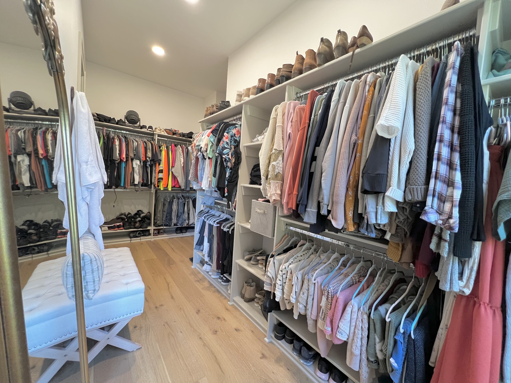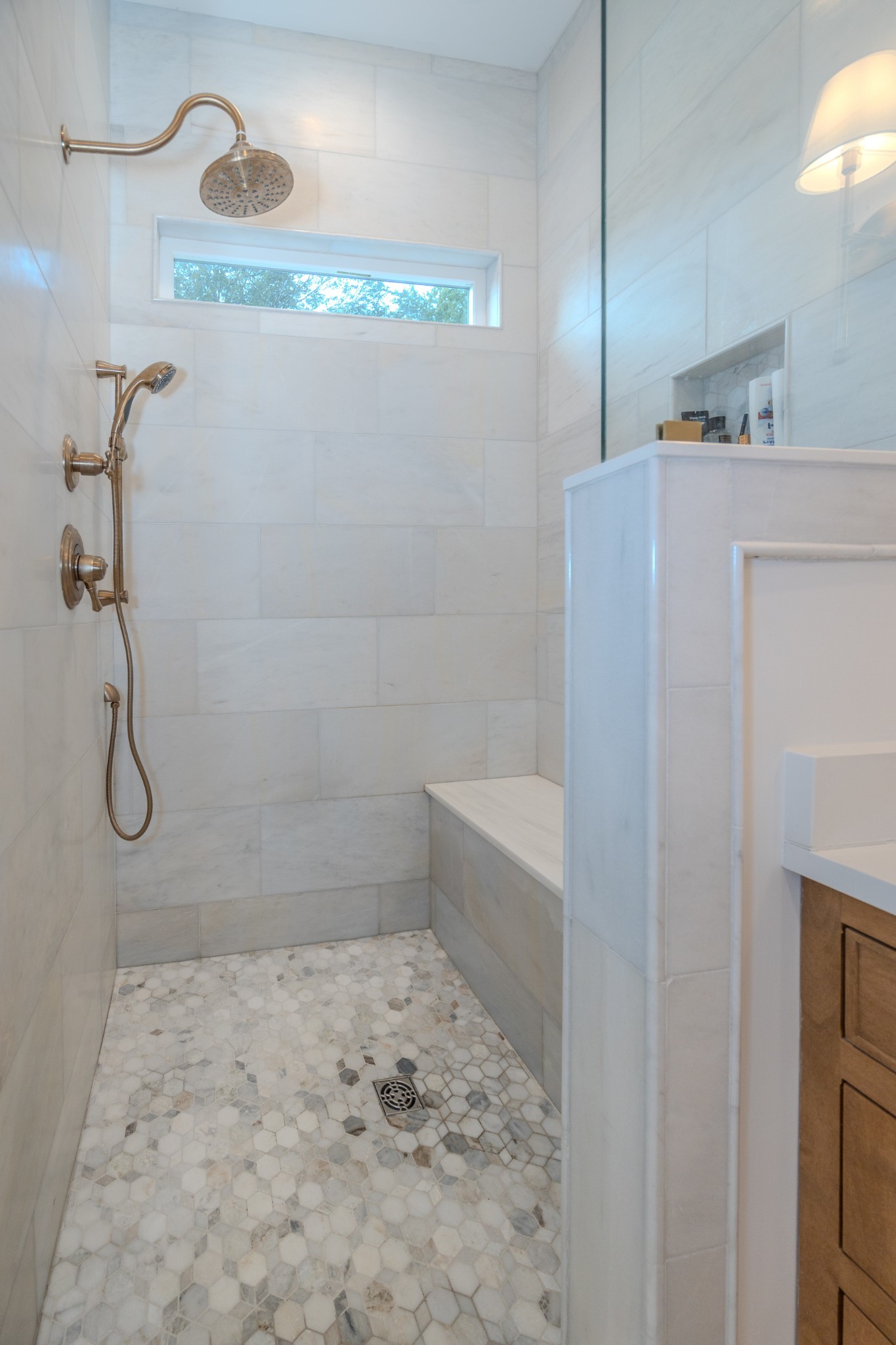 The spacious primary suite offers a private escape with a marble walk-in shower, dual vanities, marble floors, a custom linen cabinet, and convenient access to the walk-in closet from the bathroom.