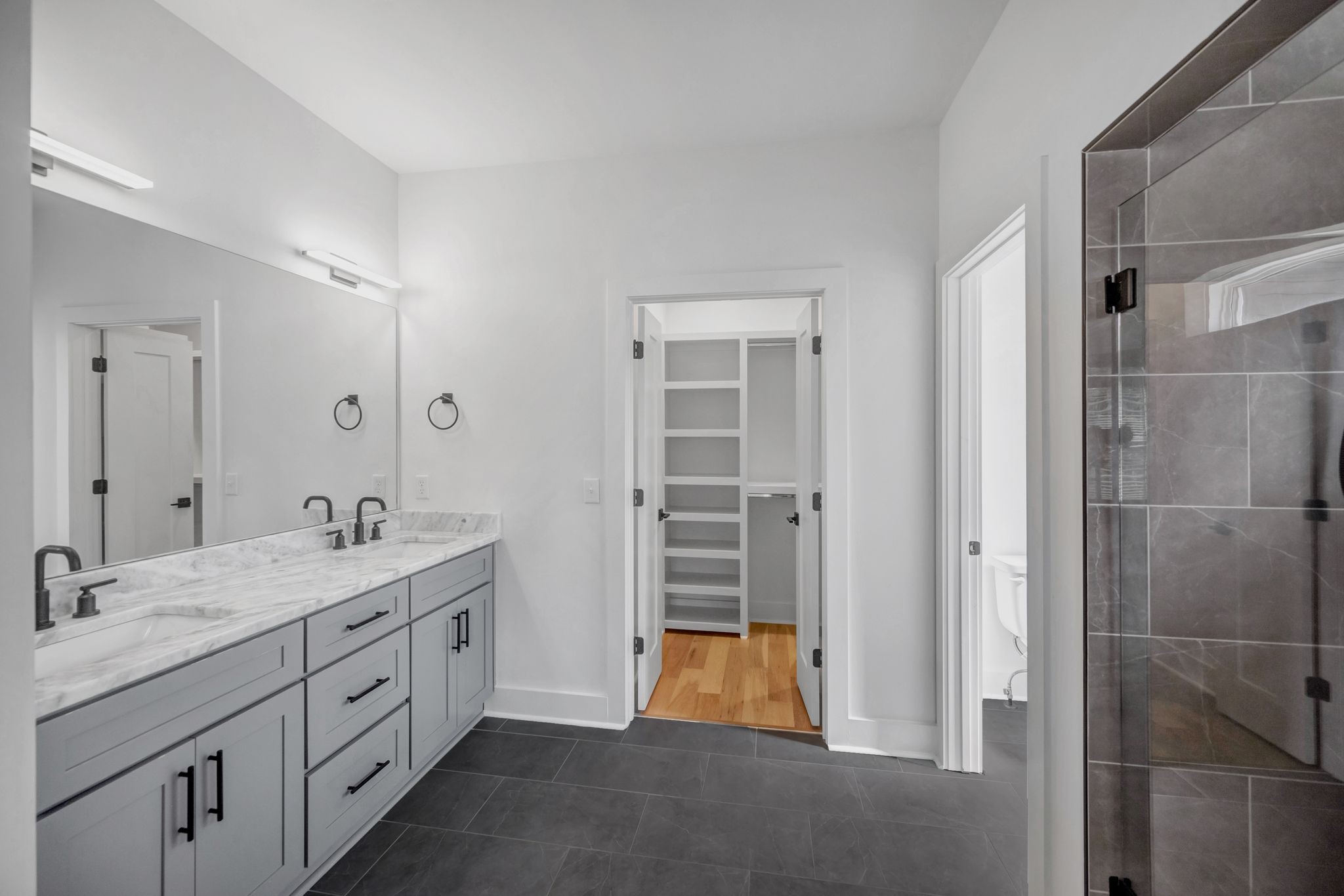 Upstairs, the primary suite offers a luxurious retreat with double vanities, a spa-like shower, and a generous walk-in closet. Two additional bedrooms and a full bath complete the upper level.