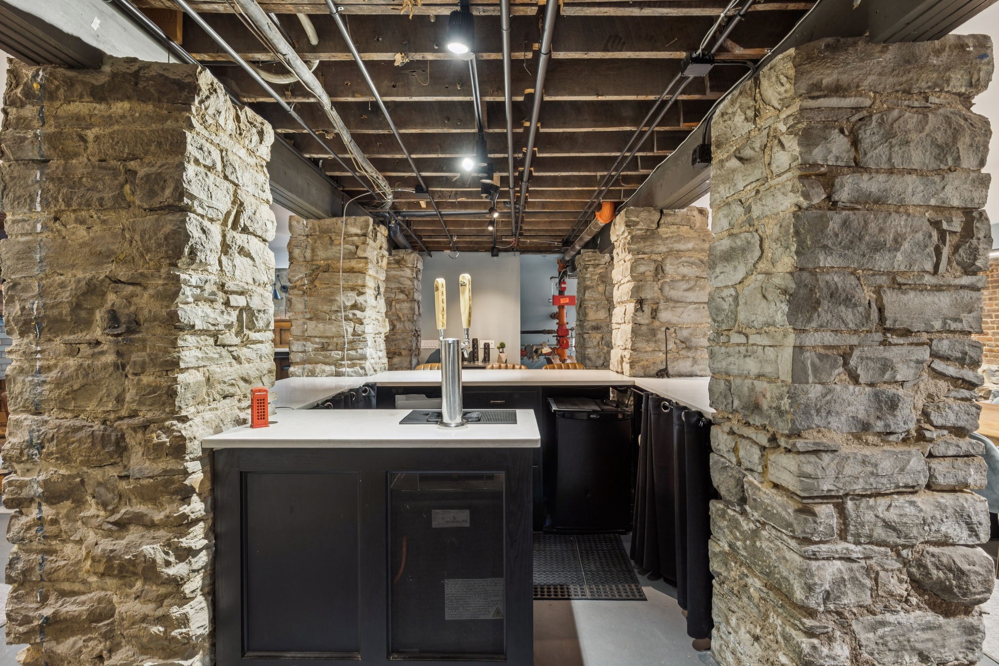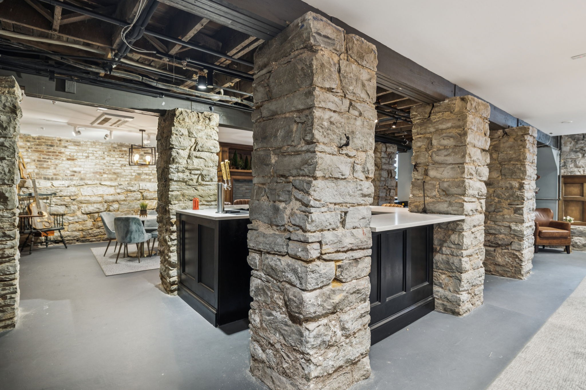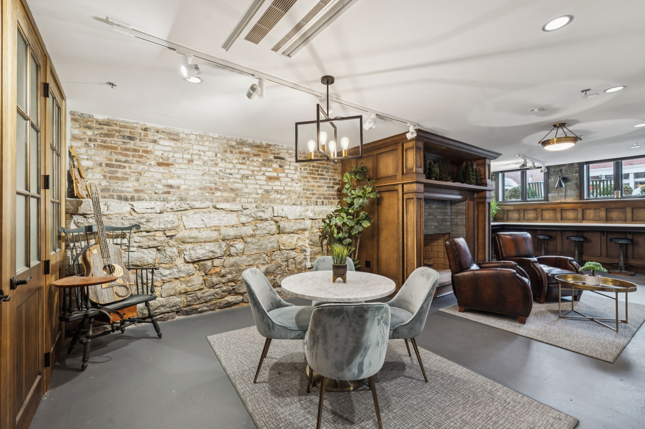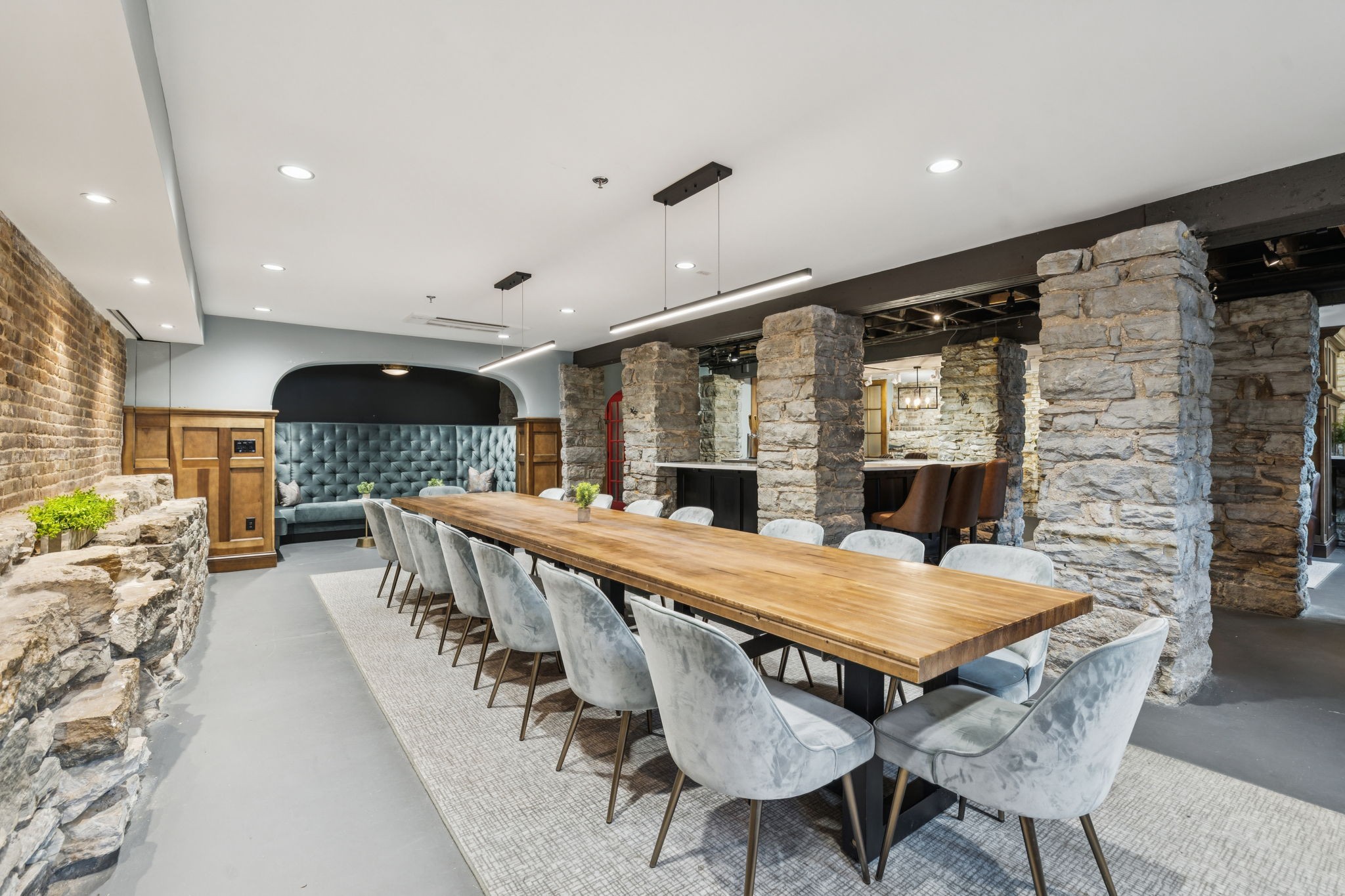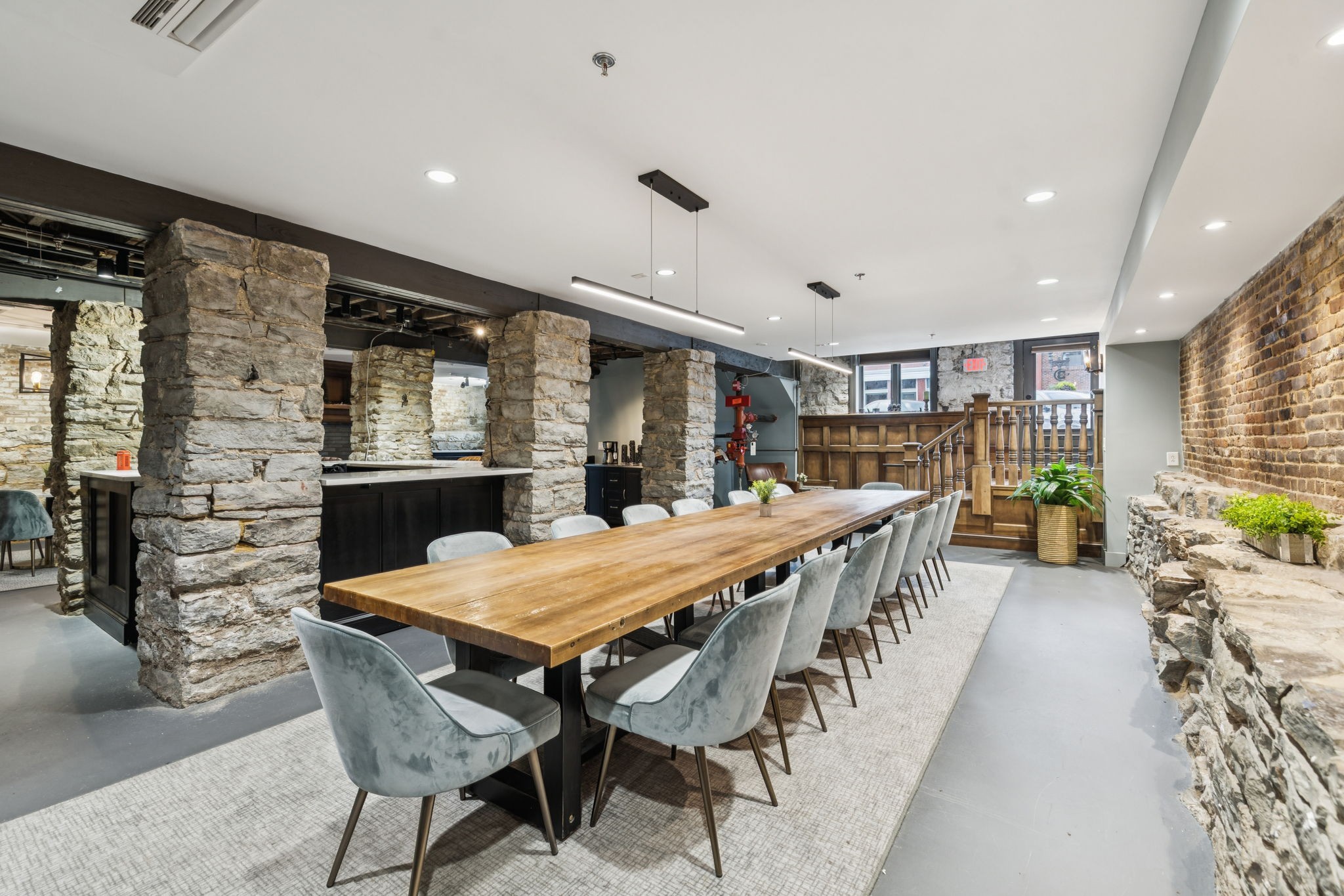 Fully furnished ground-level office suite~16-person conference table~Hidden TV~Two private workstation offices plus multiple collaborative work areas~Built-in bar with stone columns, featuring seating for 14 (8 wall barstools + 6 at center bar)~Banquette seating and additional four-top worktable~ Fireplace with leather club chairs for client meetings or informal collaboration~ London-style red telephone booth for private calls~ Kitchenette and two restrooms~ Unique design elements throughout, including speakeasy-inspired finishes