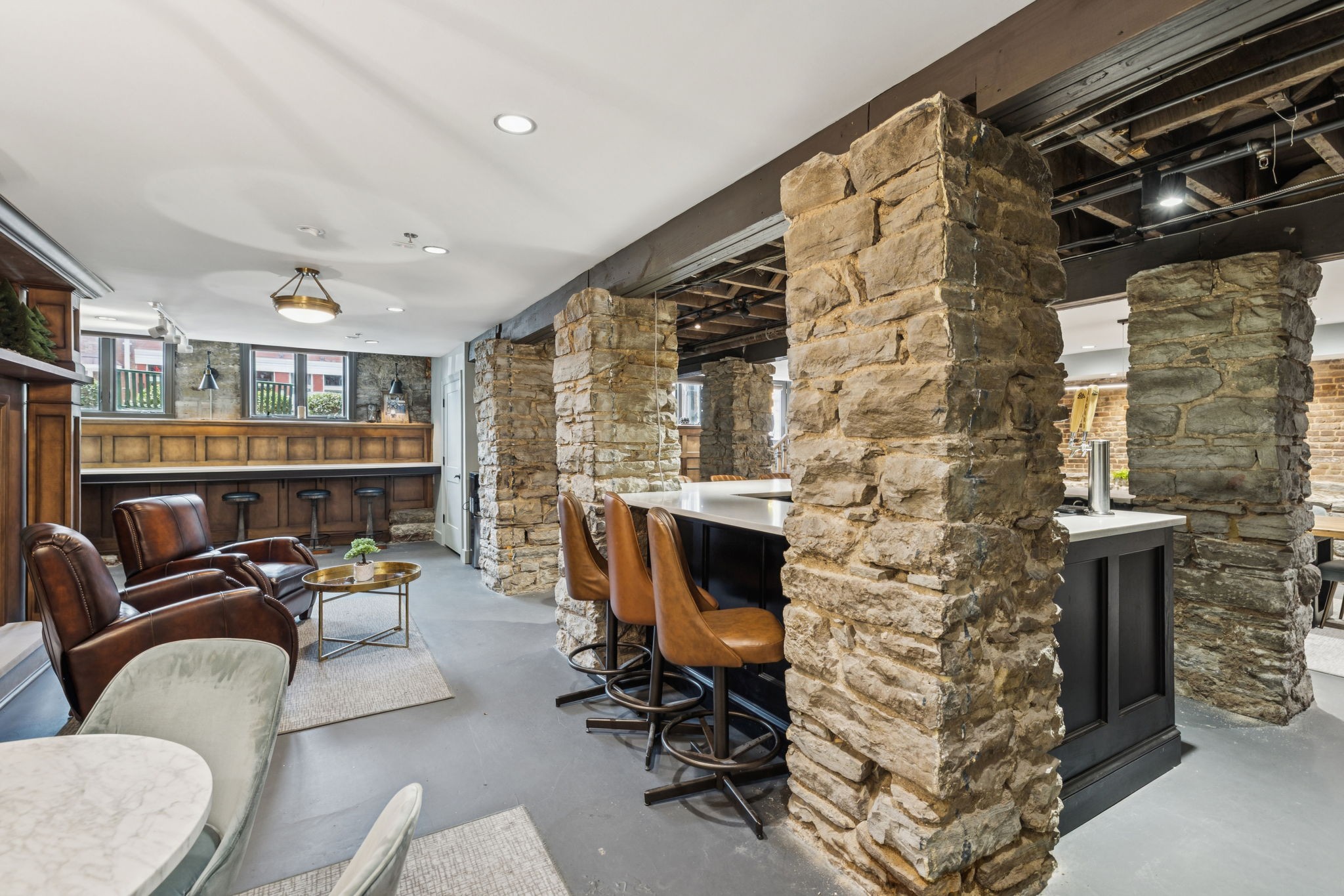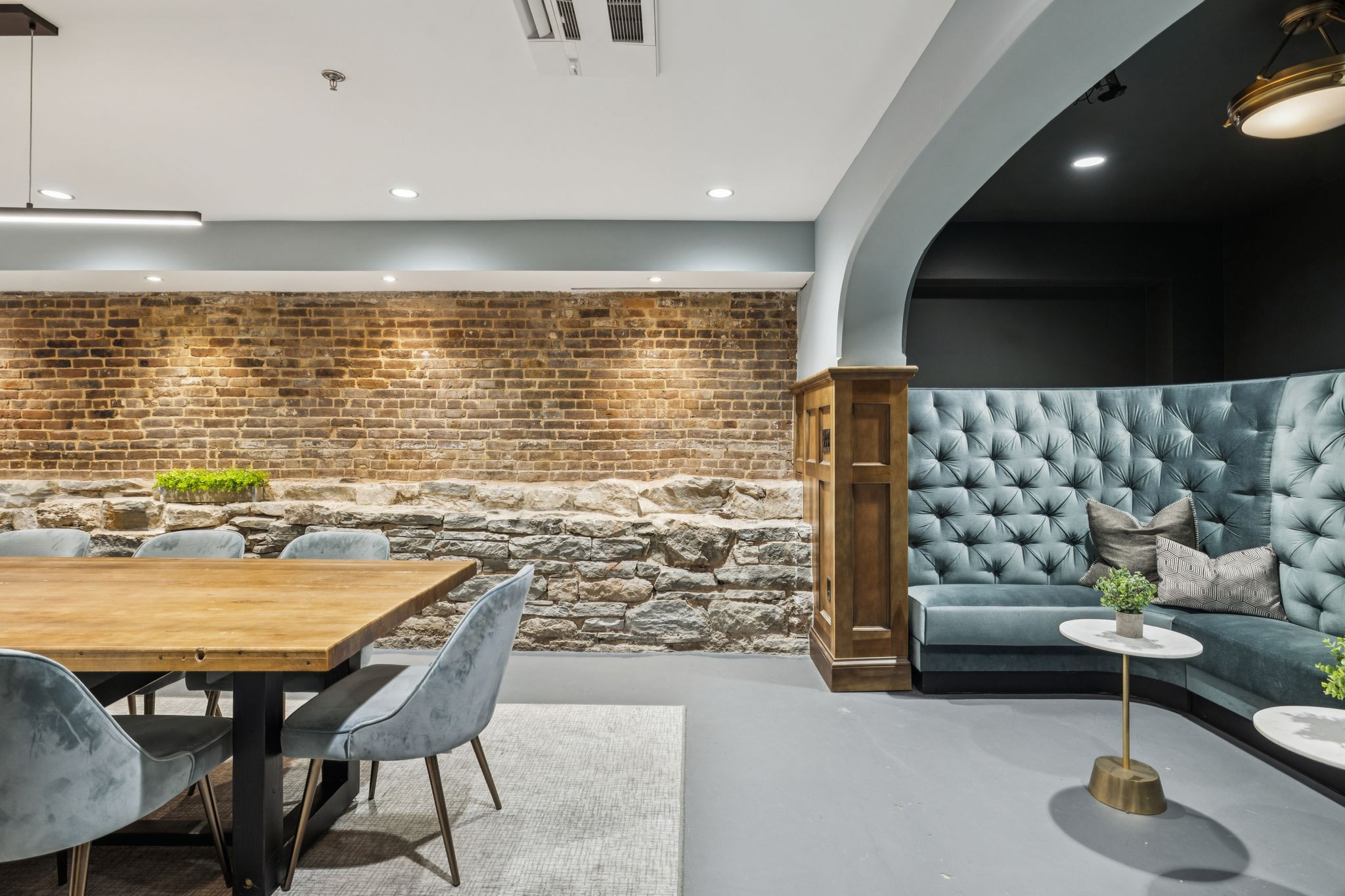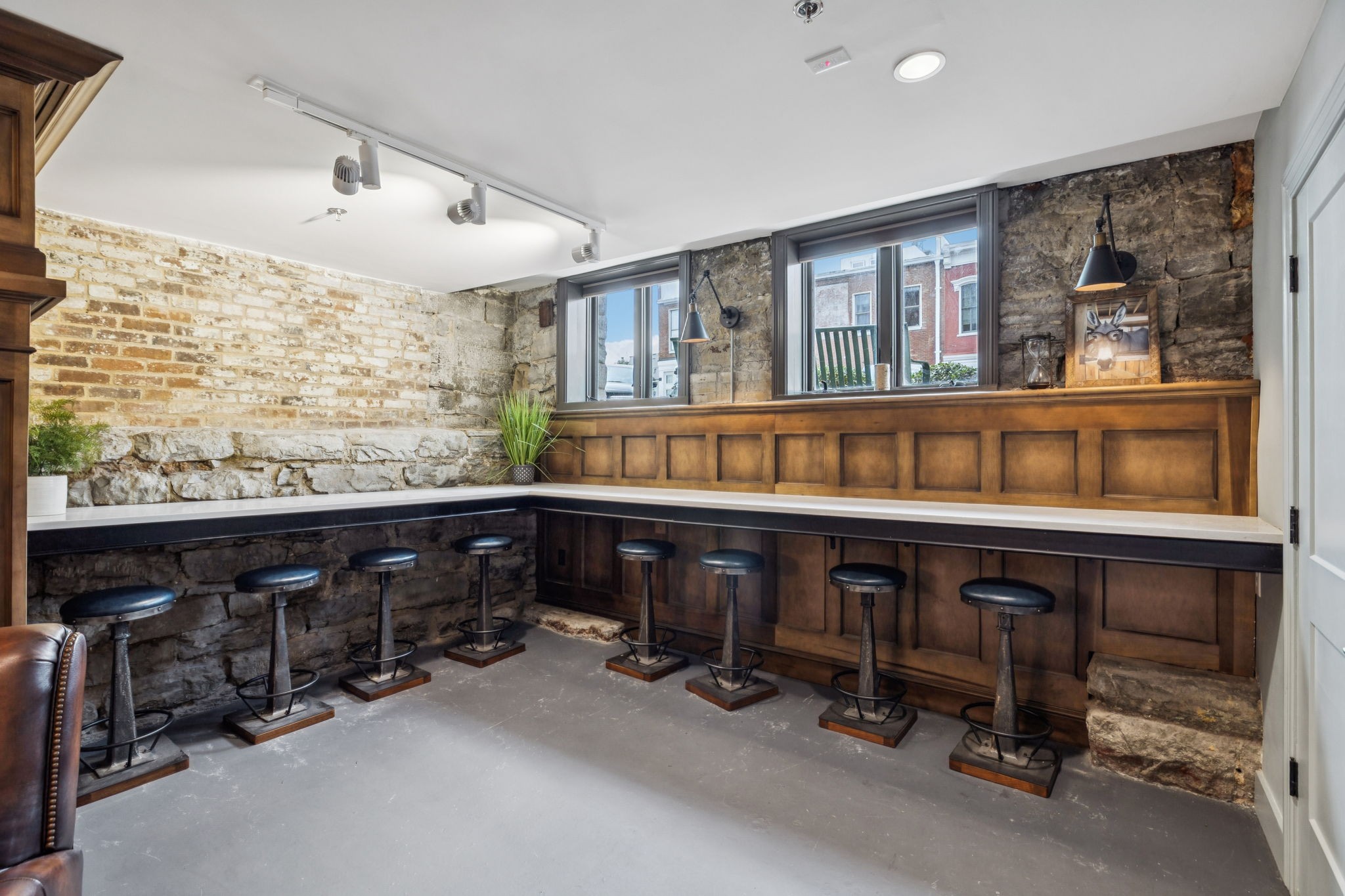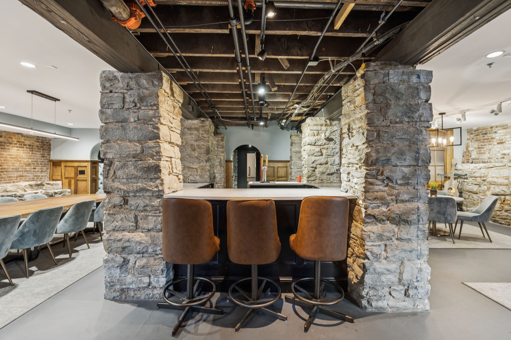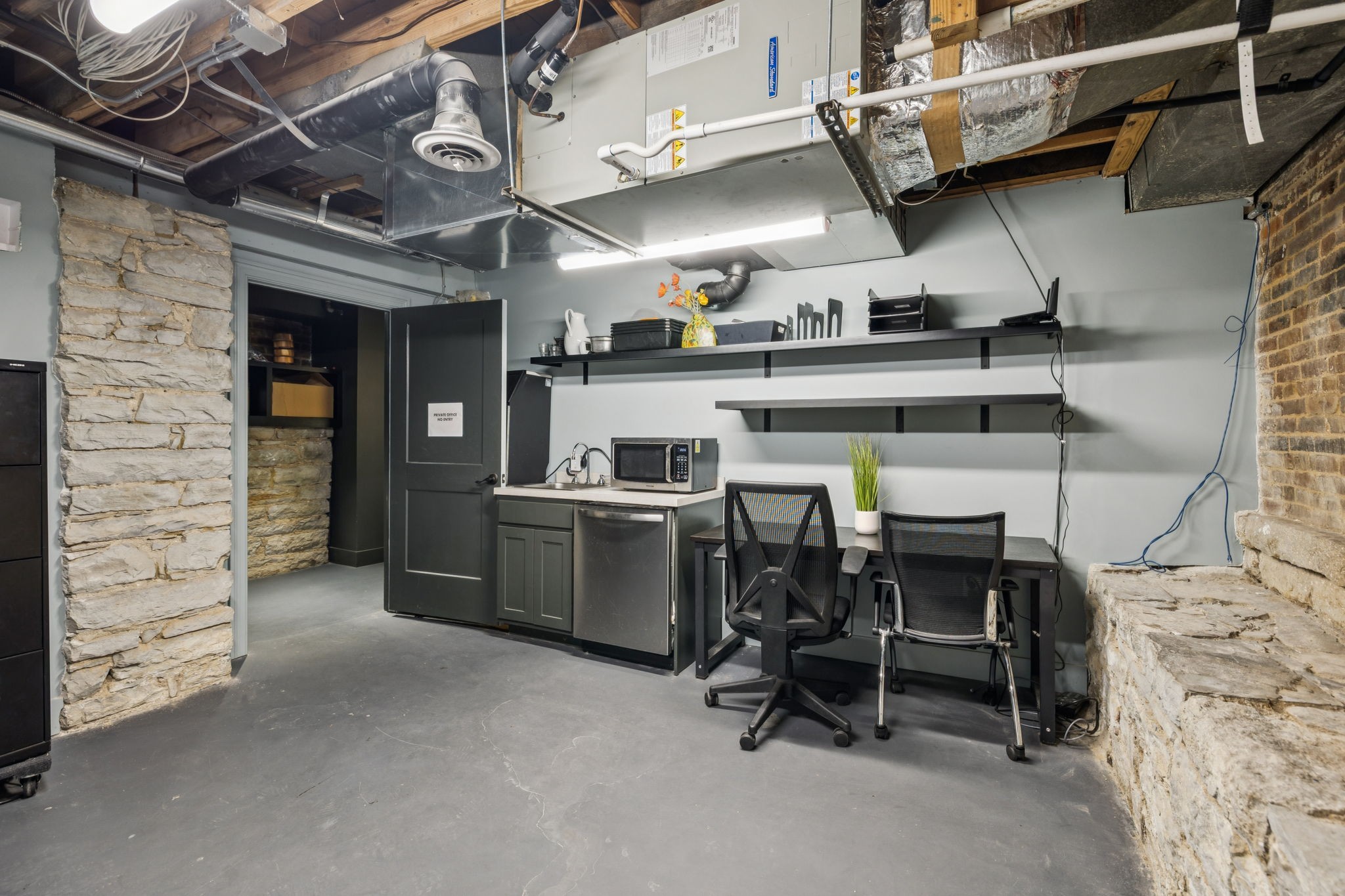Fully furnished ground-level office suite~16-person conference table~Hidden TV~Two private workstation offices plus multiple collaborative work areas~Built-in bar with stone columns, featuring seating for 14 (8 wall barstools + 6 at center bar)~Banquette seating and additional four-top worktable~ Fireplace with leather club chairs for client meetings or informal collaboration~ London-style red telephone booth for private calls~ Kitchenette and two restrooms~ Unique design elements throughout, including speakeasy-inspired finishes