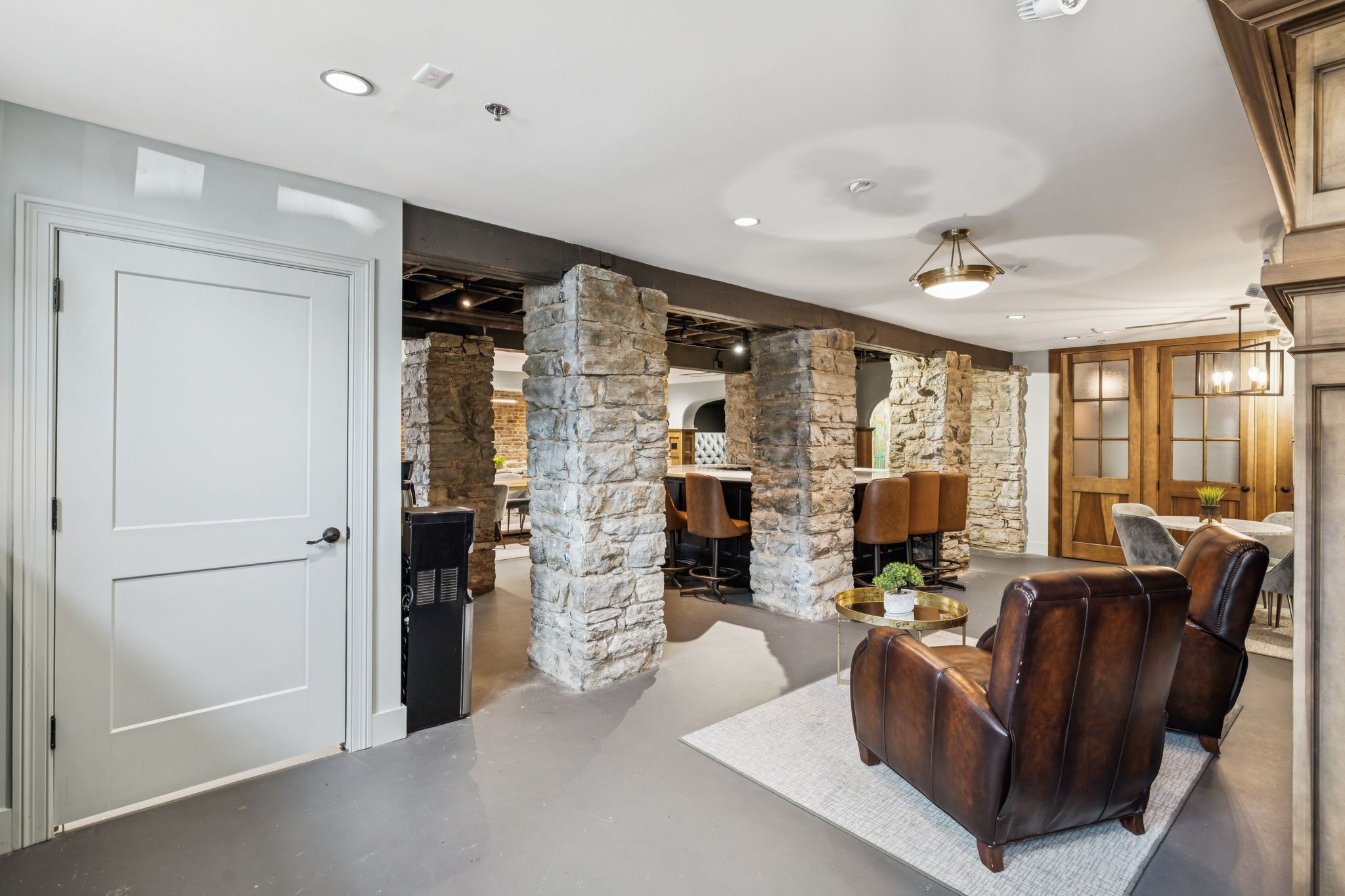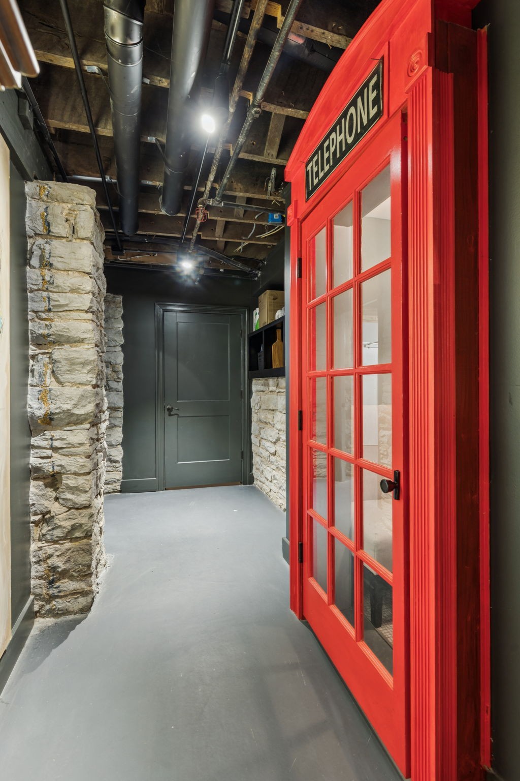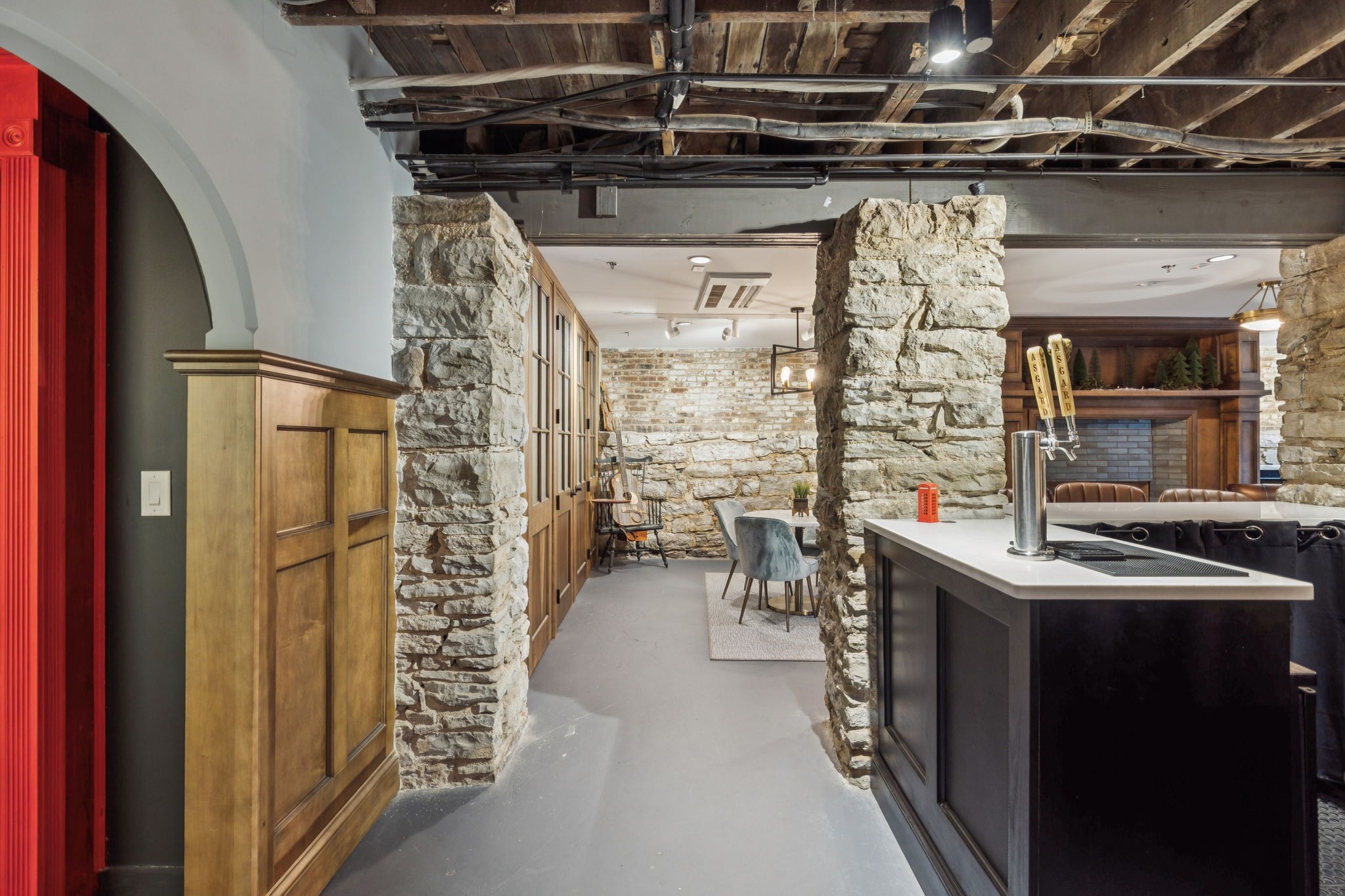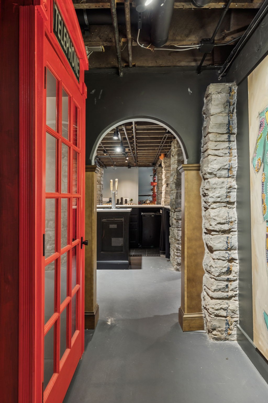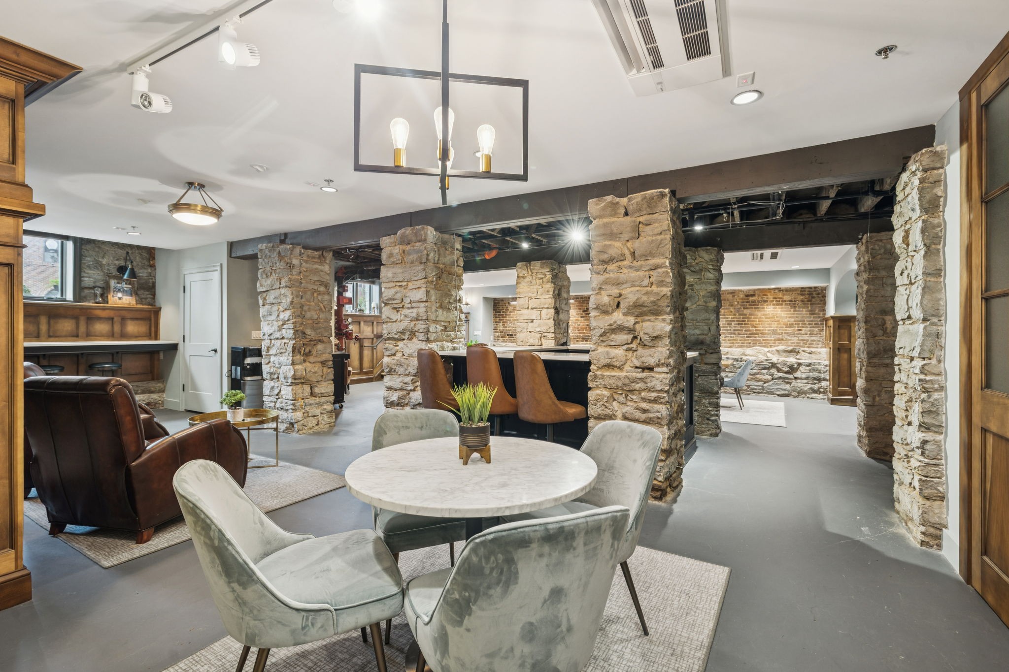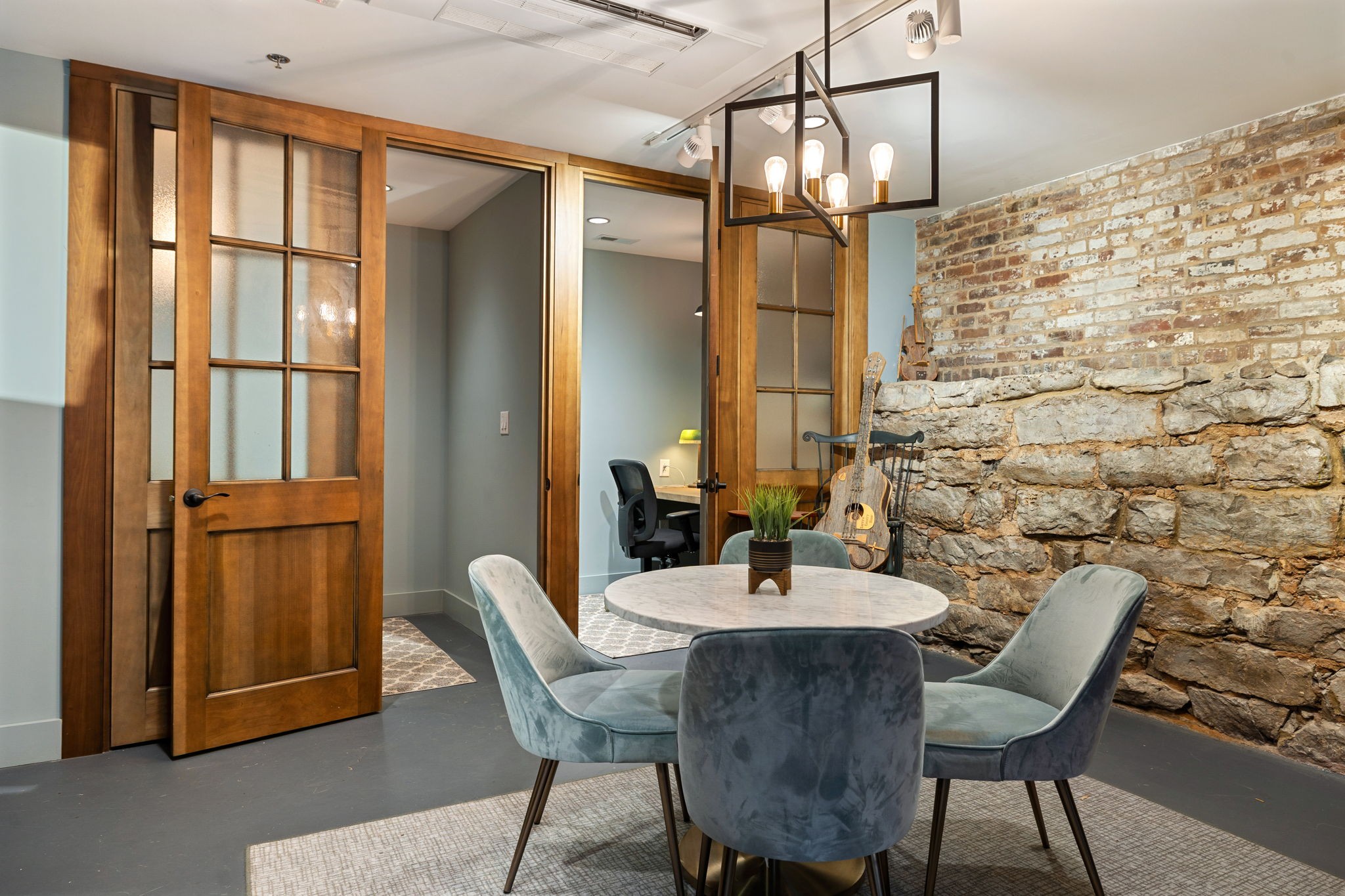 Fully furnished ground-level office suite~16-person conference table~Hidden TV~Two private workstation offices plus multiple collaborative work areas~Built-in bar with stone columns, featuring seating for 14 (8 wall barstools + 6 at center bar)~Banquette seating and additional four-top worktable~ Fireplace with leather club chairs for client meetings or informal collaboration~ London-style red telephone booth for private calls~ Kitchenette and two restrooms~ Unique design elements throughout, including speakeasy-inspired finishes
