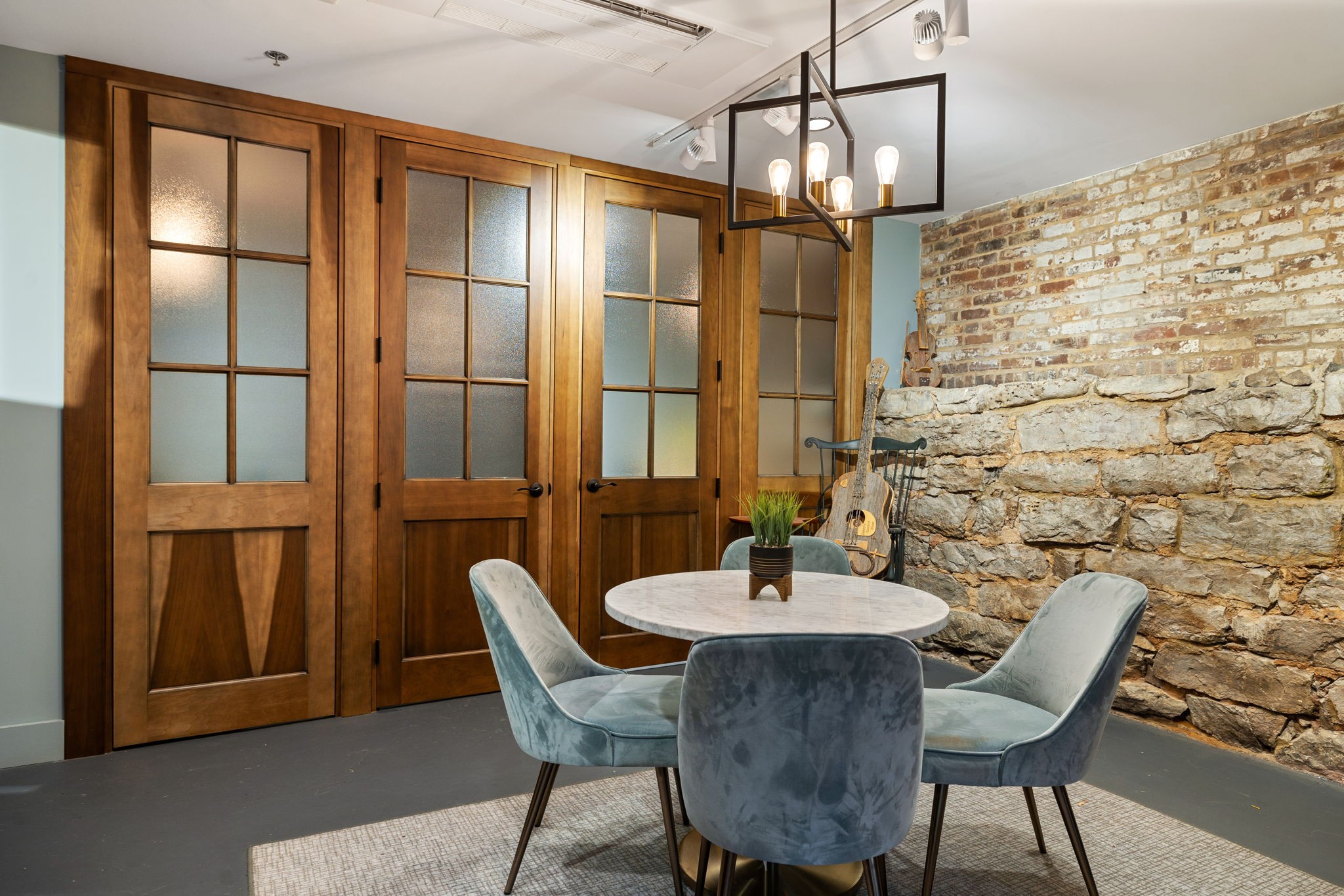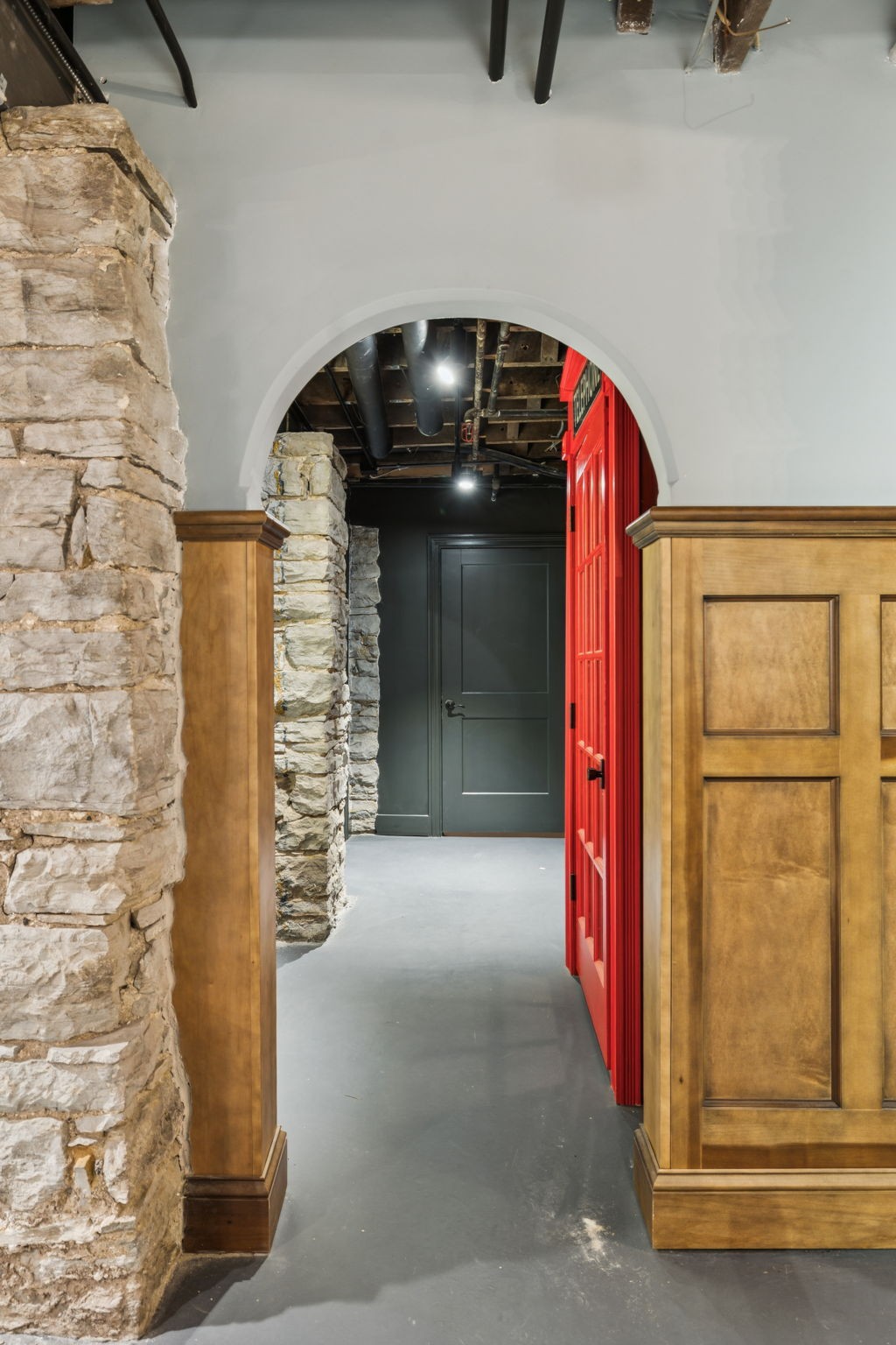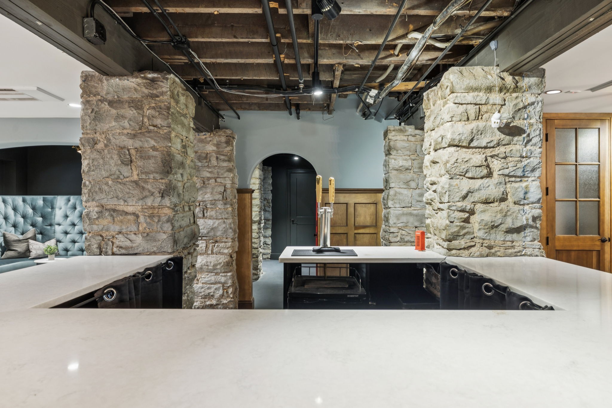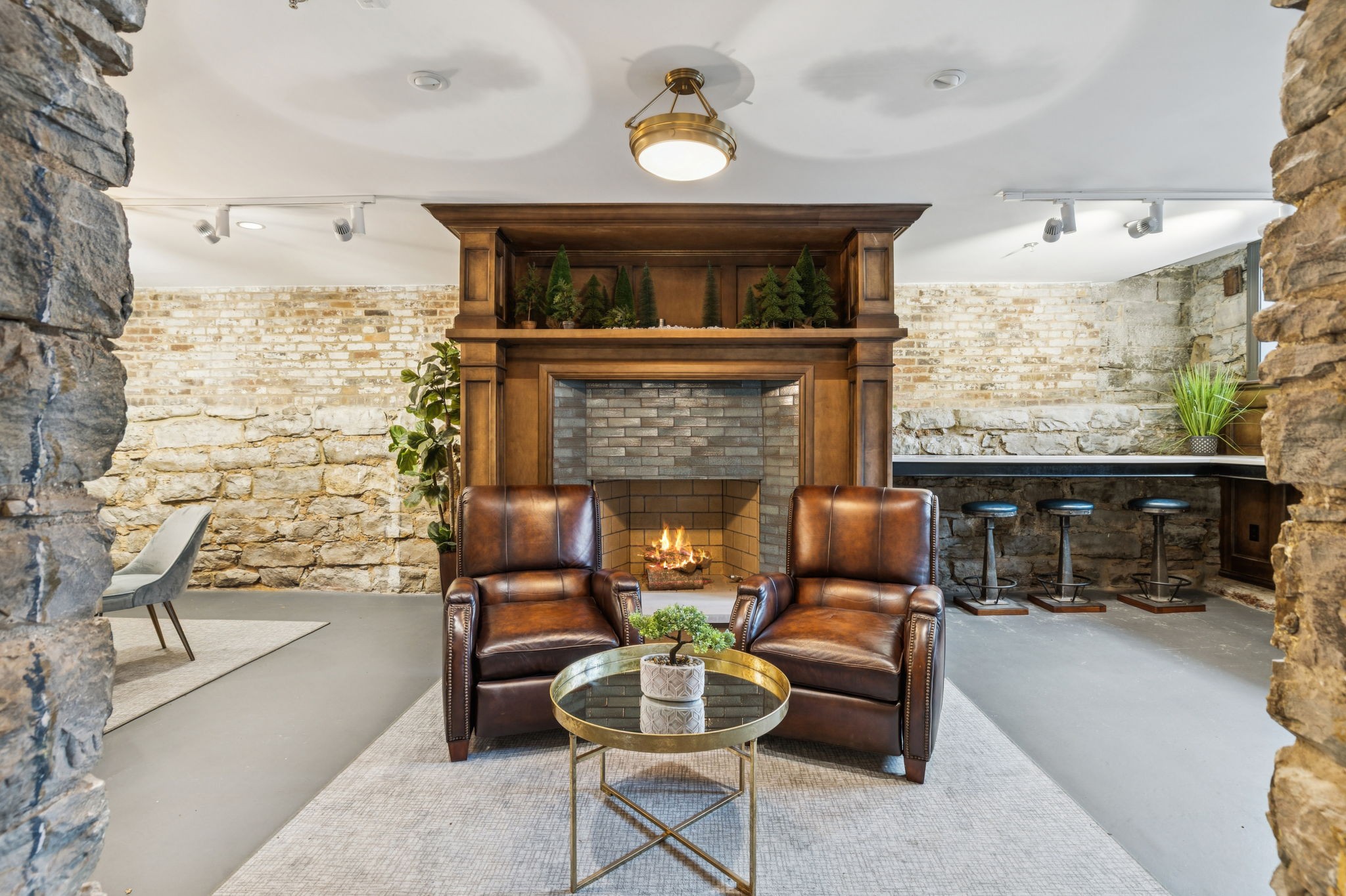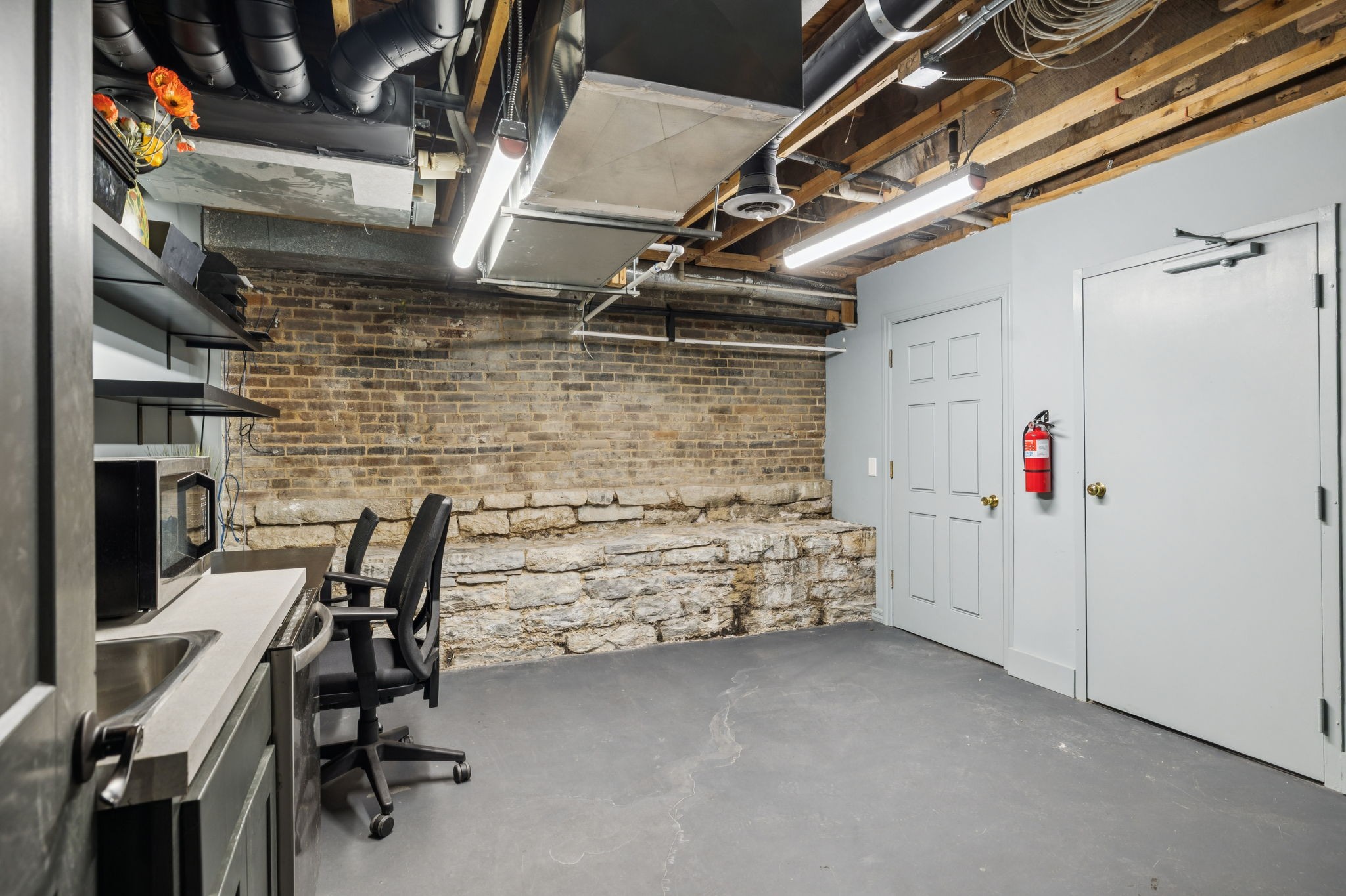 Fully furnished ground-level office suite~16-person conference table~Hidden TV~Two private workstation offices plus multiple collaborative work areas~Built-in bar with stone columns, featuring seating for 14 (8 wall barstools + 6 at center bar)~Banquette seating and additional four-top worktable~ Fireplace with leather club chairs for client meetings or informal collaboration~ London-style red telephone booth for private calls~ Kitchenette and two restrooms~ Unique design elements throughout, including speakeasy-inspired finishes