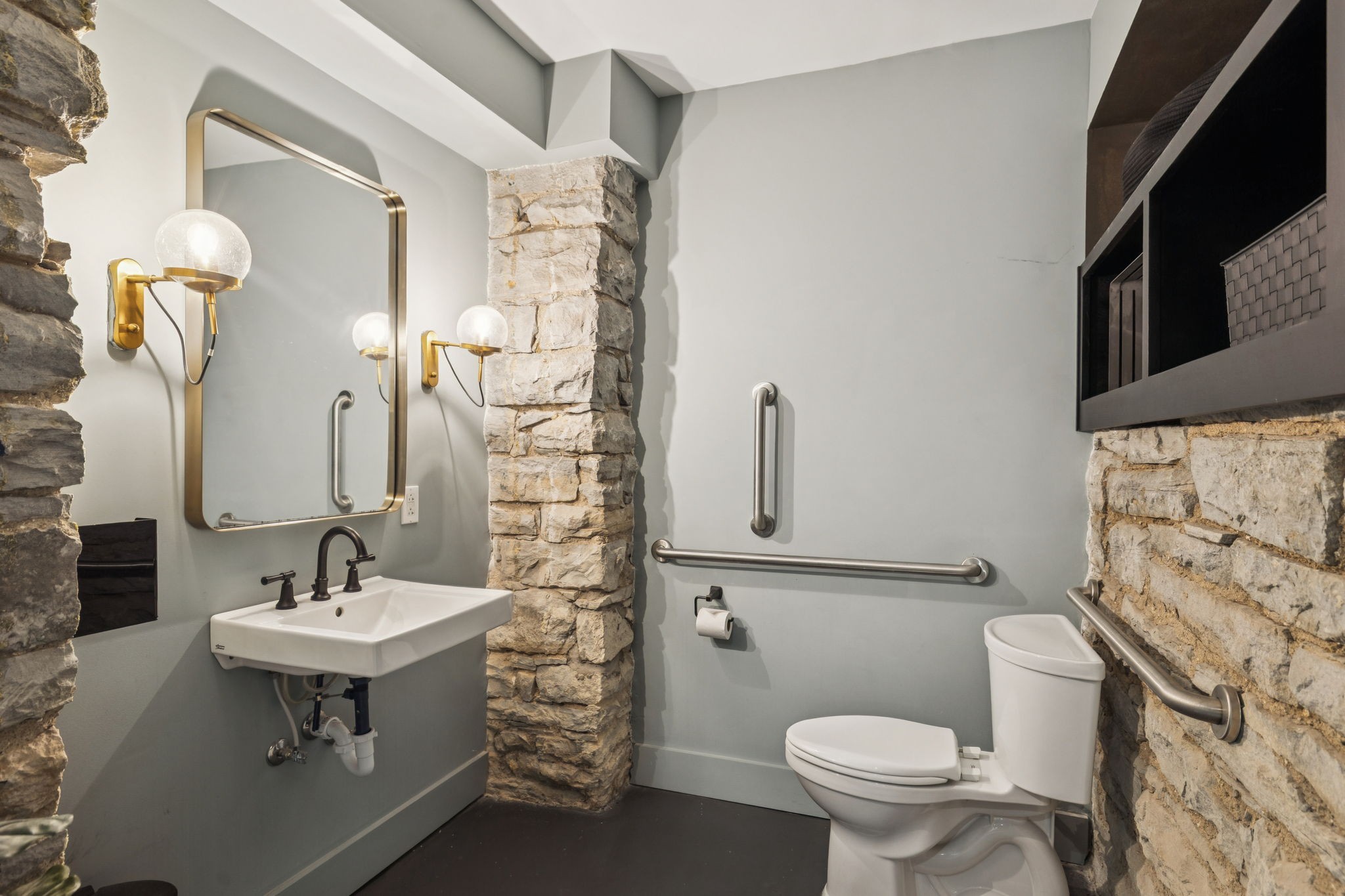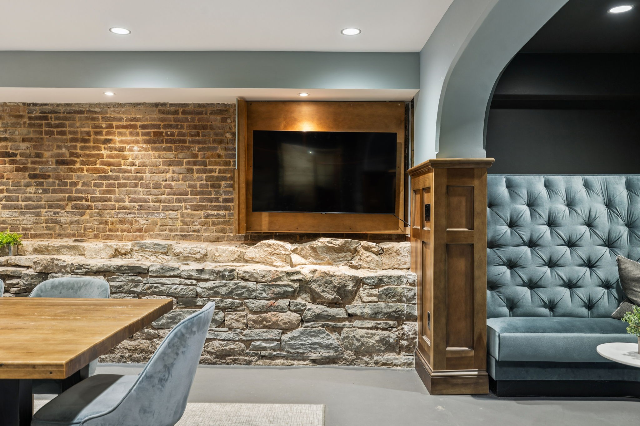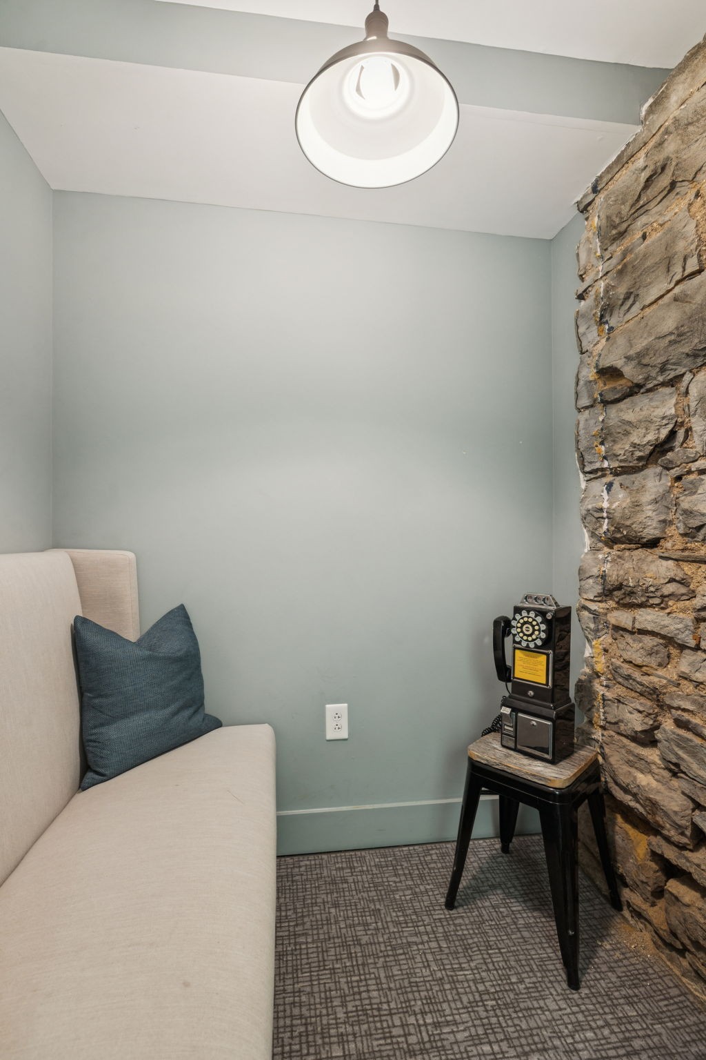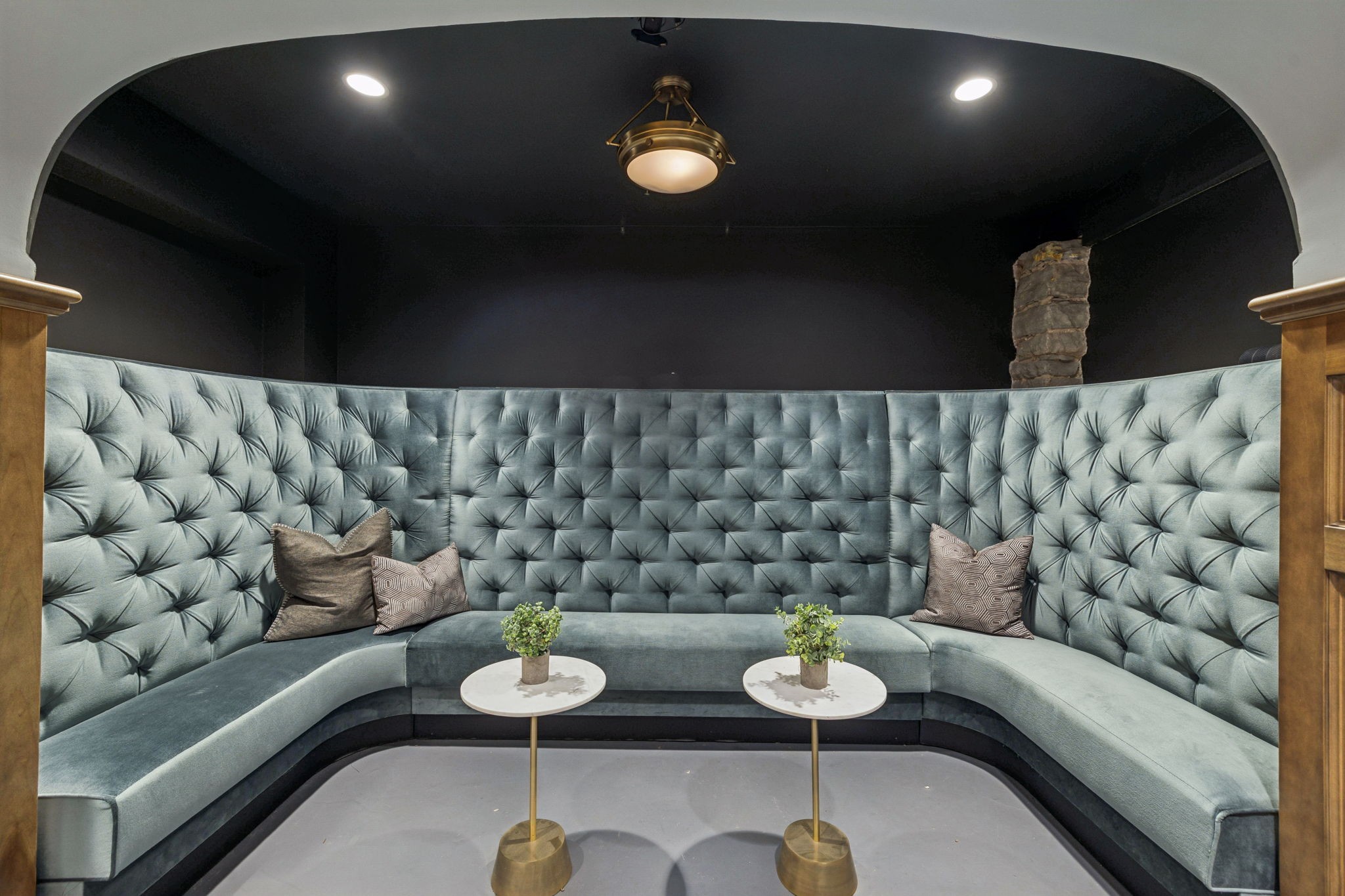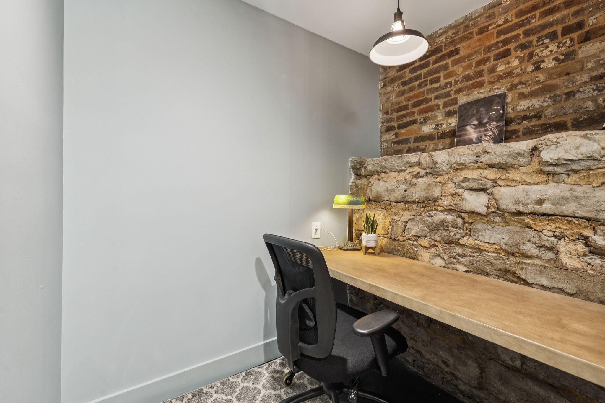 Fully furnished ground-level office suite~16-person conference table~Hidden TV~Two private workstation offices plus multiple collaborative work areas~Built-in bar with stone columns, featuring seating for 14 (8 wall barstools + 6 at center bar)~Banquette seating and additional four-top worktable~ Fireplace with leather club chairs for client meetings or informal collaboration~ London-style red telephone booth for private calls~ Kitchenette and two restrooms~ Unique design elements throughout, including speakeasy-inspired finishes