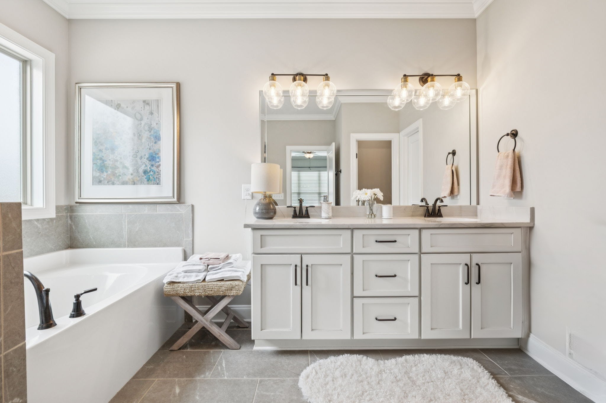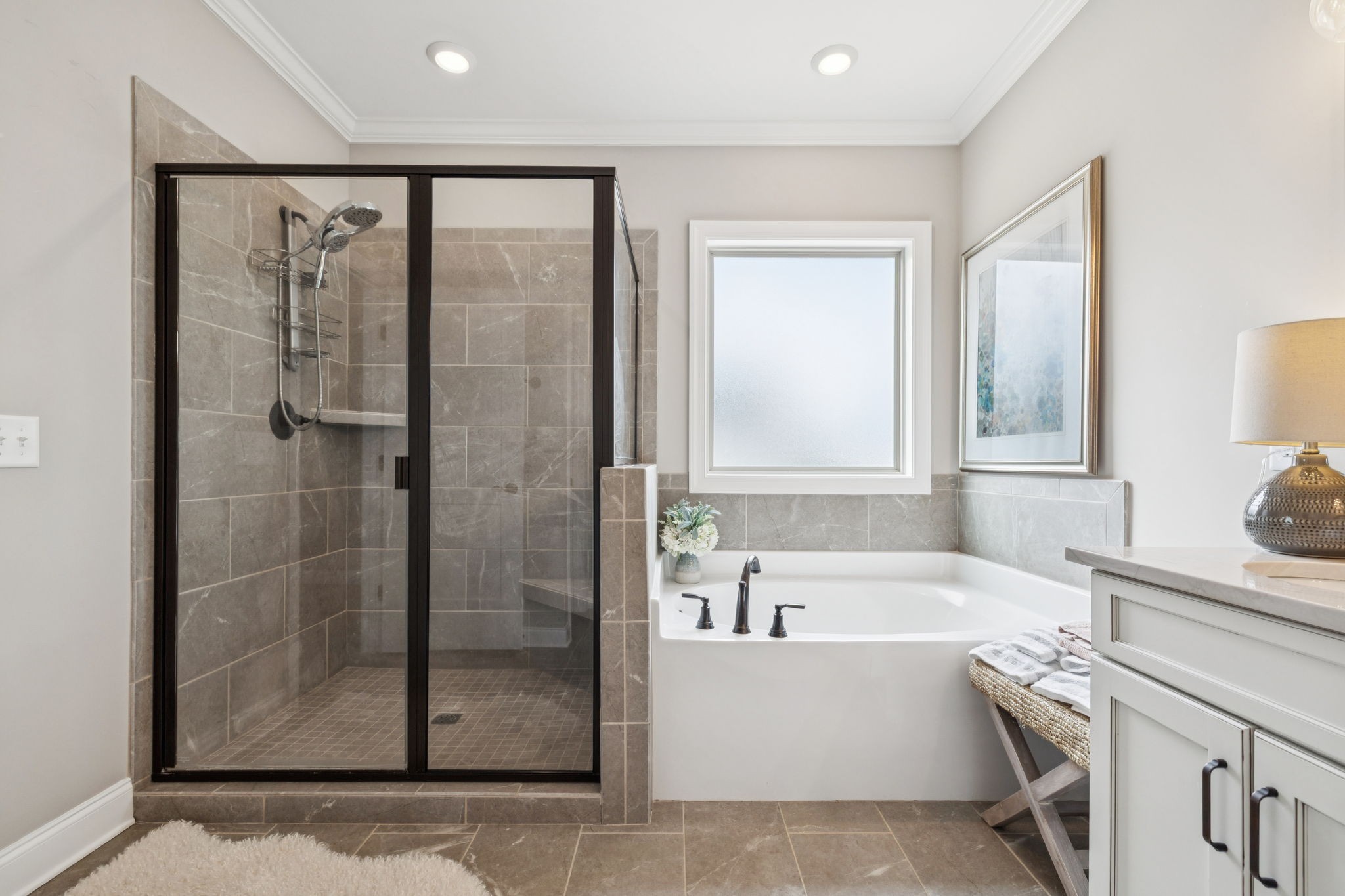 The main-level owner’s suite offers a true retreat, complete with dual walk-in closets and a private sitting area. The spa-like bath features a soaking tub, separate shower, and double vanity. Upstairs, three bedrooms and a spacious bonus room provide flexible space for family, guests, or a home office.