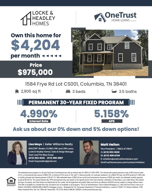 Custom-built home! Spanning over 2,900 sq. ft. on nearly 2 acres, this property offers exceptional privacy with a serene treelined view. Introducing The Madison, a masterpiece featuring 3 bedrooms, 3.5 baths, a spacious bonus room, and a separate flex room perfect for a home office or home school room! Designed with timeless elegance, stunning engineered hardwood floors, and an oversized 8.5 ft custom island. The primary suite is conveniently located on the main floor with separate shower and tub and spacious walk in closet. Enjoy the sunrise and a cup of coffee on the 14x16 covered deck. This home has premium features such as Jeld-Wen Energy-Star tilt-in windows, a tankless gas water heater, TECHSHIELD radiant barrier for energy efficiency, encapsulated crawlspace and so much more! Rest easy knowing your investment is backed by a 1-year builder warranty and a 5-year warranty through a third party company. Located less than 3 miles from Saturn Parkway/I-65 and just 4 miles from Spring Hill Crossings, you'll enjoy easy access to restaurants, shopping, and more. Schedule a tour of our model home today and envision your dream home come to life! Taxes are on the land only. Screened-in deck is an optional upgrade. ****PERMANENT 30-YR FIXED CONVENTIONAL LOAN at 4.990% (5.159% APR). Rates, terms & eligibility vary; not all qualify. OneTrust Home Loans is an EQUAL HOUSING LENDER, NMLS# 46375. Please see uploaded financing flyer for full financing details.