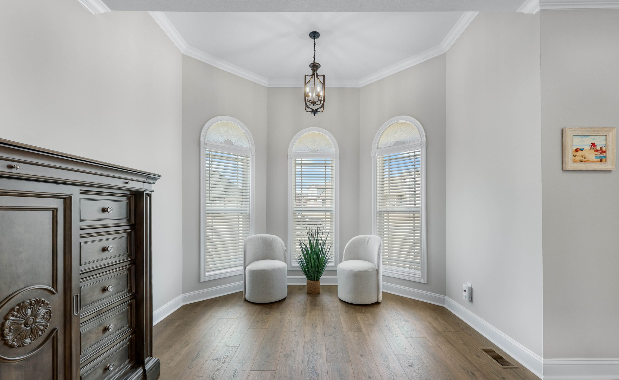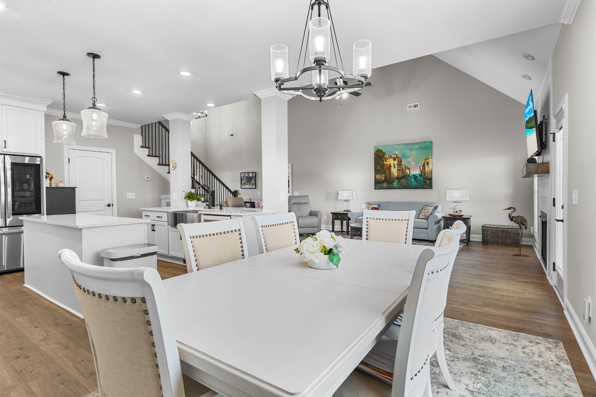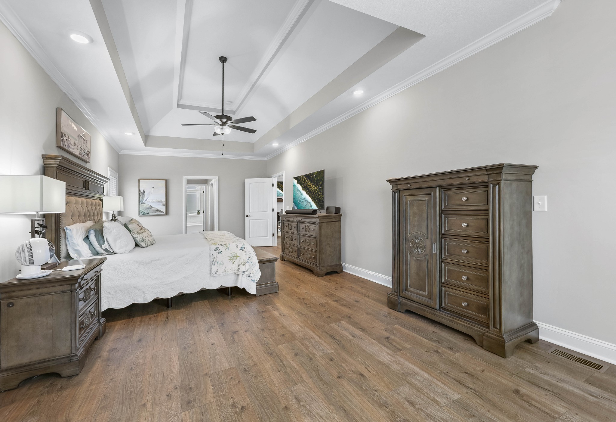 This is an excellent opportuning for a buyer to purchase an upscale home! The floor plan has the best VIBE and all the upgraded features! It has an open concept, but it has many private areas to relax and chill. The bedrooms are all perfectly spaced apart, so that everyone has their own space and bathrooms! The primary and guest bedrooms are downstairs and there are two bedrooms upstairs with a bonus room! There is a formal dining room with a coffered ceiling that can be also used as an office. The primary suite is every owner's dream with an alcove with beautiful arched windows for a sitting area, a large shower, and a soaking tub in the large bathroom! The laminate flooring is amazing throughout most the main floor, the bathrooms have porcelain tile, and the upstairs that is mostly carpeted areas with some laminate and tile. The exterior of this home is all brick with stone accents, and it has a 3 car garage, concrete driveway, covered front porch, deck and a patio! To sweeten the price, the seller is adding the refrigerator, washer, and dryer! The seller is ready for a qualified buyer to have very favorable terms, so don't miss this opportunity!