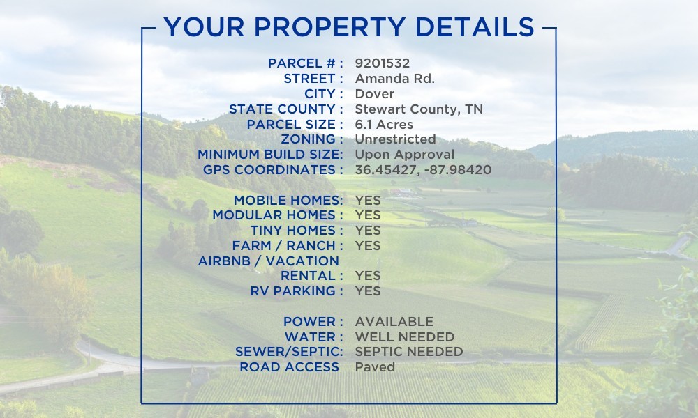 No zoning or HOA. Build now or later—mobile, modular, tiny home, RV or vacation rental. Near Kentucky Lake, river access, and public land. This 6.1-acre unrestricted lot on Amanda Rd near Dover, TN offers full freedom to build your way. With no zoning, no HOA, and power already available onsite, you can start today or hold for later. The land supports a range of options—from a farm, modular home, tiny house, to an RV retreat or short-term rental. At just minutes from hunting grounds, Dover Lake, Kentucky Lake, and the Cumberland River, it’s perfect for anyone looking for rural flexibility with recreational convenience.