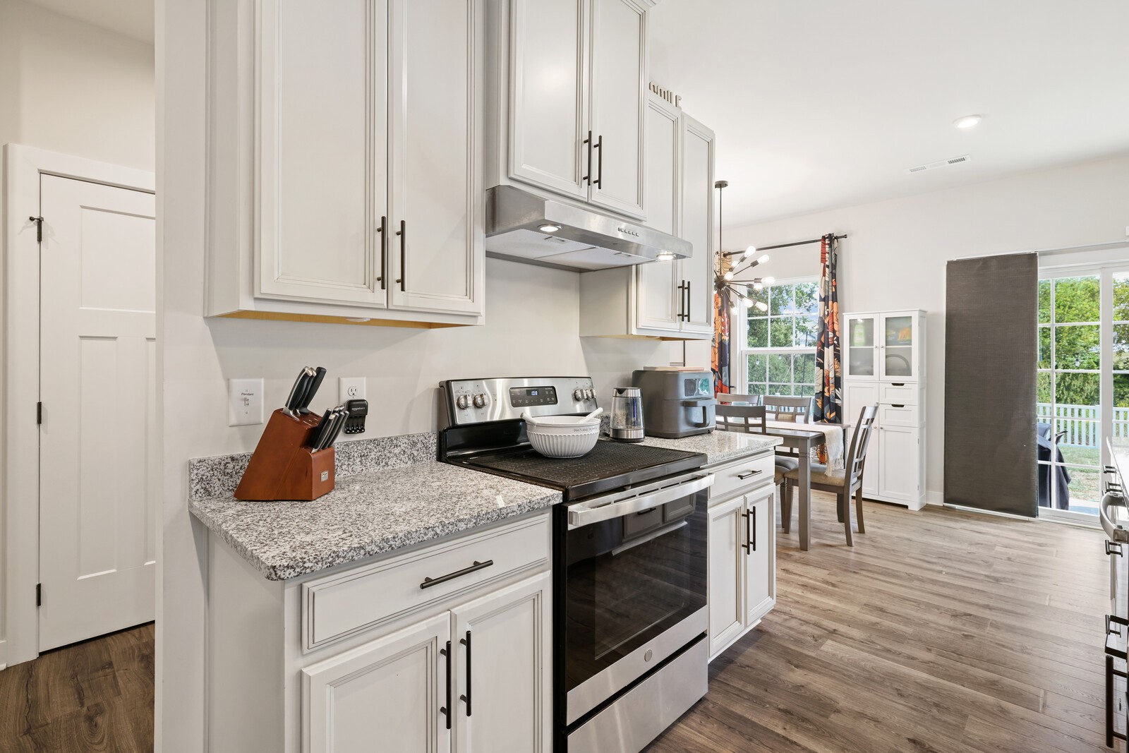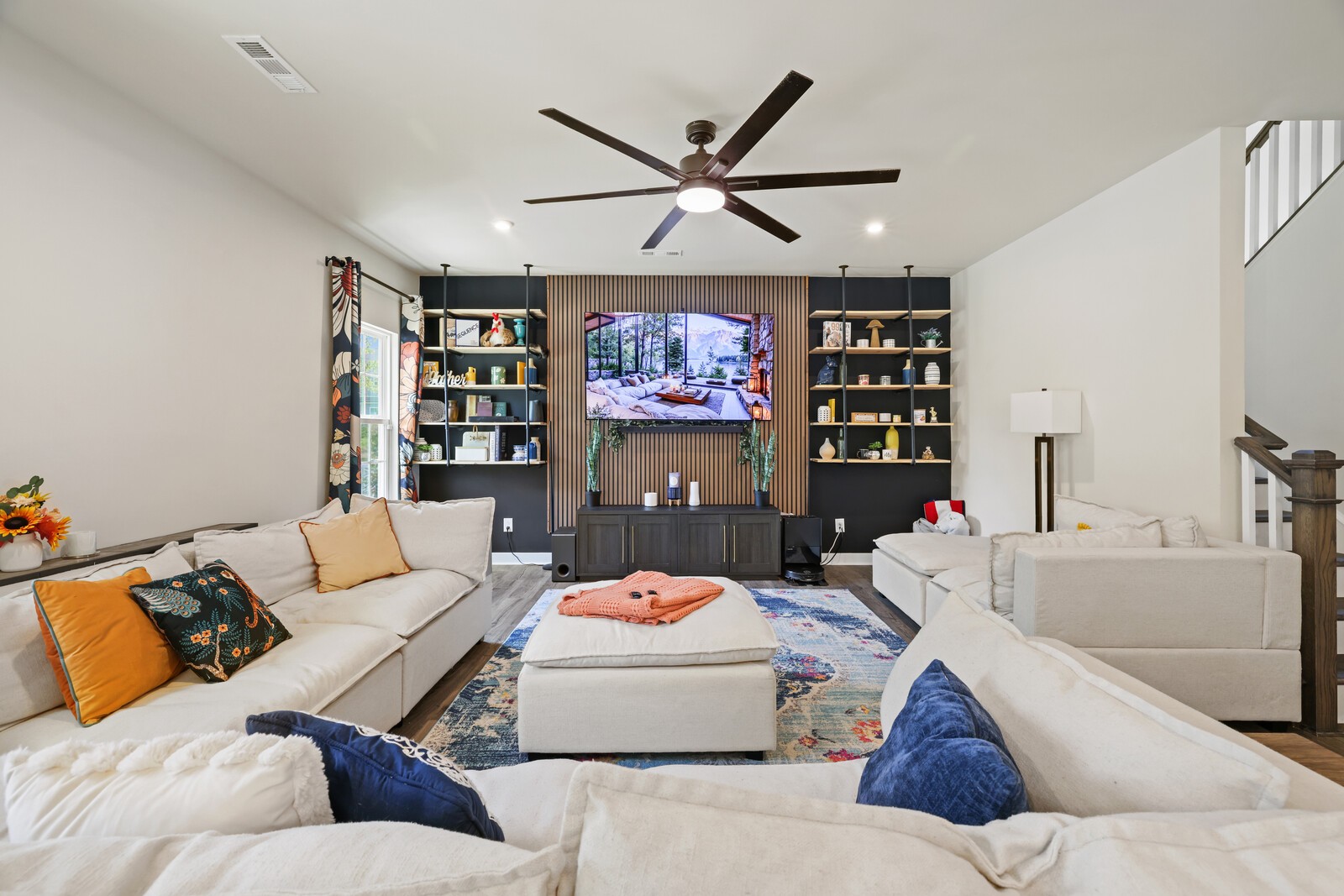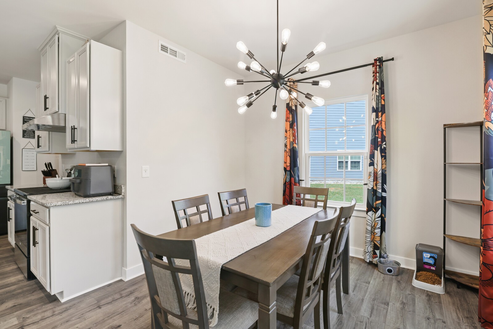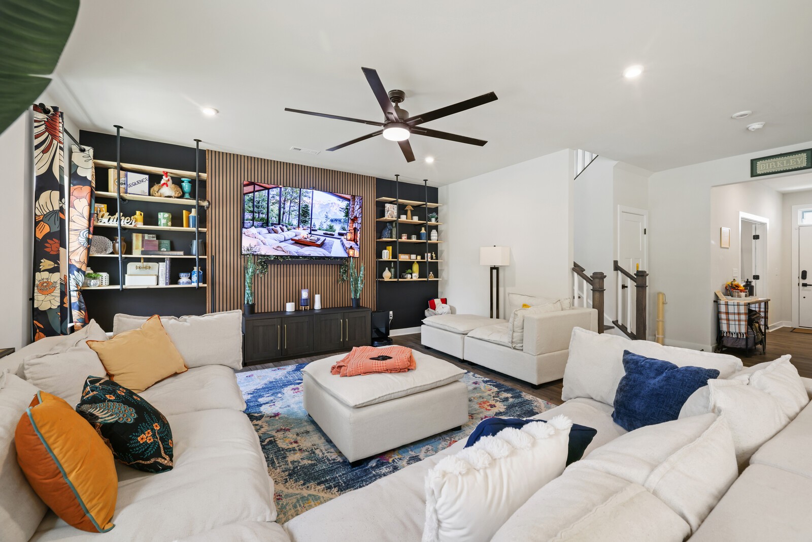 Custom Designer Interior: Stylish LVP flooring flows through the main living areas, complemented by chic flat black hardware throughout. Features a stunning entertainment wall, modern Sputnik chandelier in the dining room, floating shelves, & barn door accents.