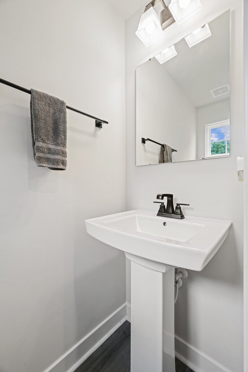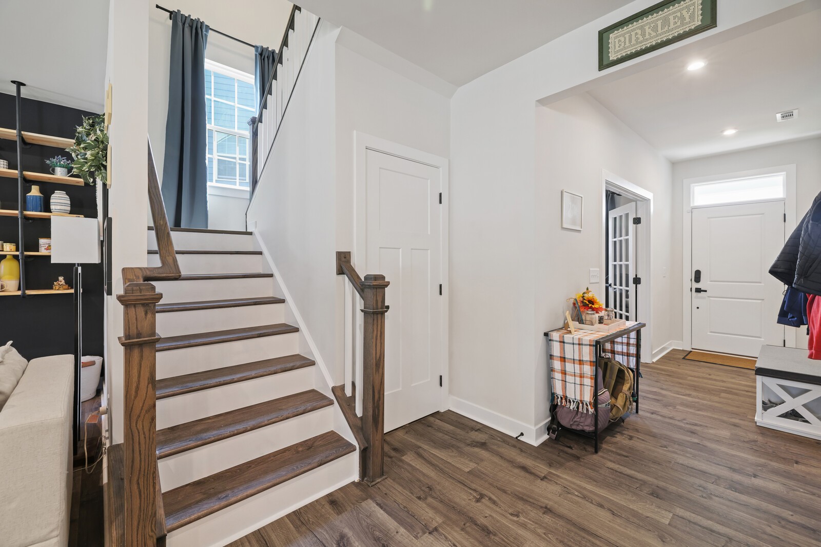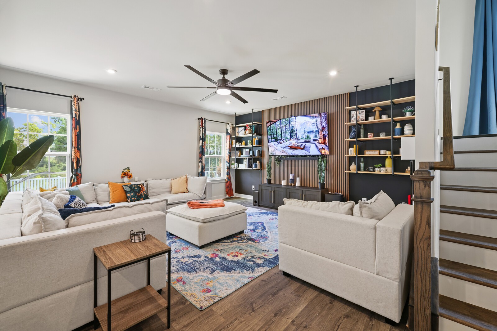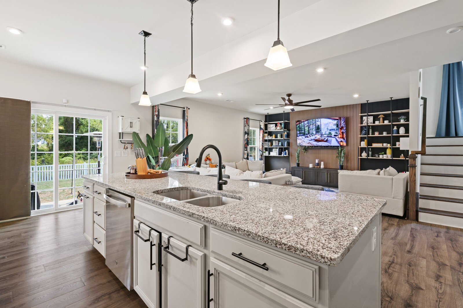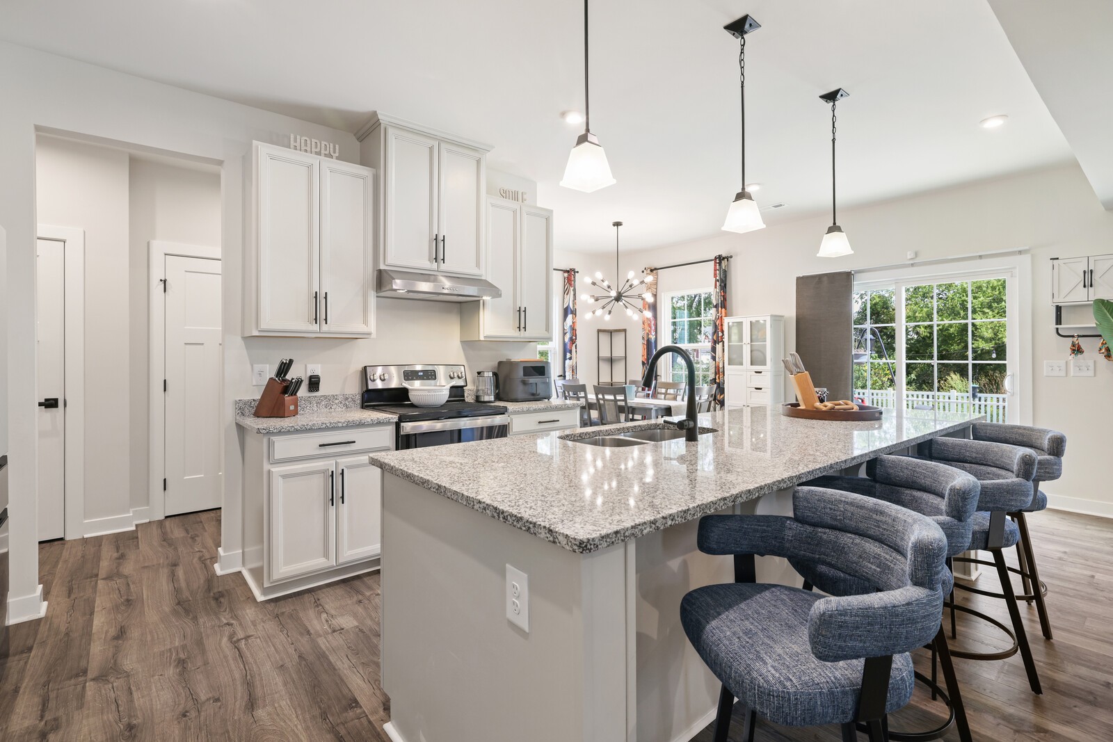 Custom Designer Interior: Stylish LVP flooring flows through the main living areas, complemented by chic flat black hardware throughout. Features a stunning entertainment wall, modern Sputnik chandelier in the dining room, floating shelves, & barn door accents.