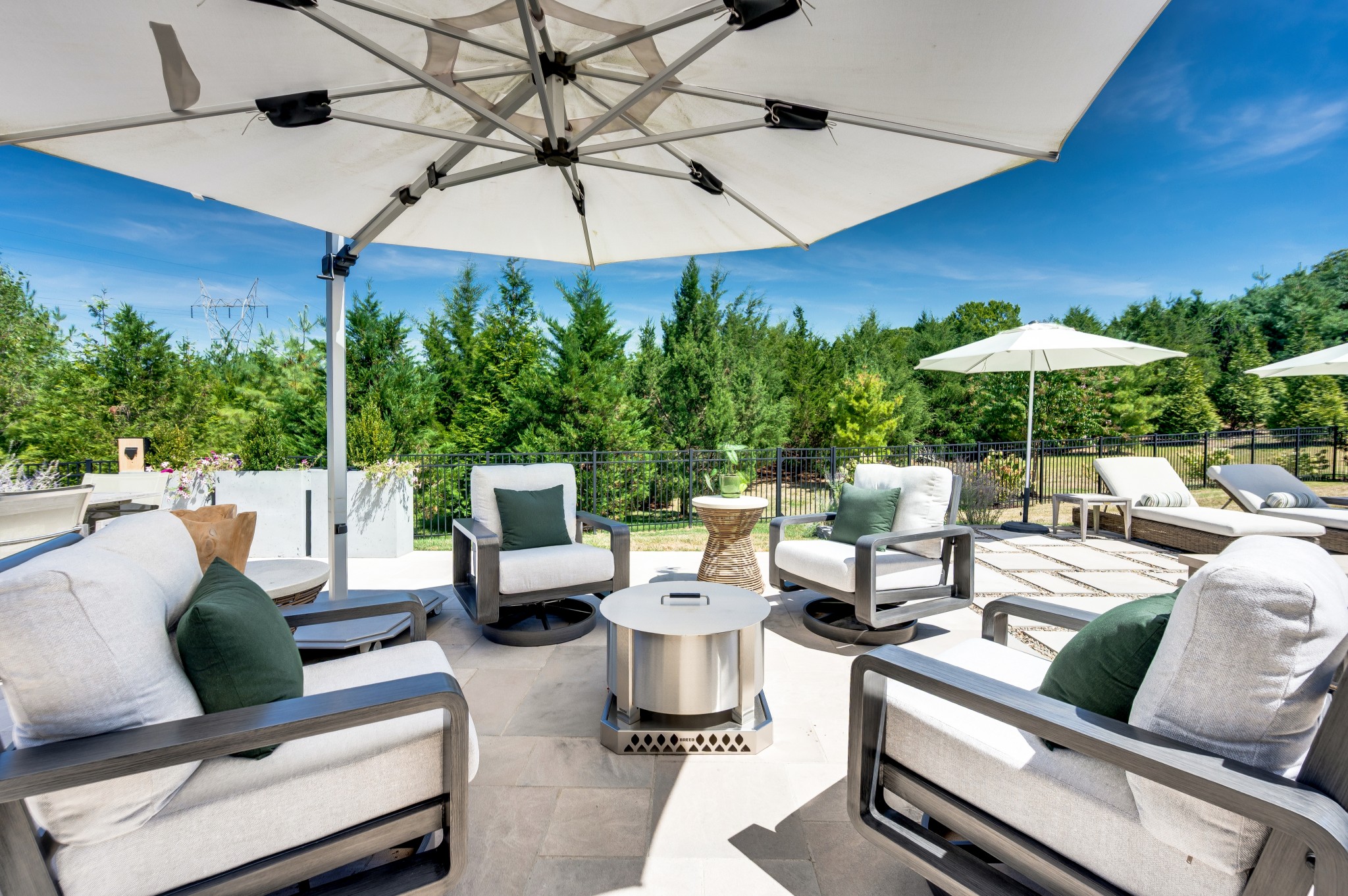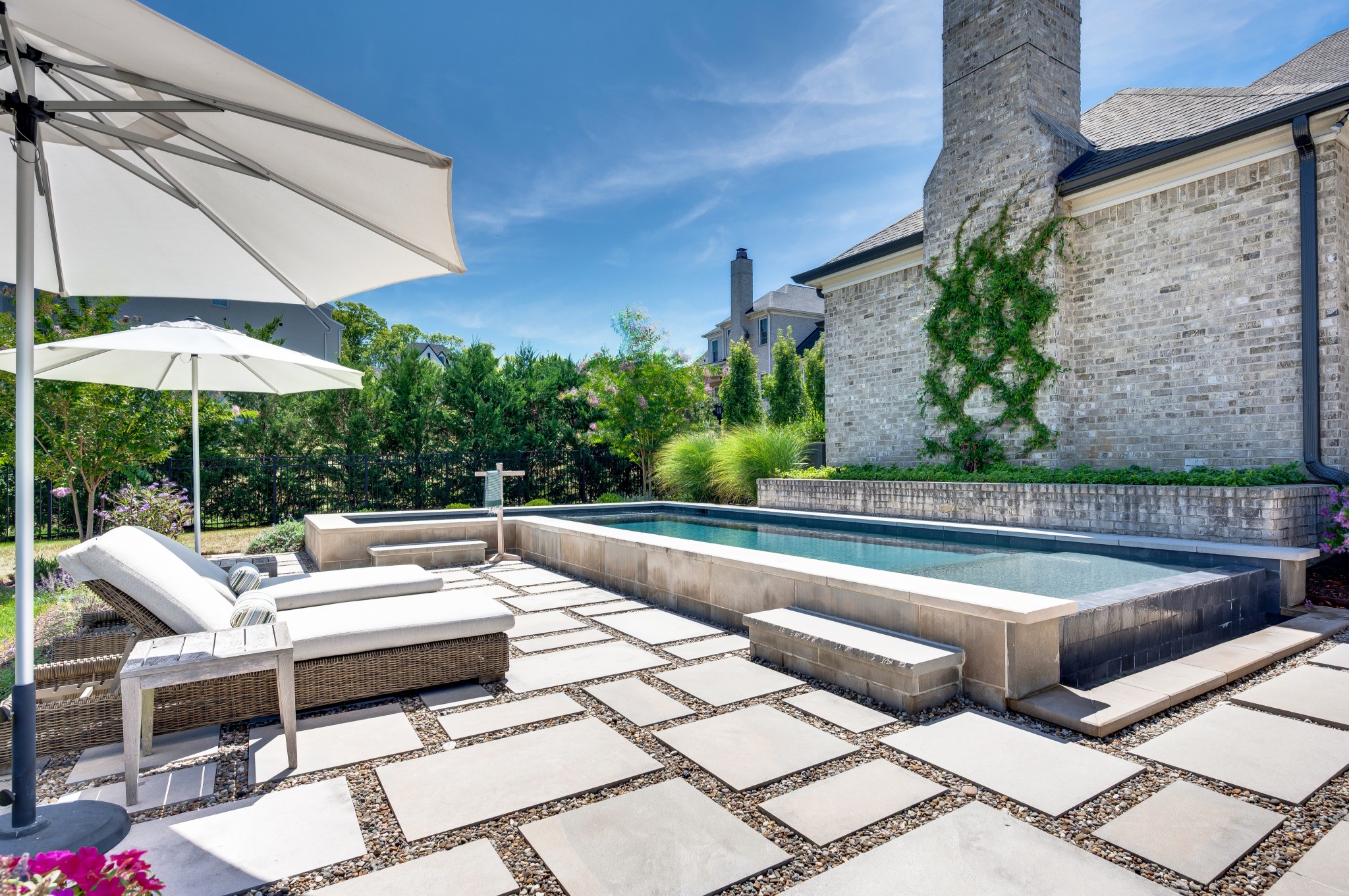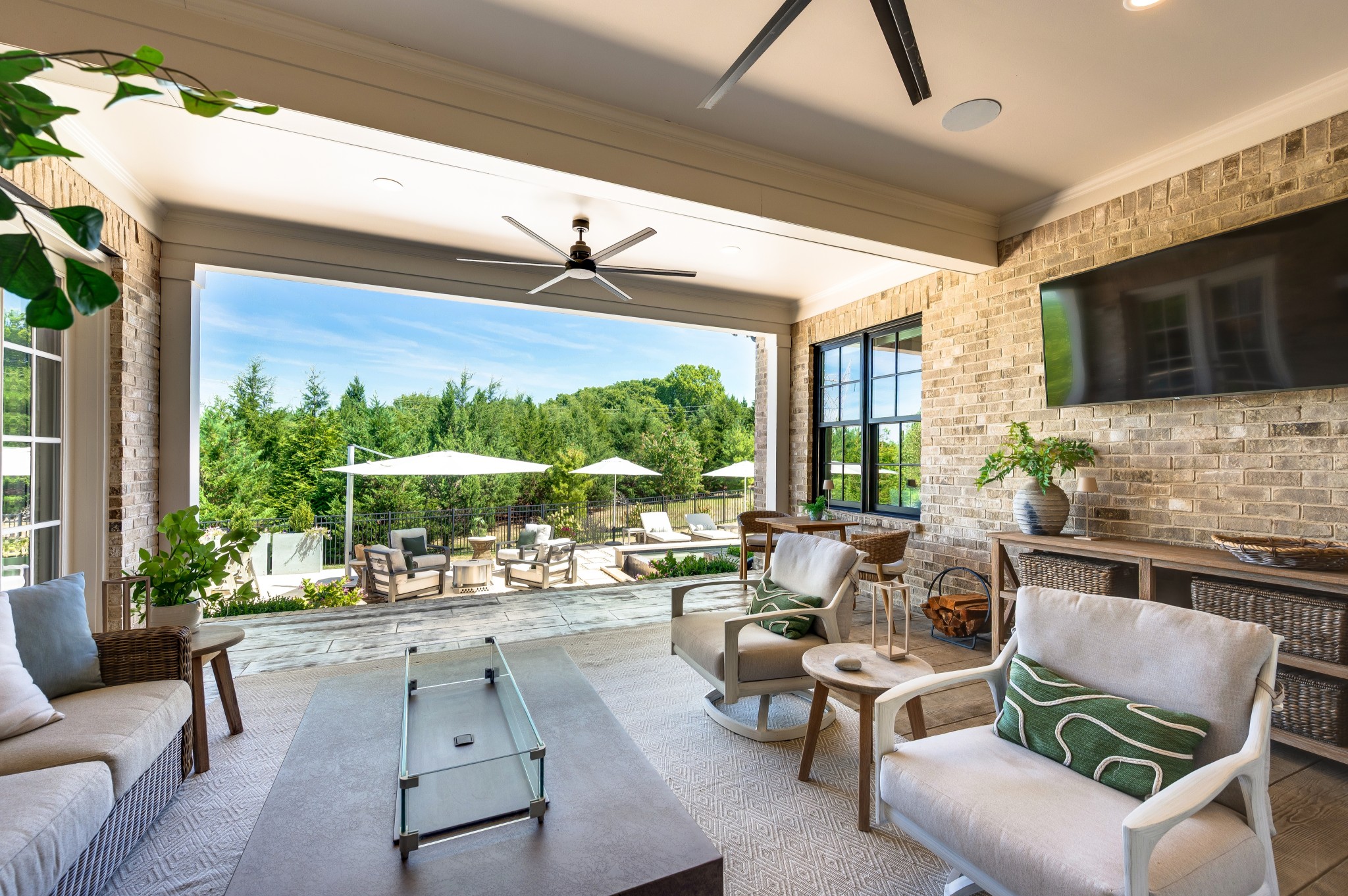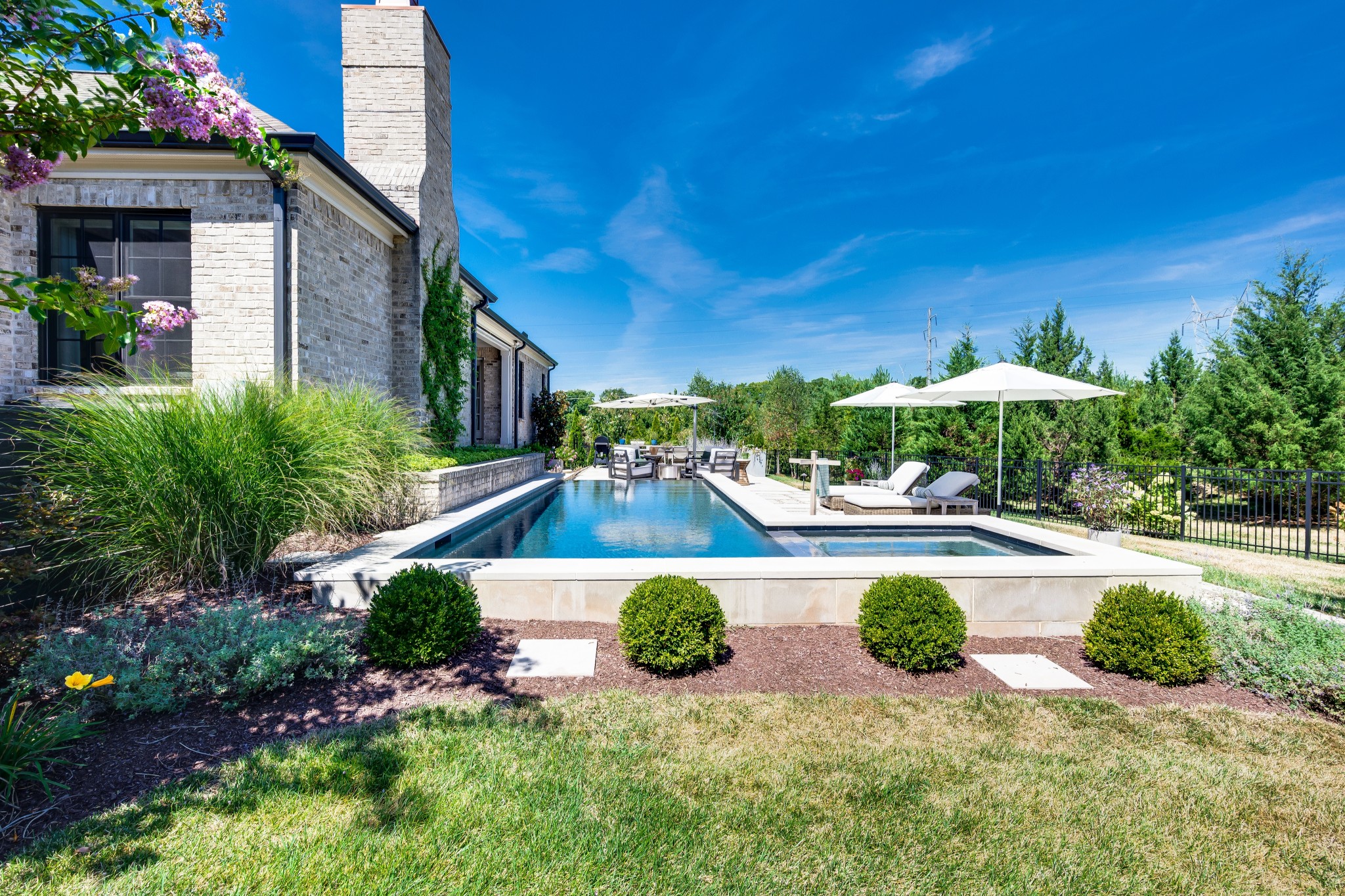Step outside to an outdoor living experience that is nothing short of magical—an expansive screened porch with remote-control shades and TV, a resort-style pool with infinity edge and hot tub, elegant paver patios, and a lush, level lawn framed by mature trees for privacy.