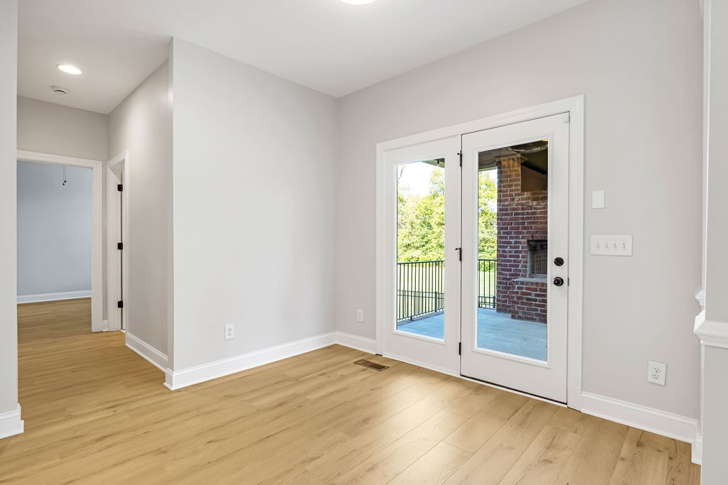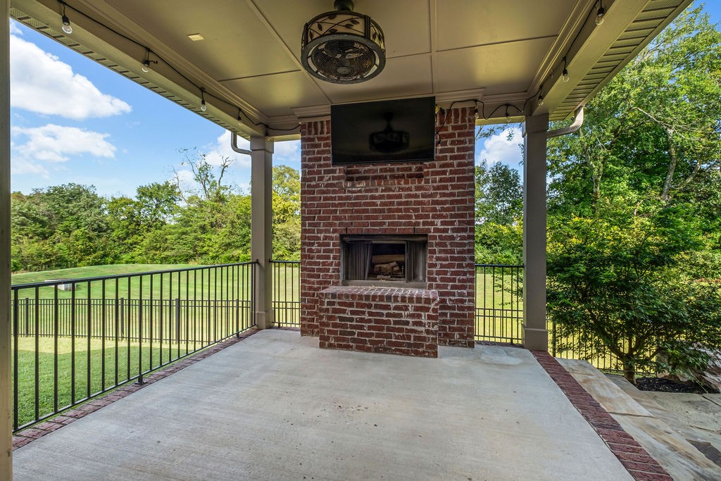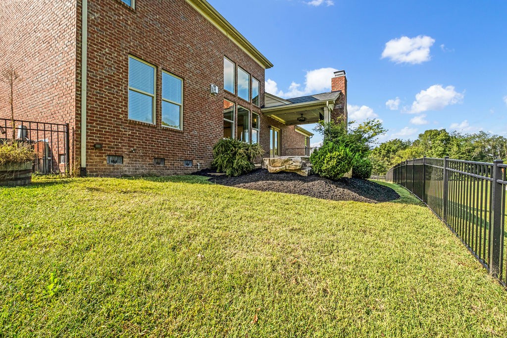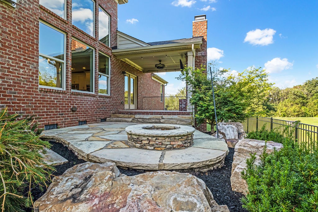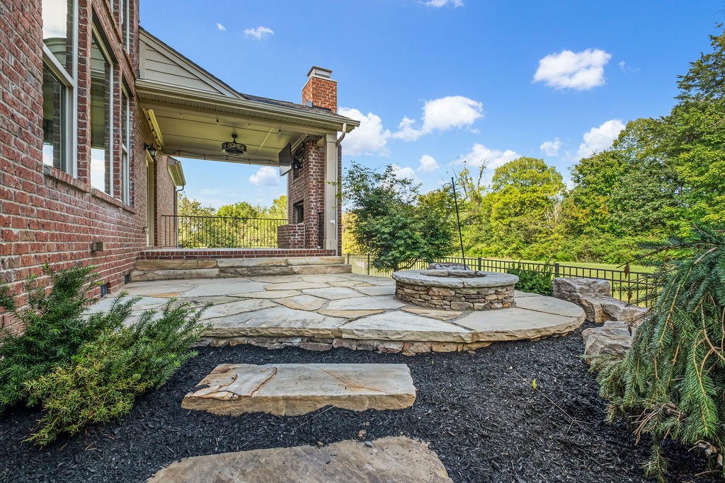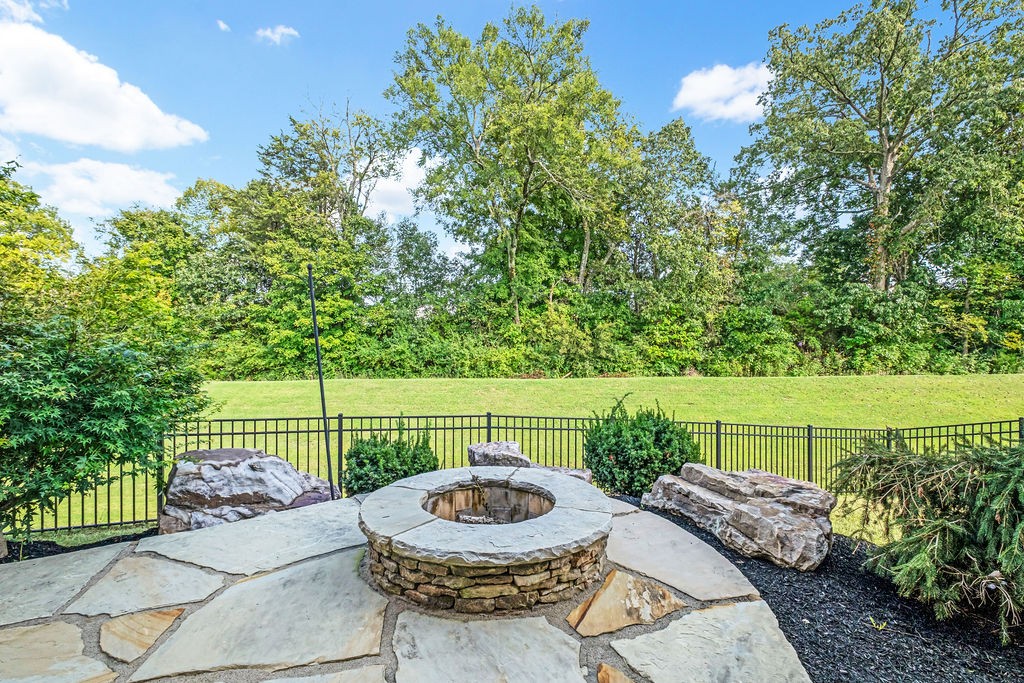 Outside walk out to a covered deck complete with an outdoor fireplace. This private backyard oasis is fully fenced and backs up to a peaceful green space. Custom natural stone pavers lead to a firepit. This yard is made for relaxation or entertaining!