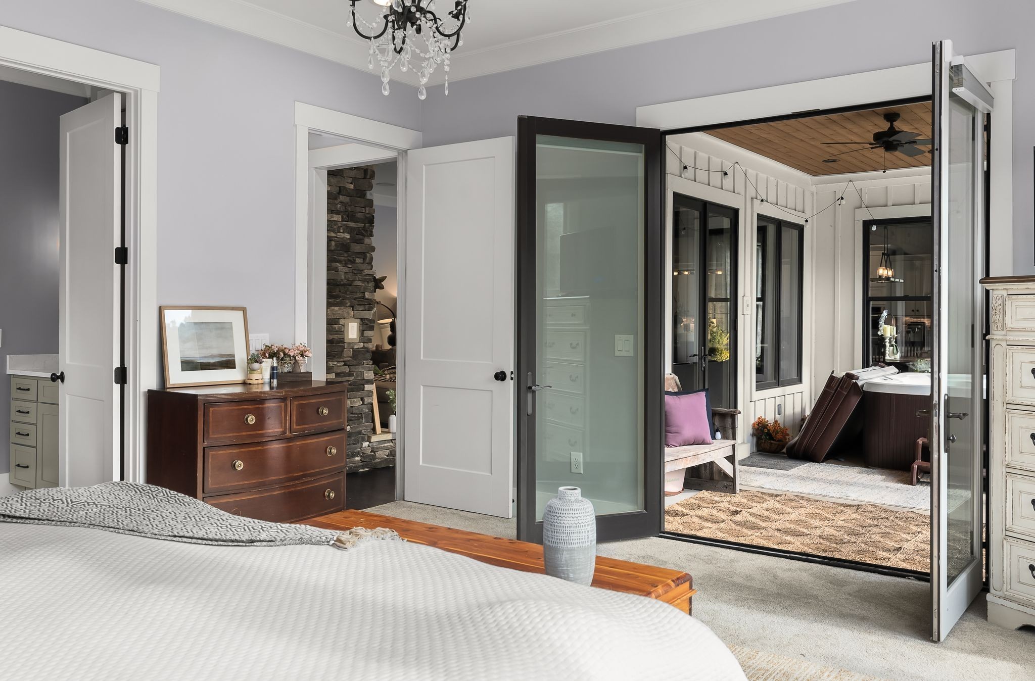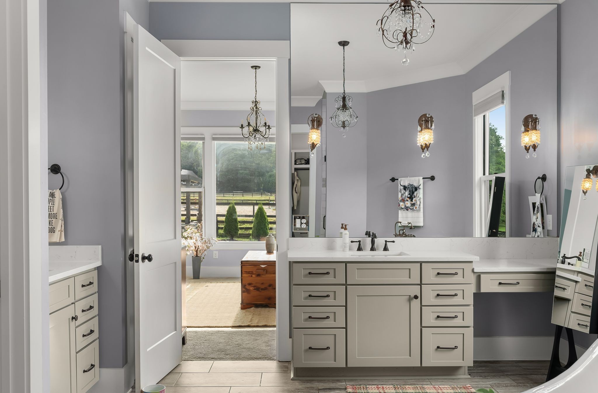 This custom 5-bedroom, 4.5 bath home offers a wonderfully thought-out floor plan, views to die for, and attention to detail throughout. The spacious main floor is perfect for entertaining, featuring a gourmet kitchen, elegant living areas, and abundant natural light. Two main-floor primary suites offer multi-generational living options. Storage and closet space galore. Each additional bedroom offers ample space and comfort, making this home ideal for family living or hosting guests.