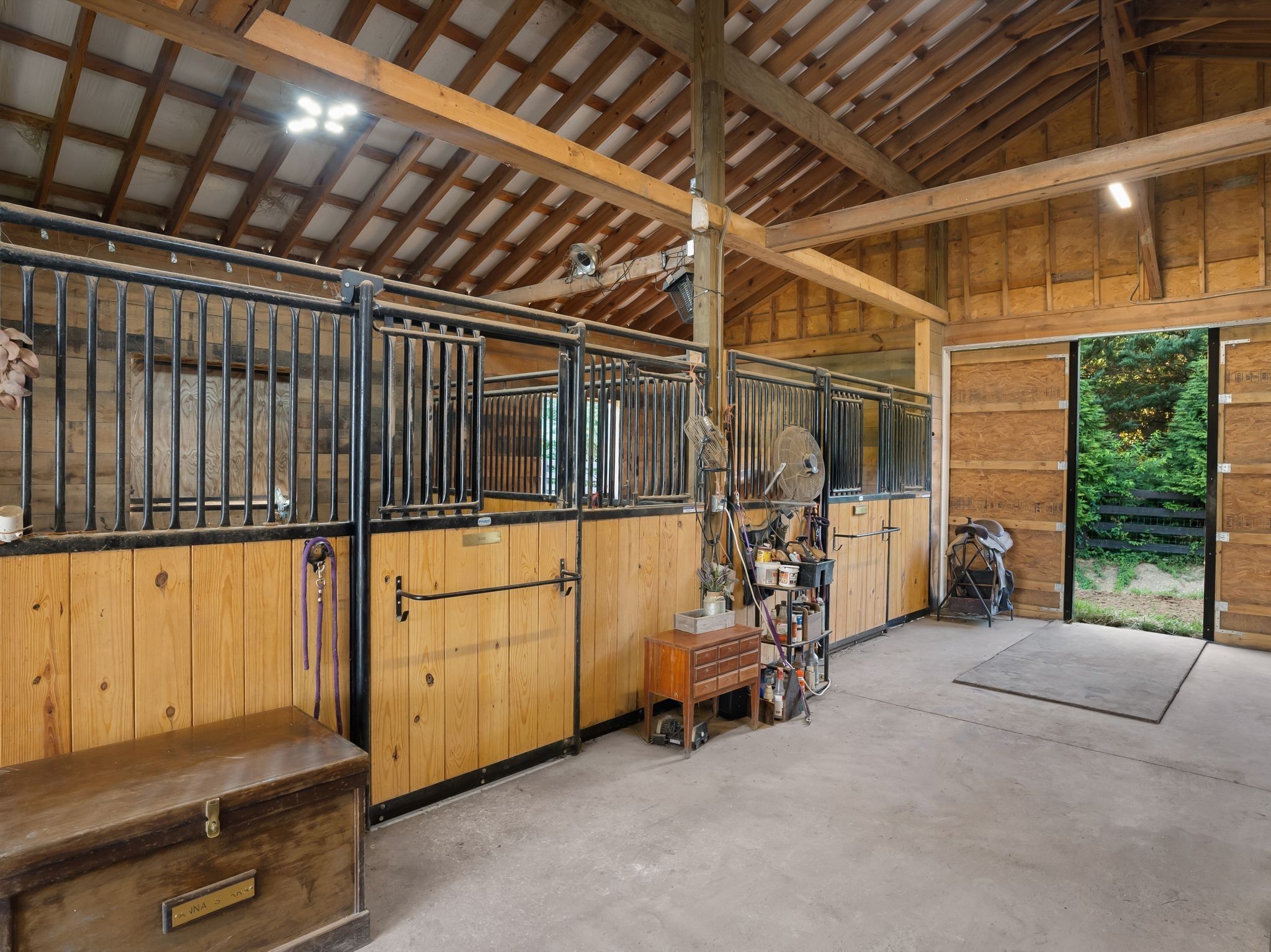 Equestrian enthusiasts will appreciate the custom four-stall barn with 3 12x12 stalls and one oversized 12x14 stall, dedicated tack room, hay loft, and hot/cold wash rack. Each stall is spacious and well-ventilated, with direct access to pastures. The property also features a professionally built riding arena by renowned local expert Brian Topping, ensuring you have the perfect space for training and enjoyment.