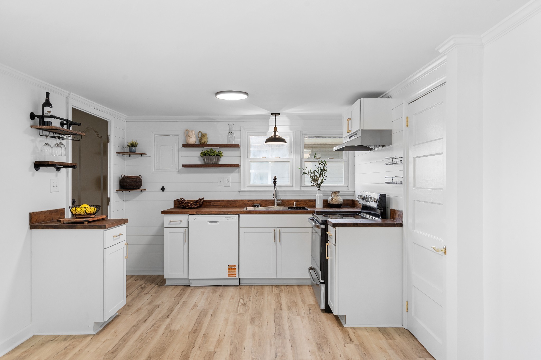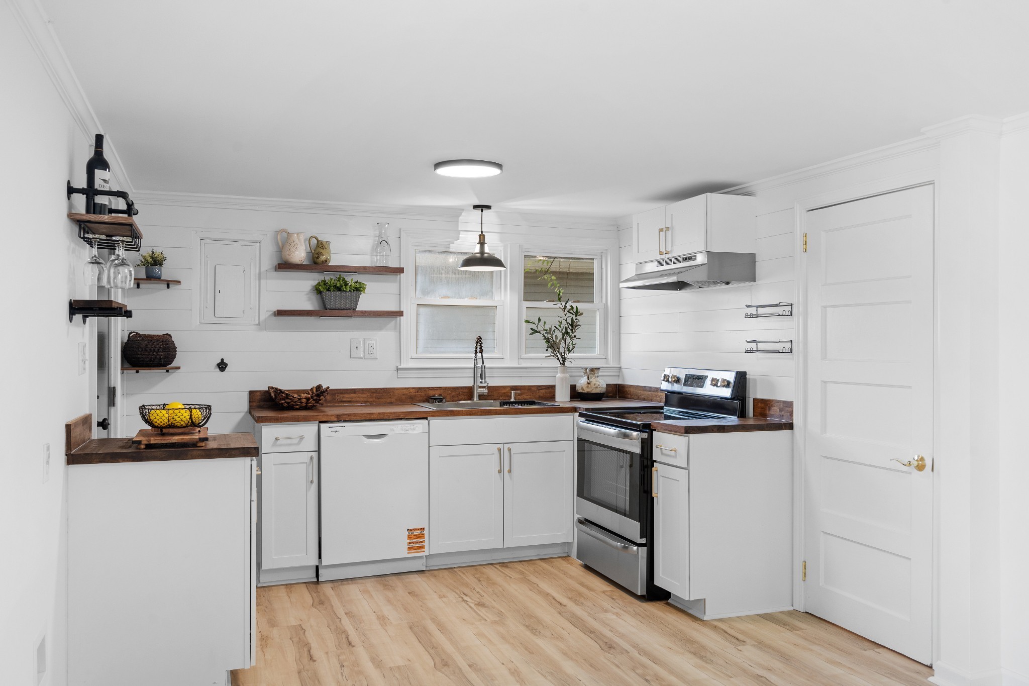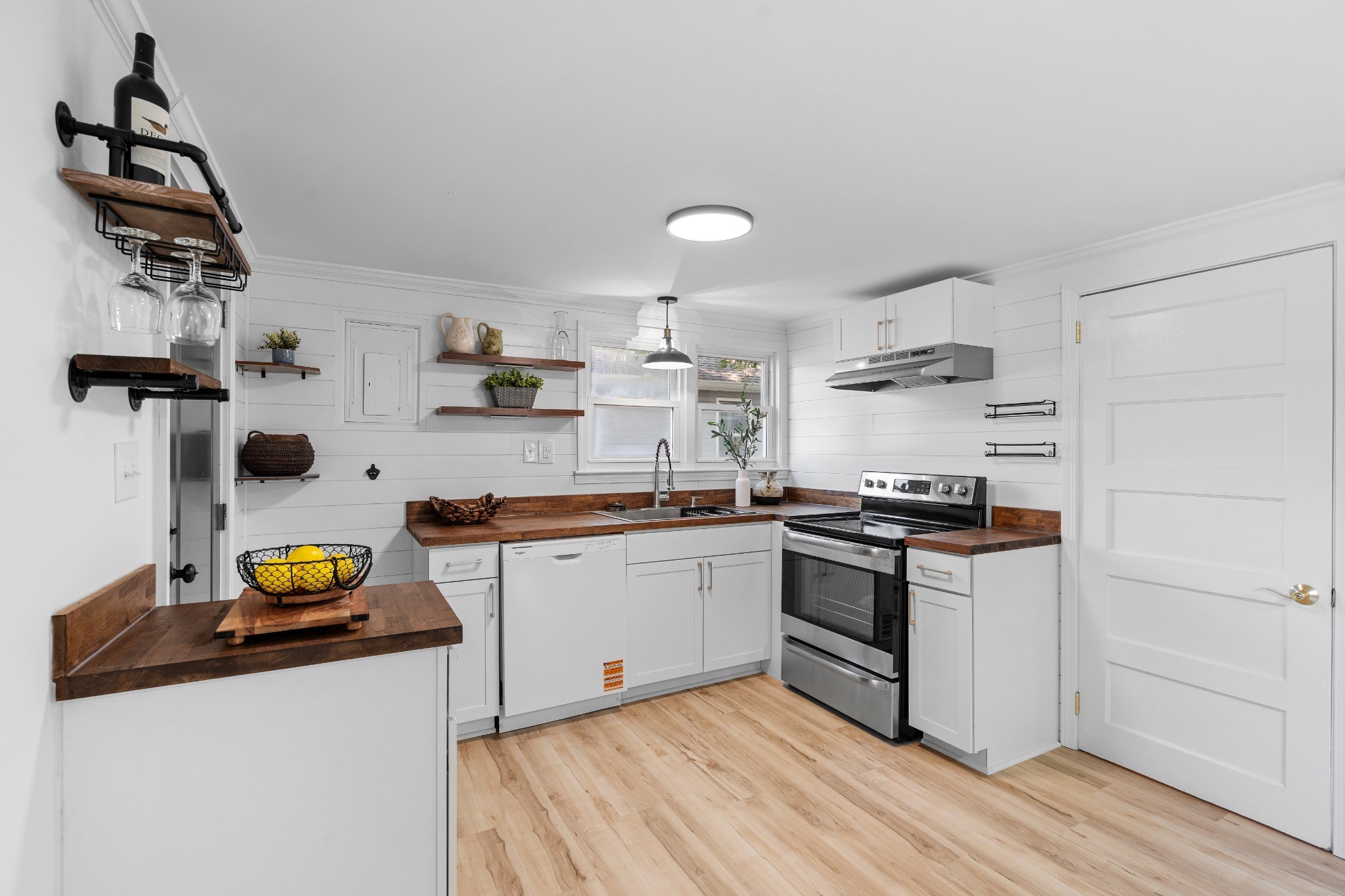 Fully renovated and move-in ready! This home features fresh paint, trim, lighting, LVP and carpet, plus all-new plumbing fixtures. The updated kitchen offers new cabinets, butcher block countertops, stainless appliances, ventless hood, and motion-sensor under-shelf lighting. The bathroom includes a wood-tone vanity with marble top, heated towel rack, and a fully tiled walk-in shower.